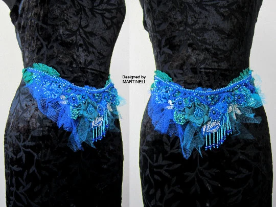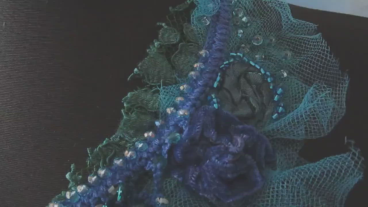 I used dark blue crochet base ,tulle, lace,satin,velvet, Preciosa crystals and glass beads,vintage crystal beads.