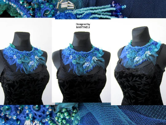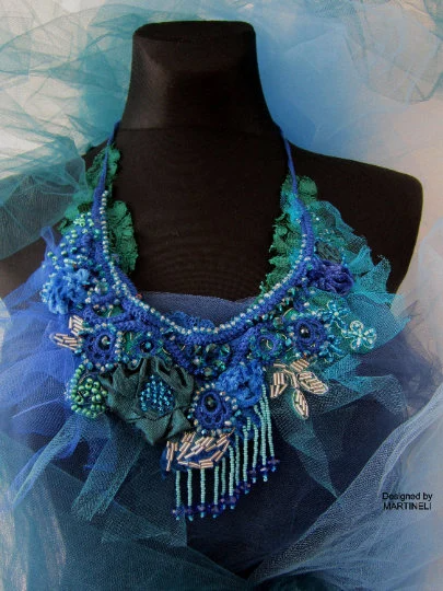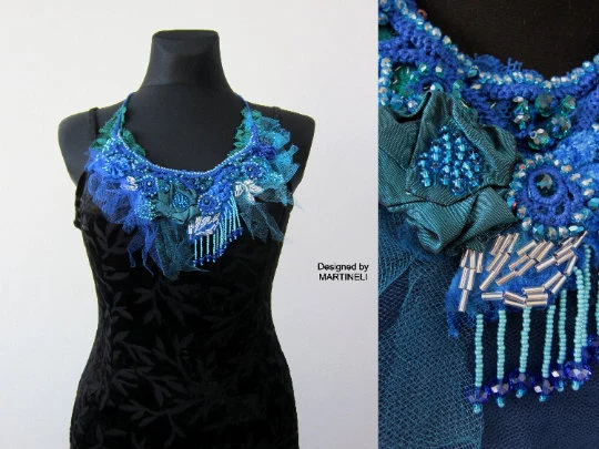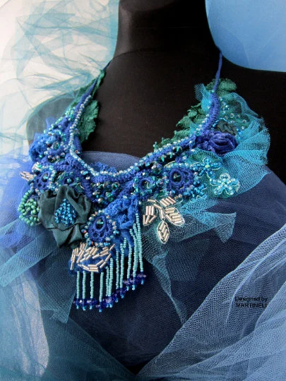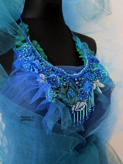 The bib necklace is ornate with hand sculptured flowers and a lot of bead embroidery,handmade by me.