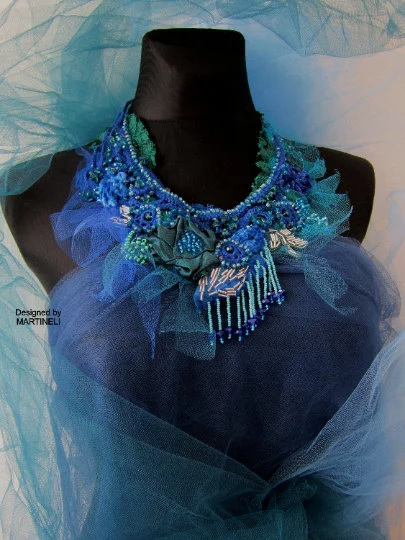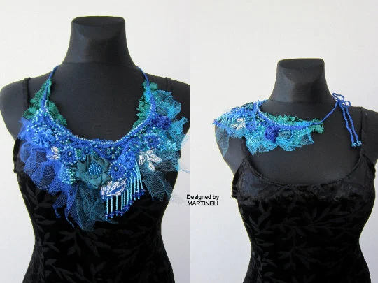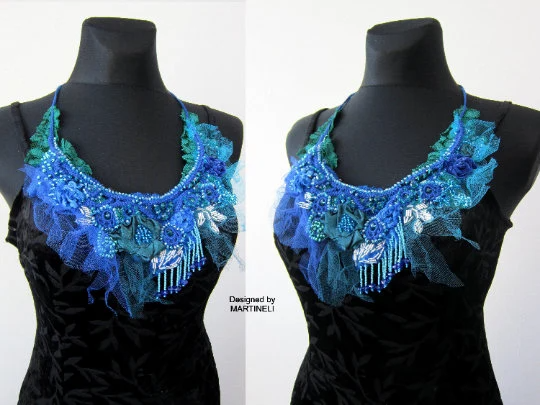 Blue Crystal Statement Necklace,Victorian Beaded Embroidered Necklace