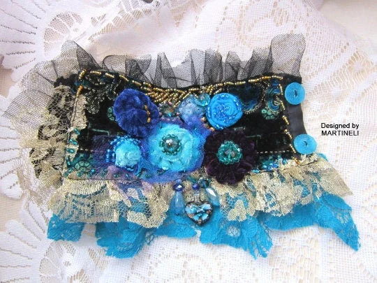 I used black and turquoise floral velvet,chiffon,laces,Preciosa glass pearls and beads,vintage crystal beads.