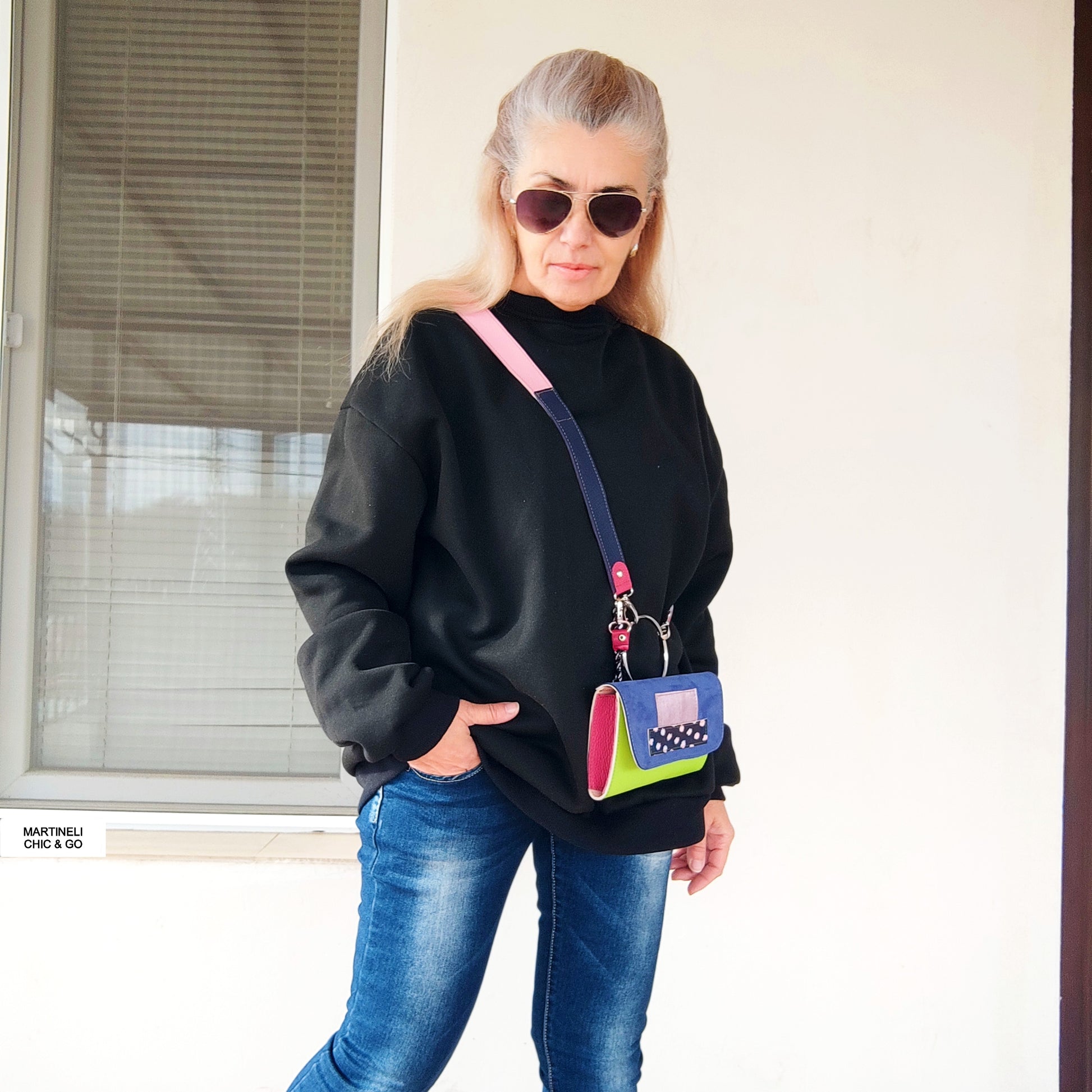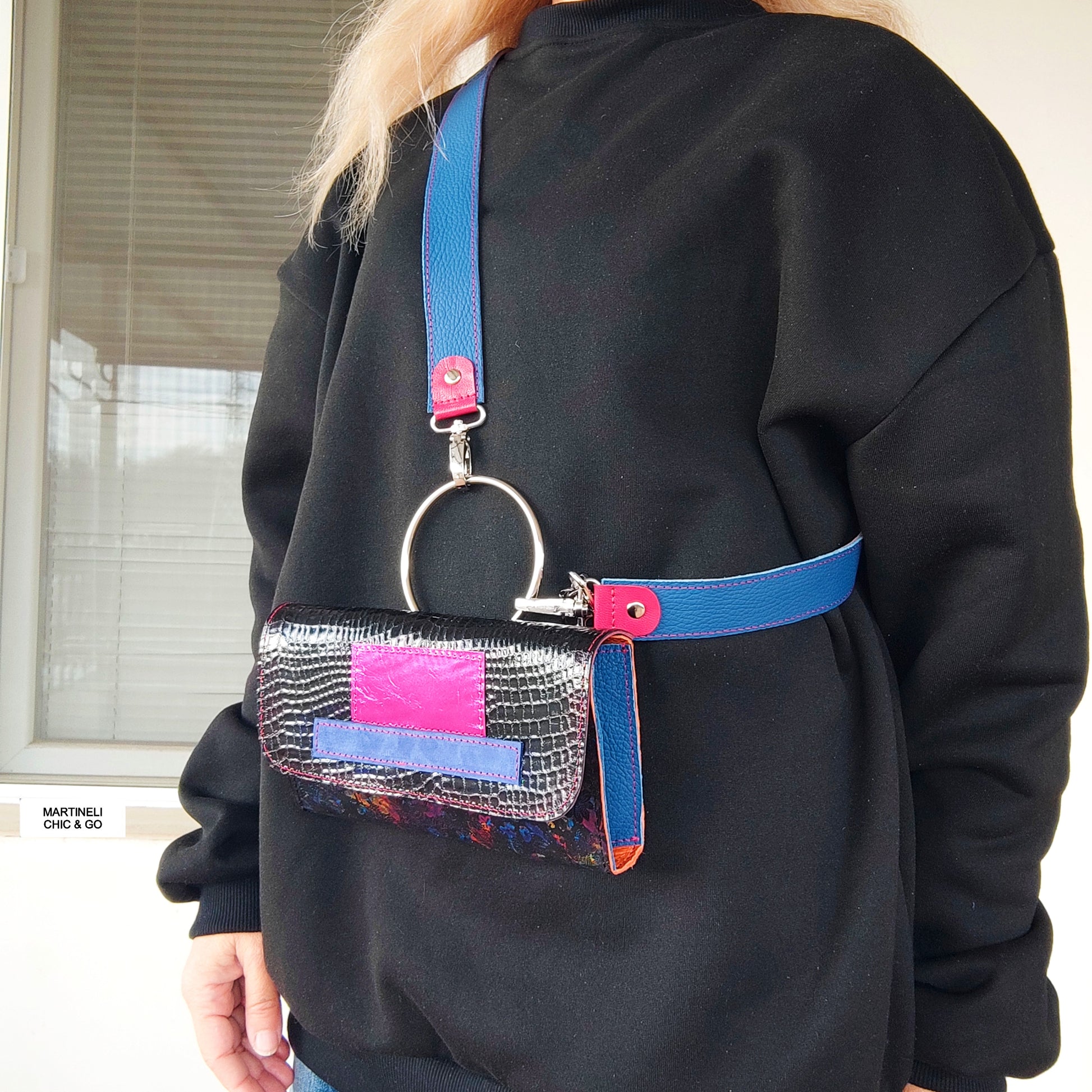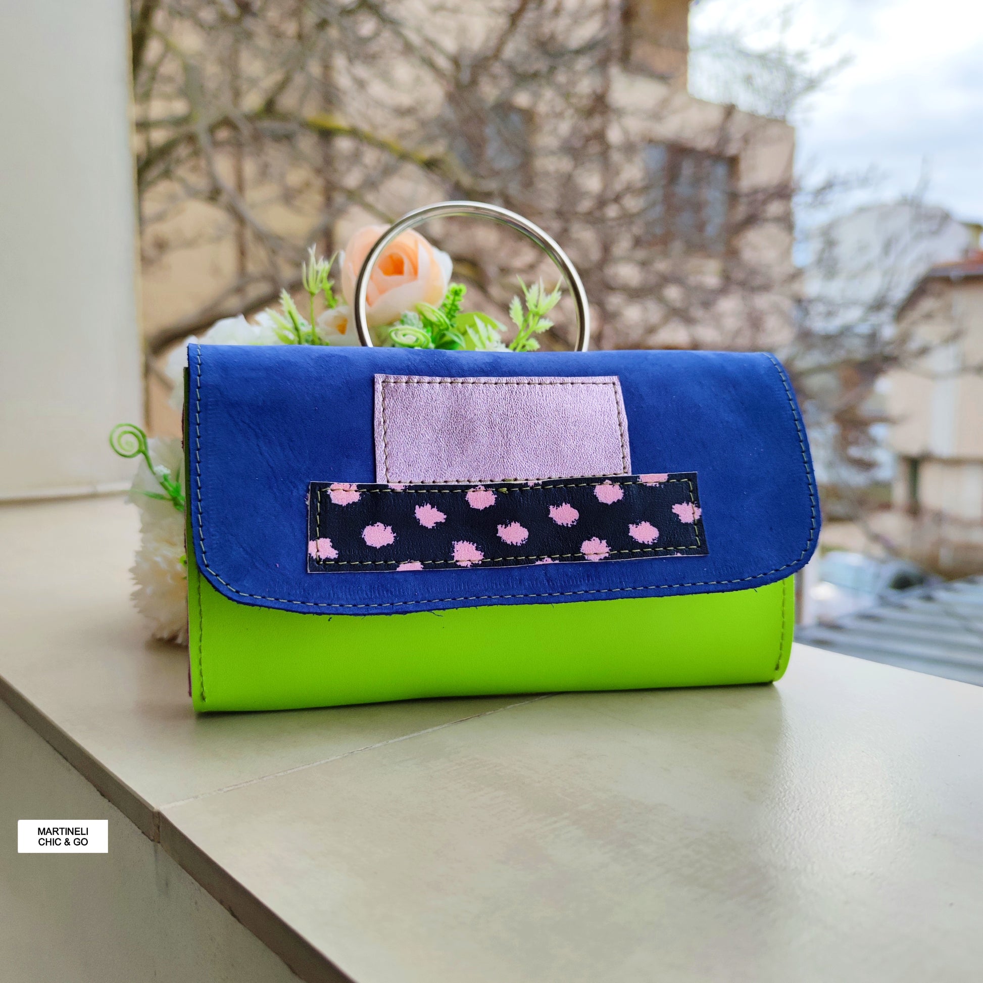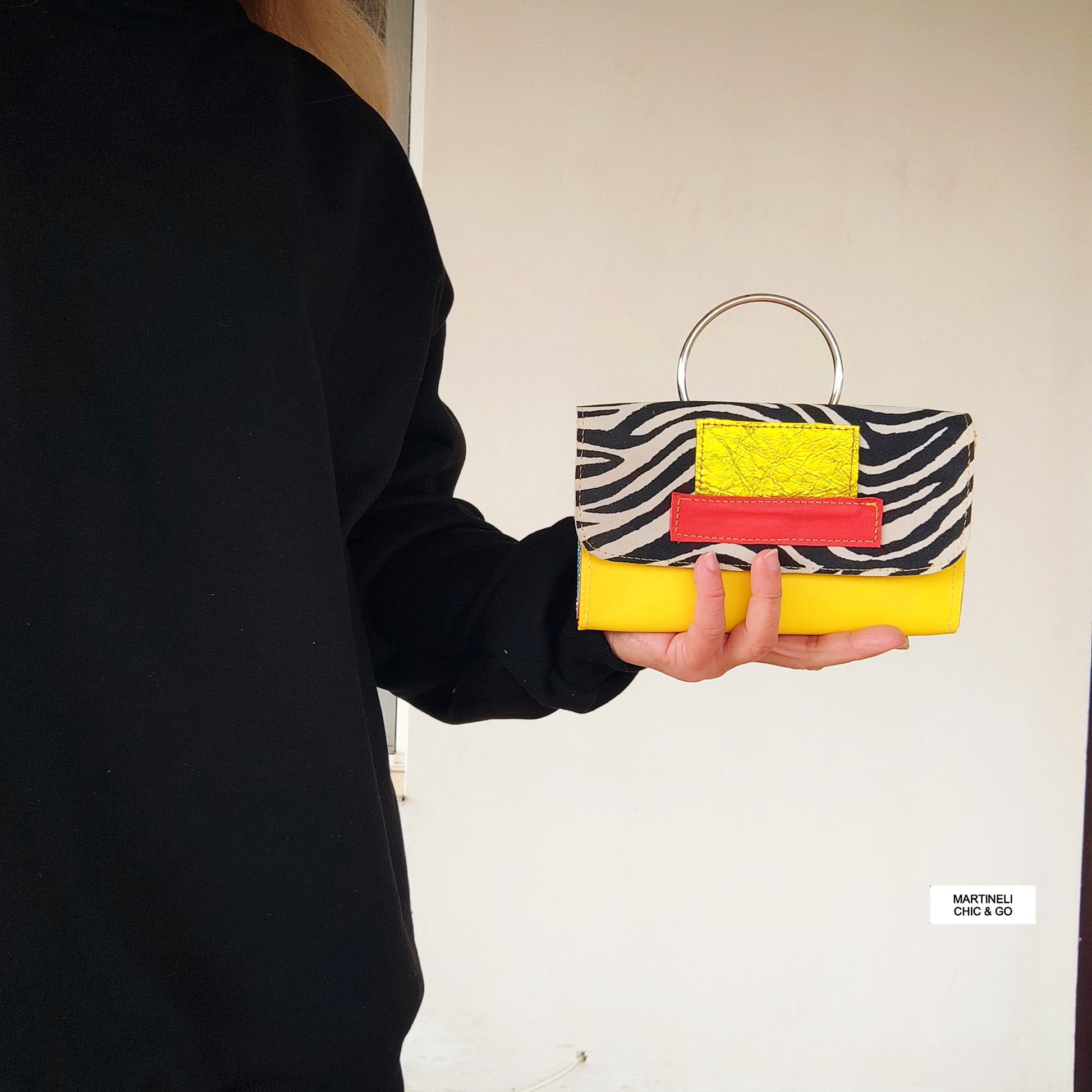 I used BRIGHT YELLOW Genuine Italian Leather , ZEBRA PRINT leather, different colorful leathers,big O ring as a handle.