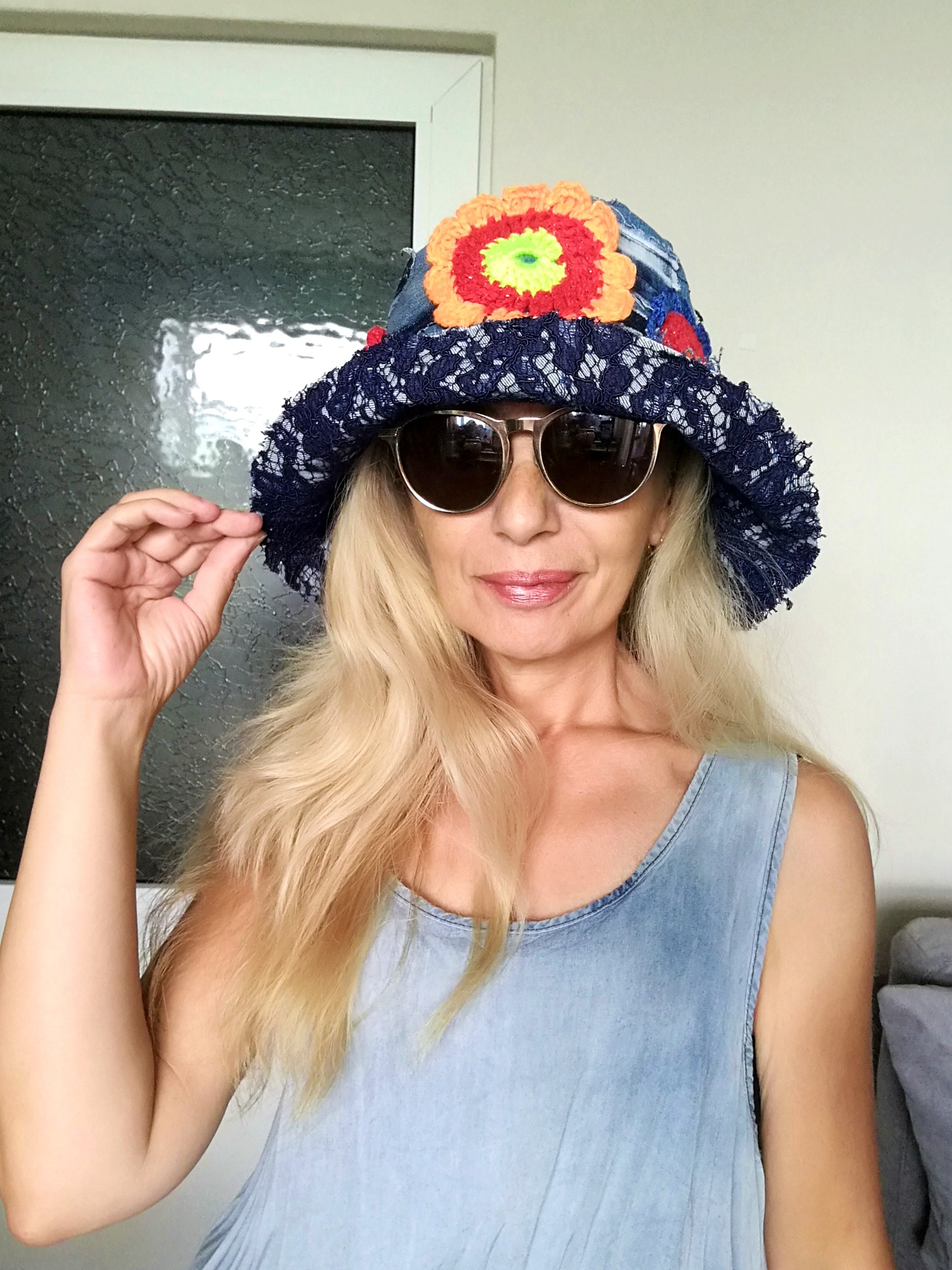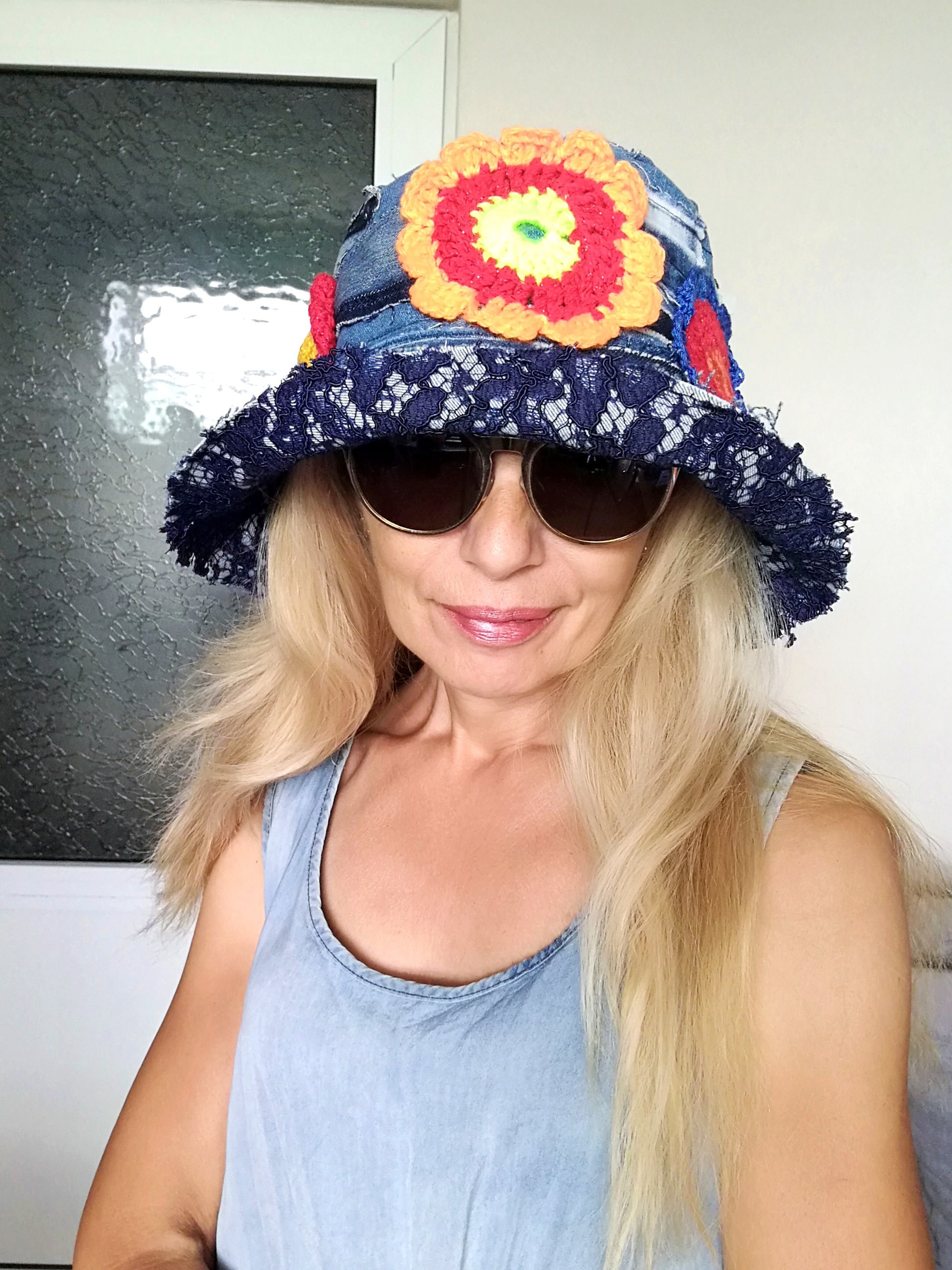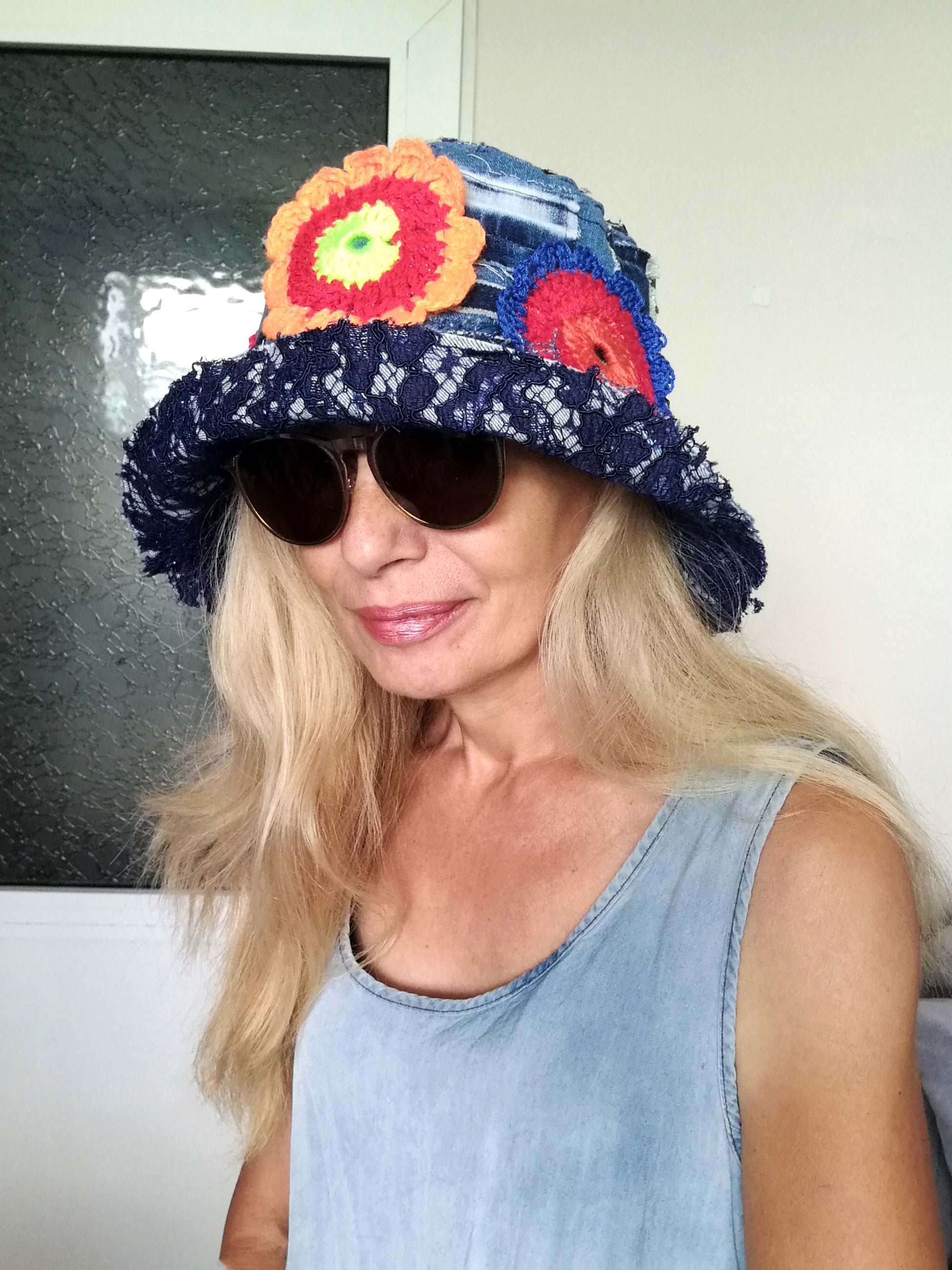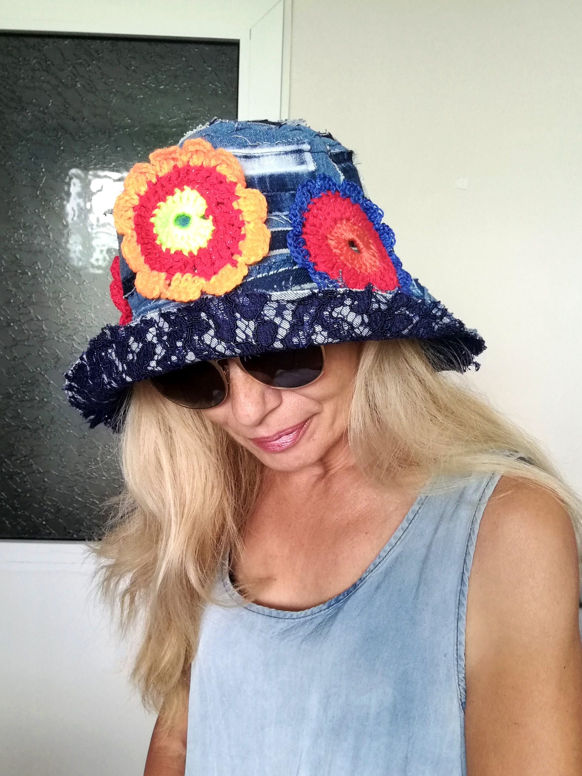 This boho gypsy denim hat is exclusive, one of a kind, because I don`t make more than one item. I offer special, unique items-only one is available for one special person!