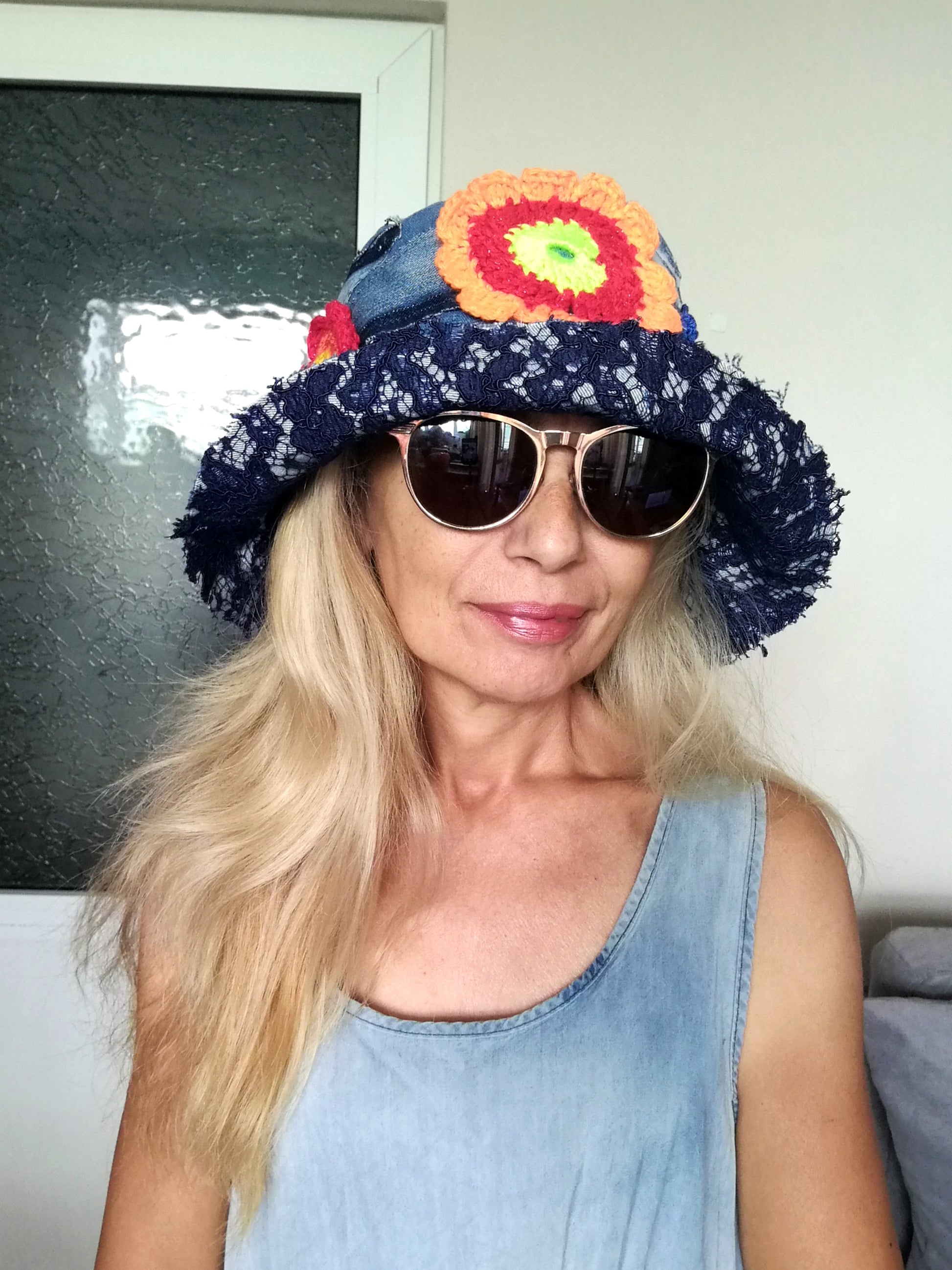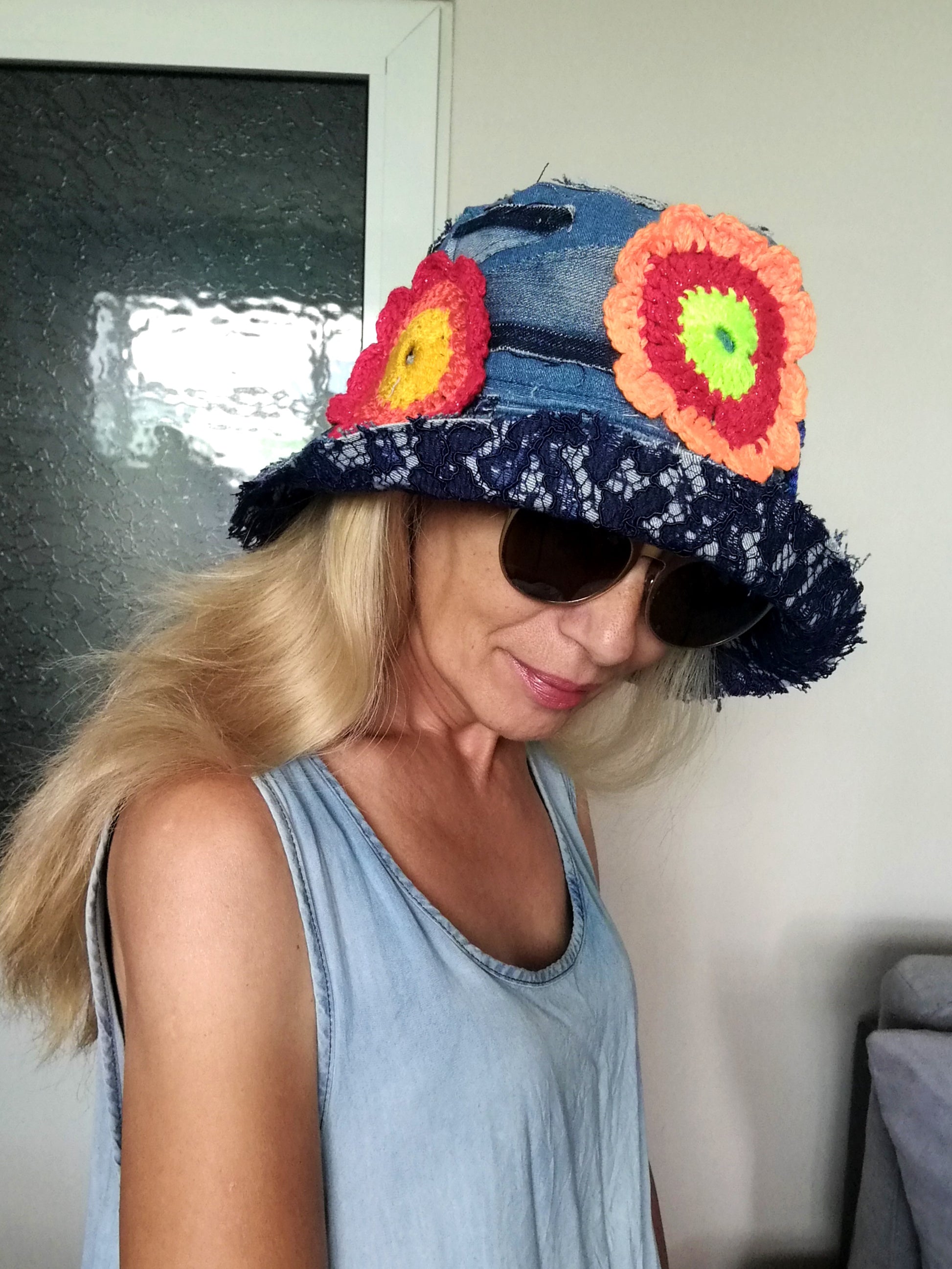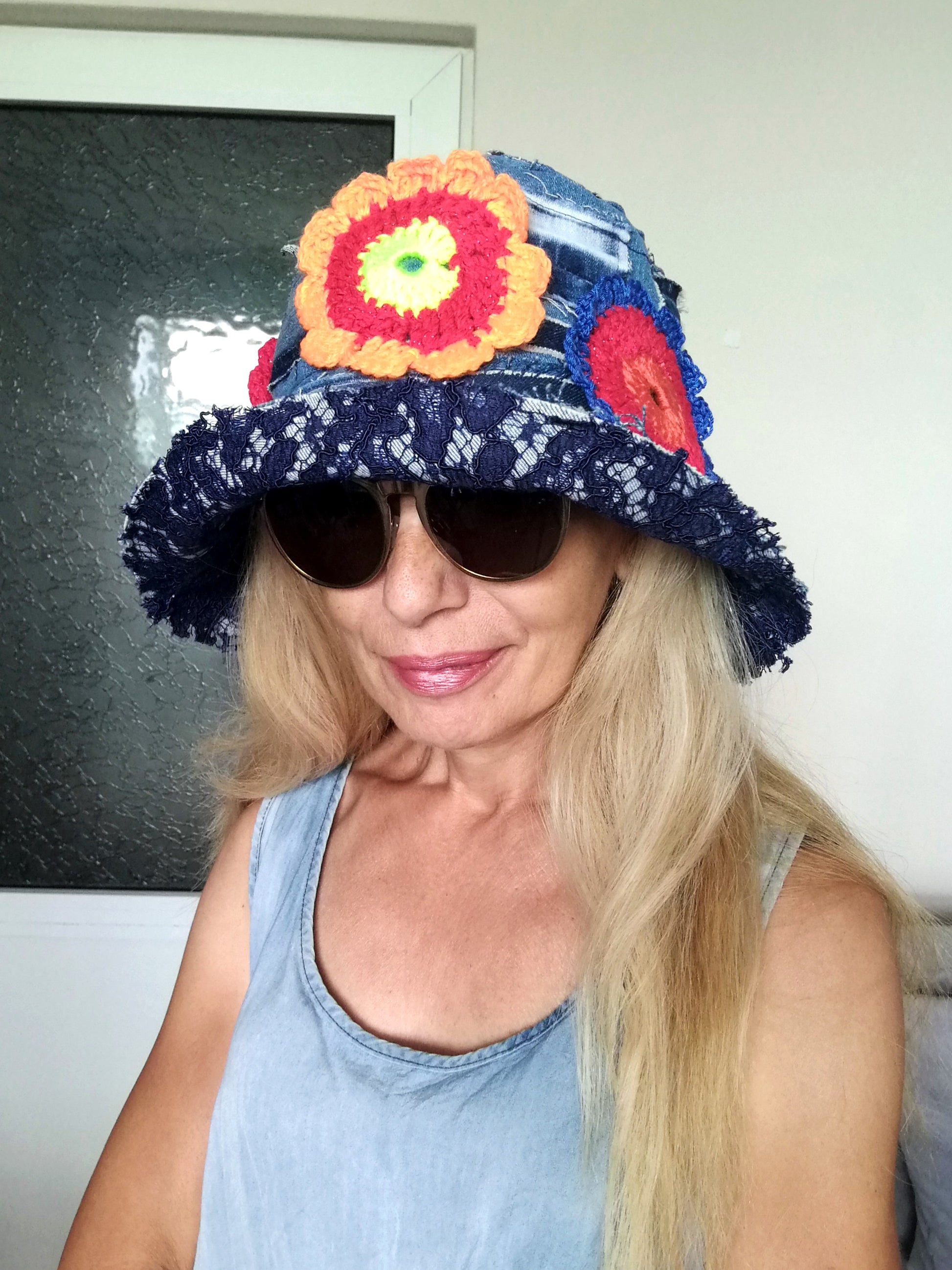 This boho gypsy denim hat is exclusive, one of a kind, because I don`t make more than one item. I offer special, unique items-only one is available for one special person!