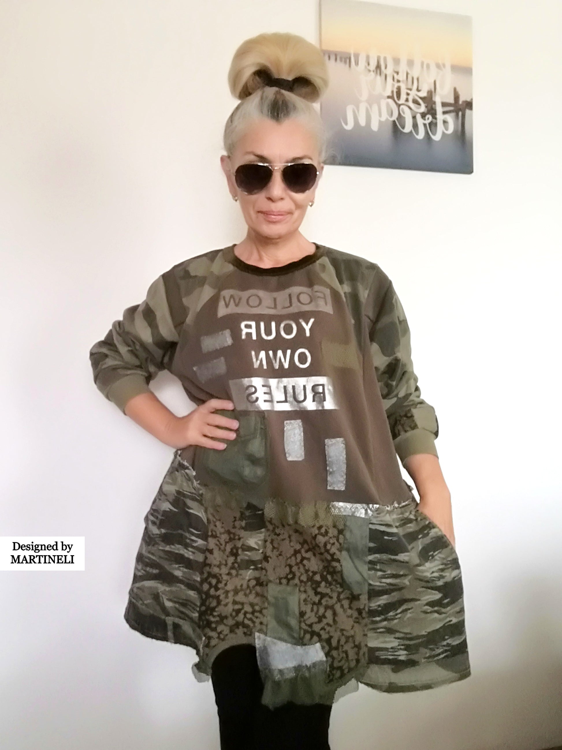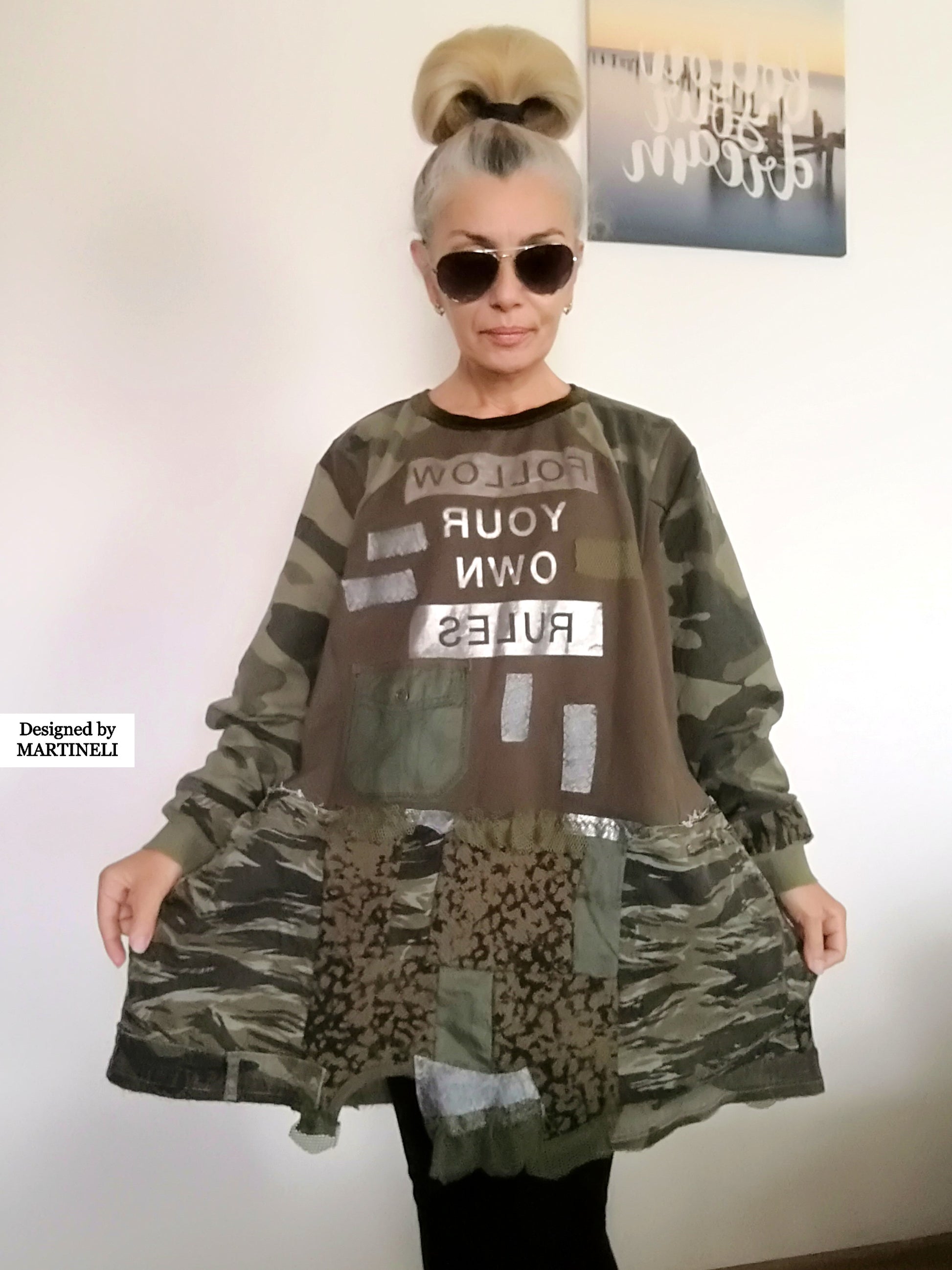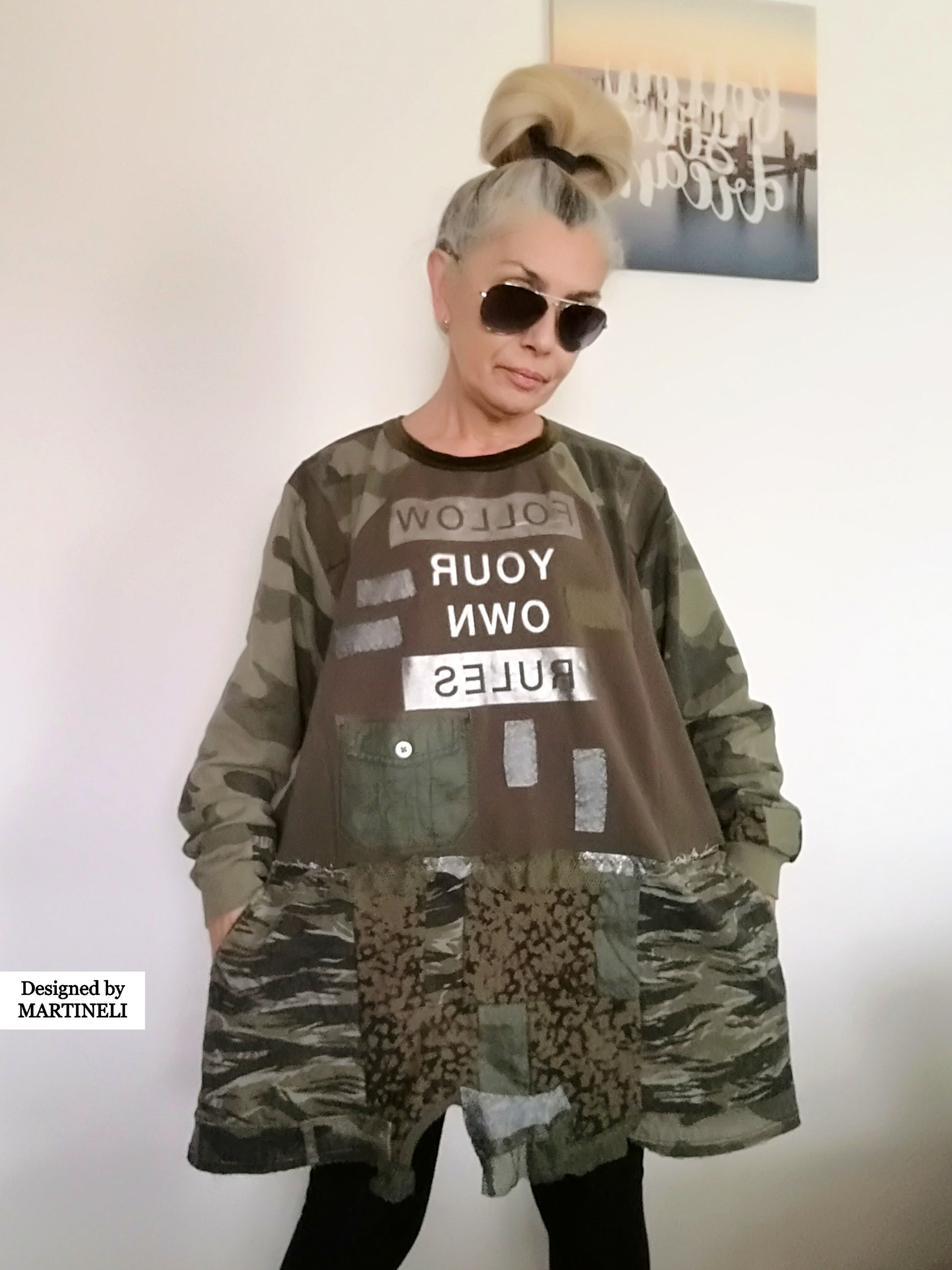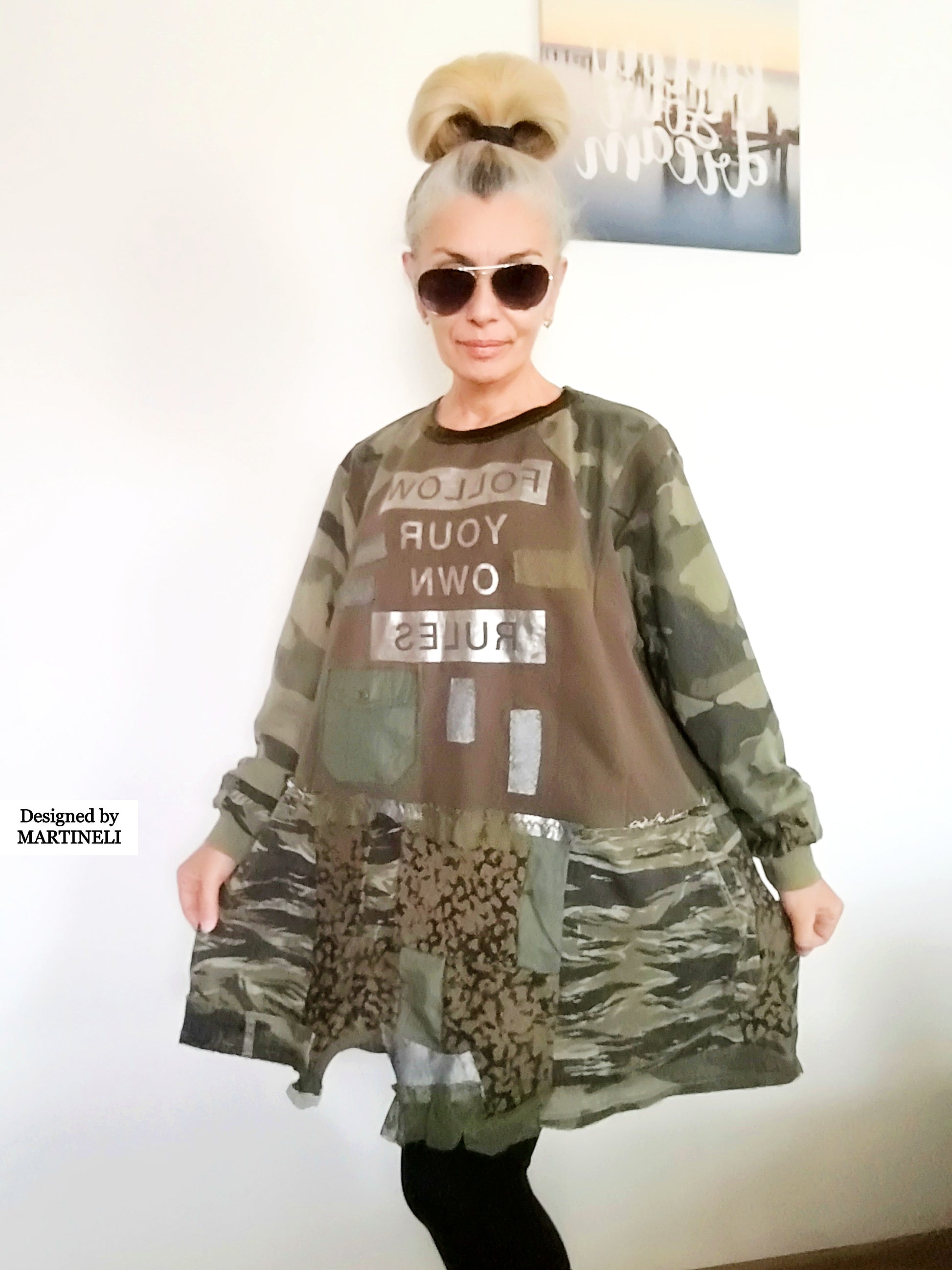 I designed and constructed this plus size 3XL camouflage sweatshirt dress.