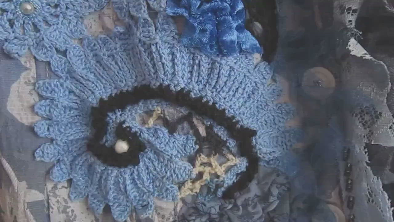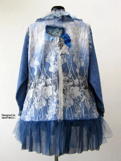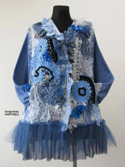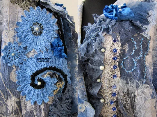 I used very soft blue/white floral linen/cotton blend jacket,blue cotton fleece,net, chiffon,laces,velvet,tulle,Preciosa glass beads,crystals and pearls. The Jacket is embellished with crochet floral elements.