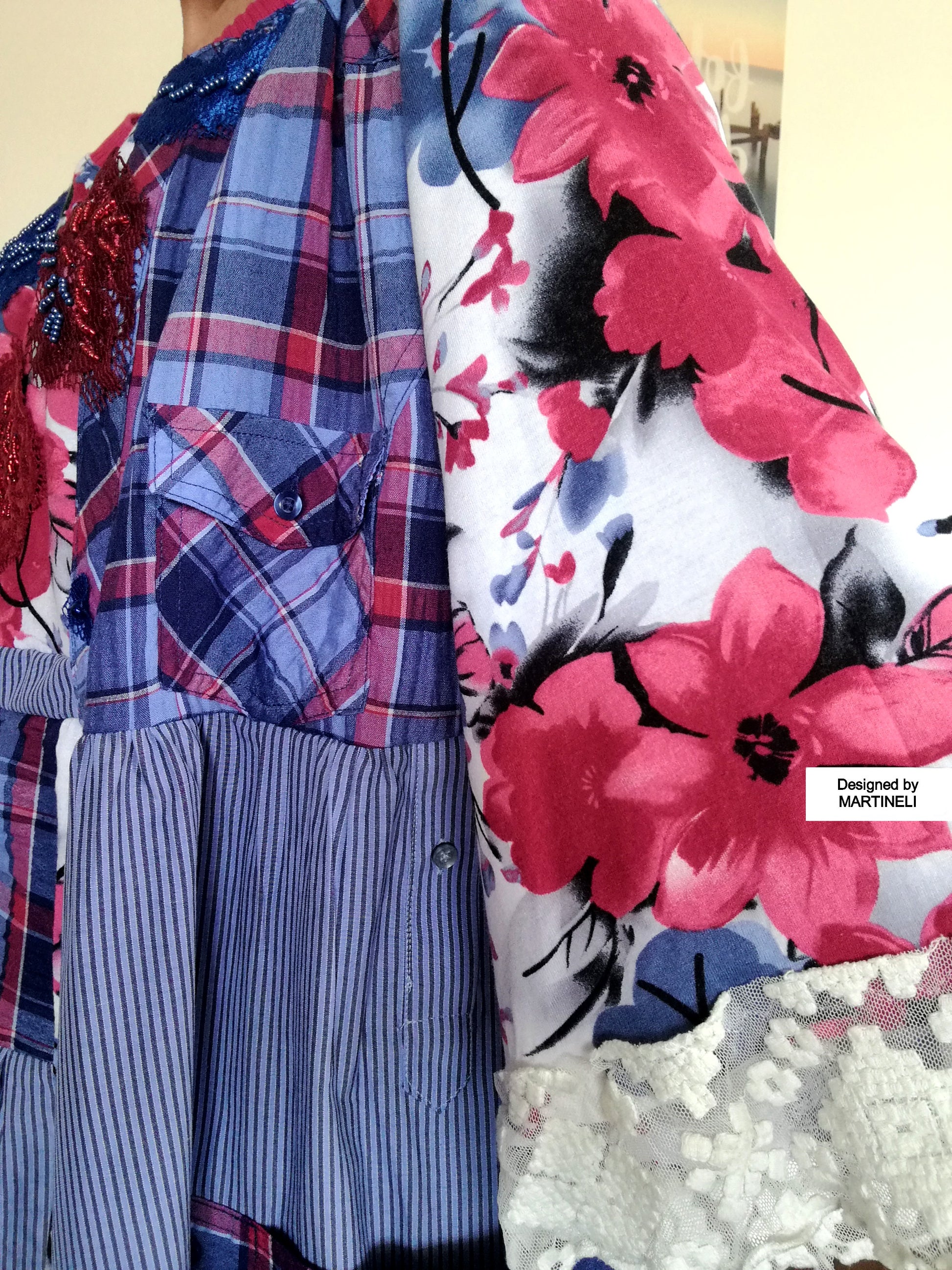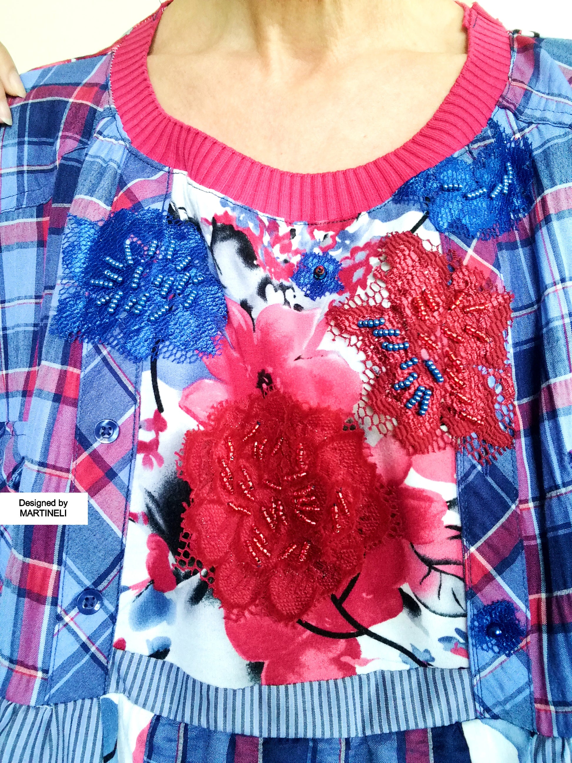 I used soft floral stretchy cotton t-shirt,striped cotton, plaid cotton,laces, Preciosa glass beads.