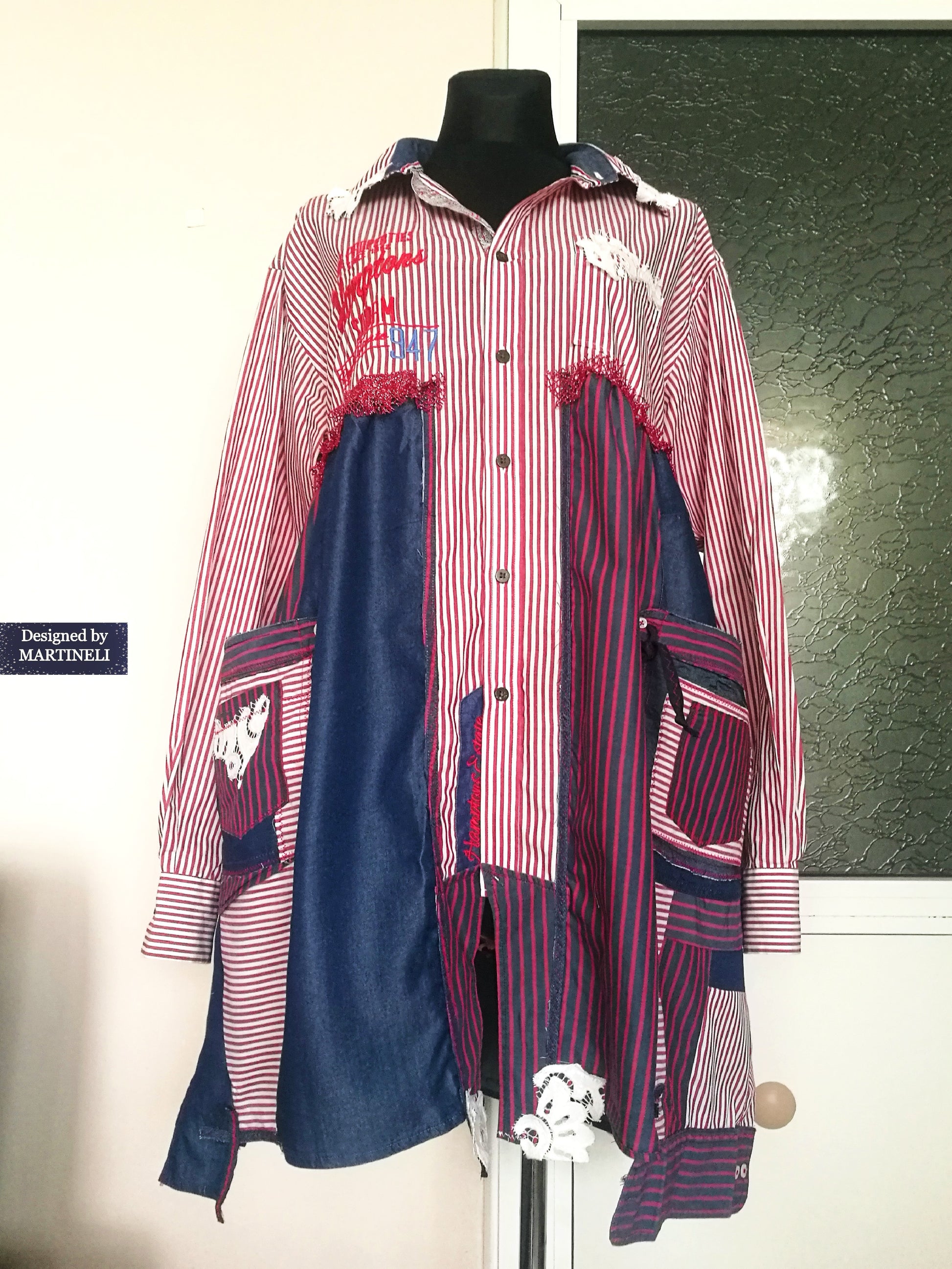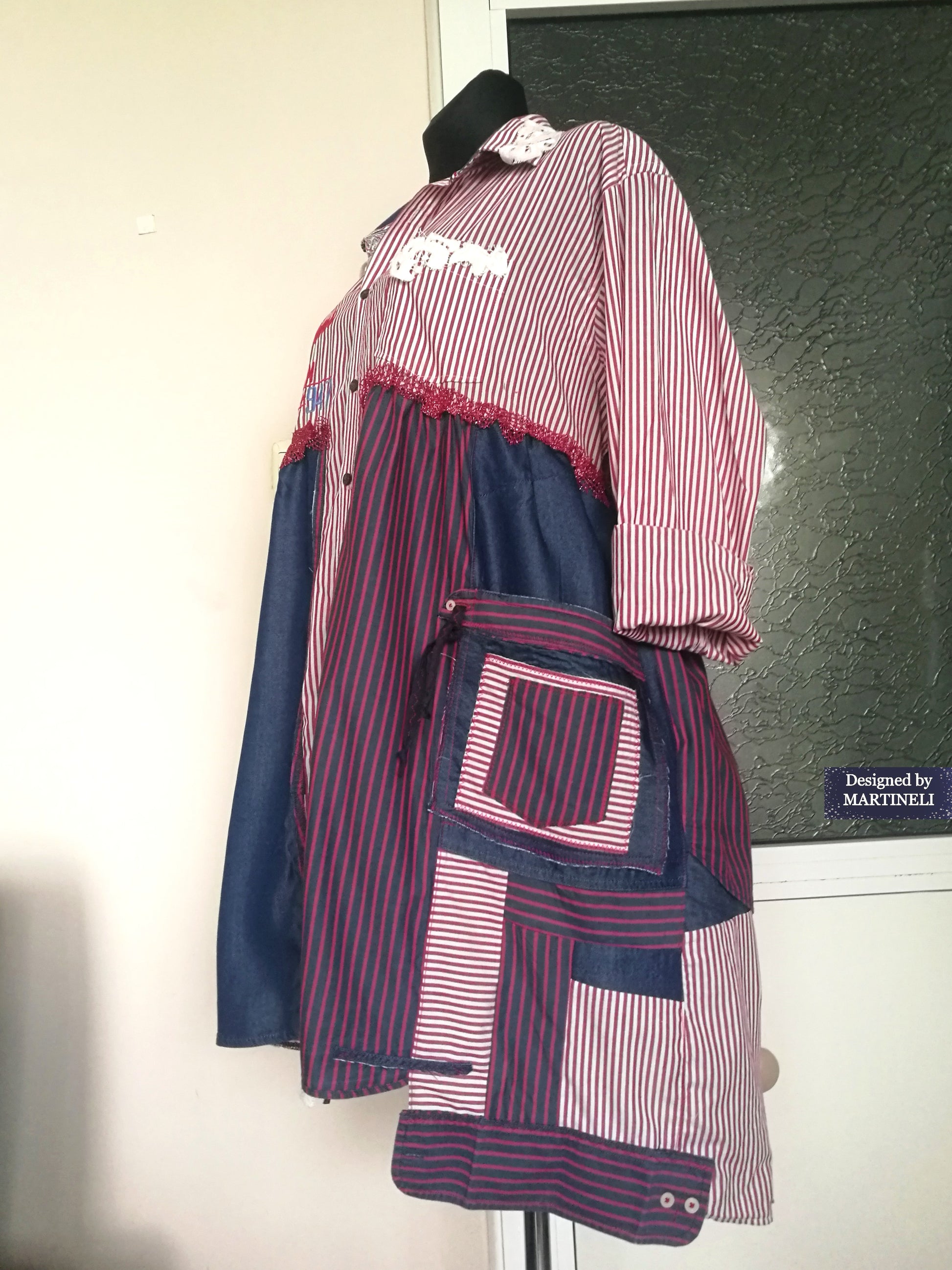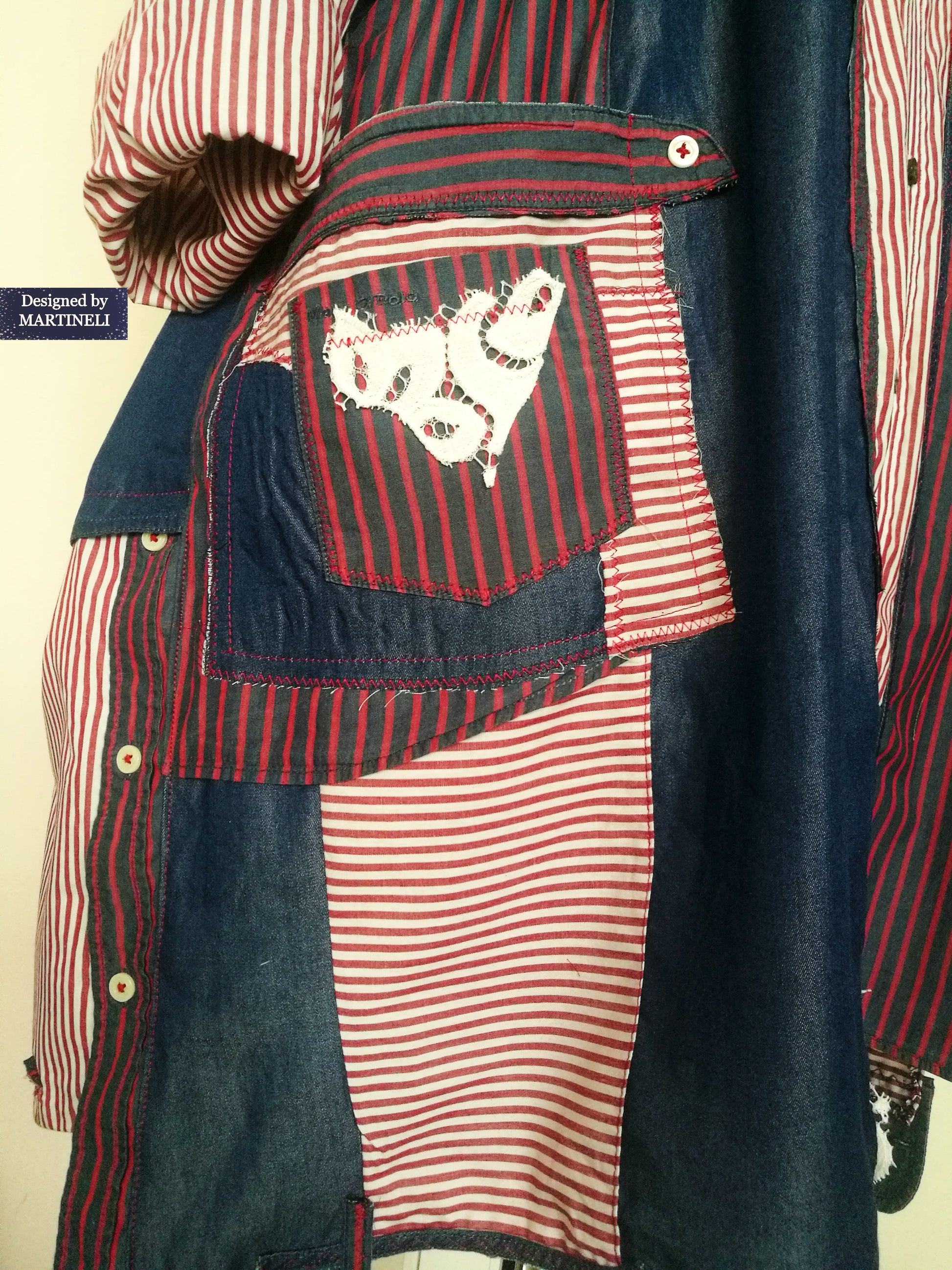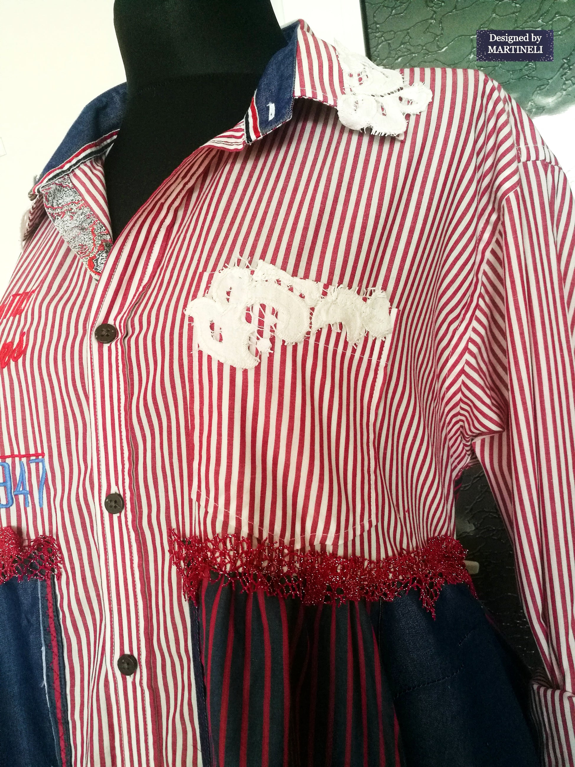 I used very soft MAN striped shirts in red/blue/white,very fine denim fabric, laces.