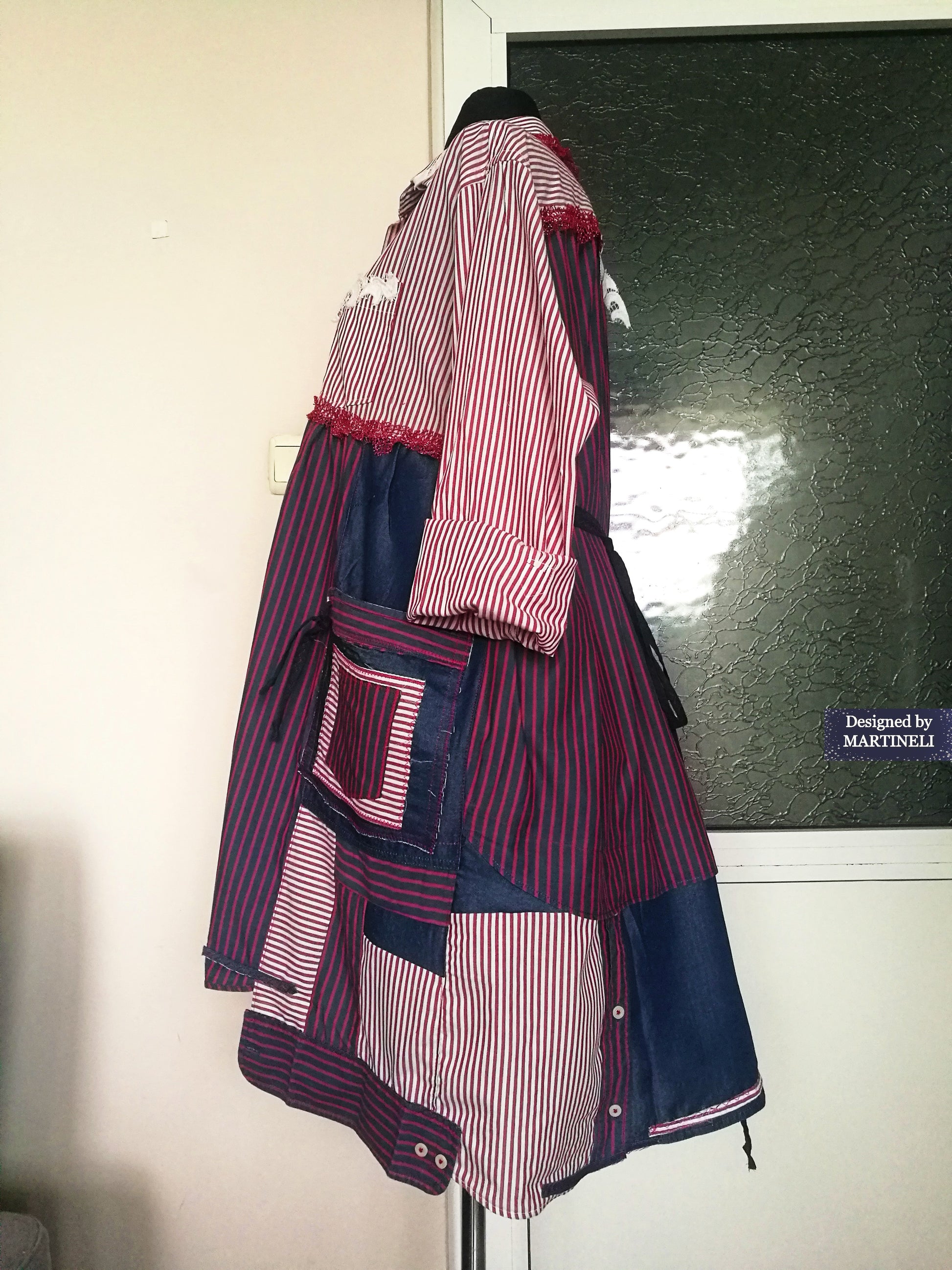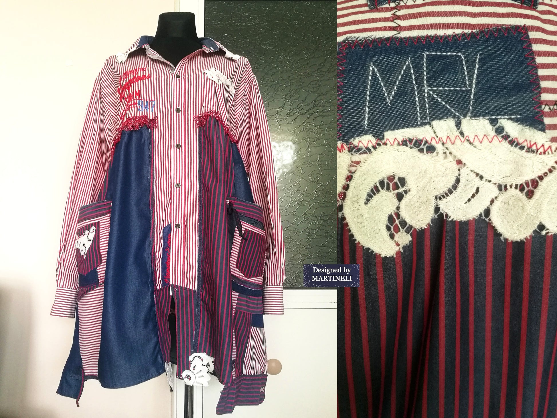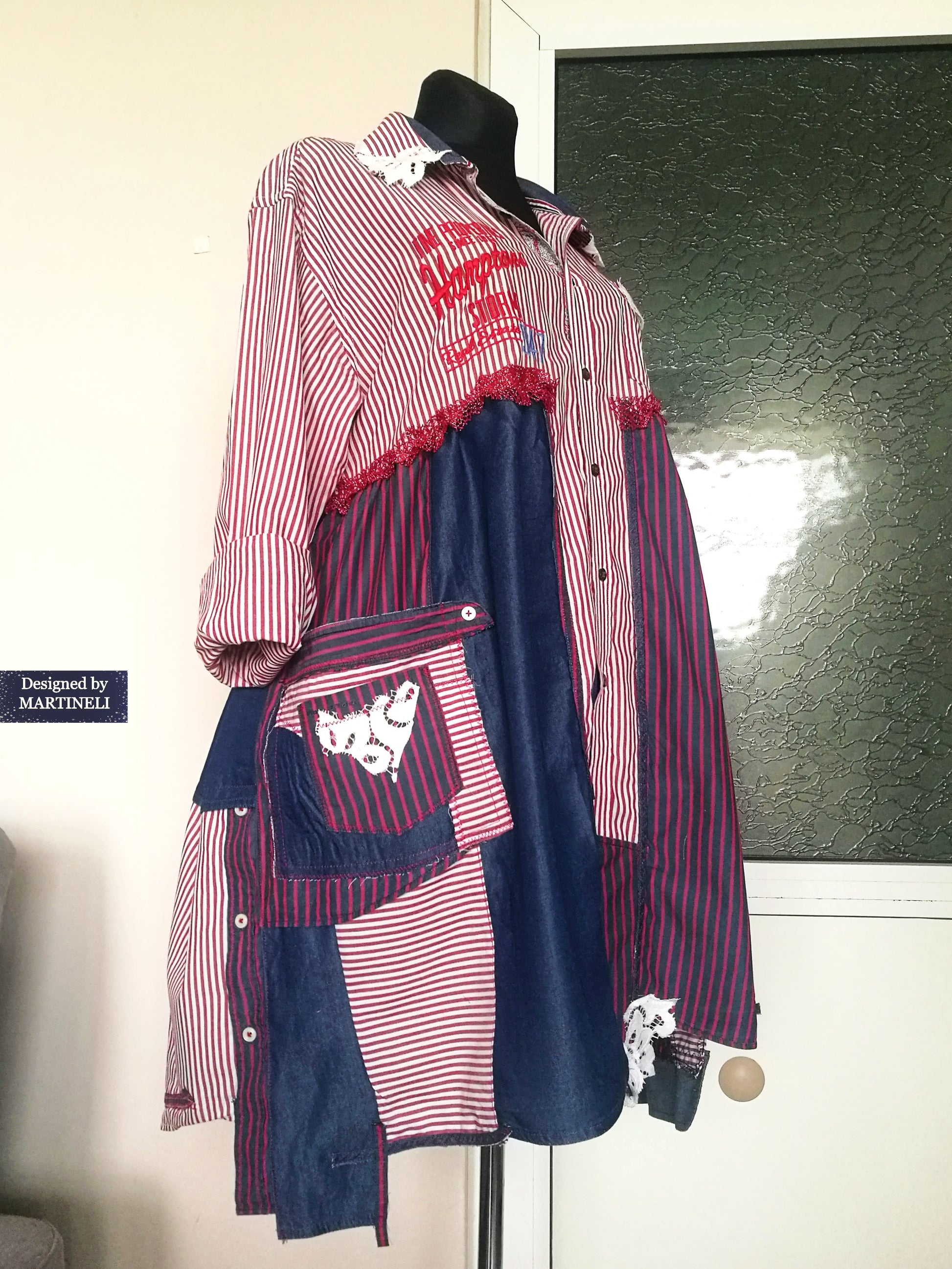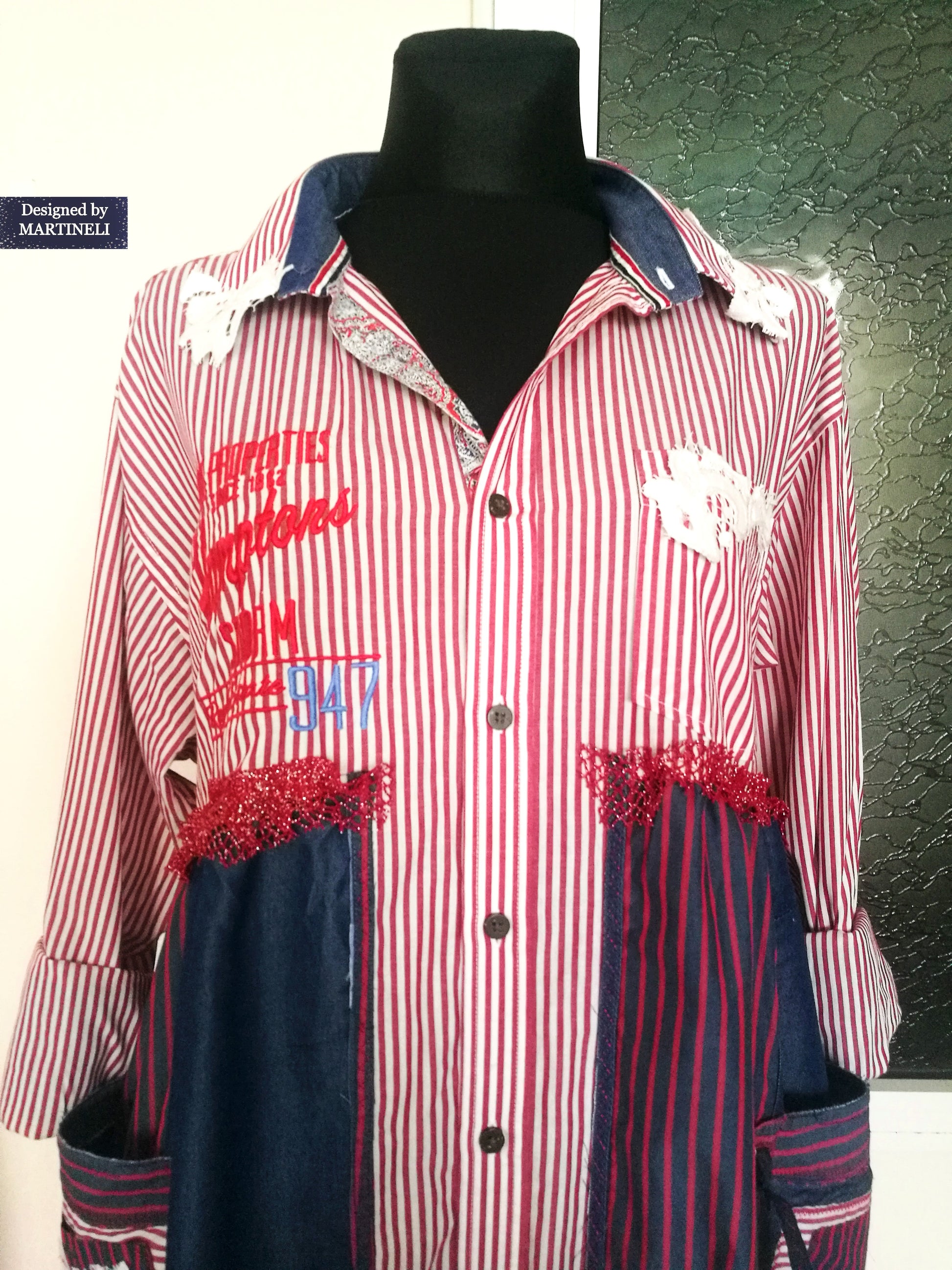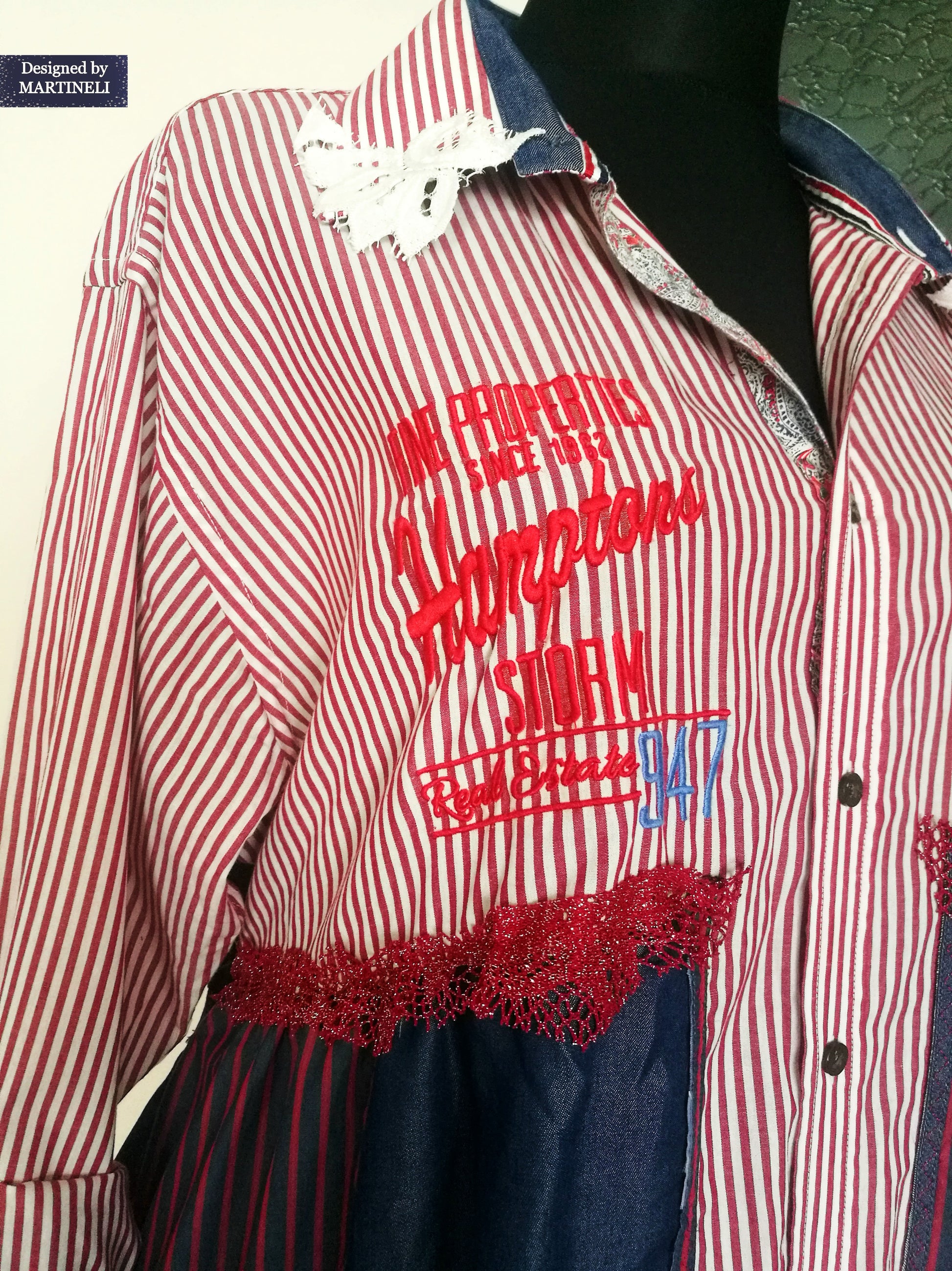 I used very soft MAN striped shirts in red/blue/white,very fine denim fabric, laces.