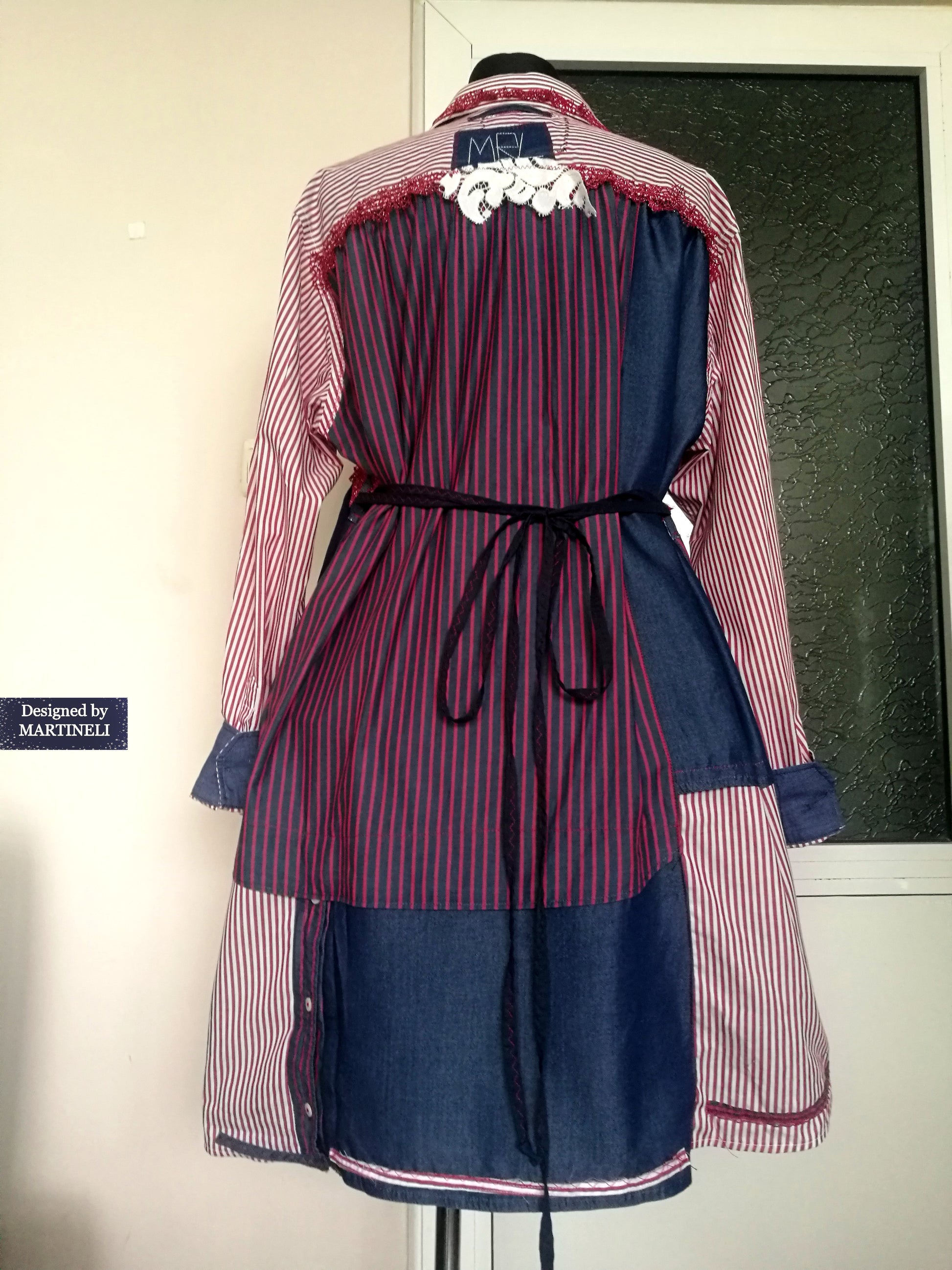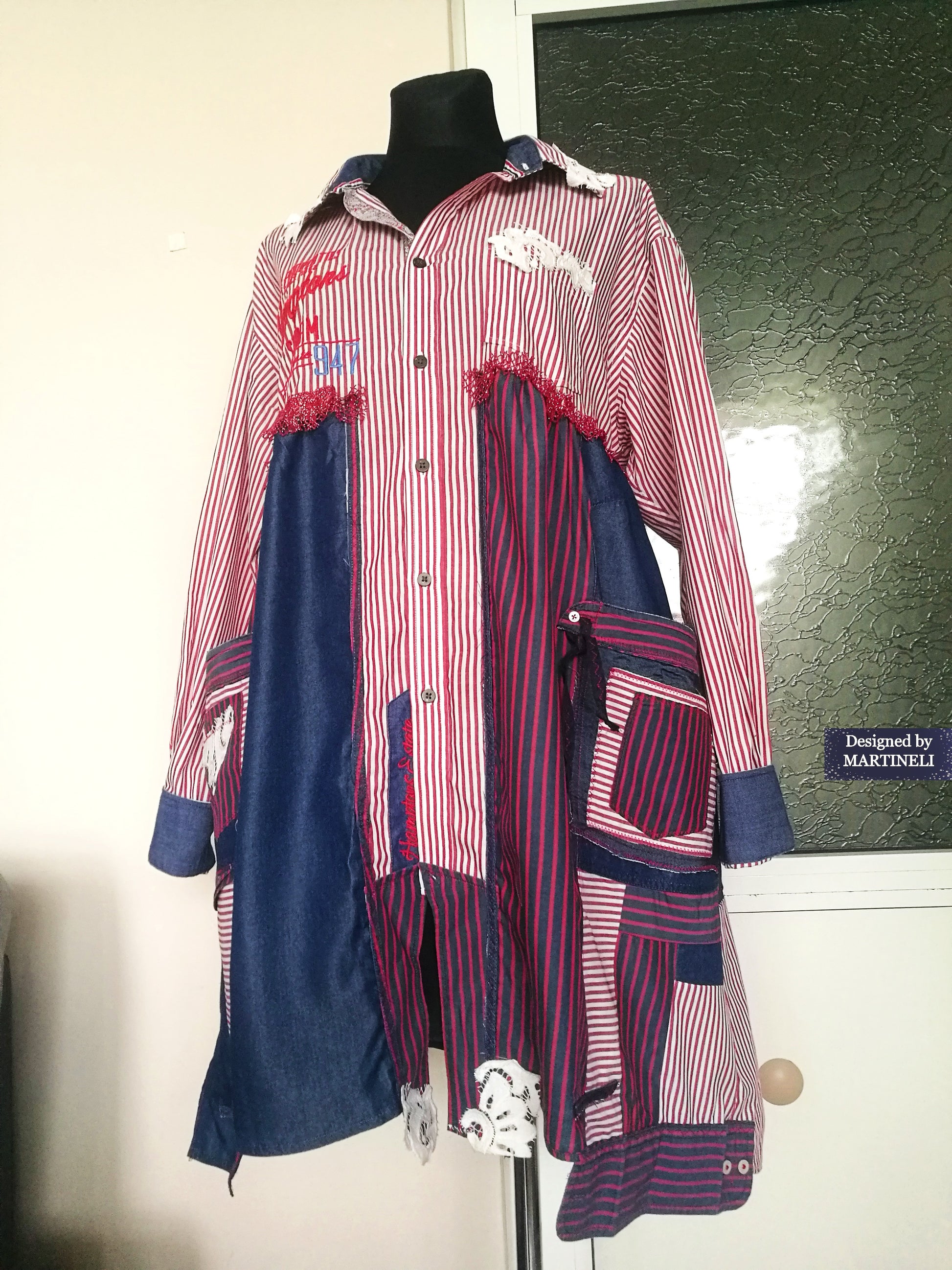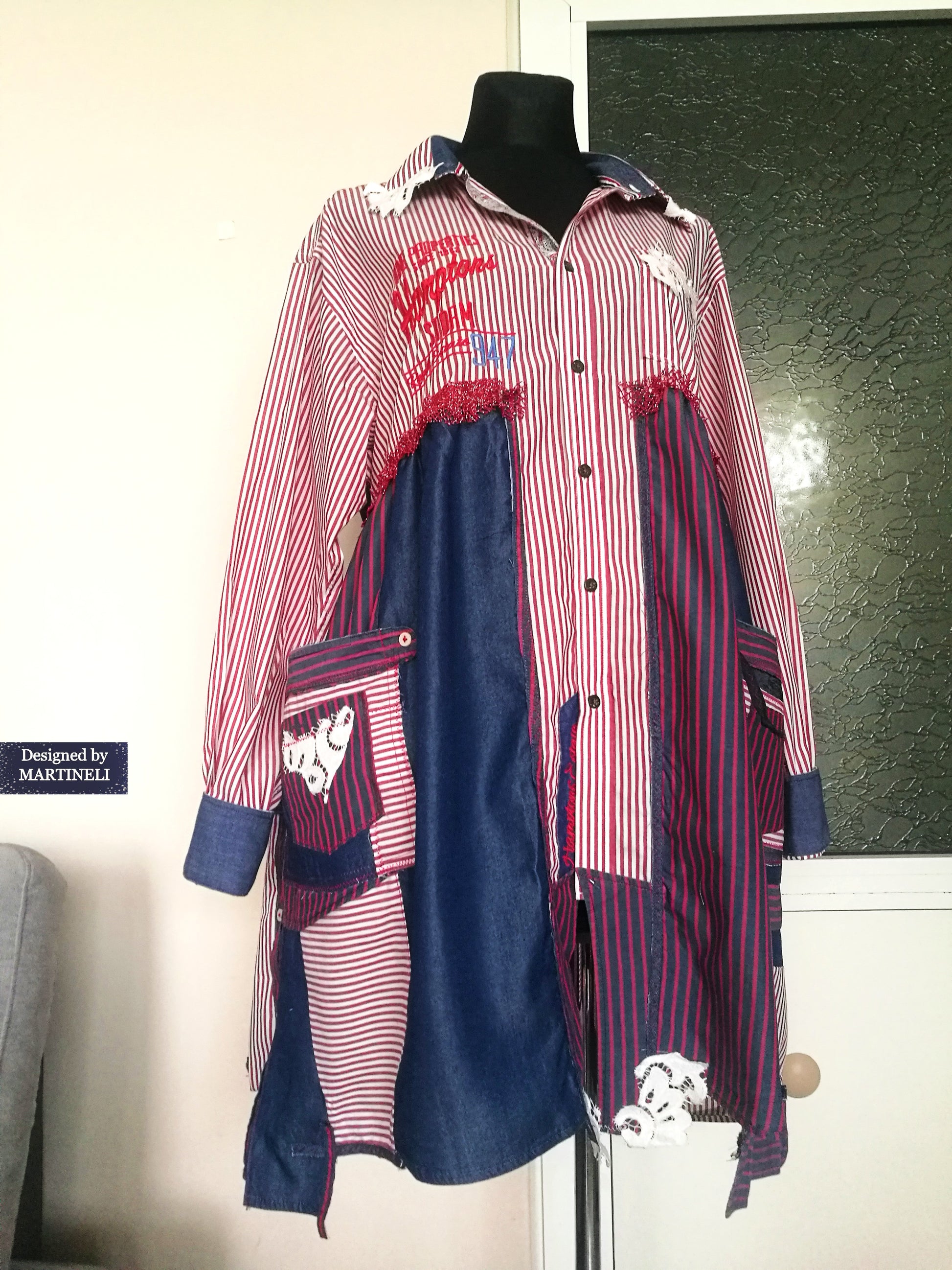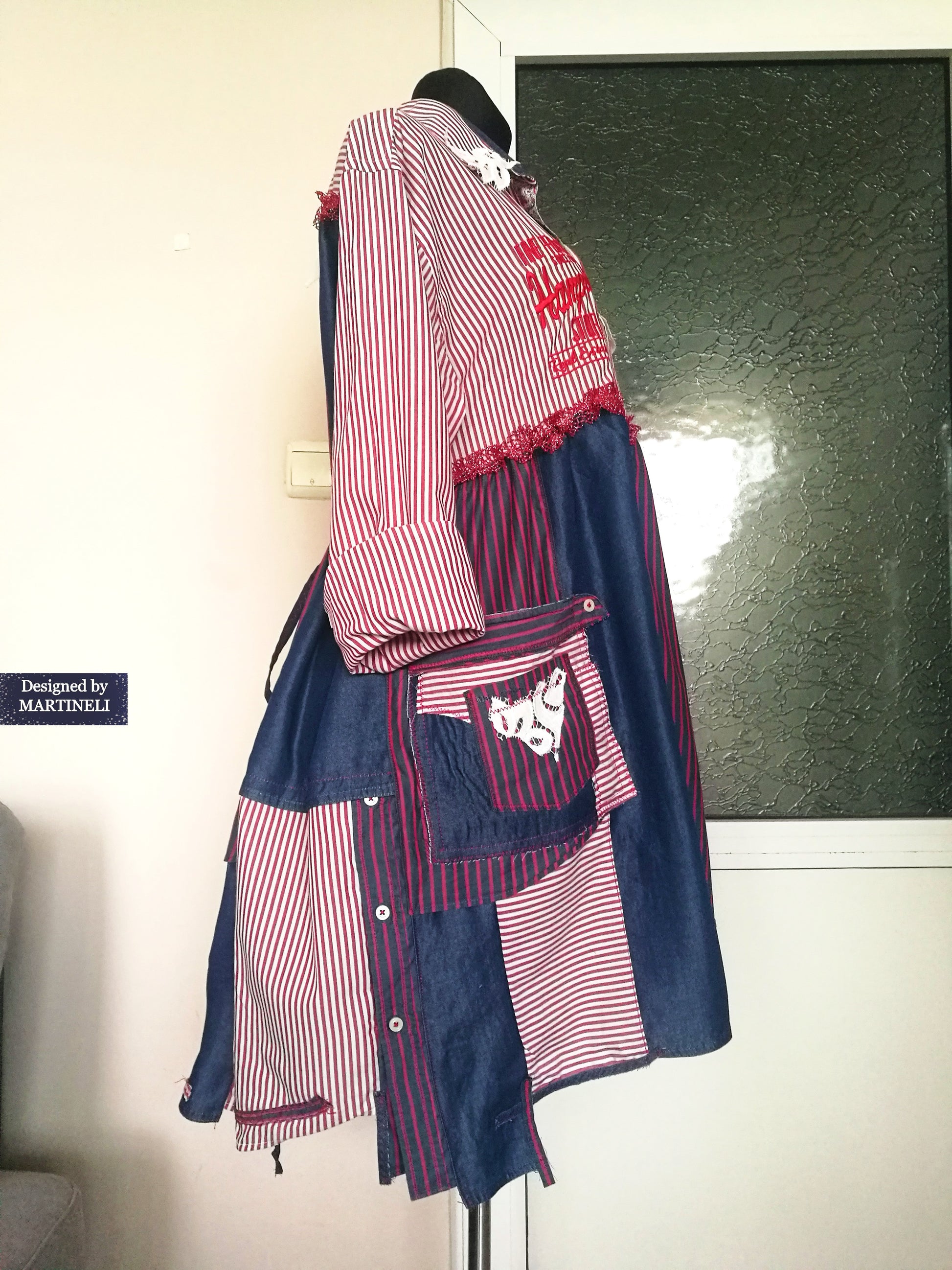 I used very soft MAN striped shirts in red/blue/white,very fine denim fabric, laces.