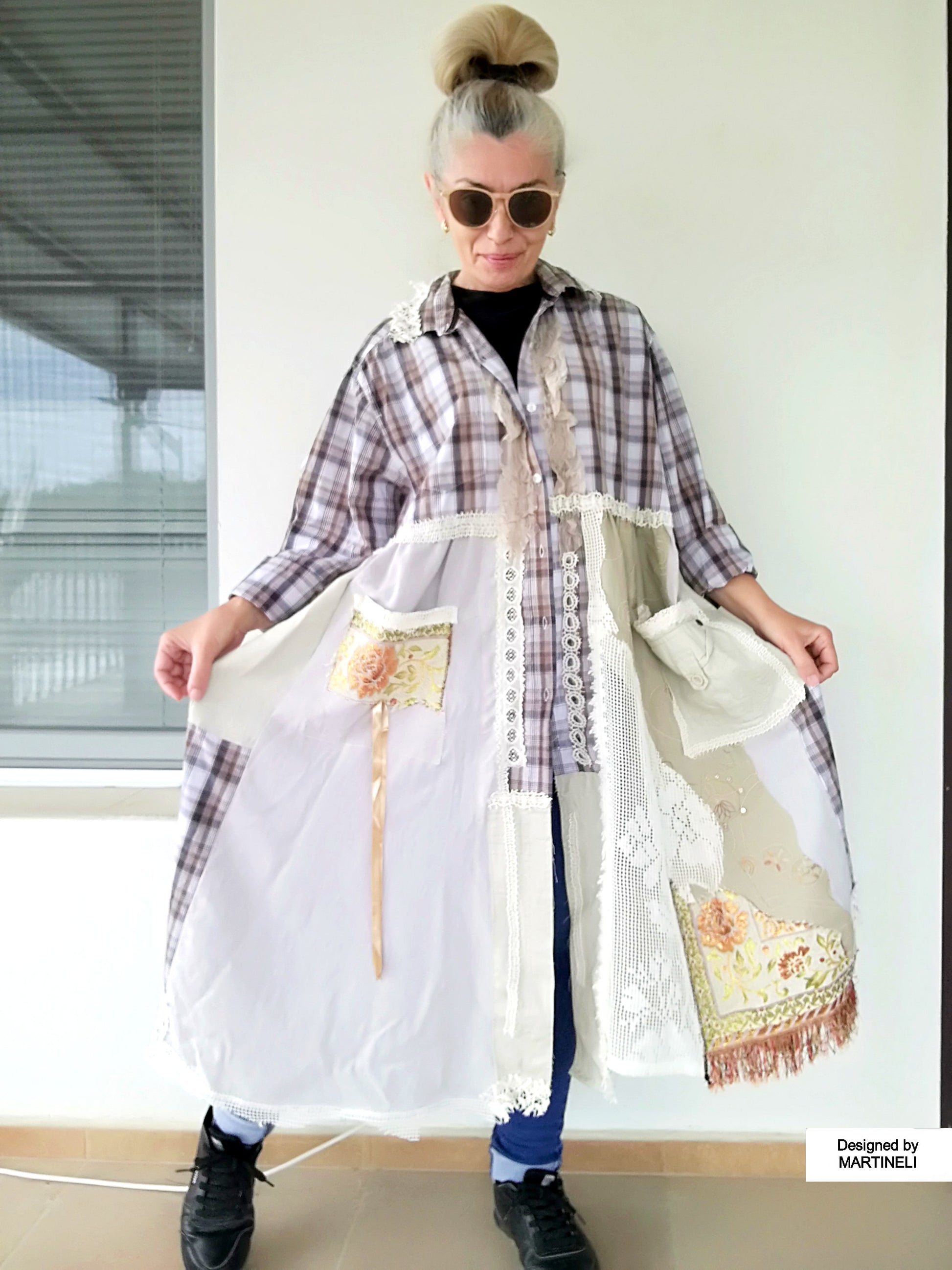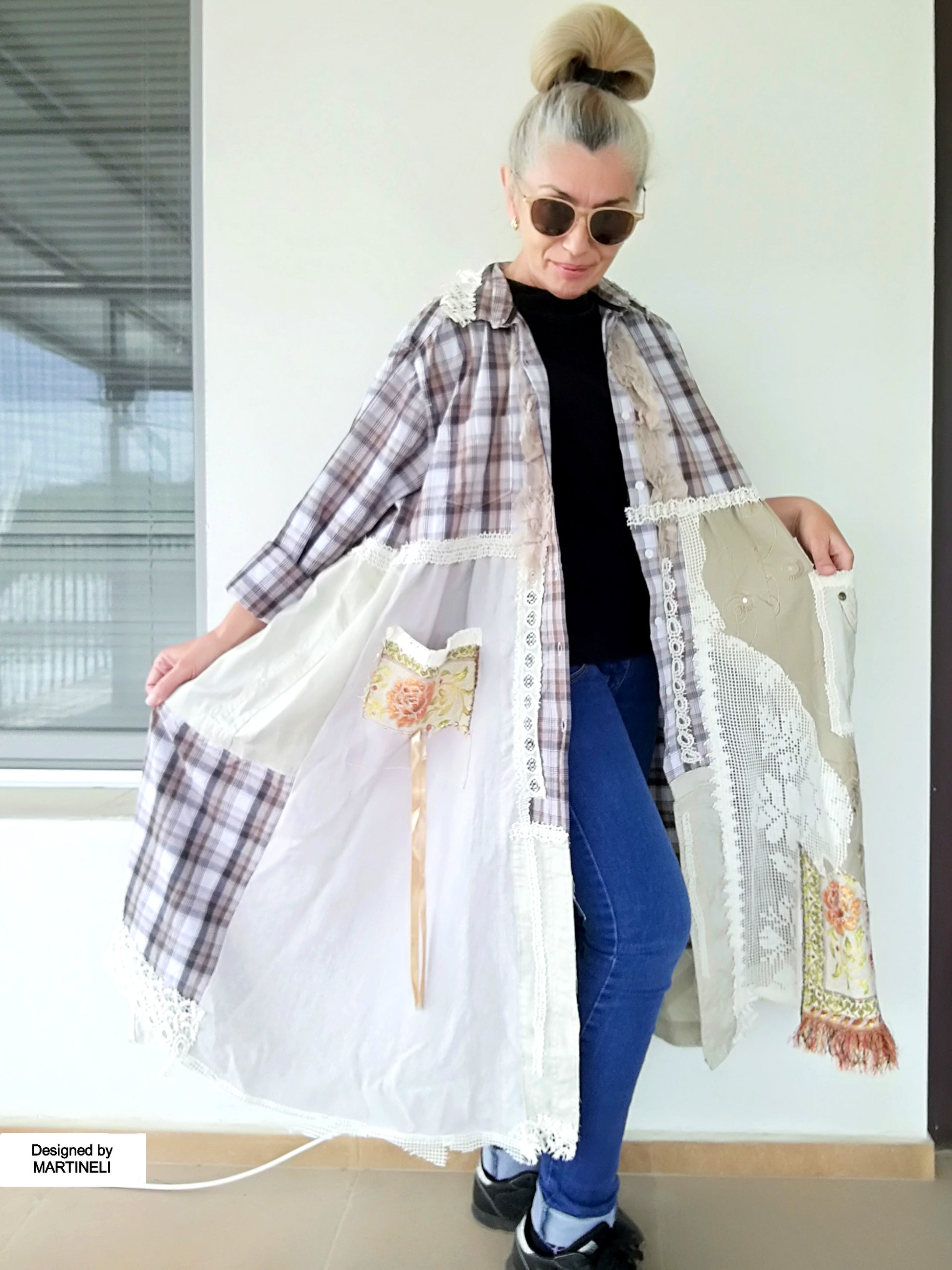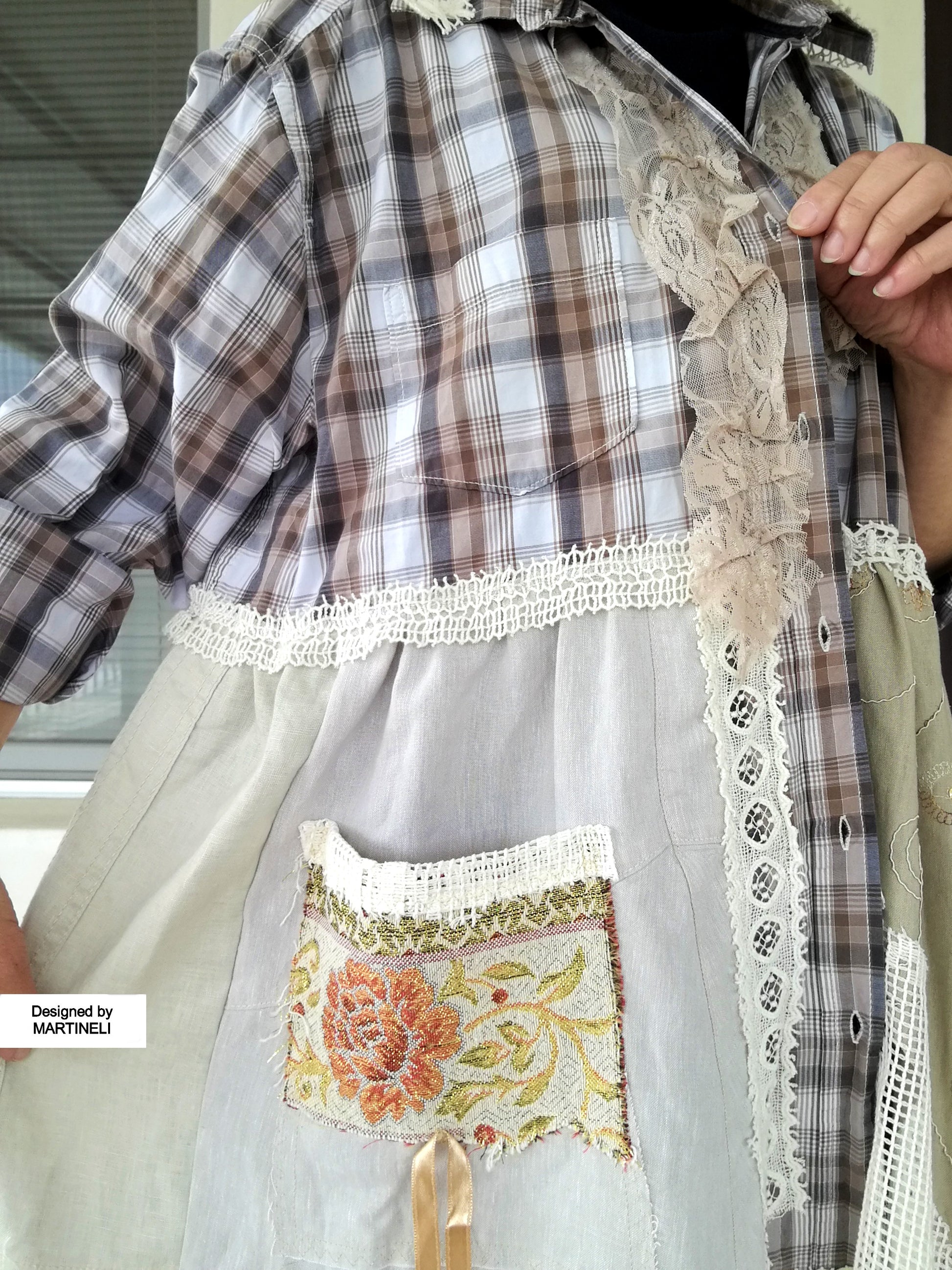 I used plaid cotton MAN SHIRT in beige nuances, linen in different nuances, floral tapestry, laces.