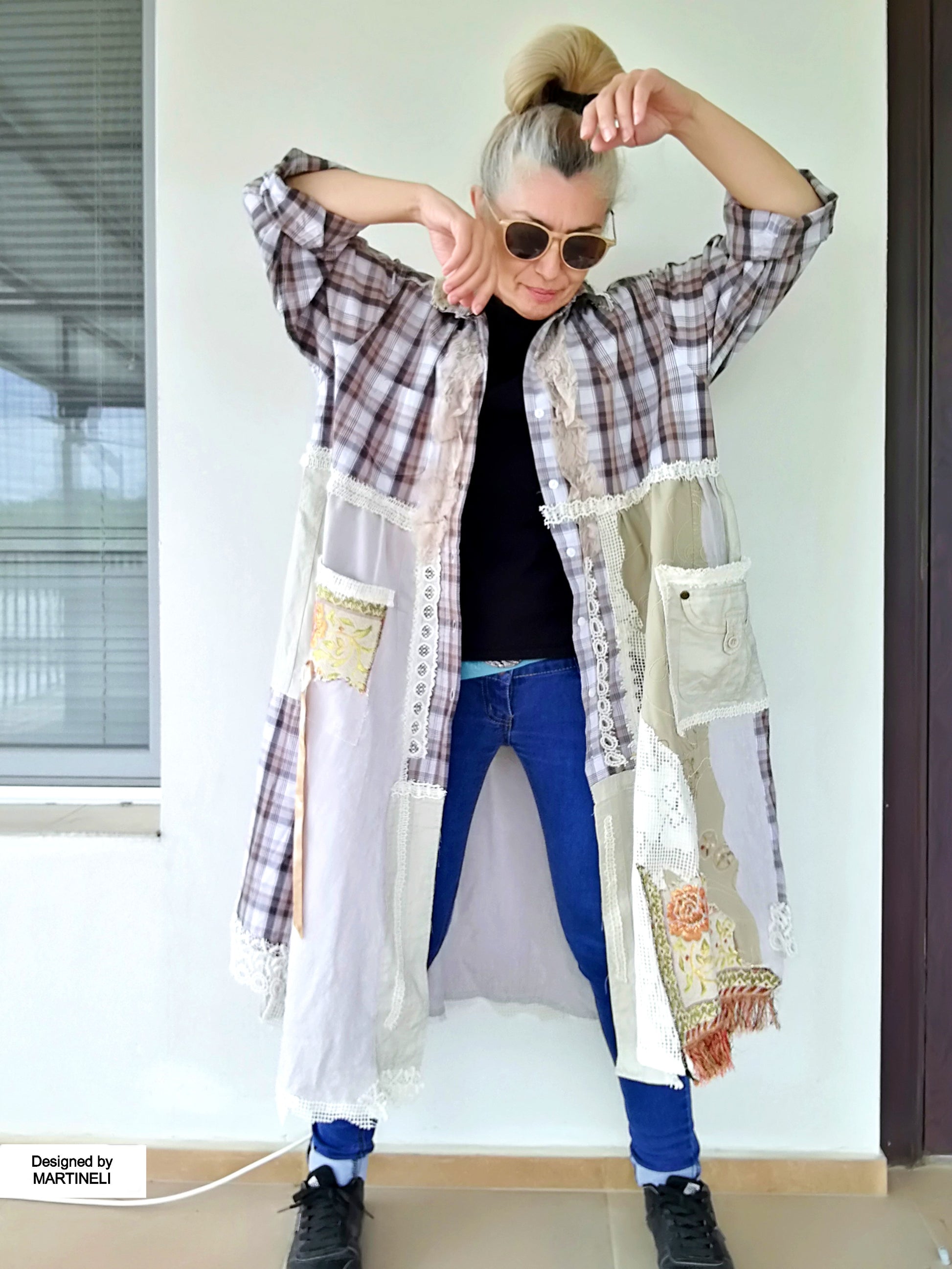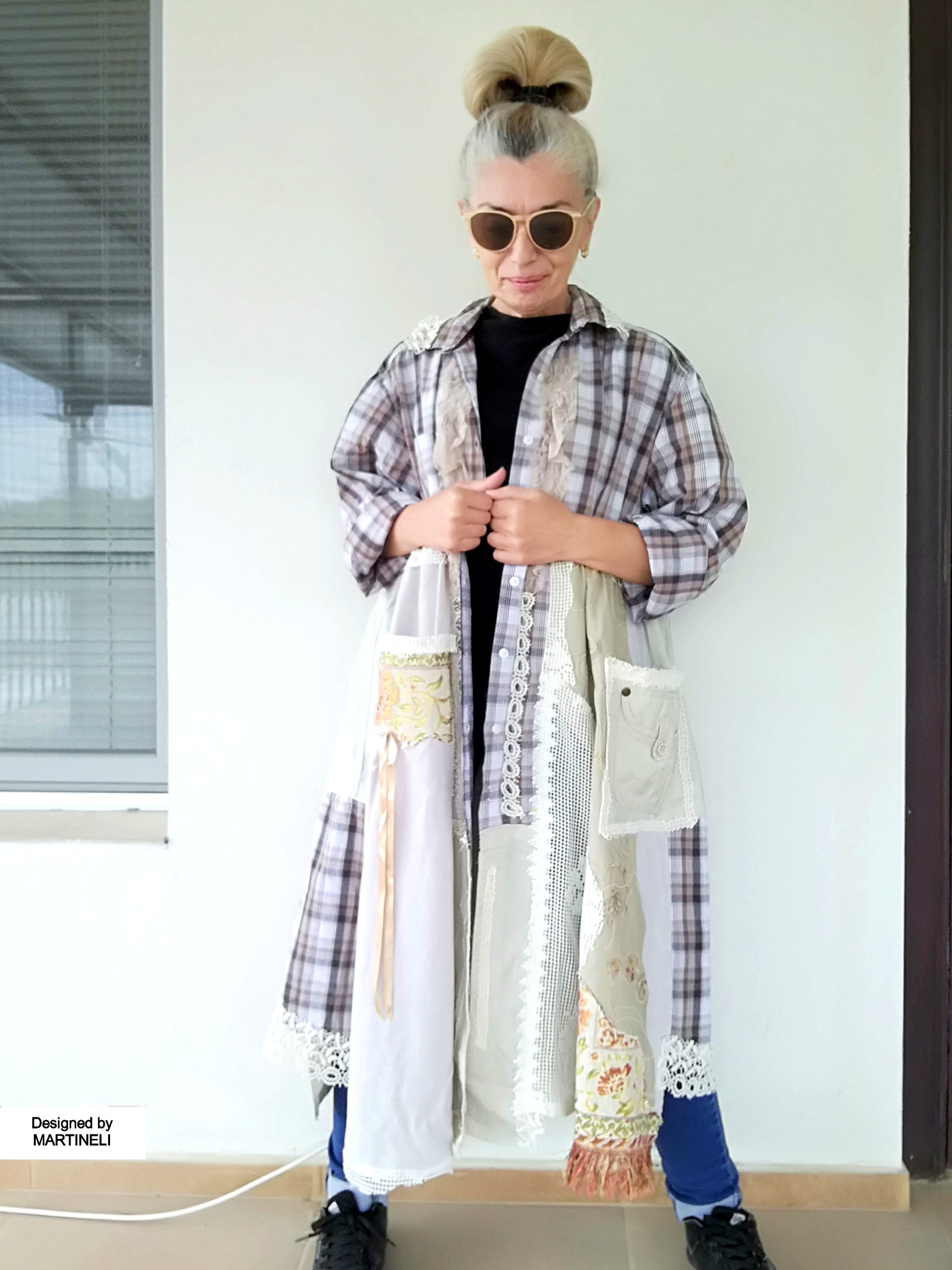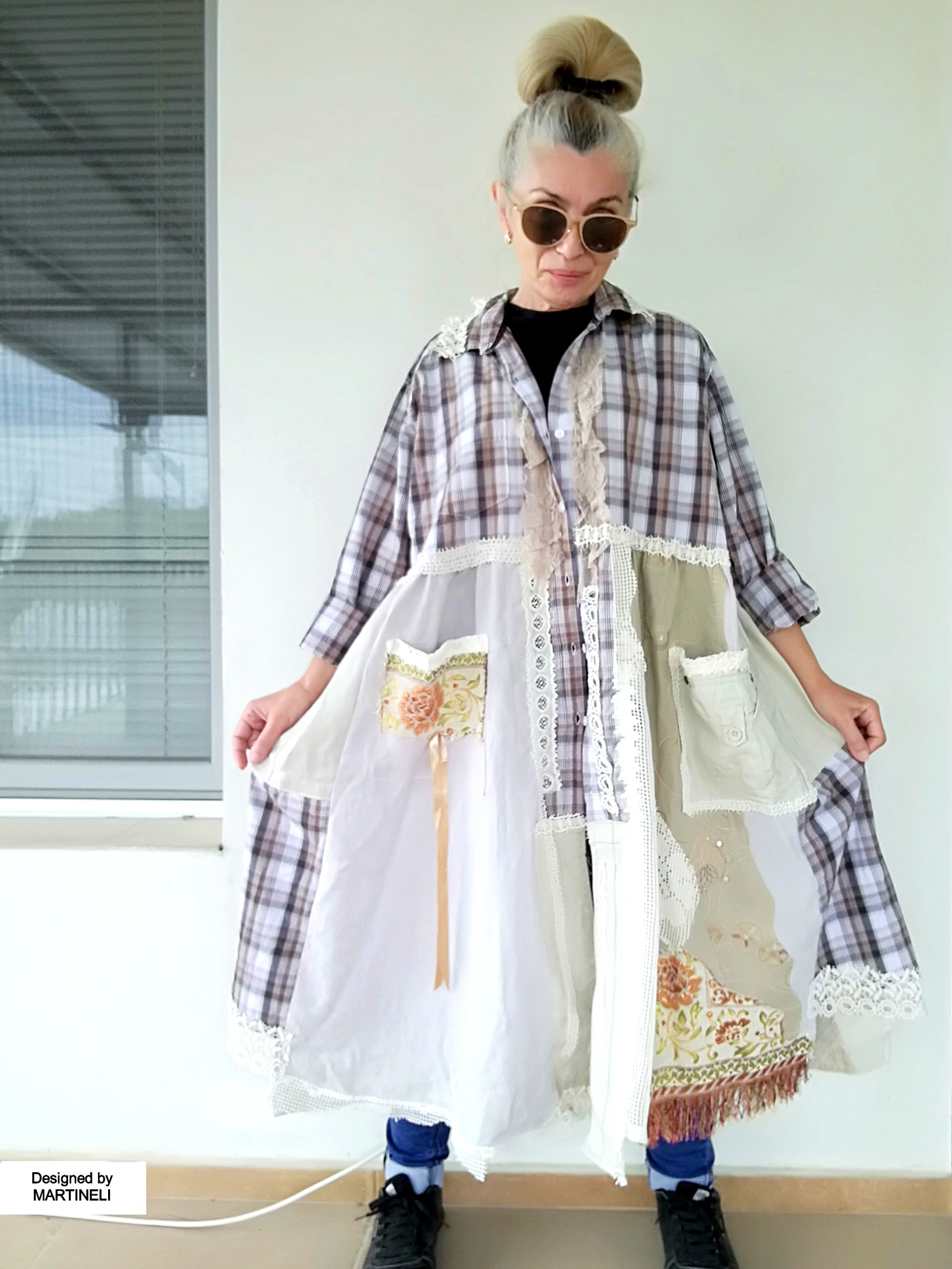 I designed and constructed this 2XL plus size patchwork duster jacket.