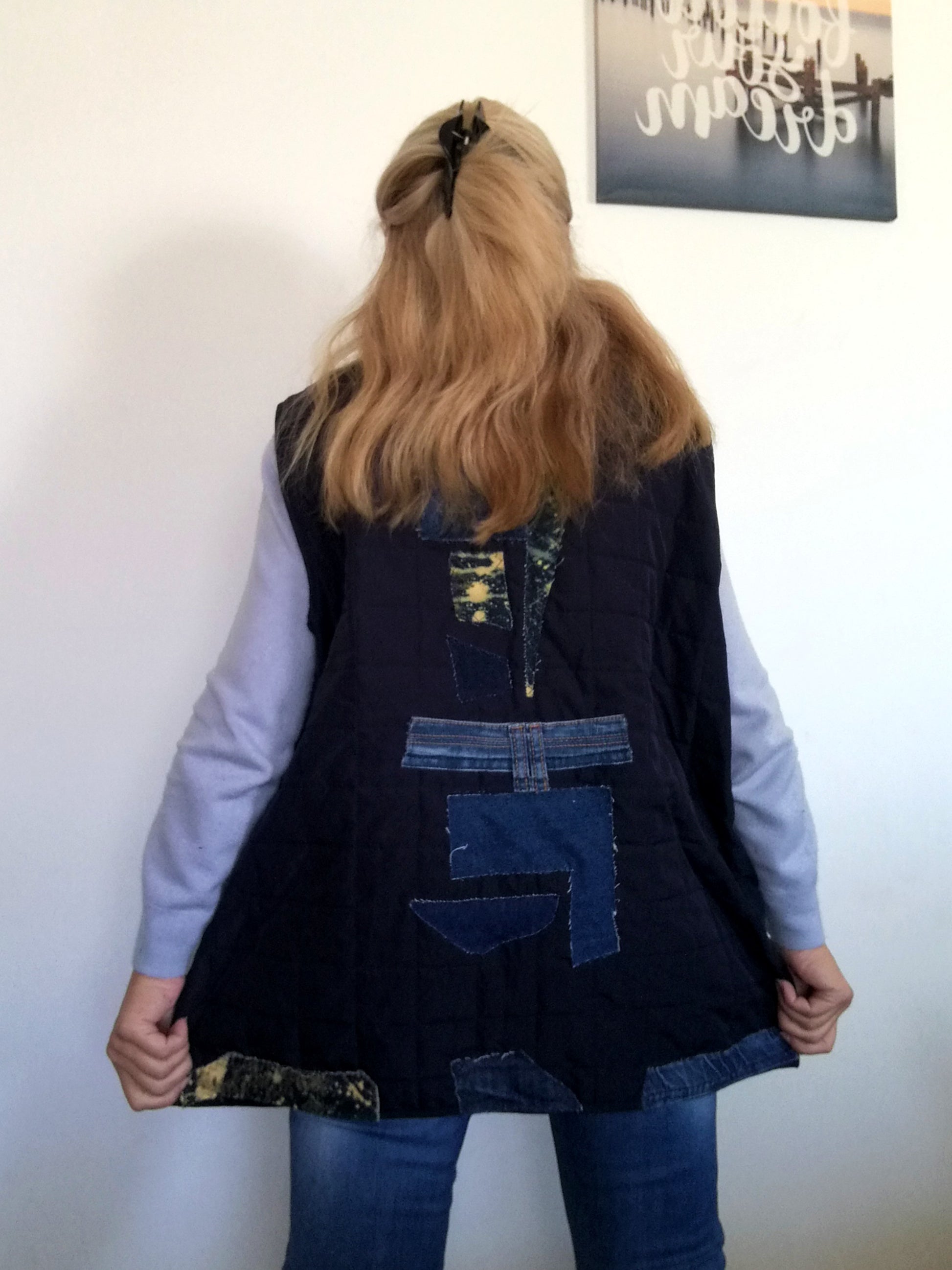 I used NEW dark blue quilted cotton blend vest,blue denim, blue/yellow denim.