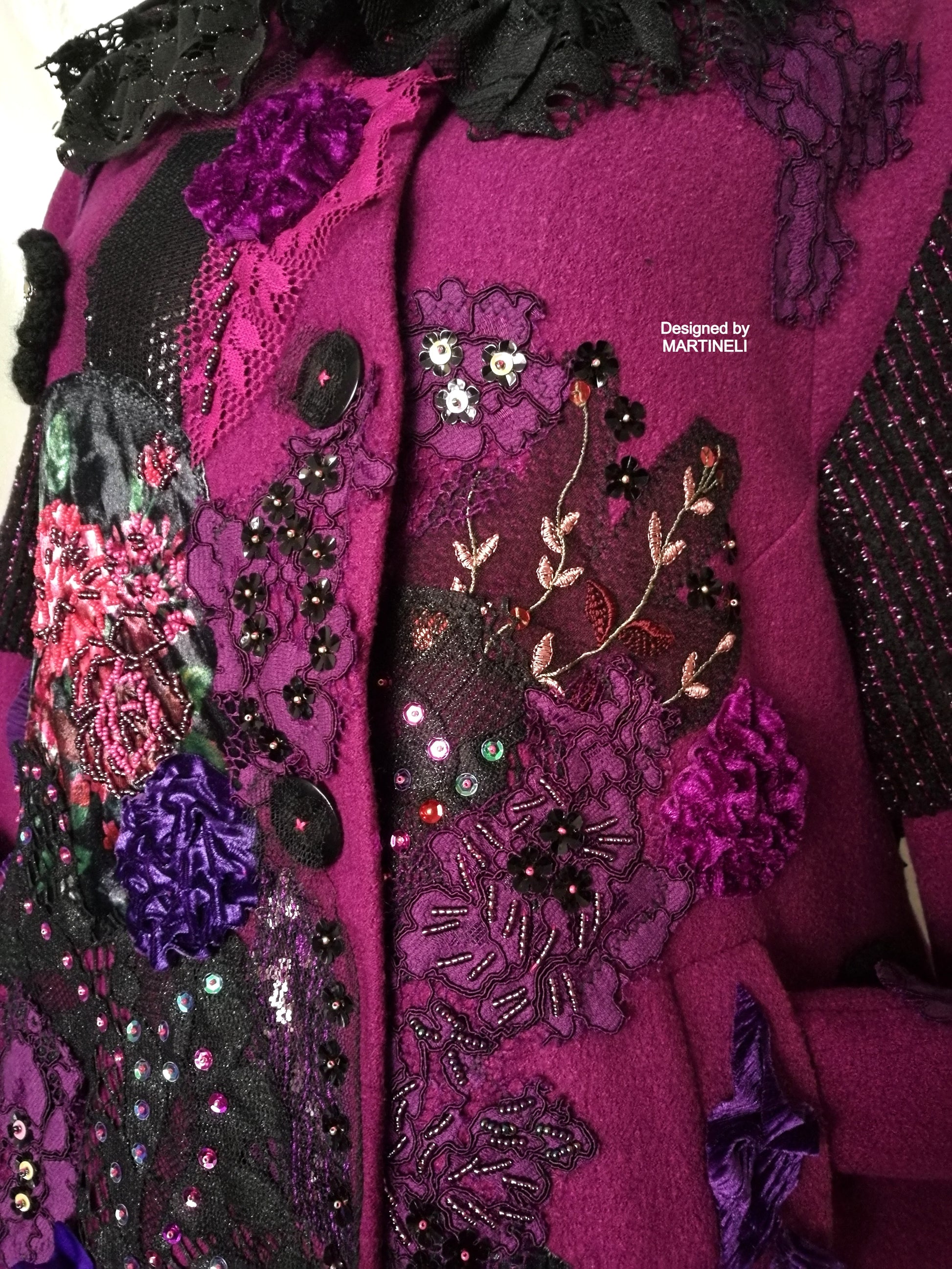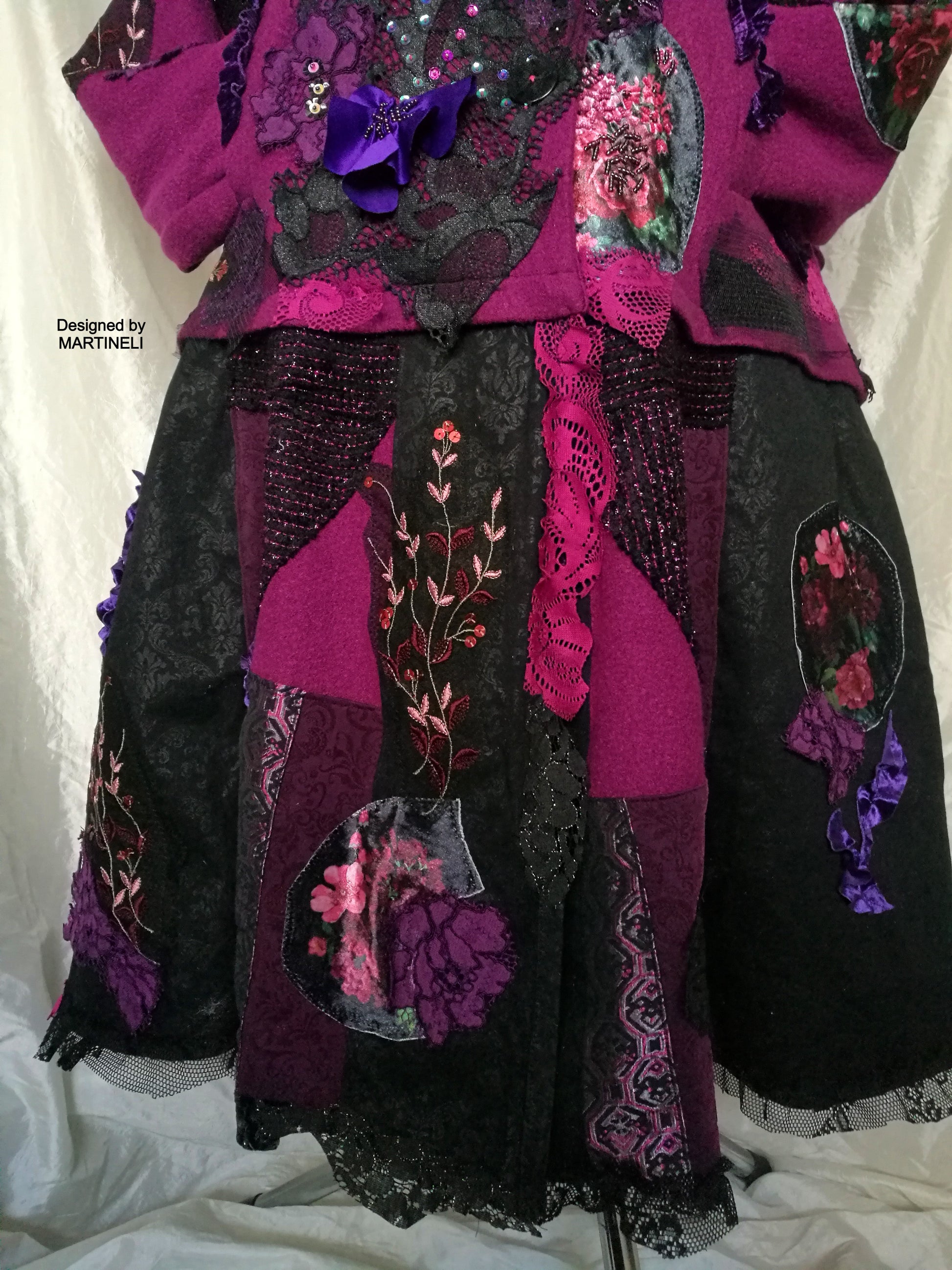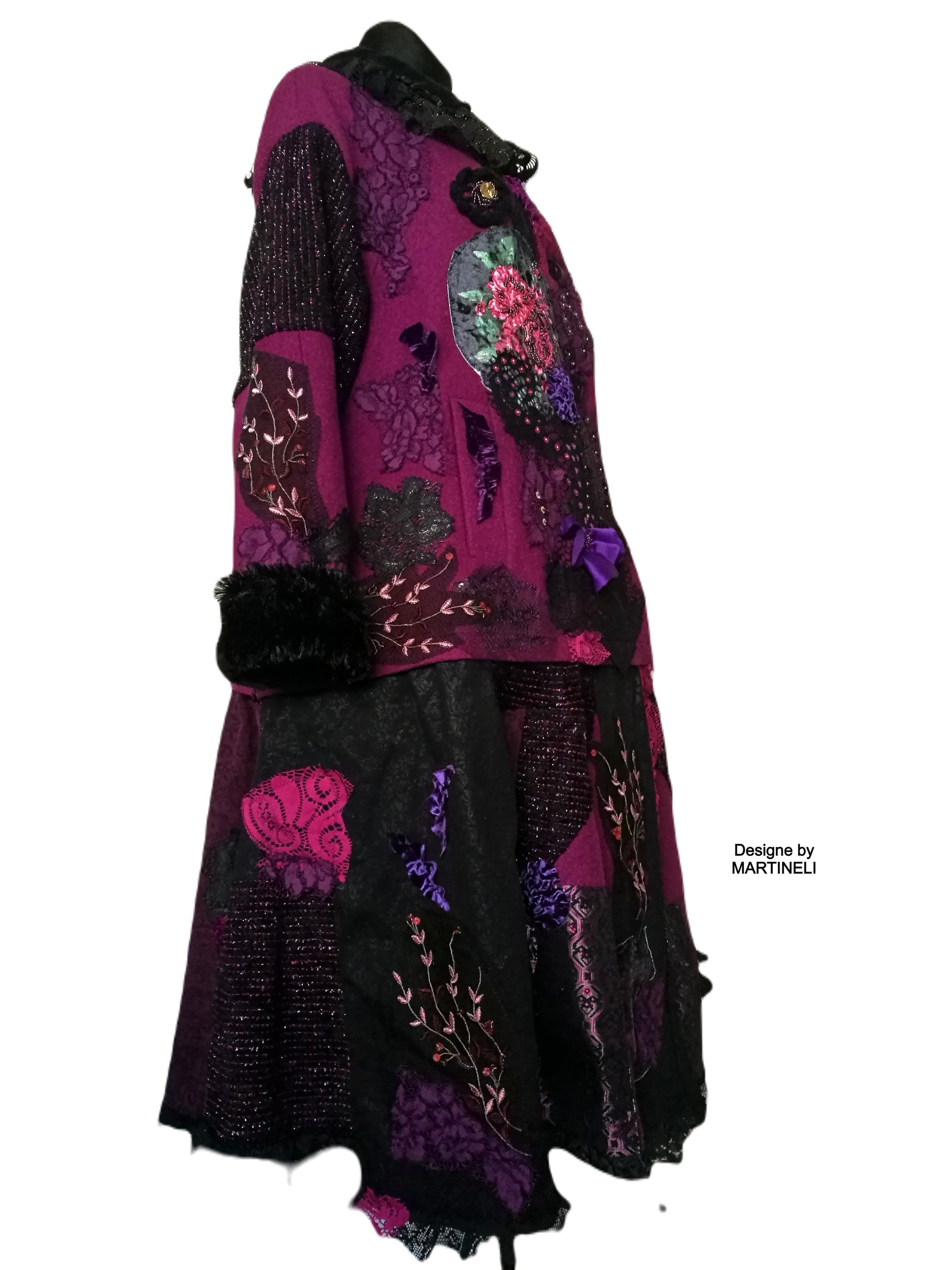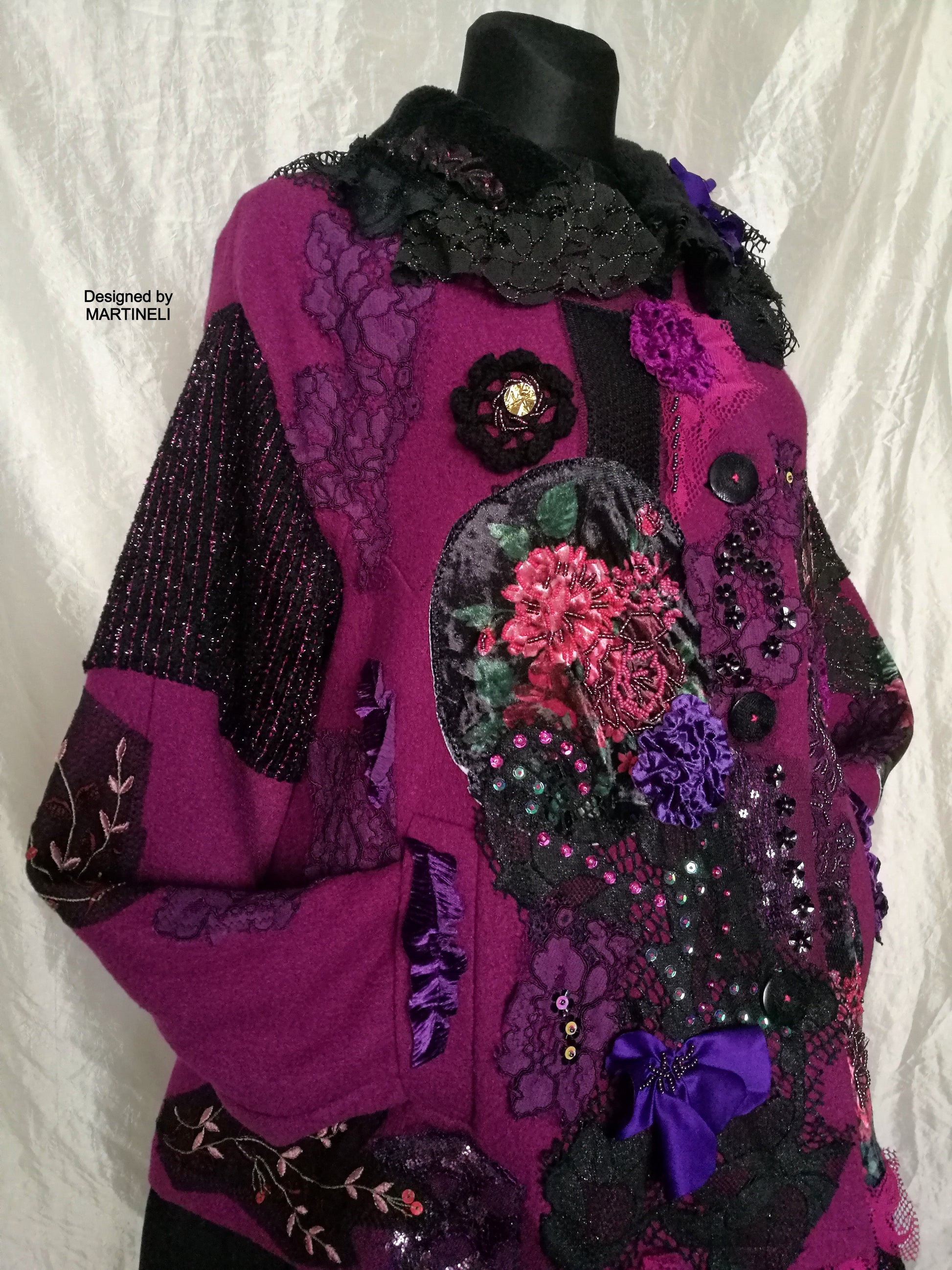 I used a strawberry pink wool blend jacket, striped wool blend fabric in black/pink, different tapestry fabrics, black faux fur fabric, velvet fabrics, laces, sequins, Preciosa glass beads.