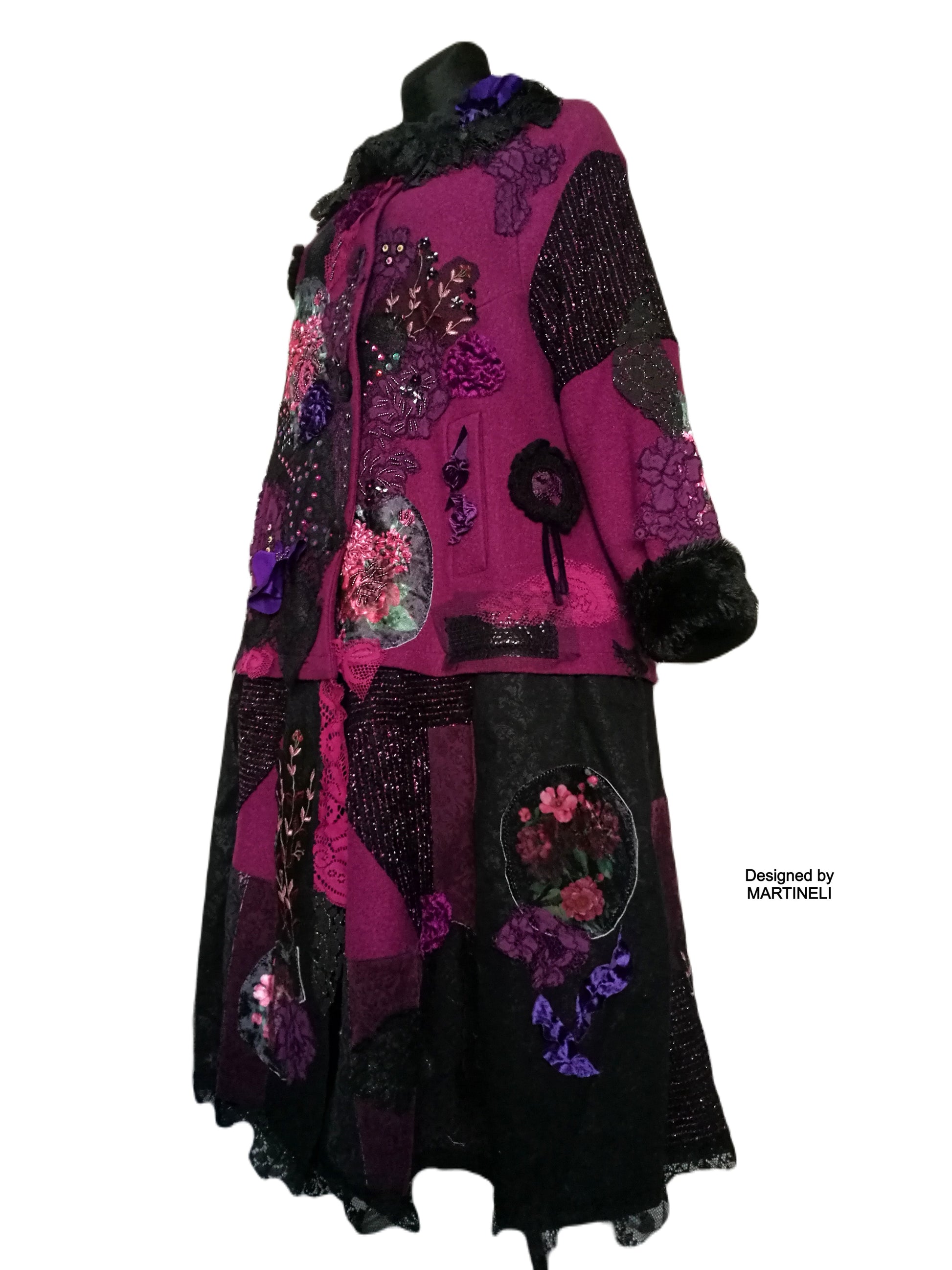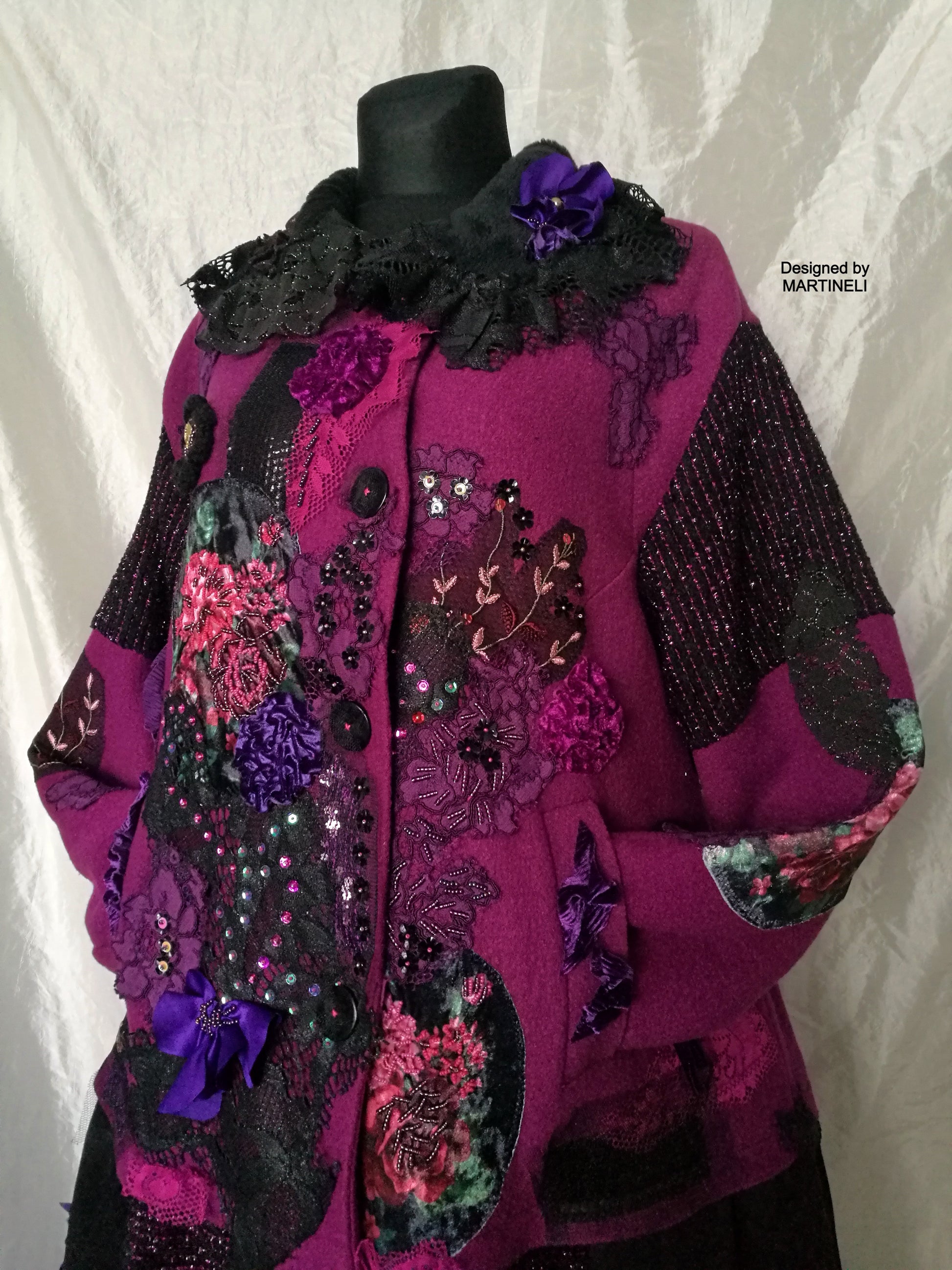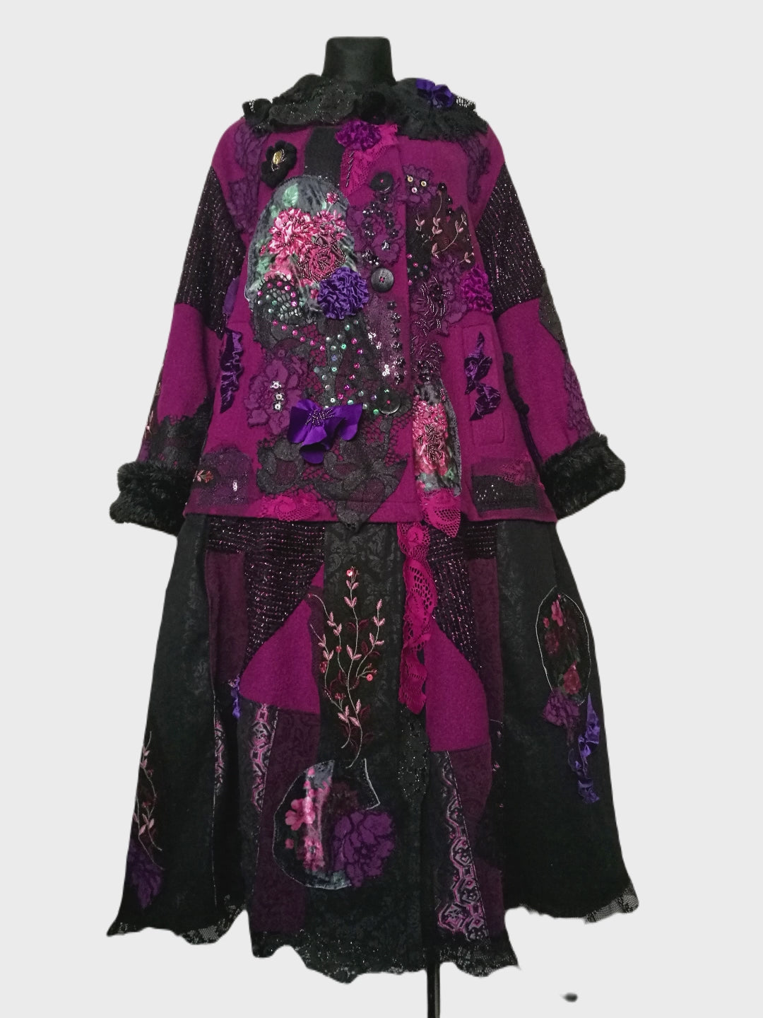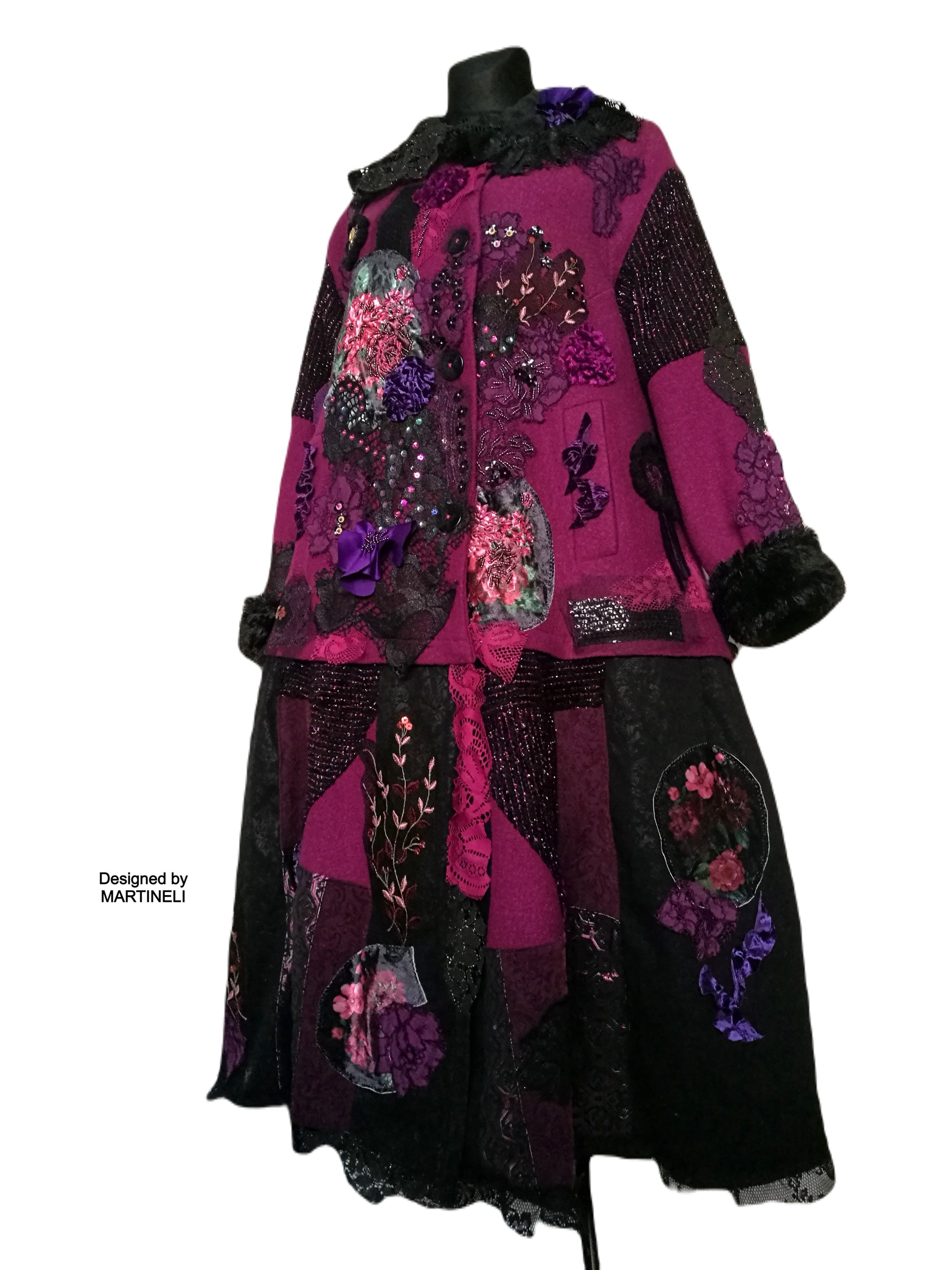 I used a strawberry pink wool blend jacket, striped wool blend fabric in black/pink, different tapestry fabrics, black faux fur fabric, velvet fabrics, laces, sequins, Preciosa glass beads.