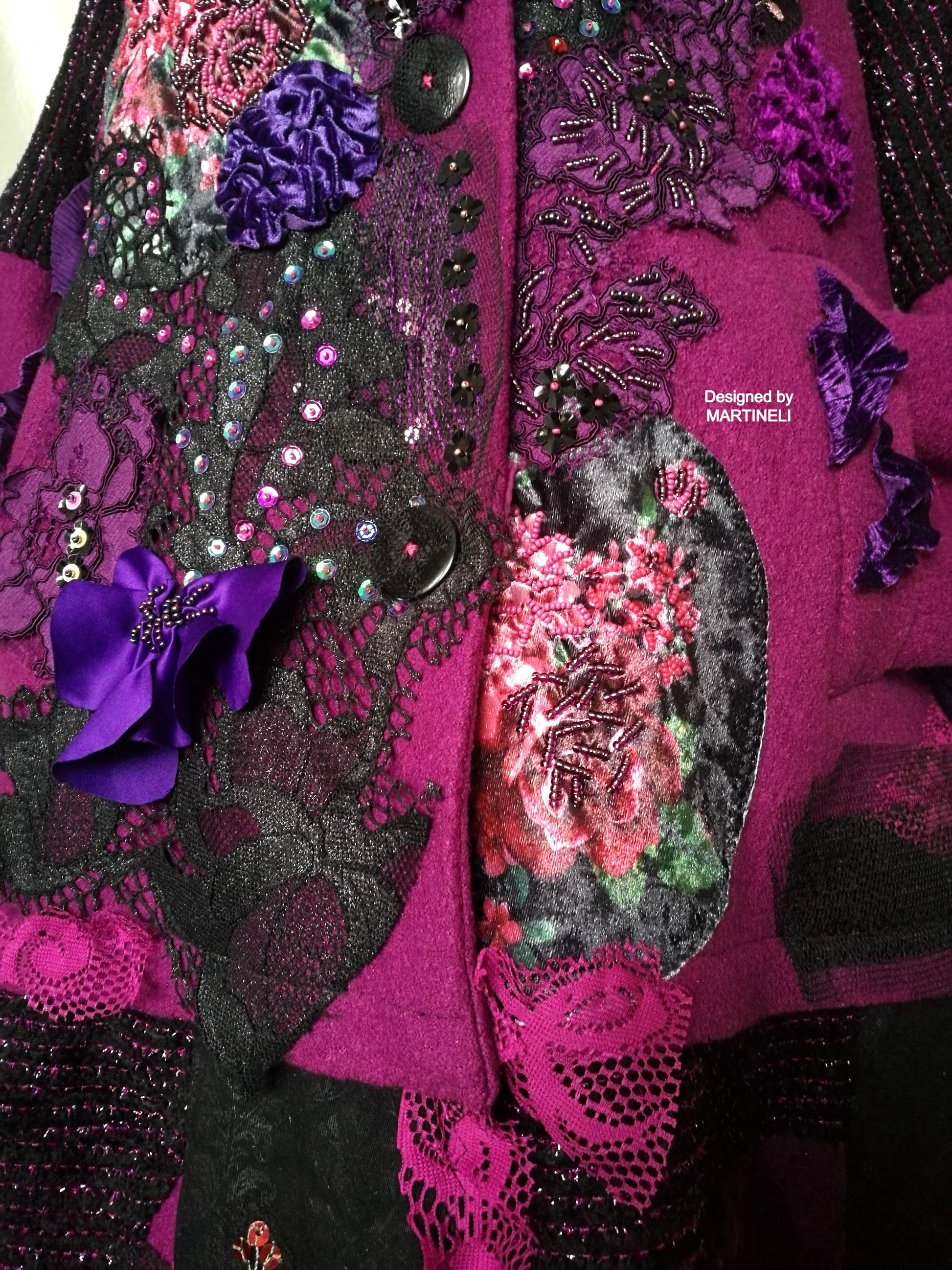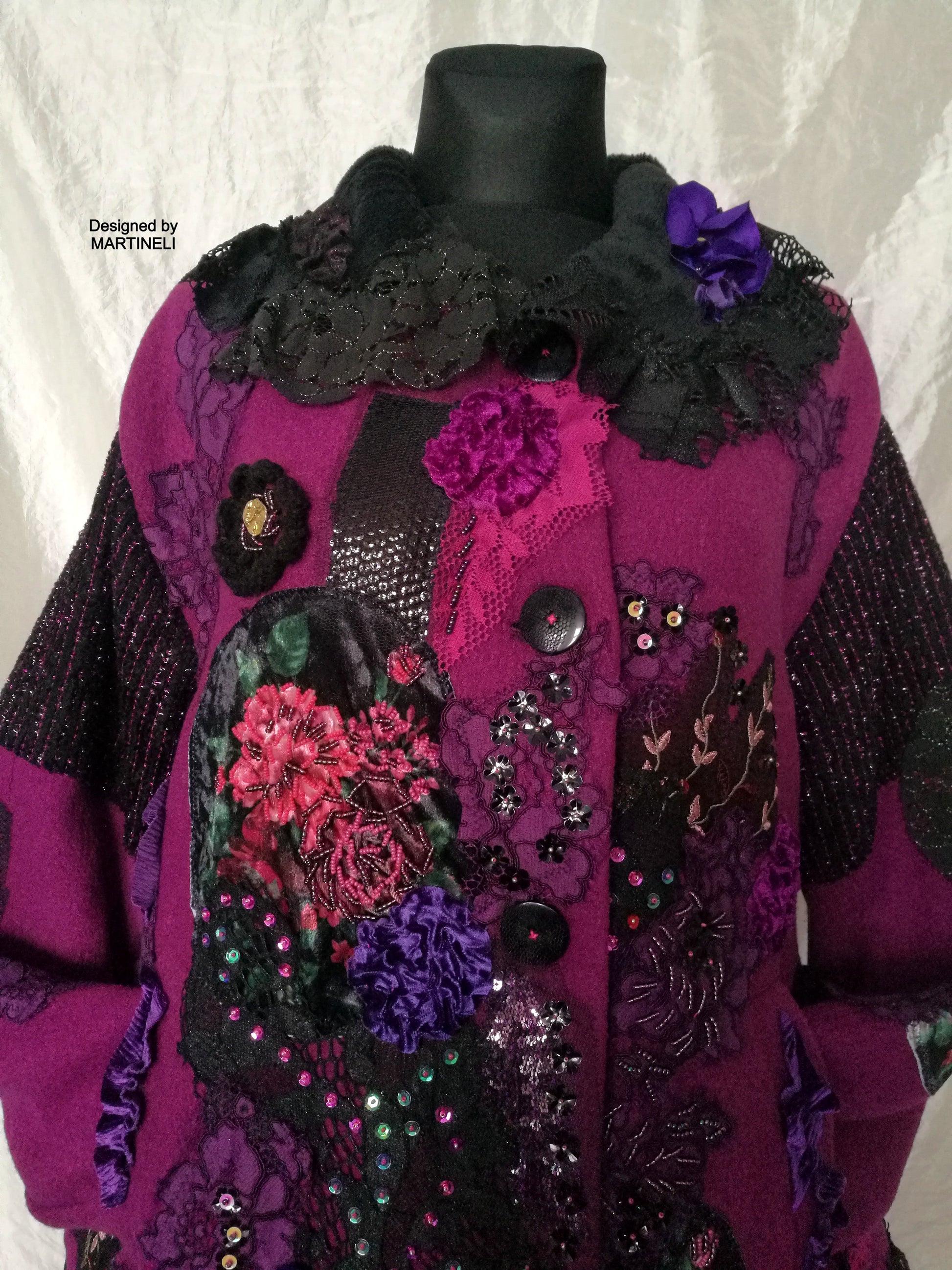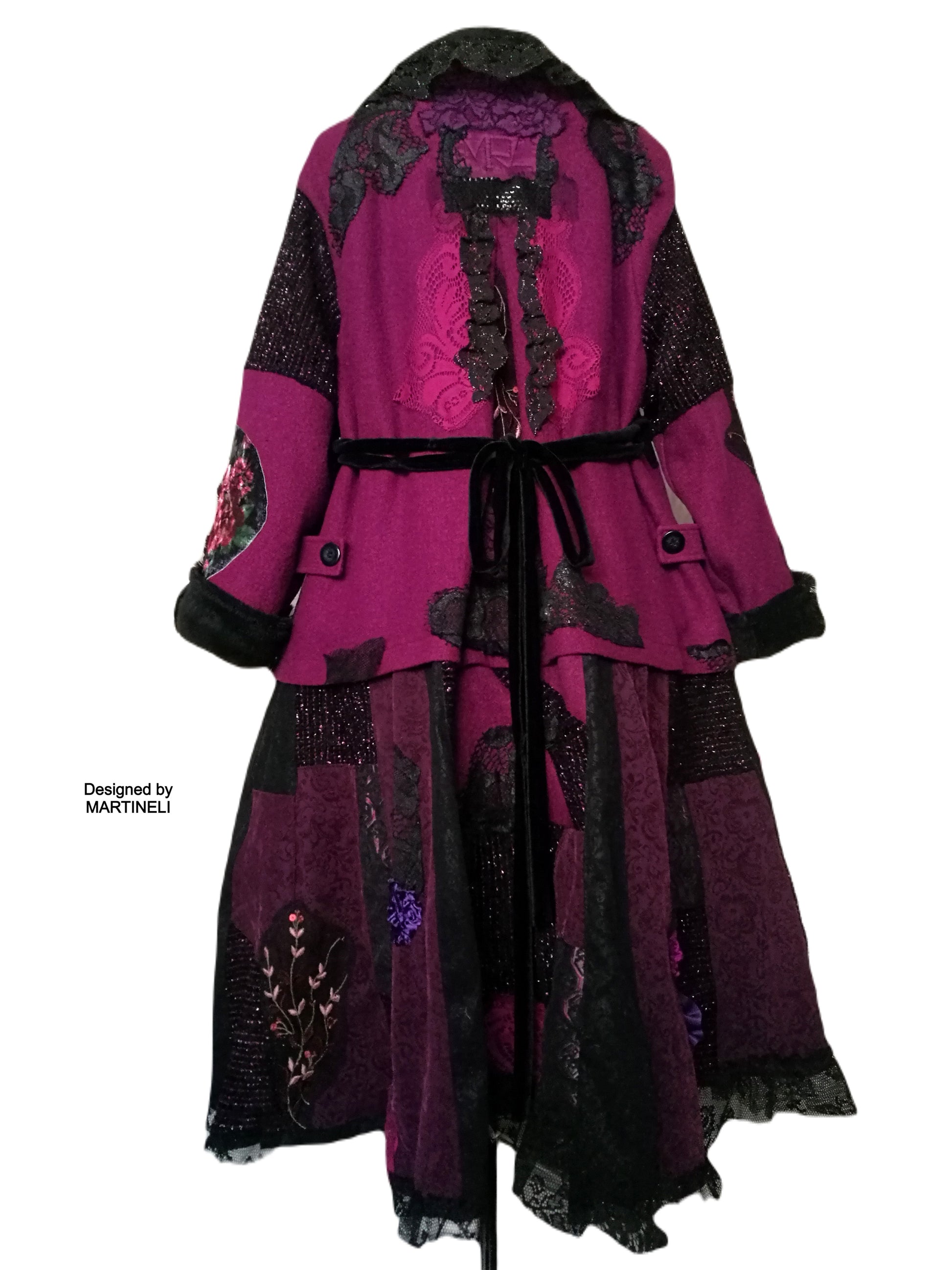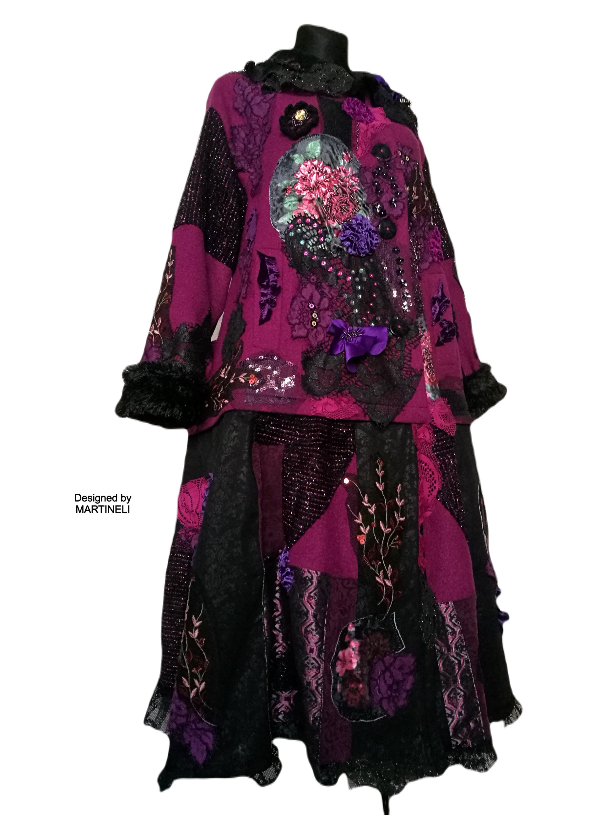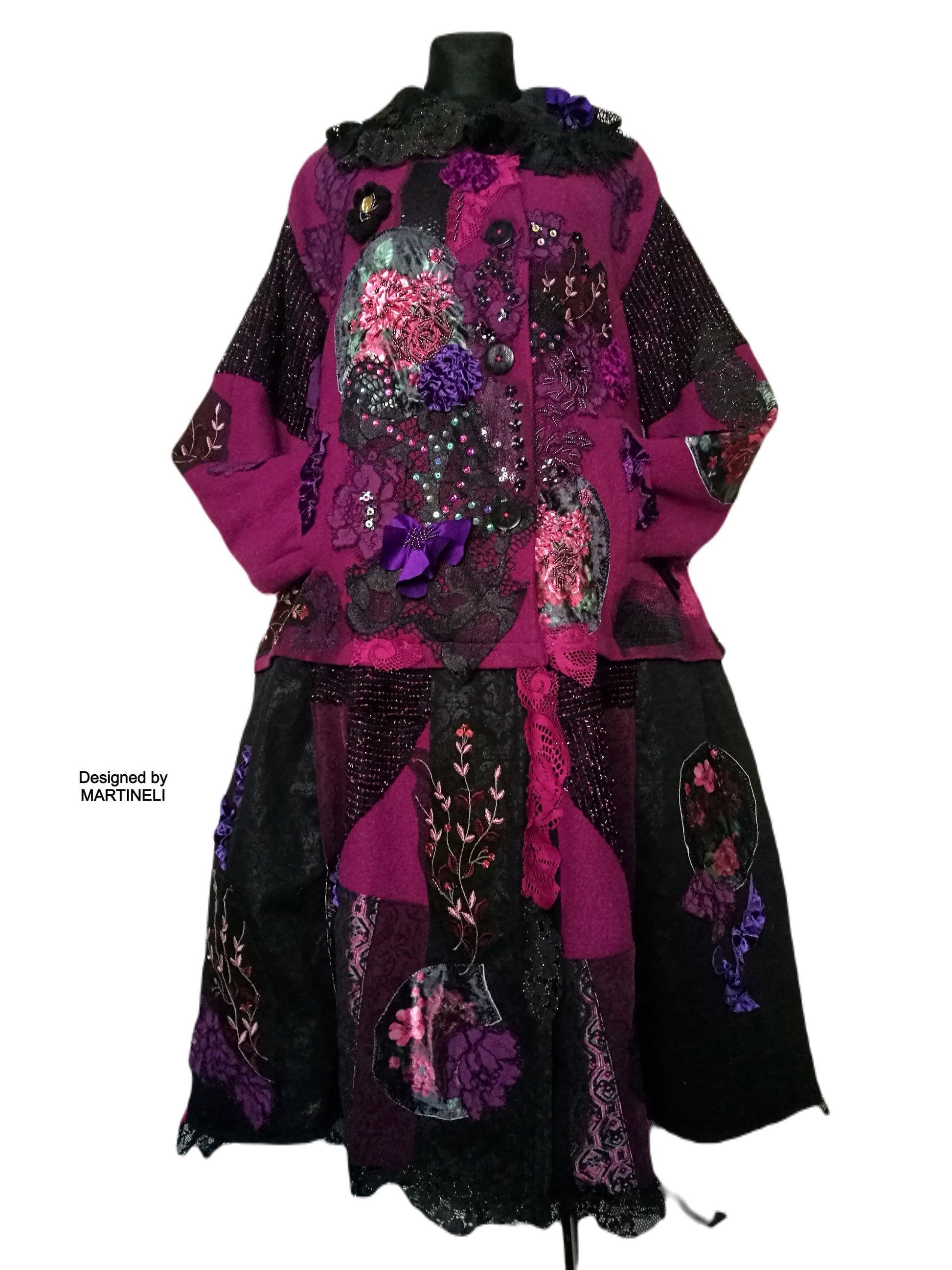 I used a strawberry pink wool blend jacket, striped wool blend fabric in black/pink, different tapestry fabrics, black faux fur fabric, velvet fabrics, laces, sequins, Preciosa glass beads.