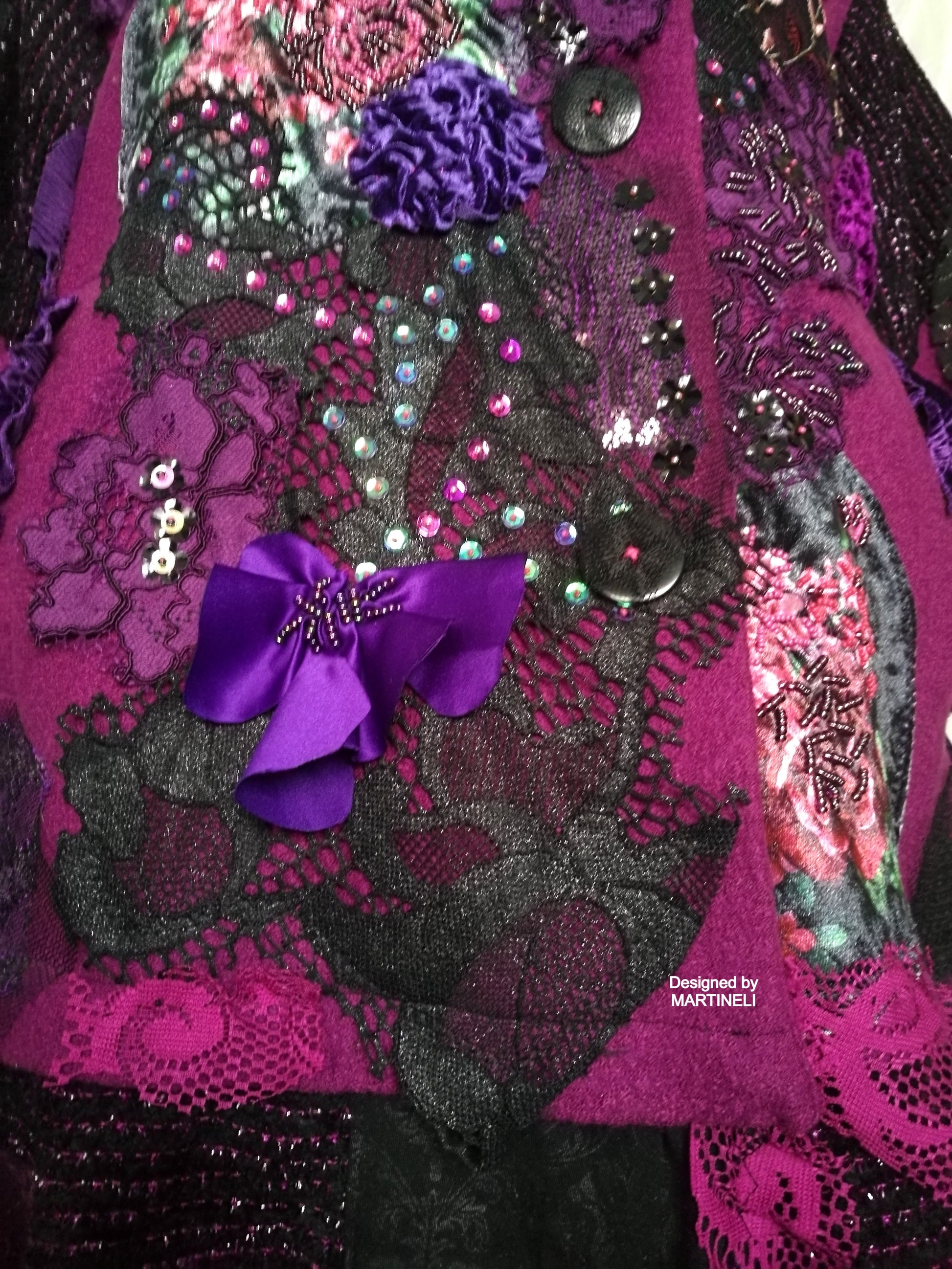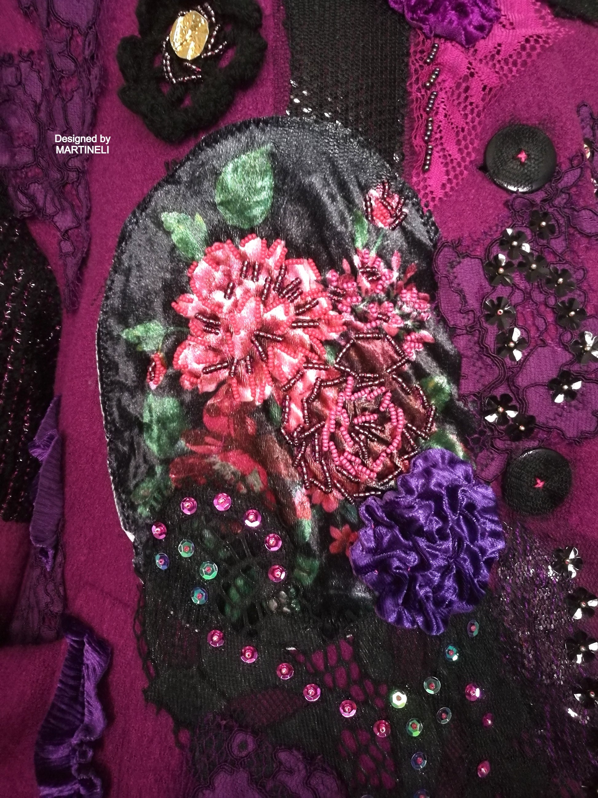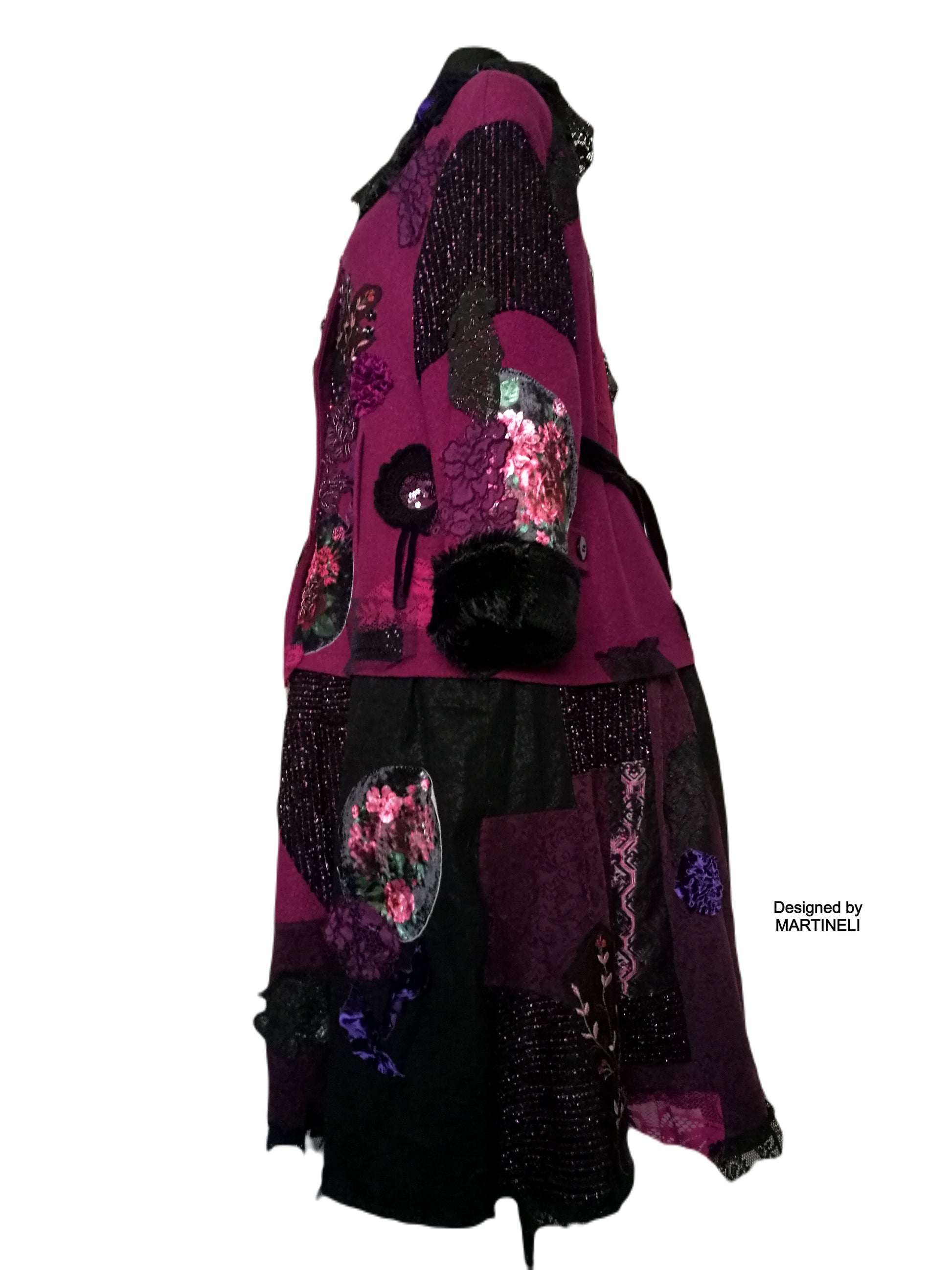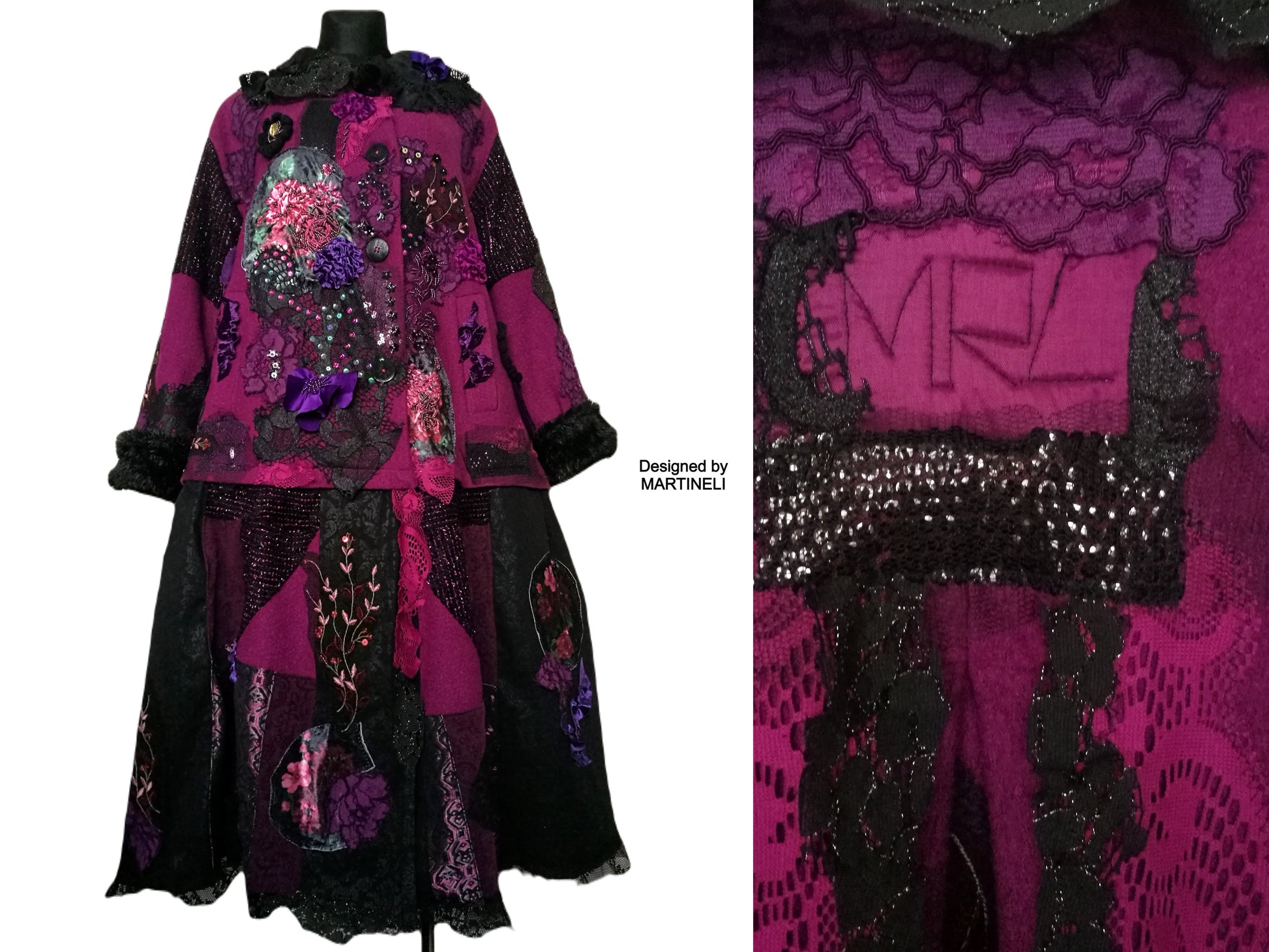 I used a strawberry pink wool blend jacket, striped wool blend fabric in black/pink, different tapestry fabrics, black faux fur fabric, velvet fabrics, laces, sequins, Preciosa glass beads.
