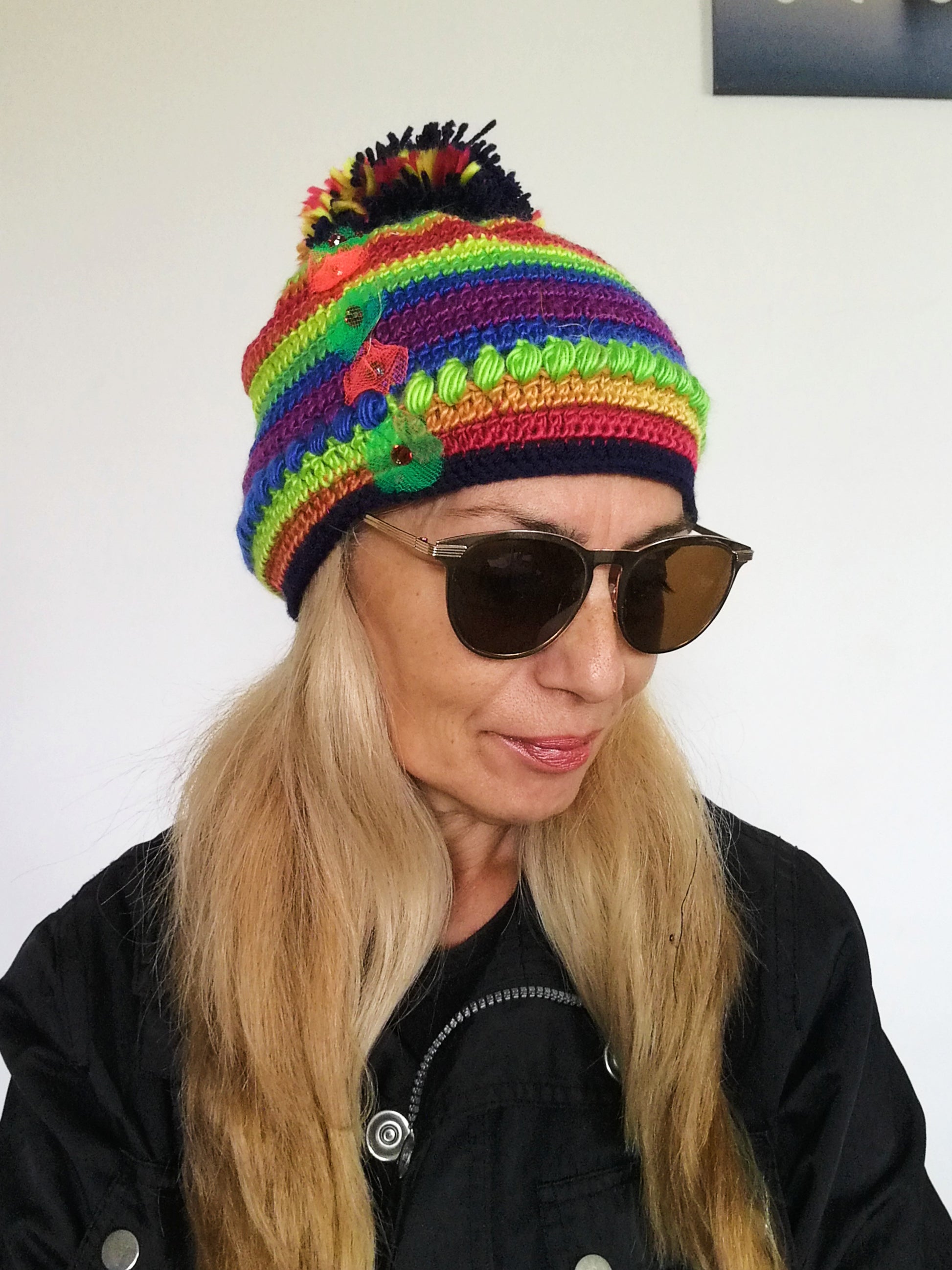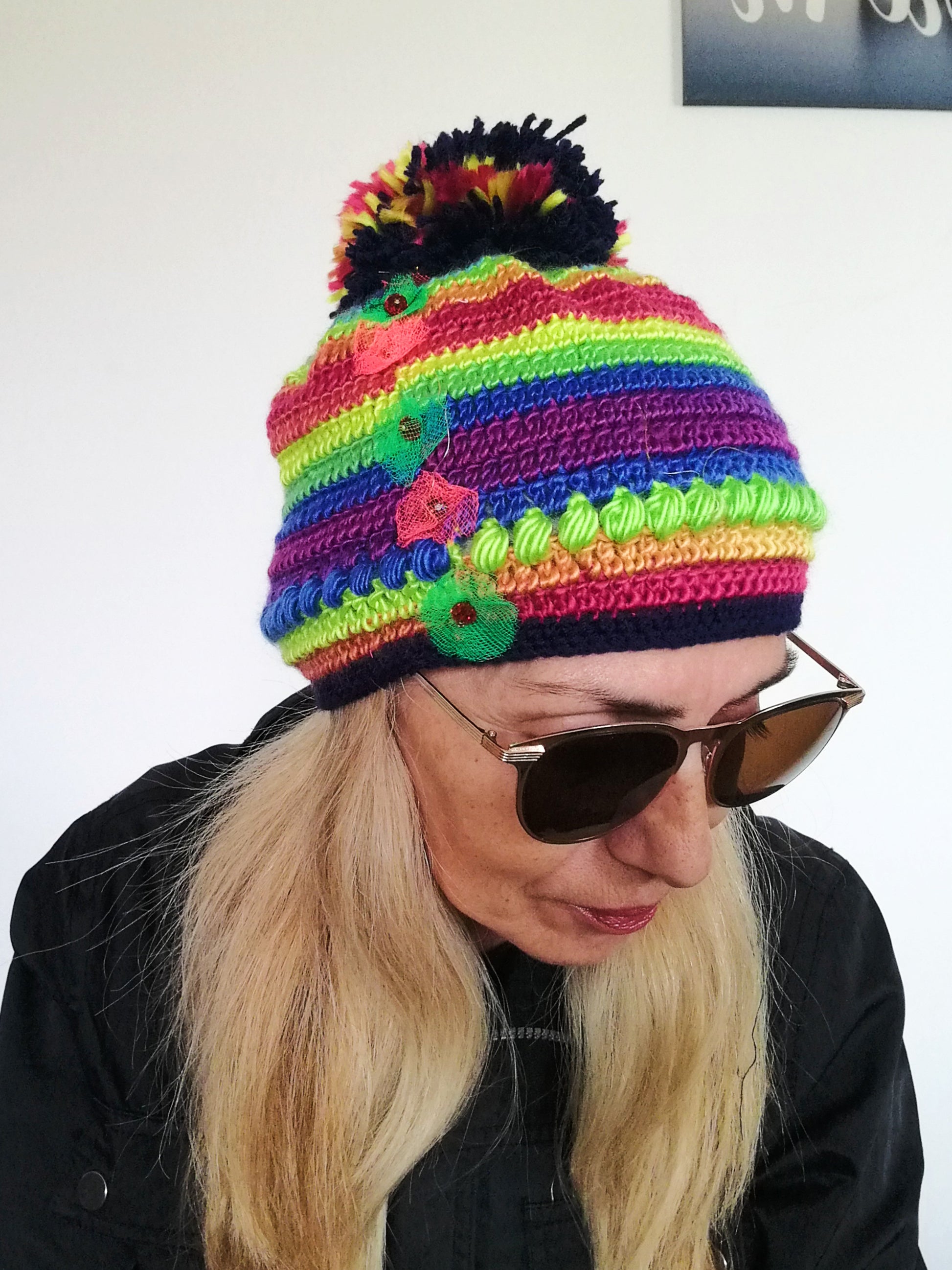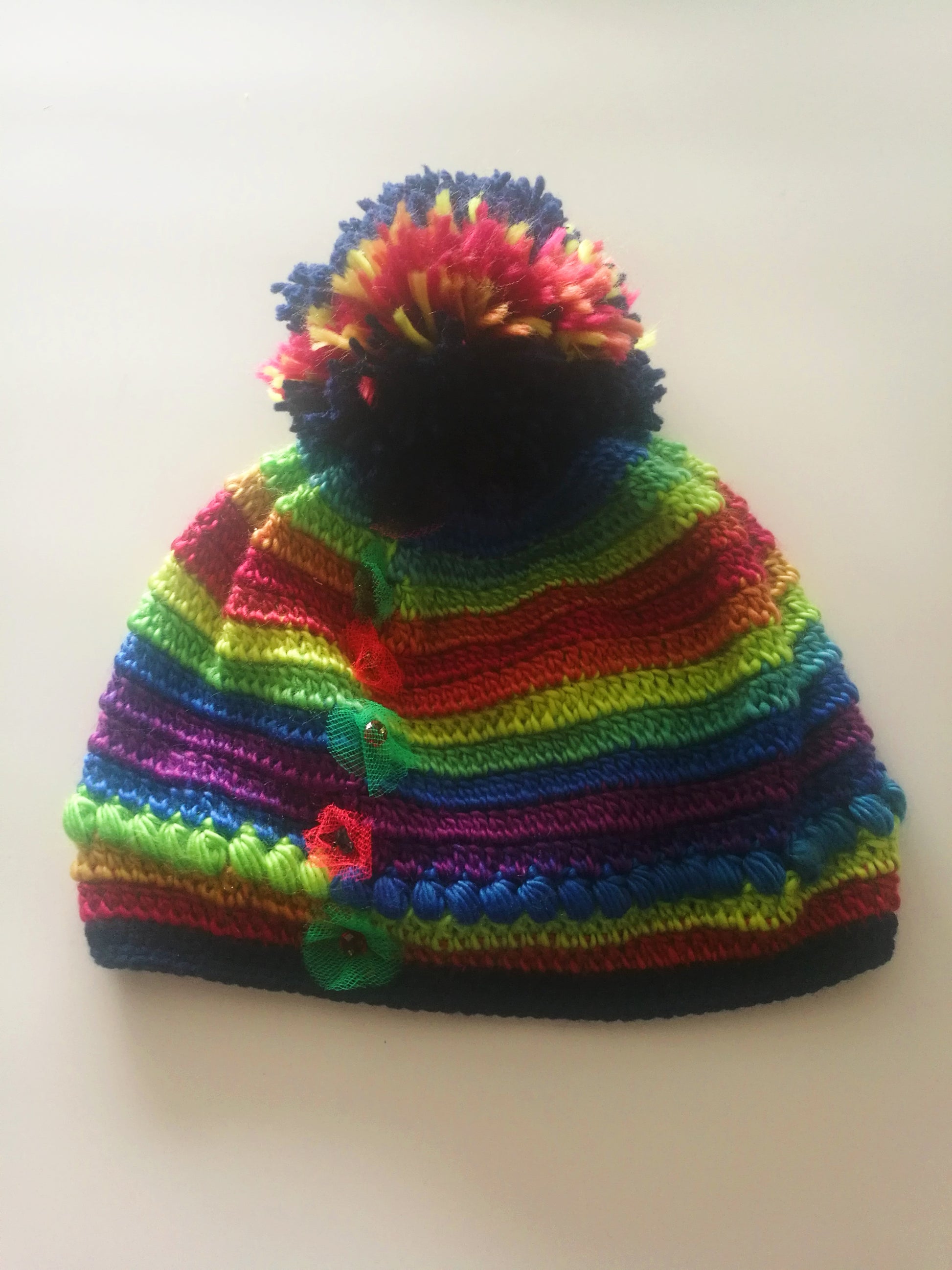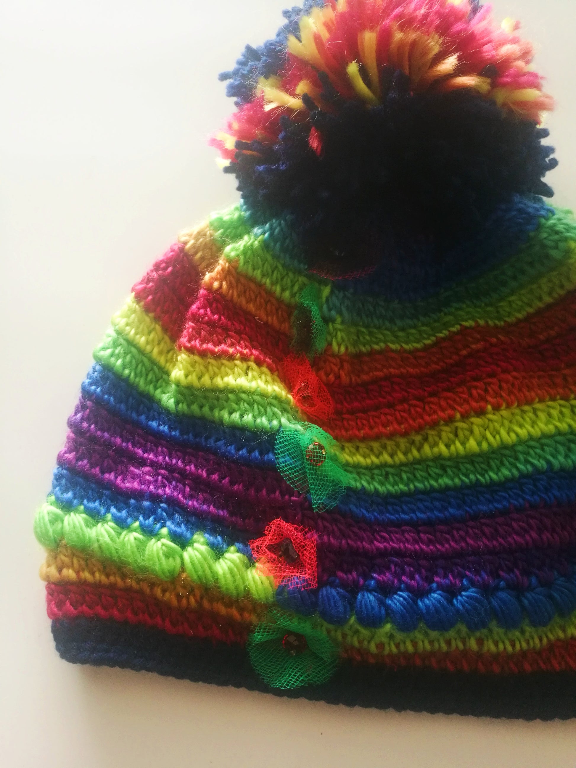 This rainbow colourful hand knit beanie hat is designed and handmade by me.