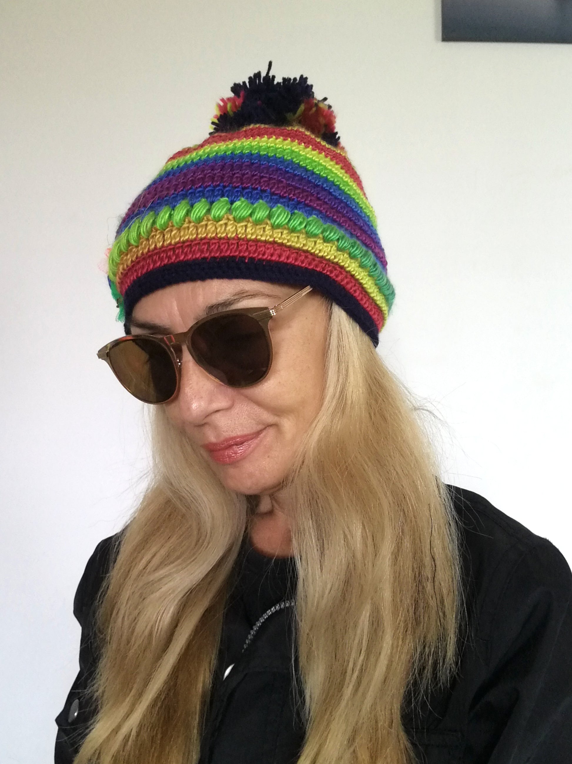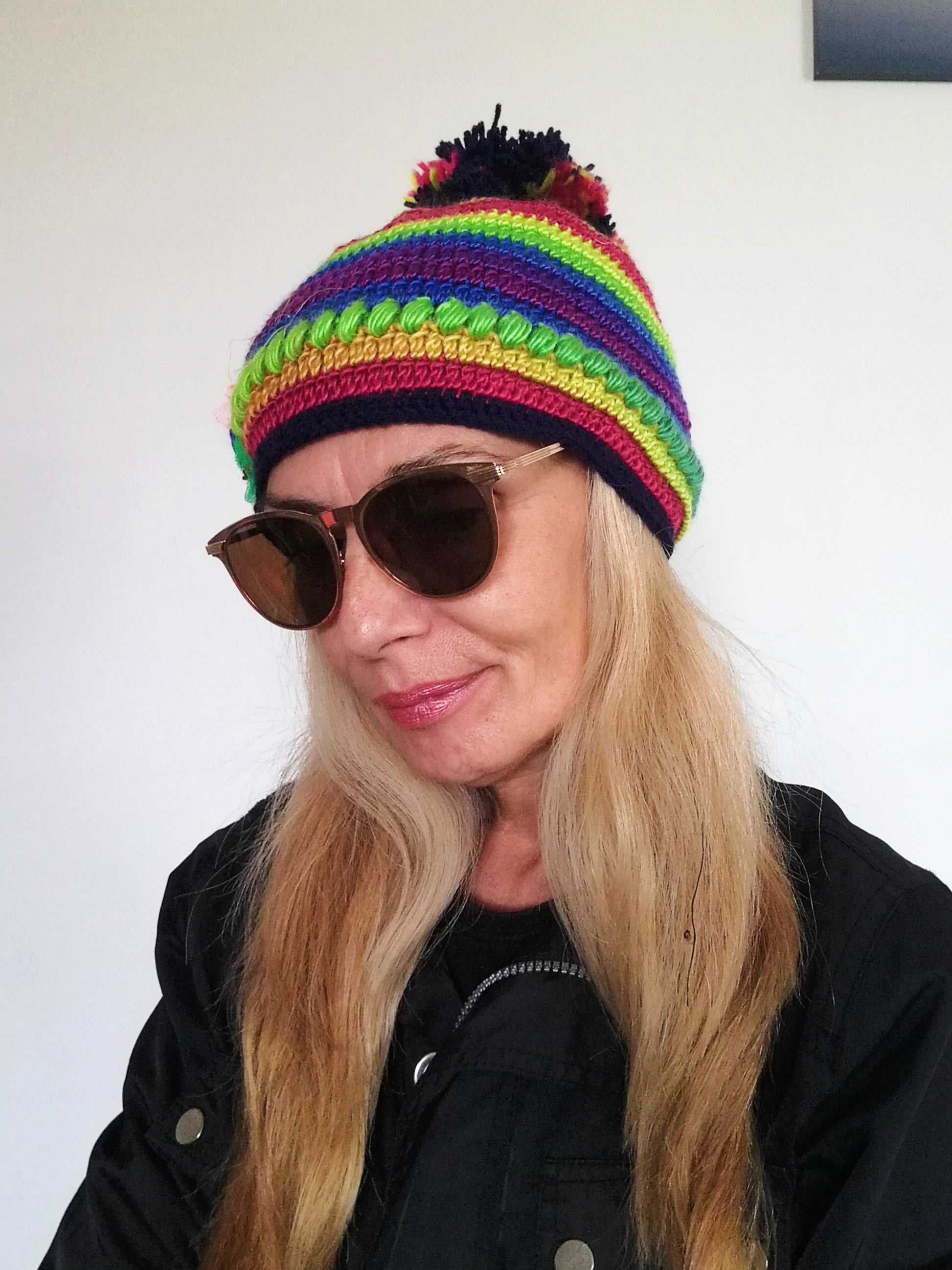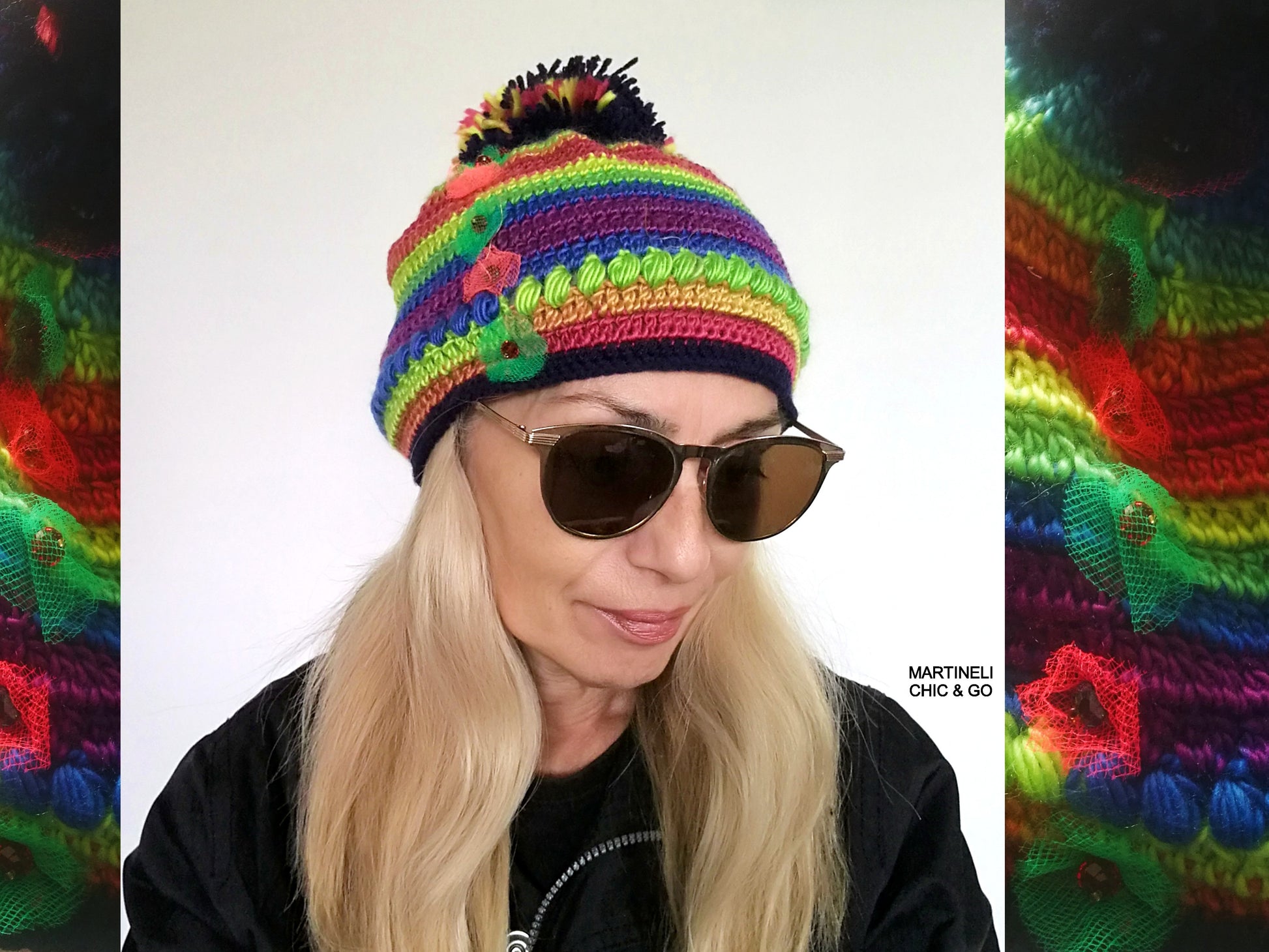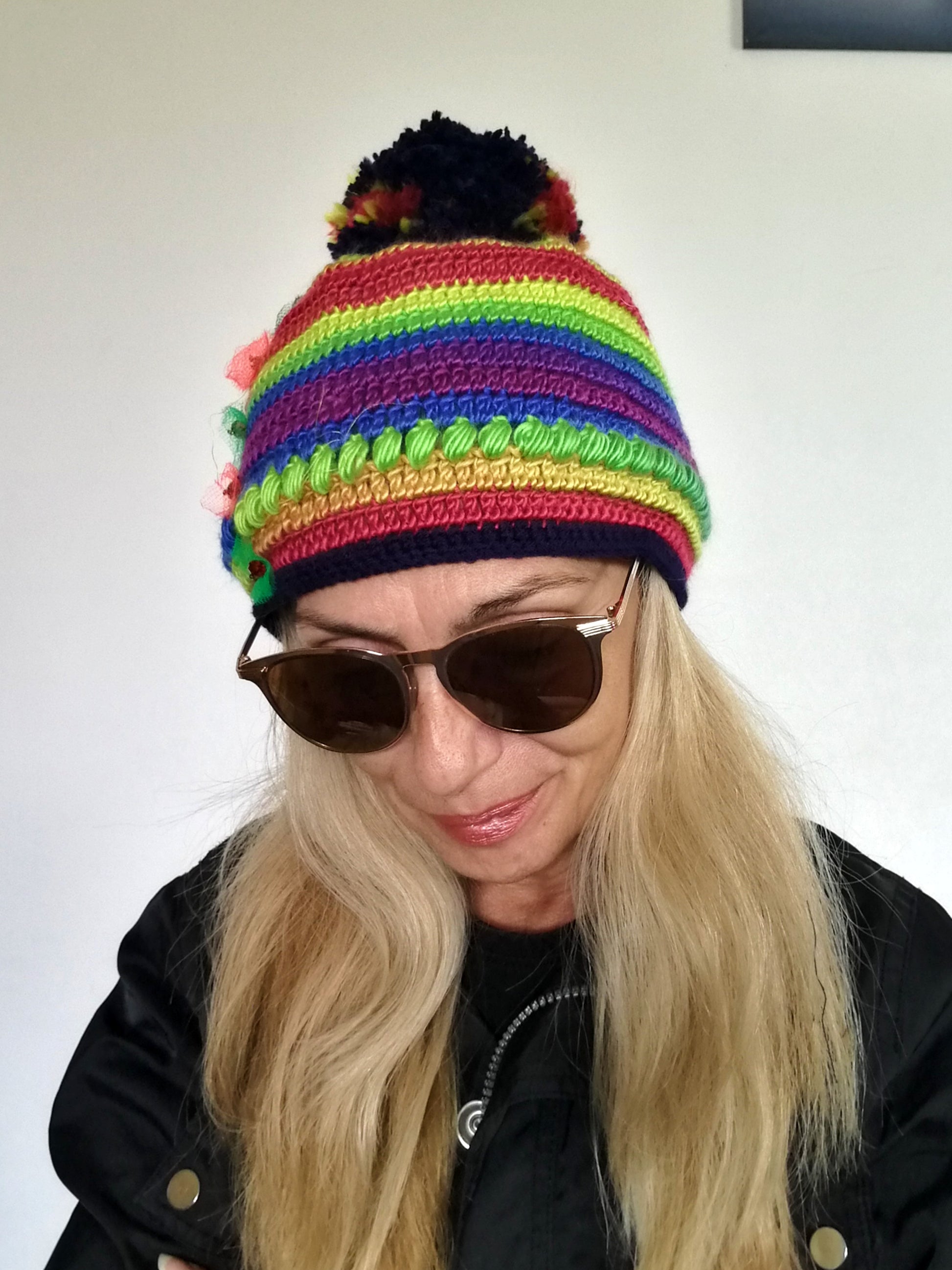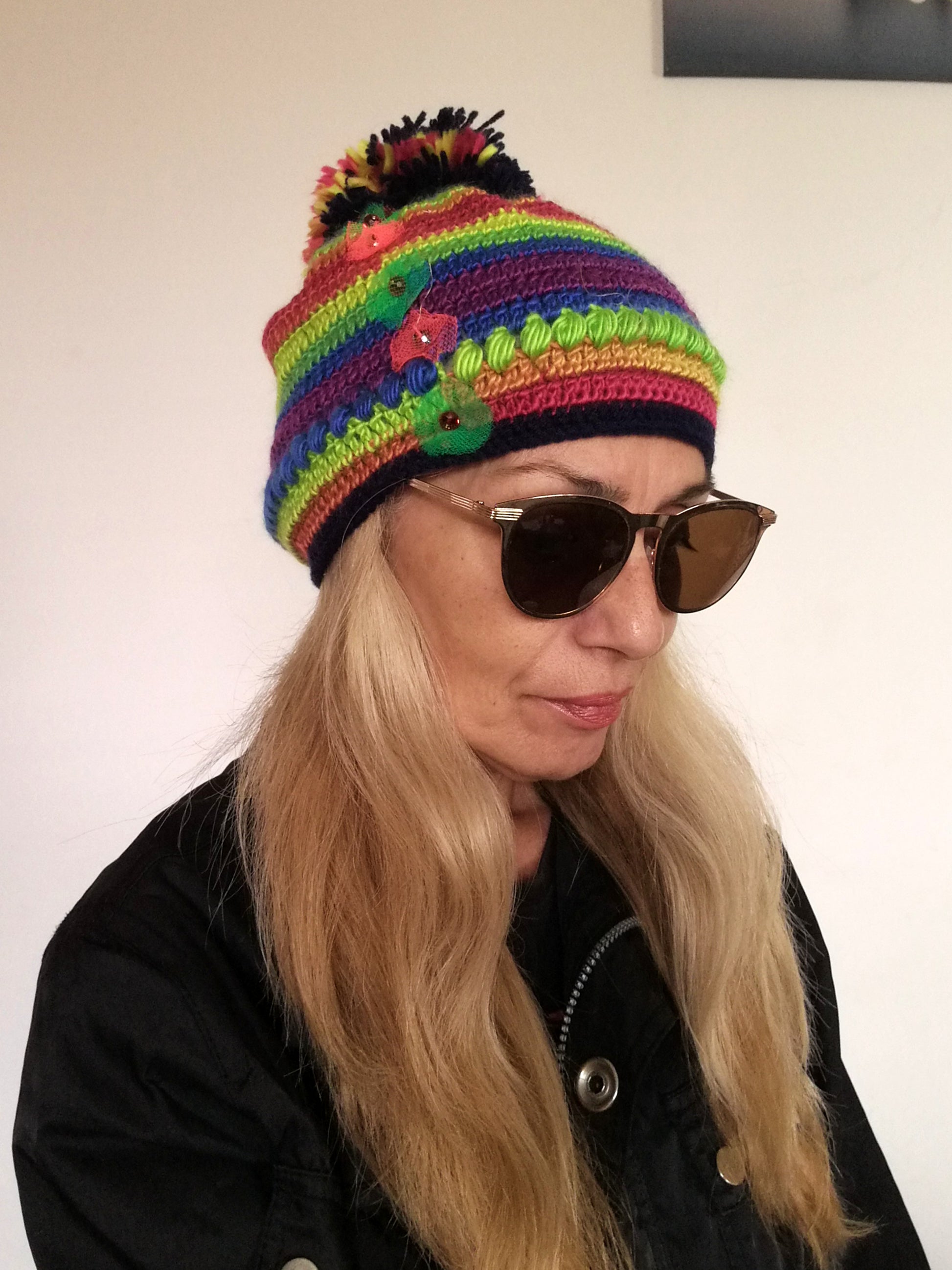This rainbow colourful hand knit beanie hat is designed and handmade by me.