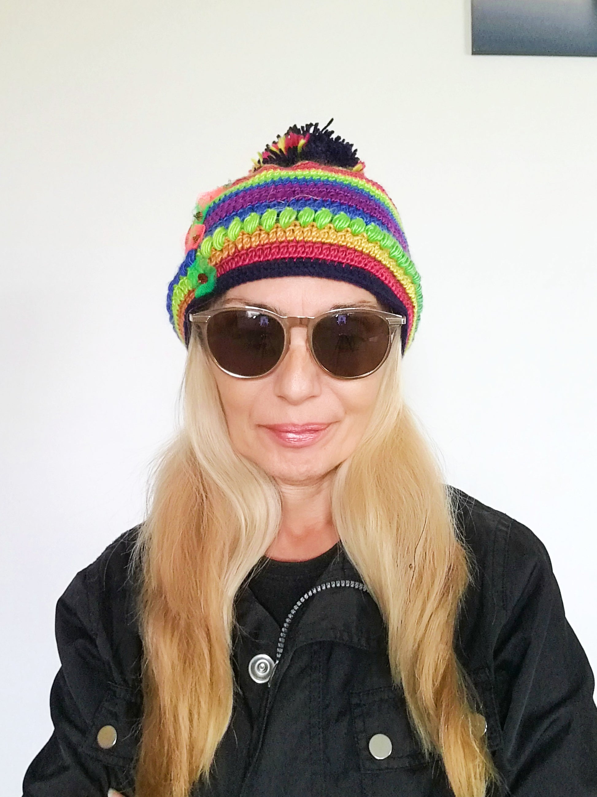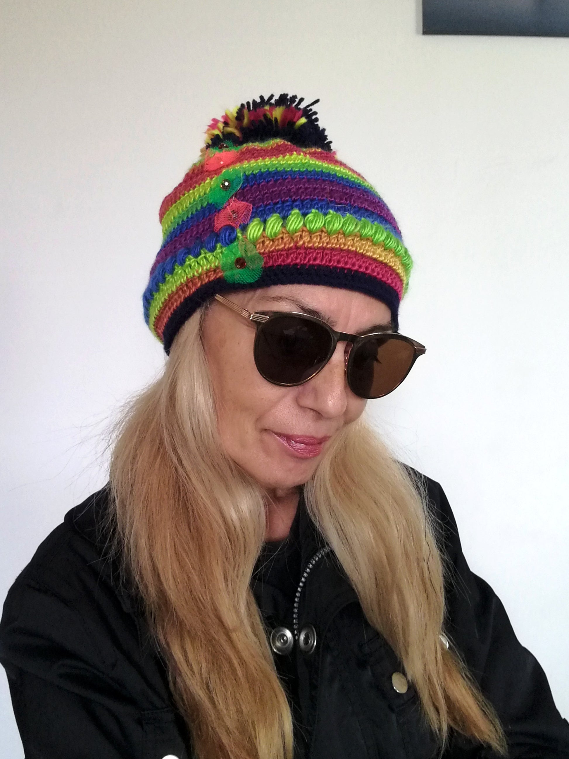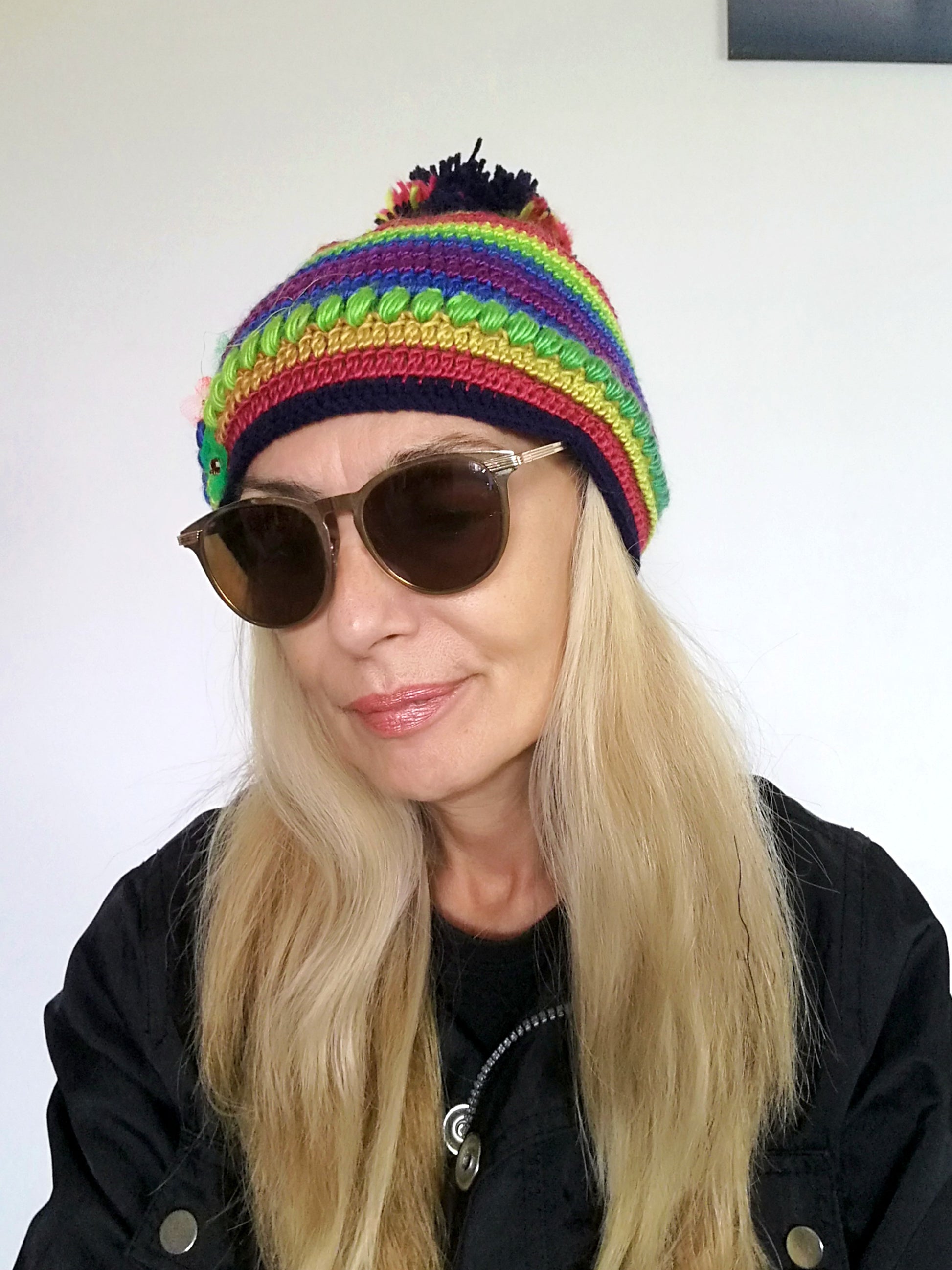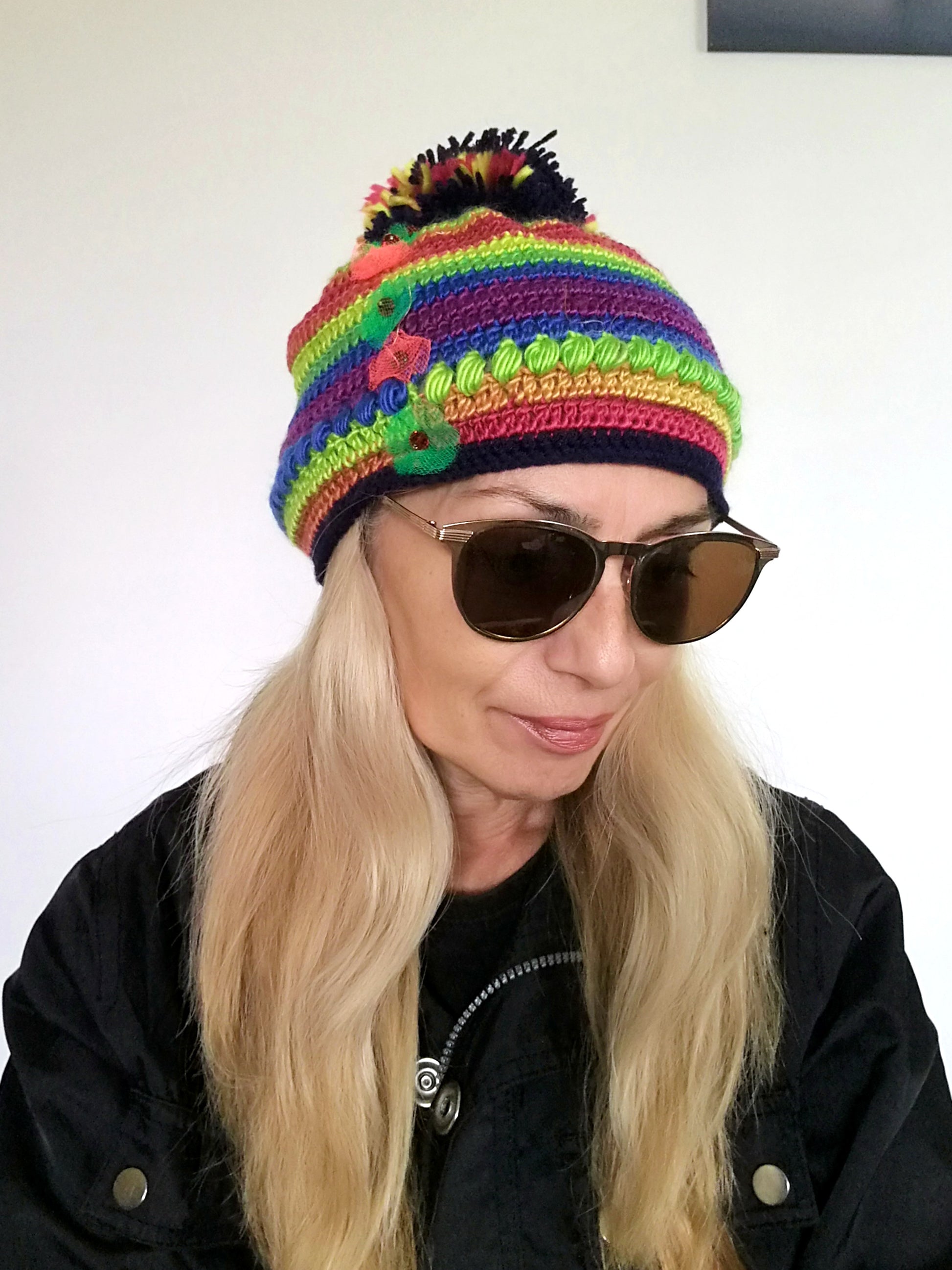 This rainbow colourful hand knit beanie hat is designed and handmade by me.