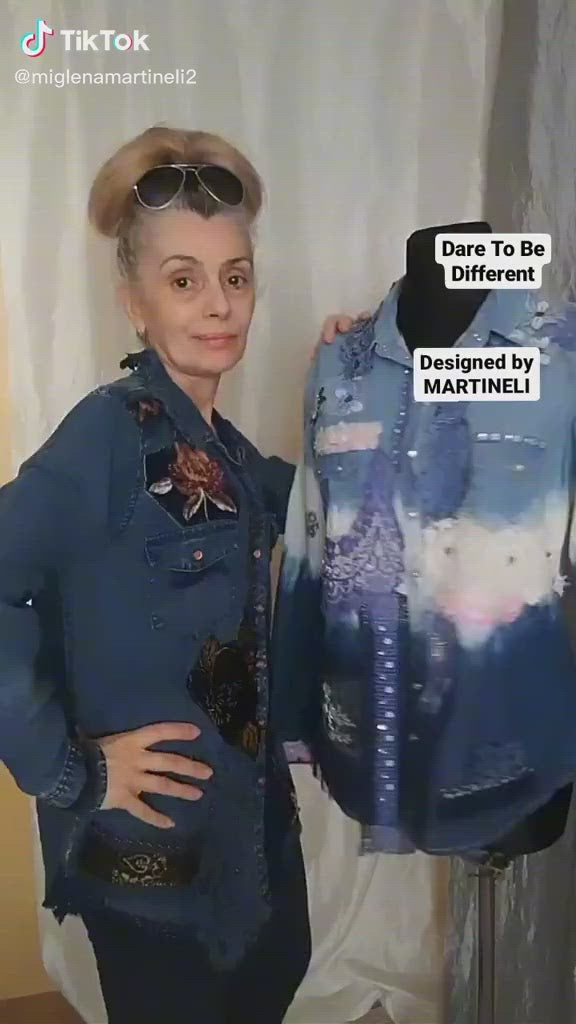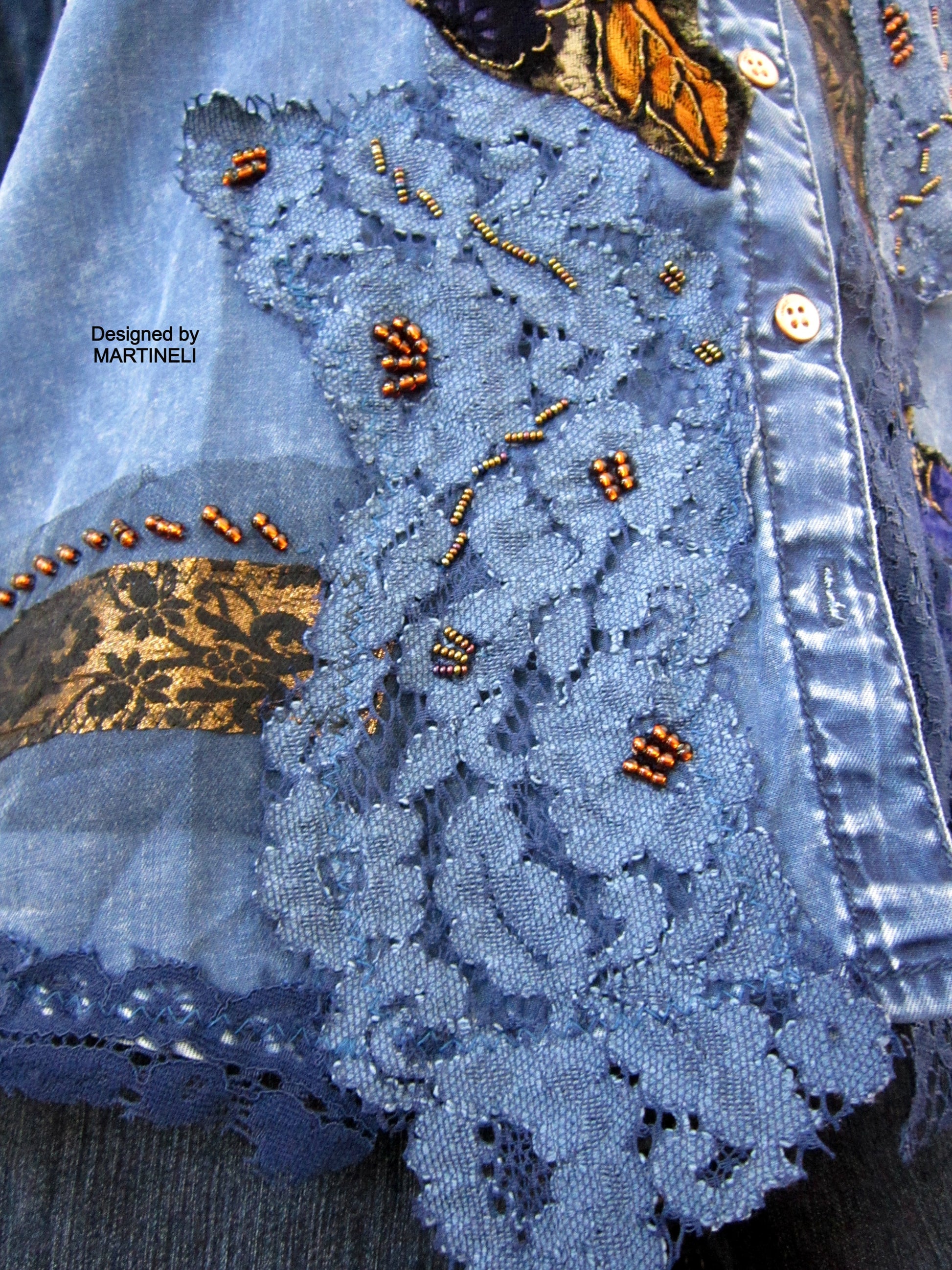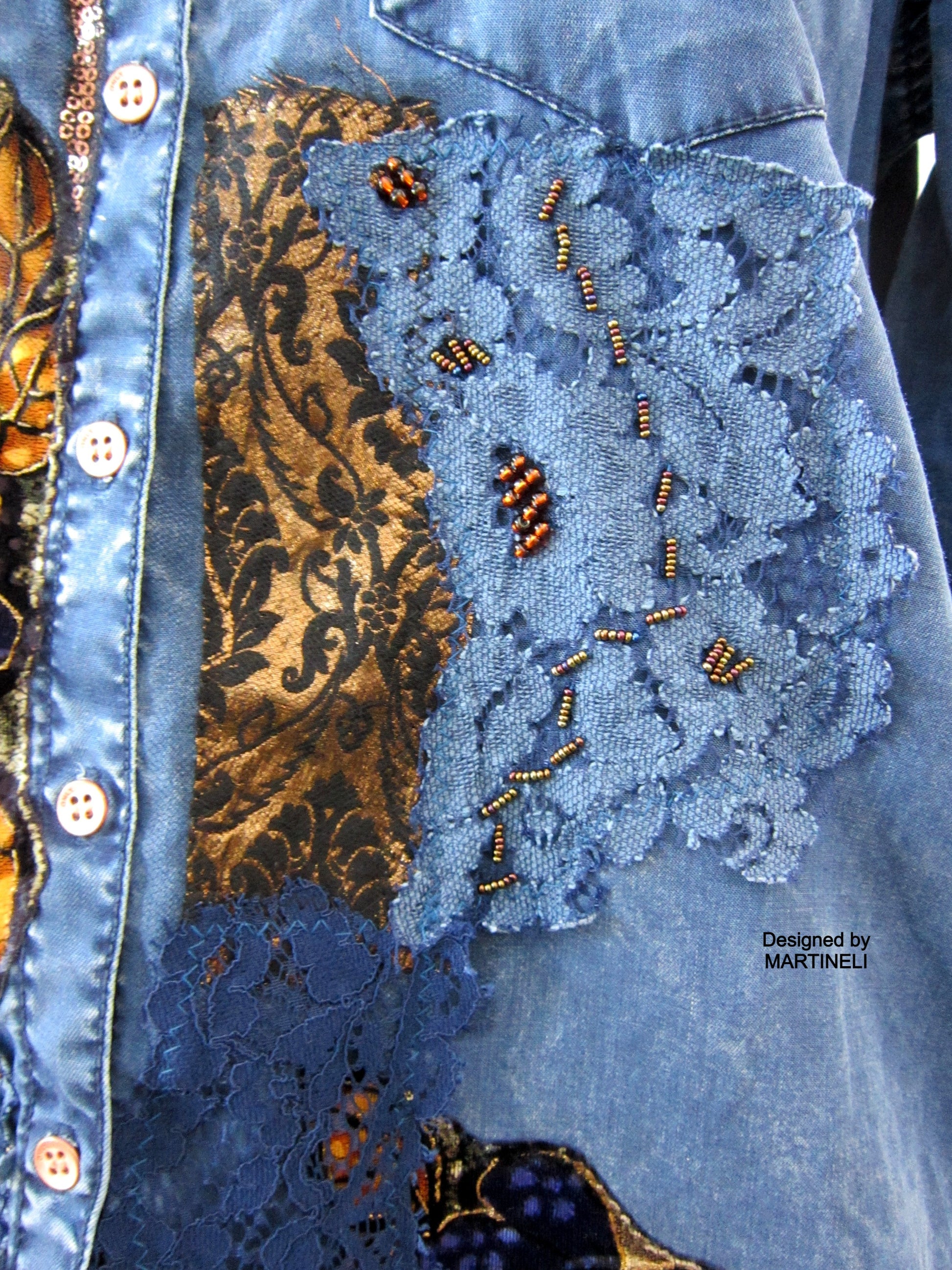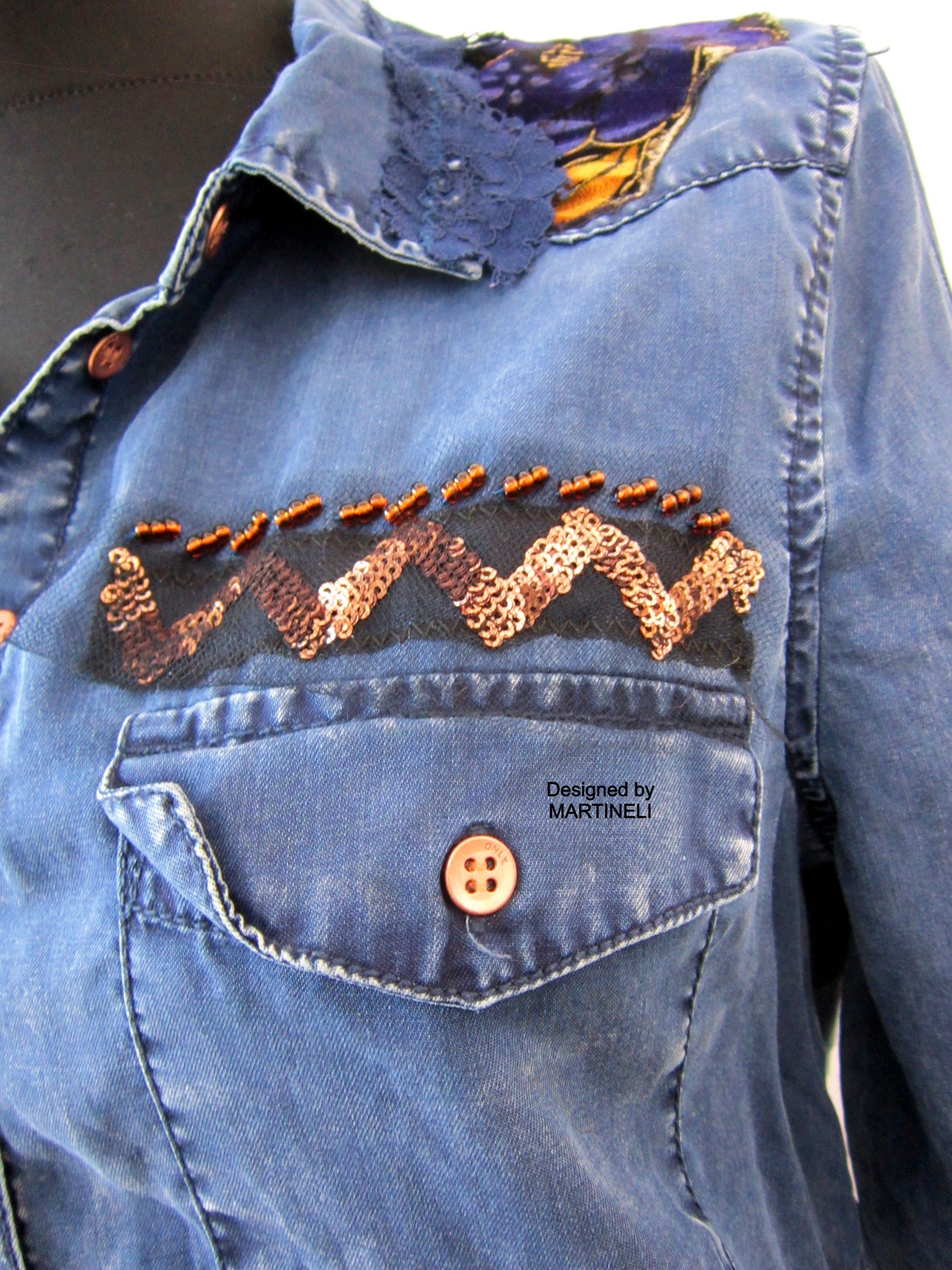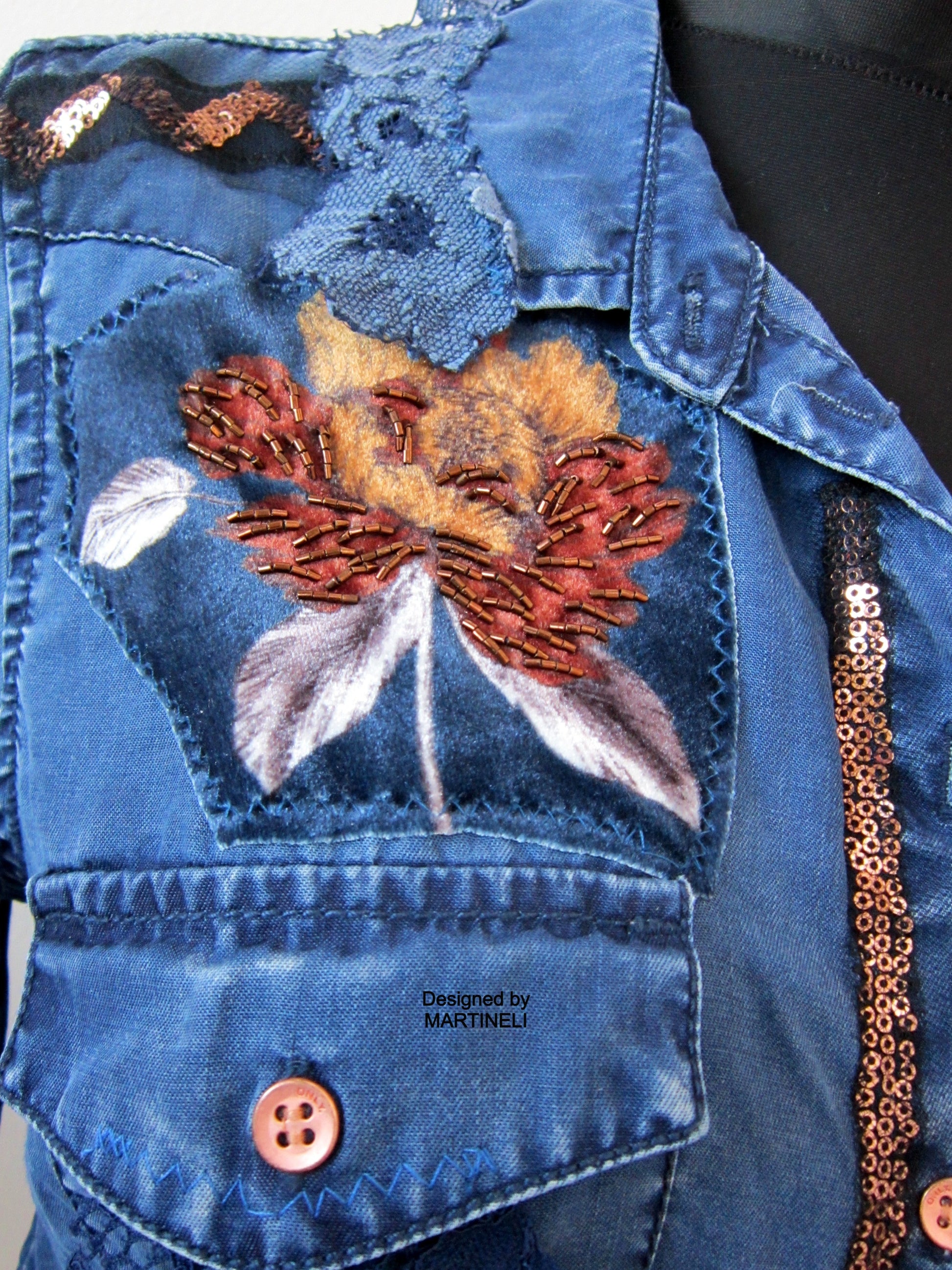 I used very soft dark blue denim shirt / ONLY brand name/, floral velvet patches,tapestry,laces,sequins fabric,Preciosa glass beads.