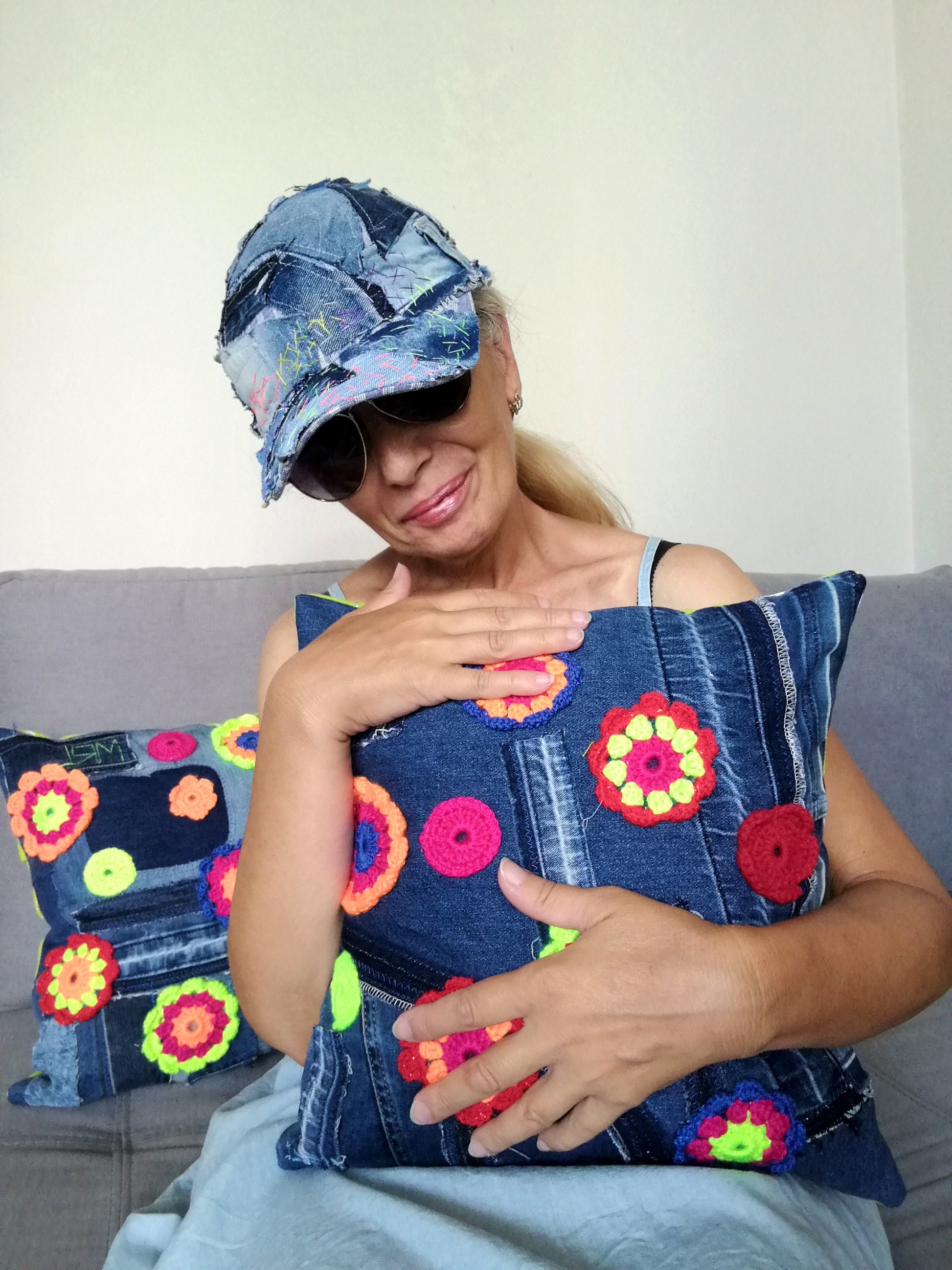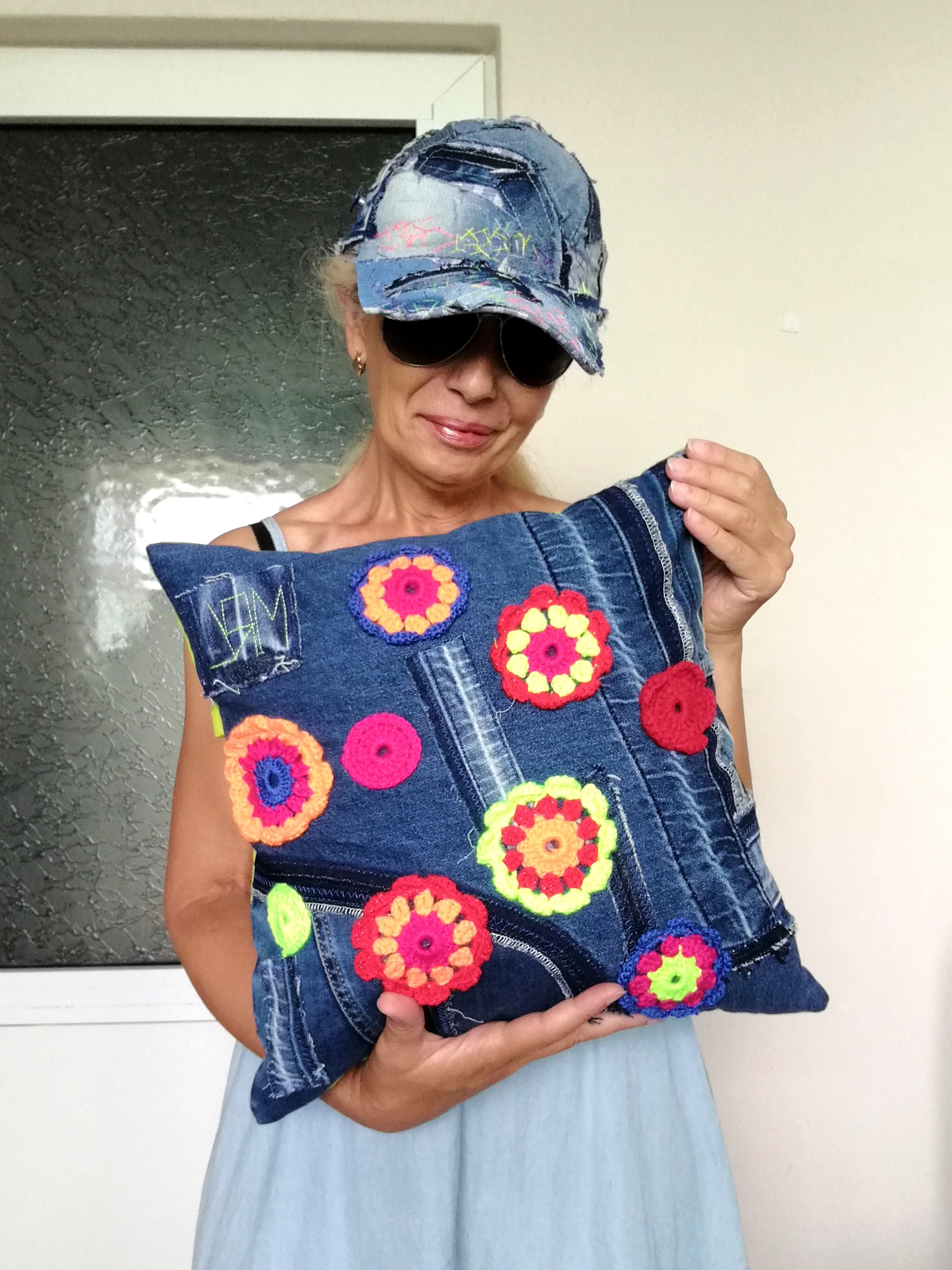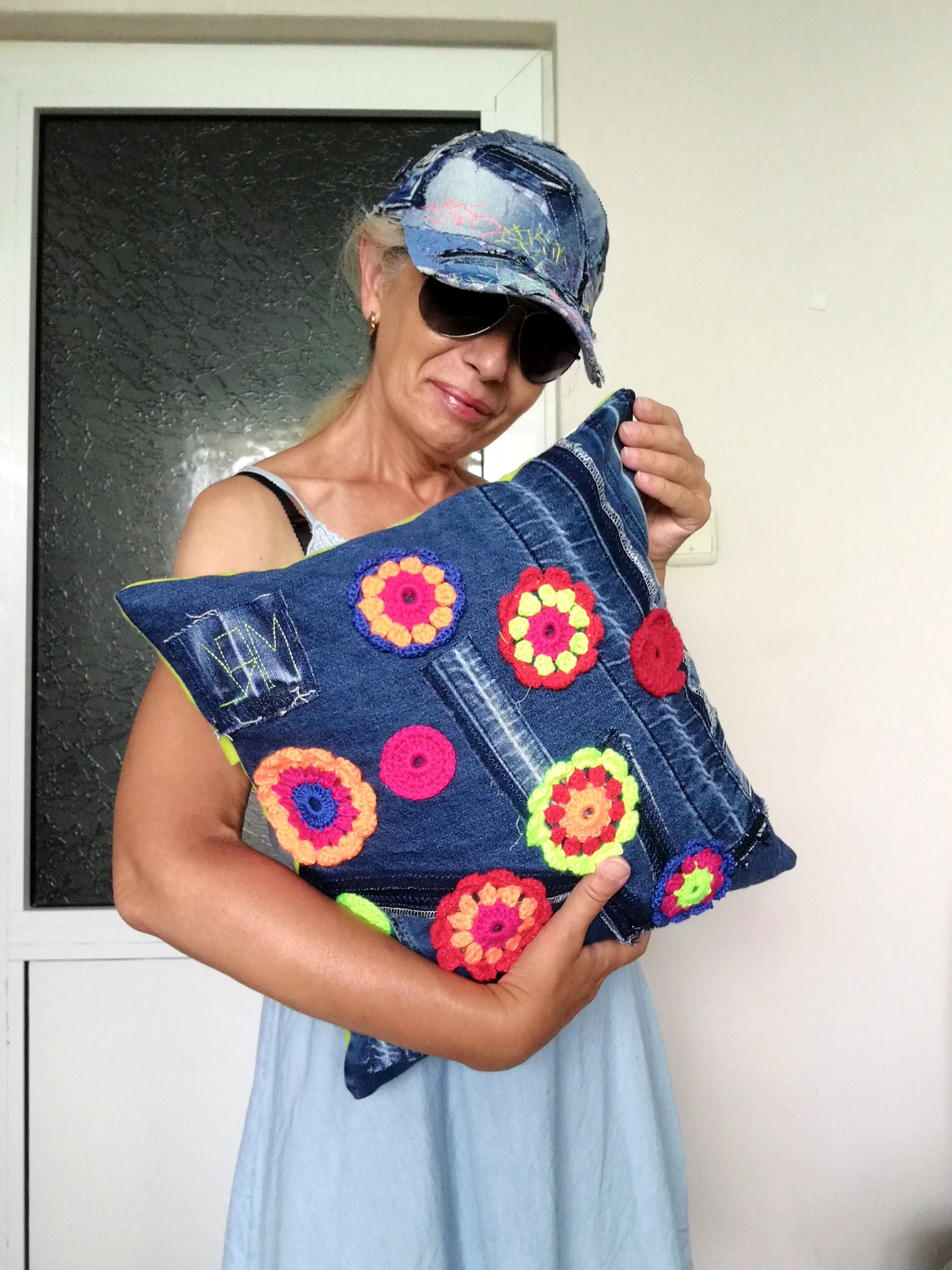 I used soft plaid cotton fabrics for the pillow, artificial cotton wool/non-allergenic polyester/, different nuances of blue denim and lime green embroidered linen for the pillow case, hand crochet colorful flowers for decoration.