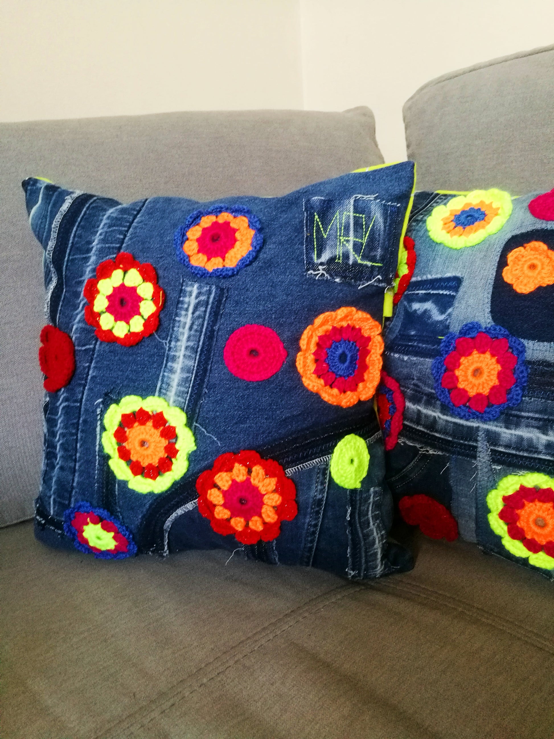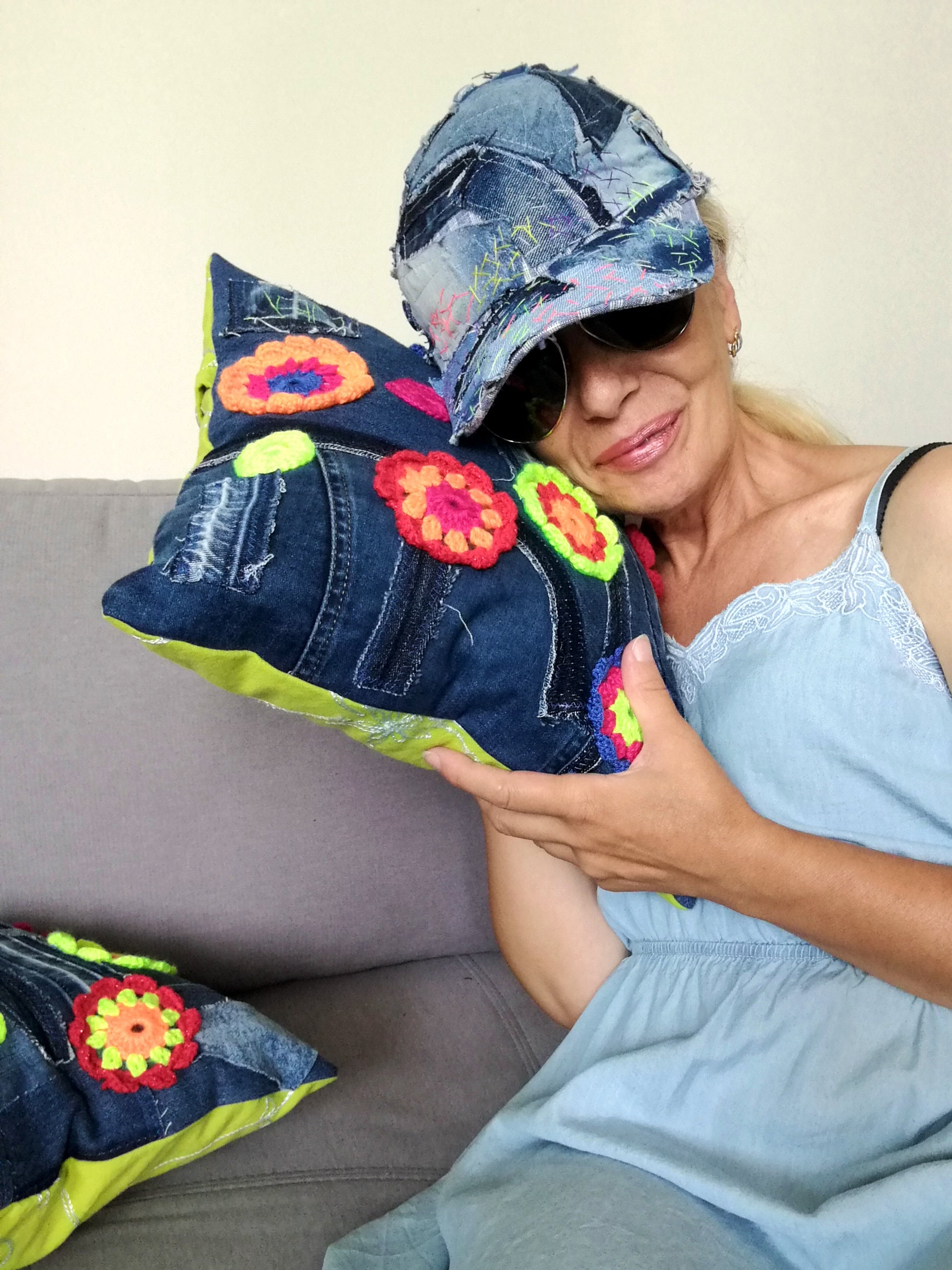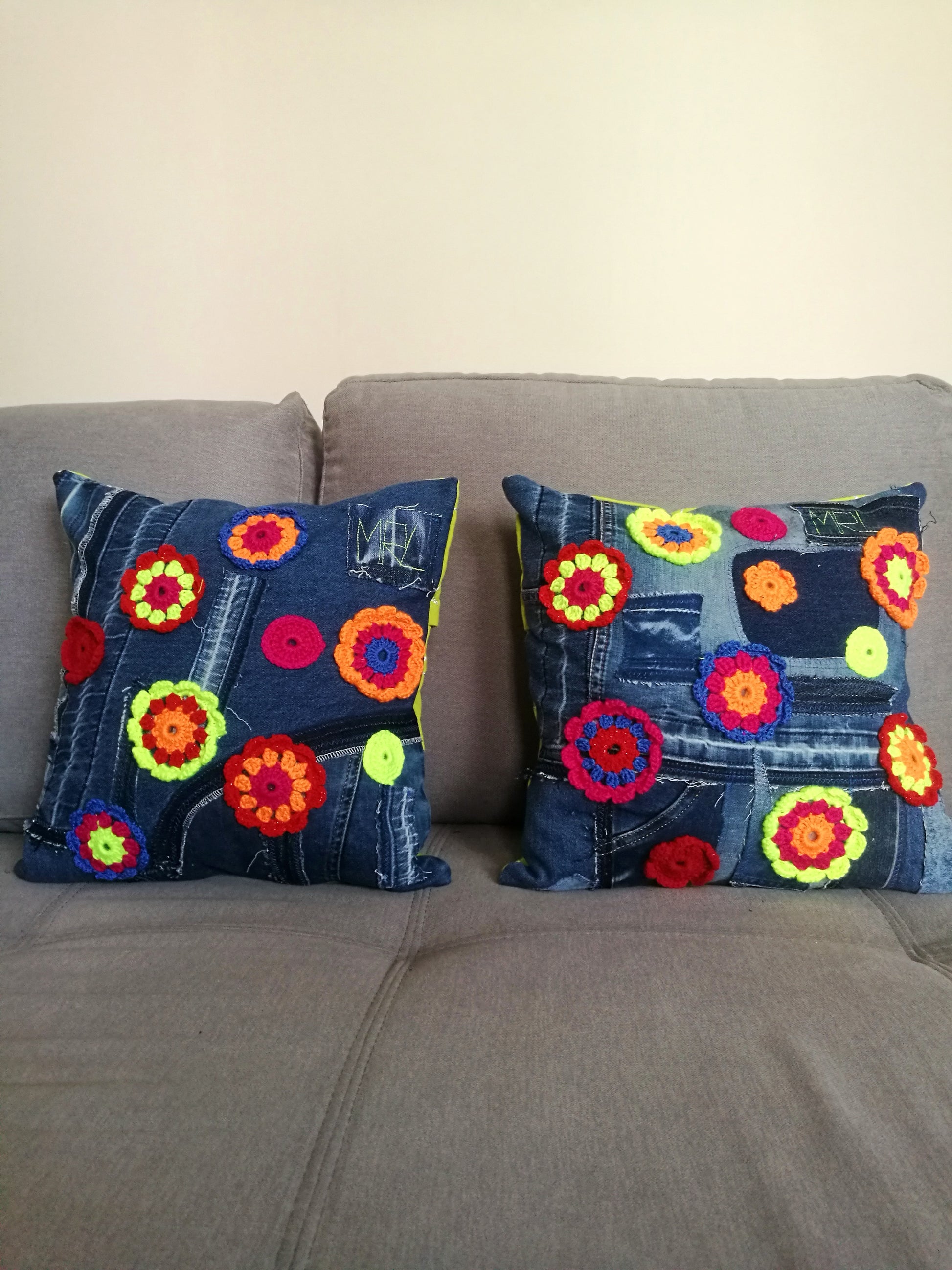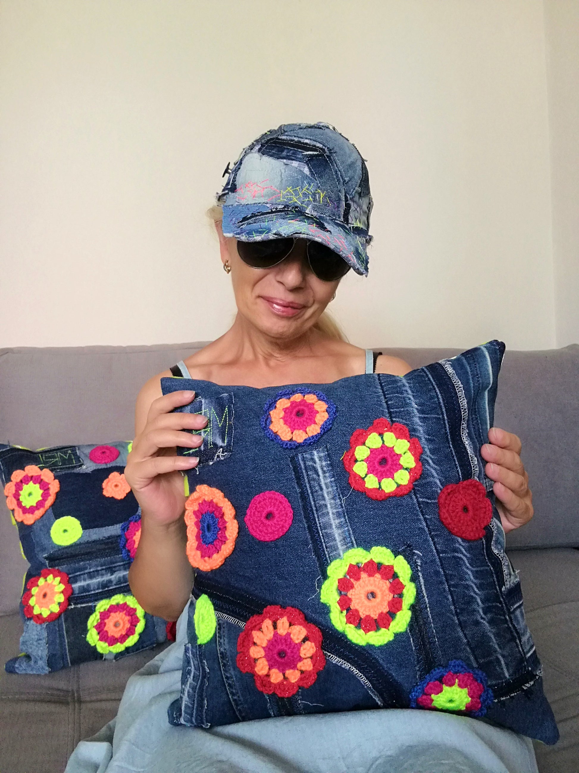 I used soft plaid cotton fabrics for the pillow, artificial cotton wool/non-allergenic polyester/, different nuances of blue denim and lime green embroidered linen for the pillow case, hand crochet colorful flowers for decoration.