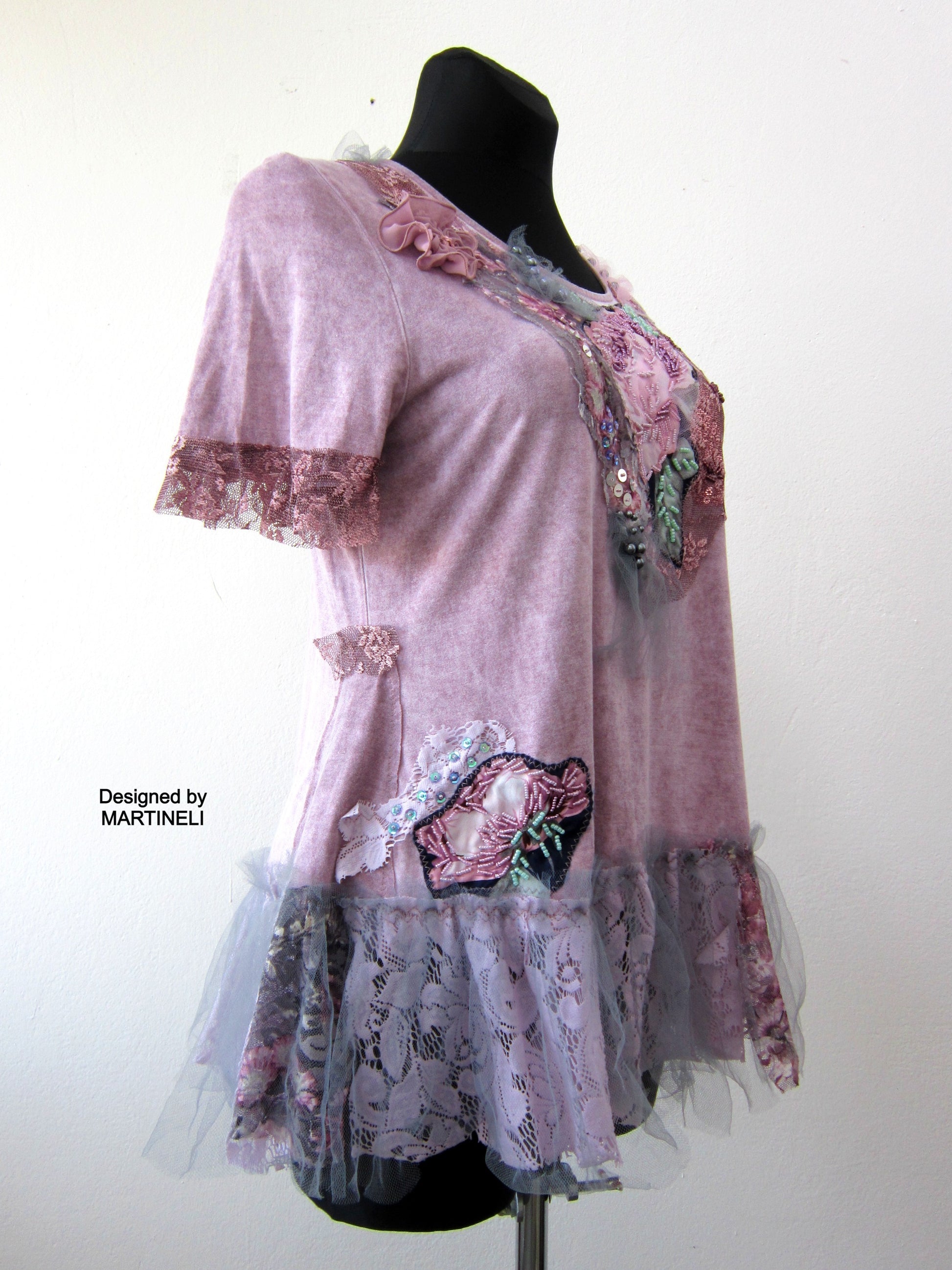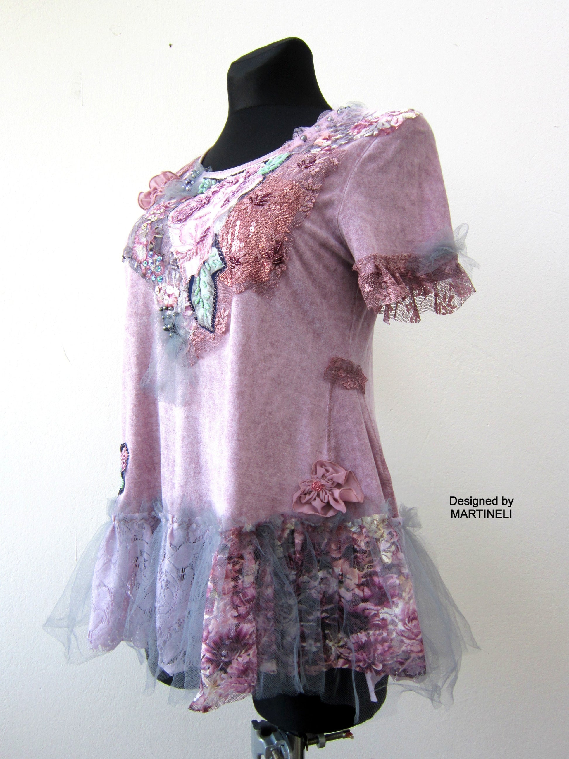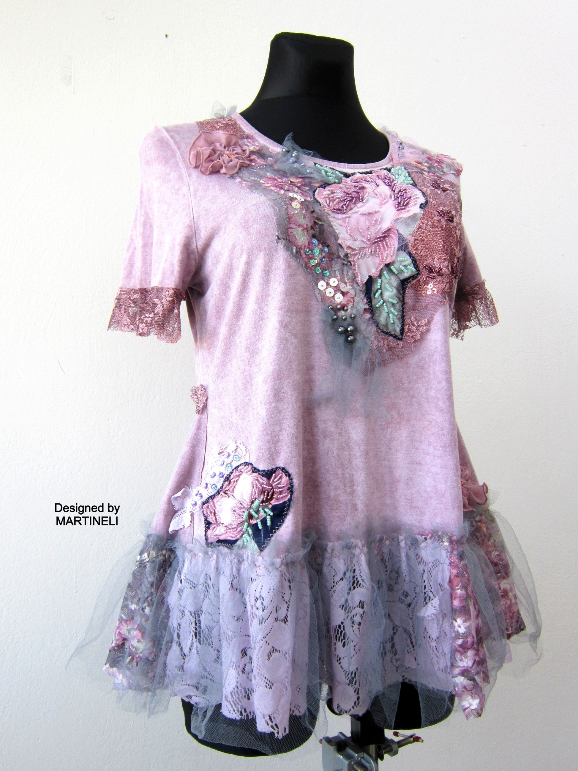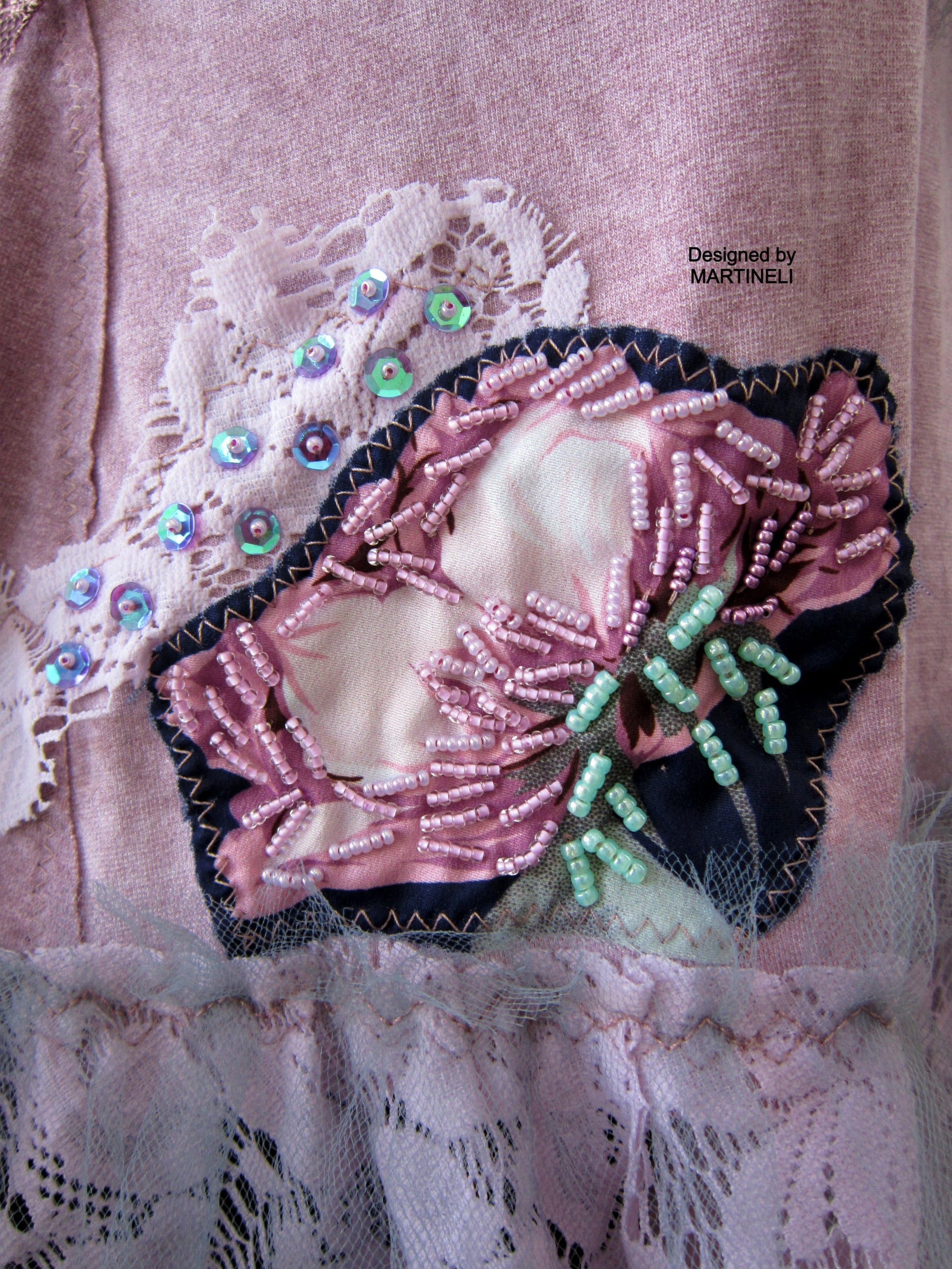 I used very soft and stretchy dusty pink t shirt , different laces, tulle, sequins pieces,chiffon handmade flowers, roses patches, Preciosa glass beads ,pearls and sequins.