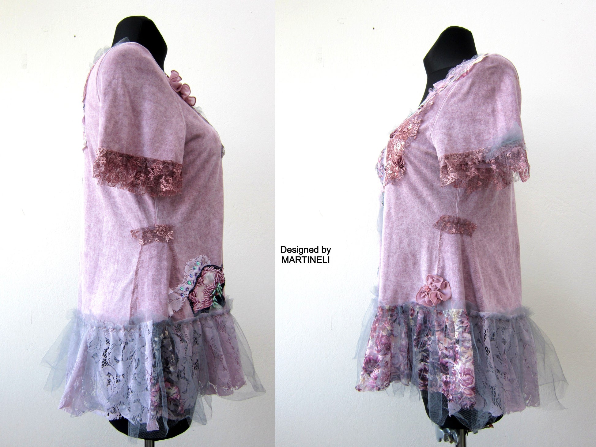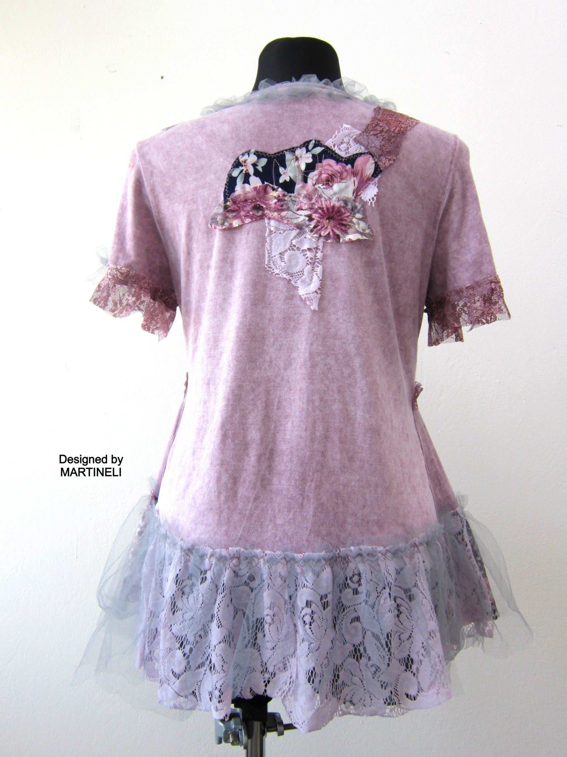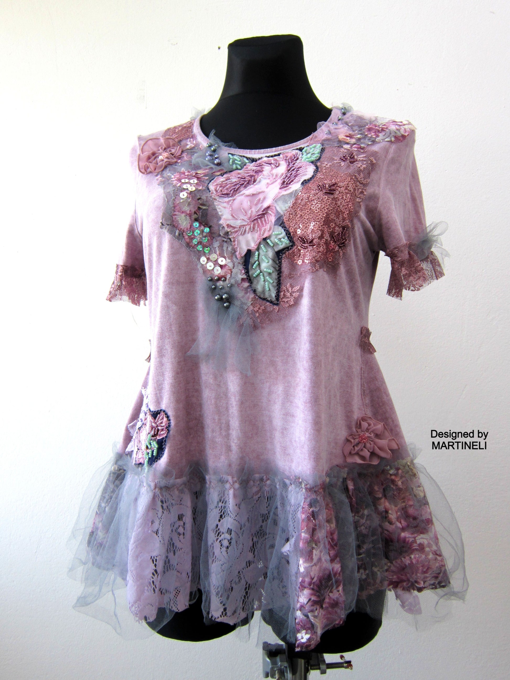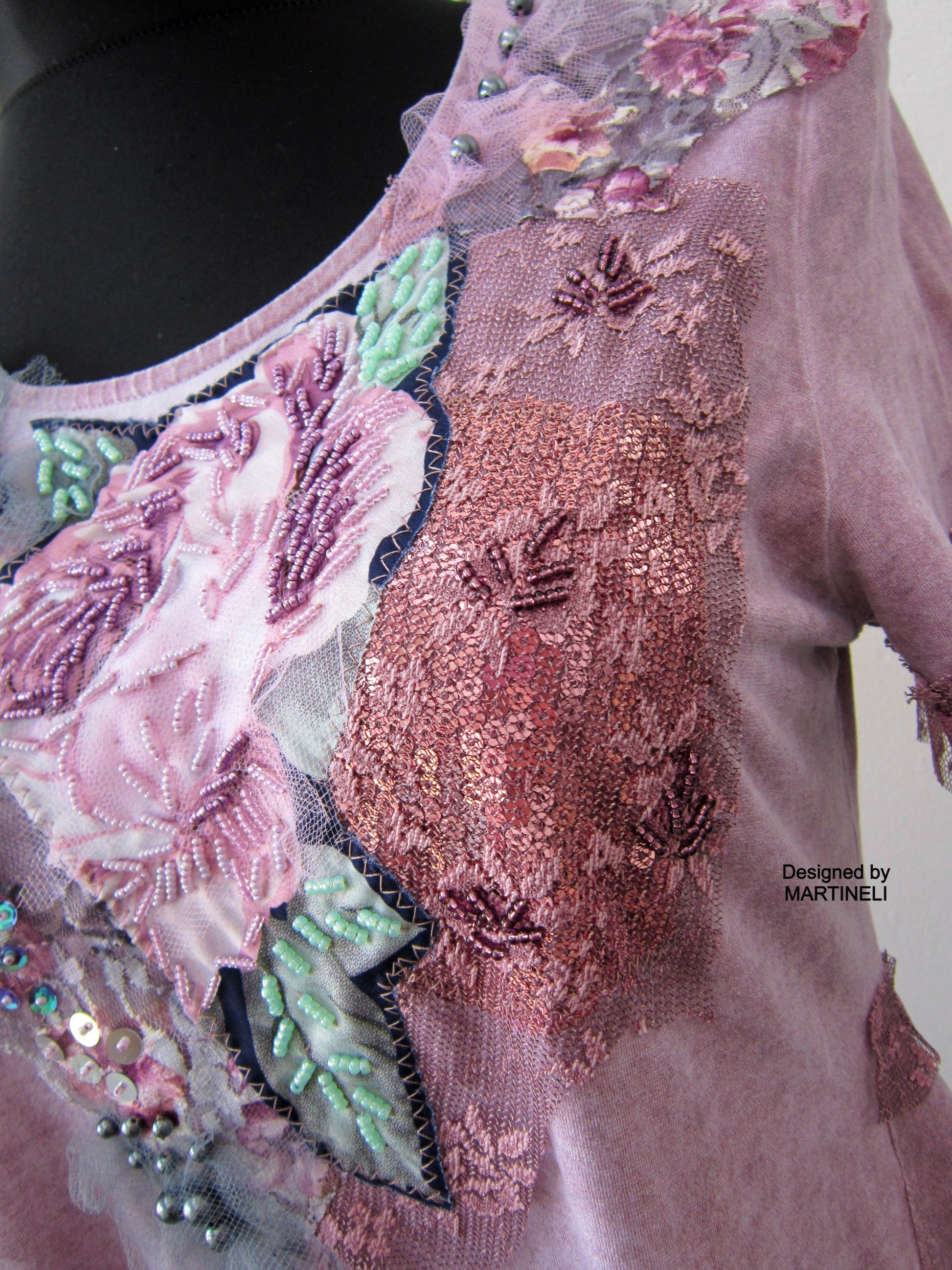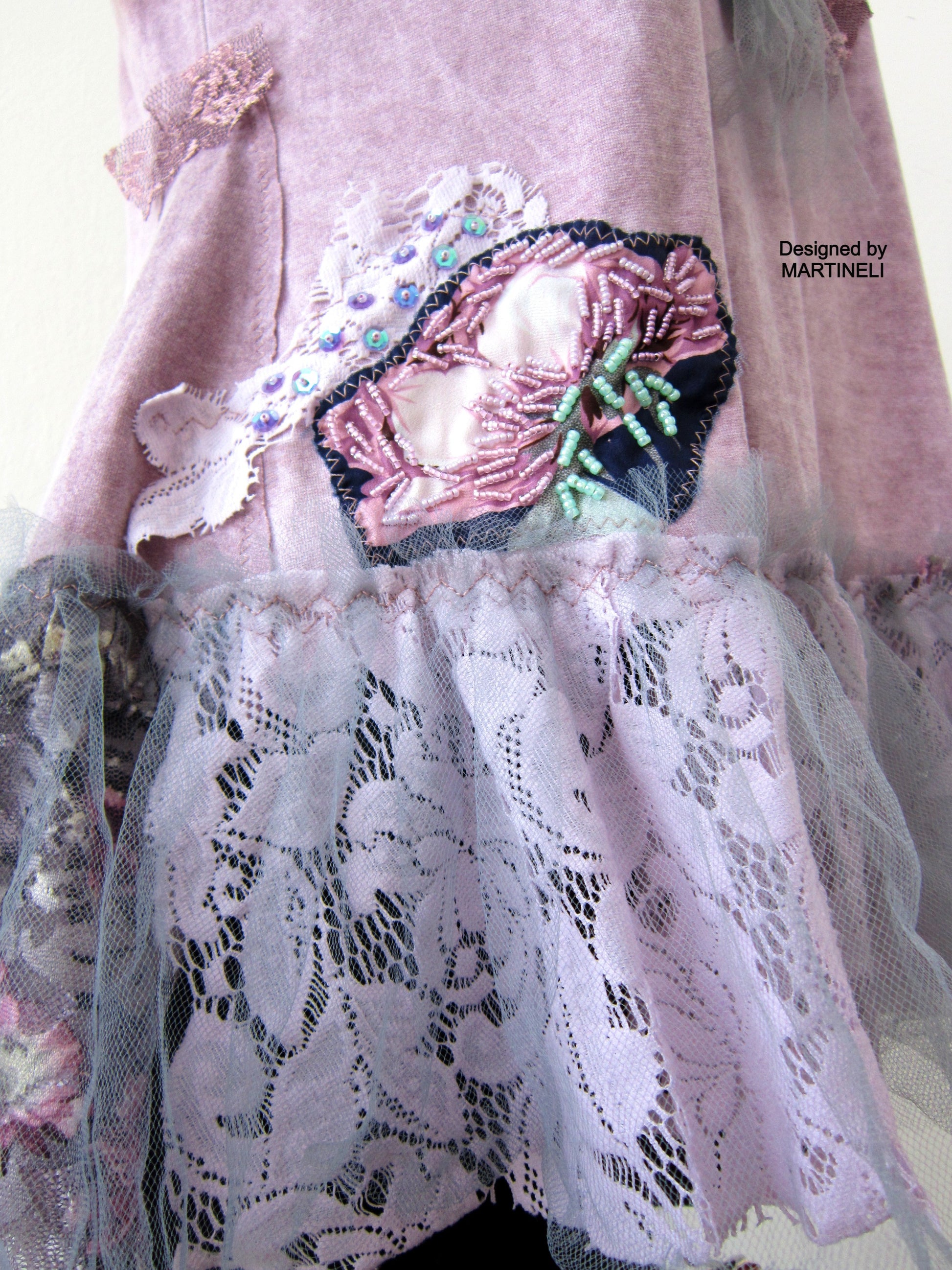 I used very soft and stretchy dusty pink t shirt , different laces, tulle, sequins pieces,chiffon handmade flowers, roses patches, Preciosa glass beads ,pearls and sequins.