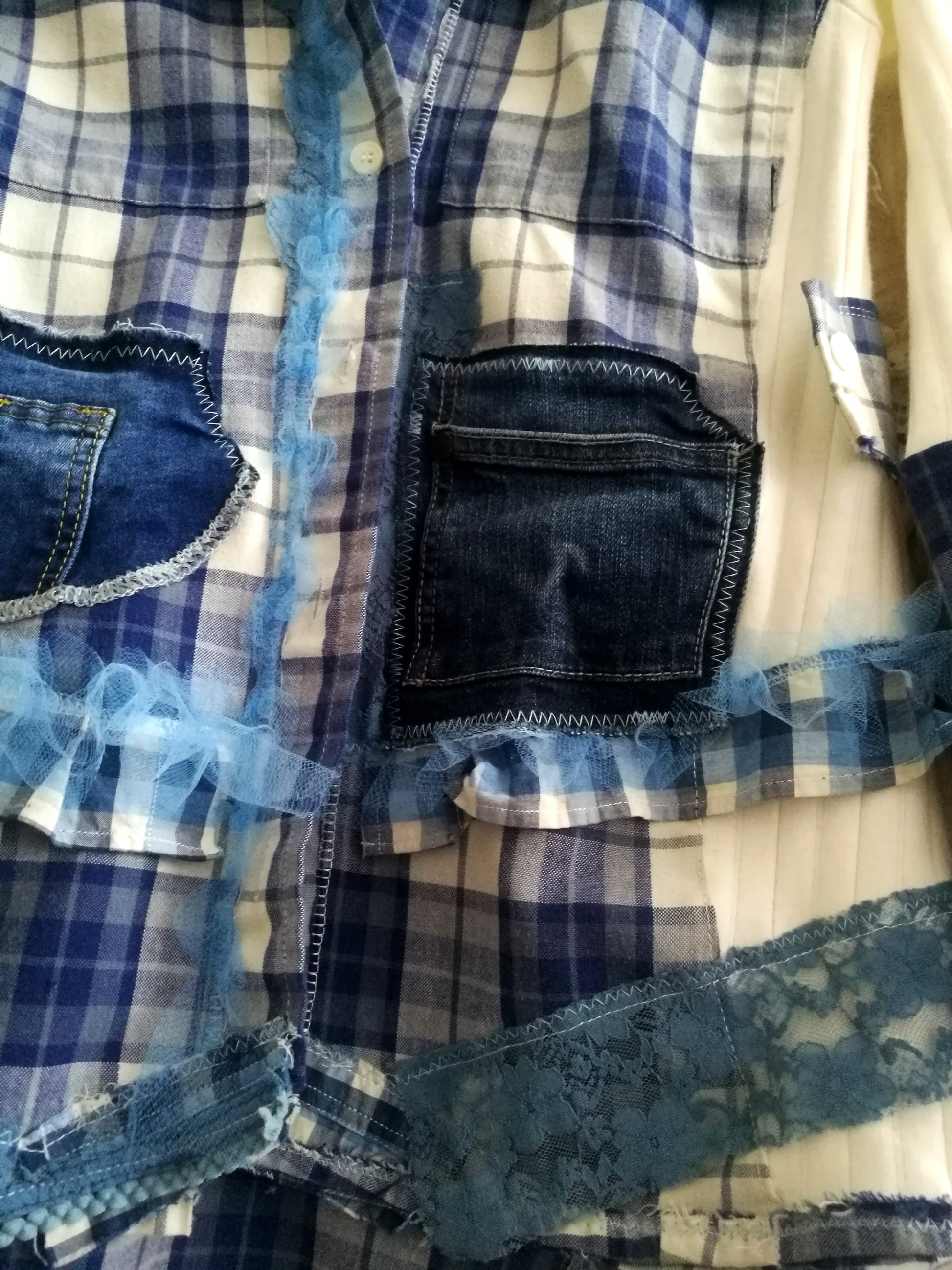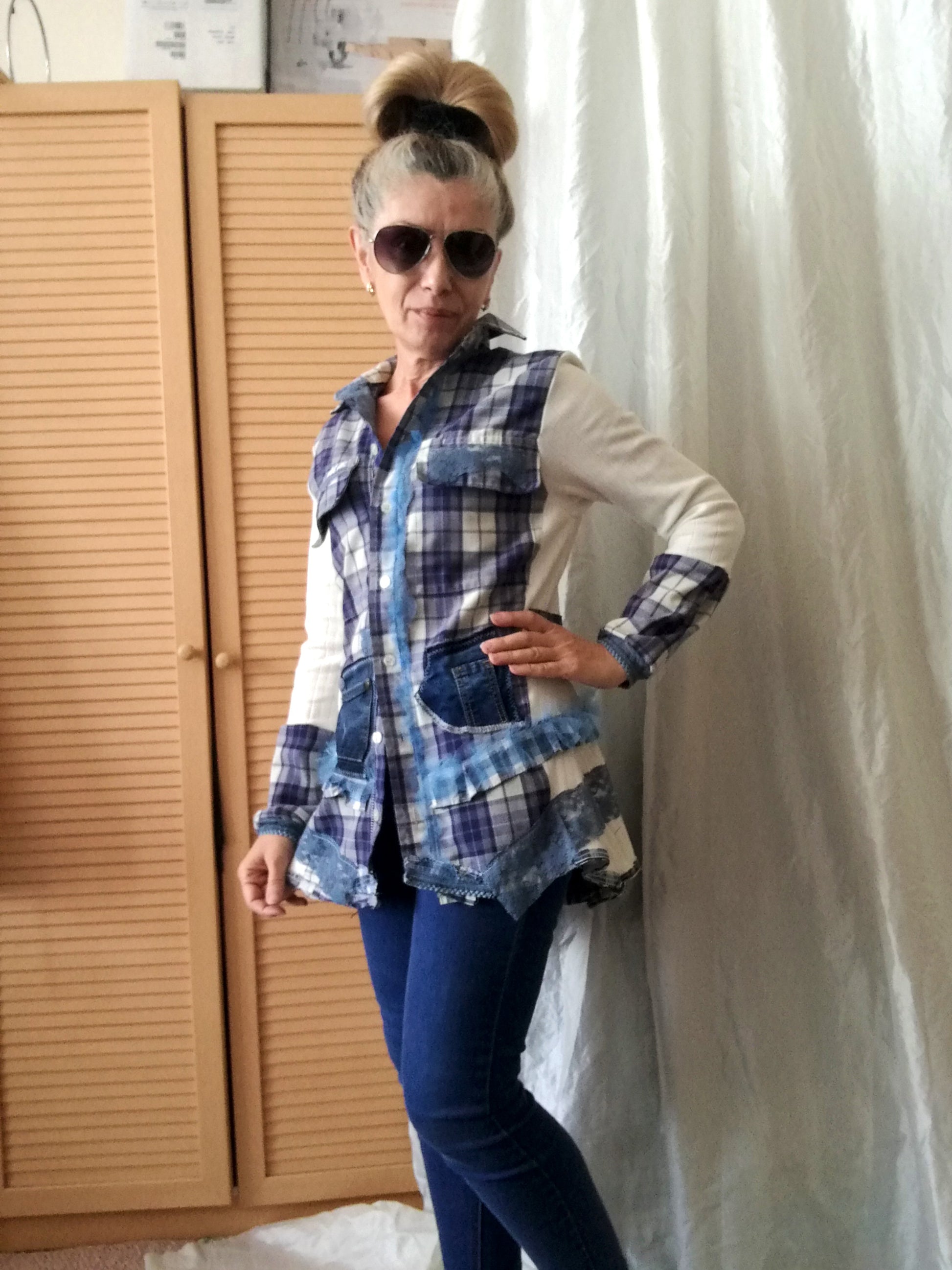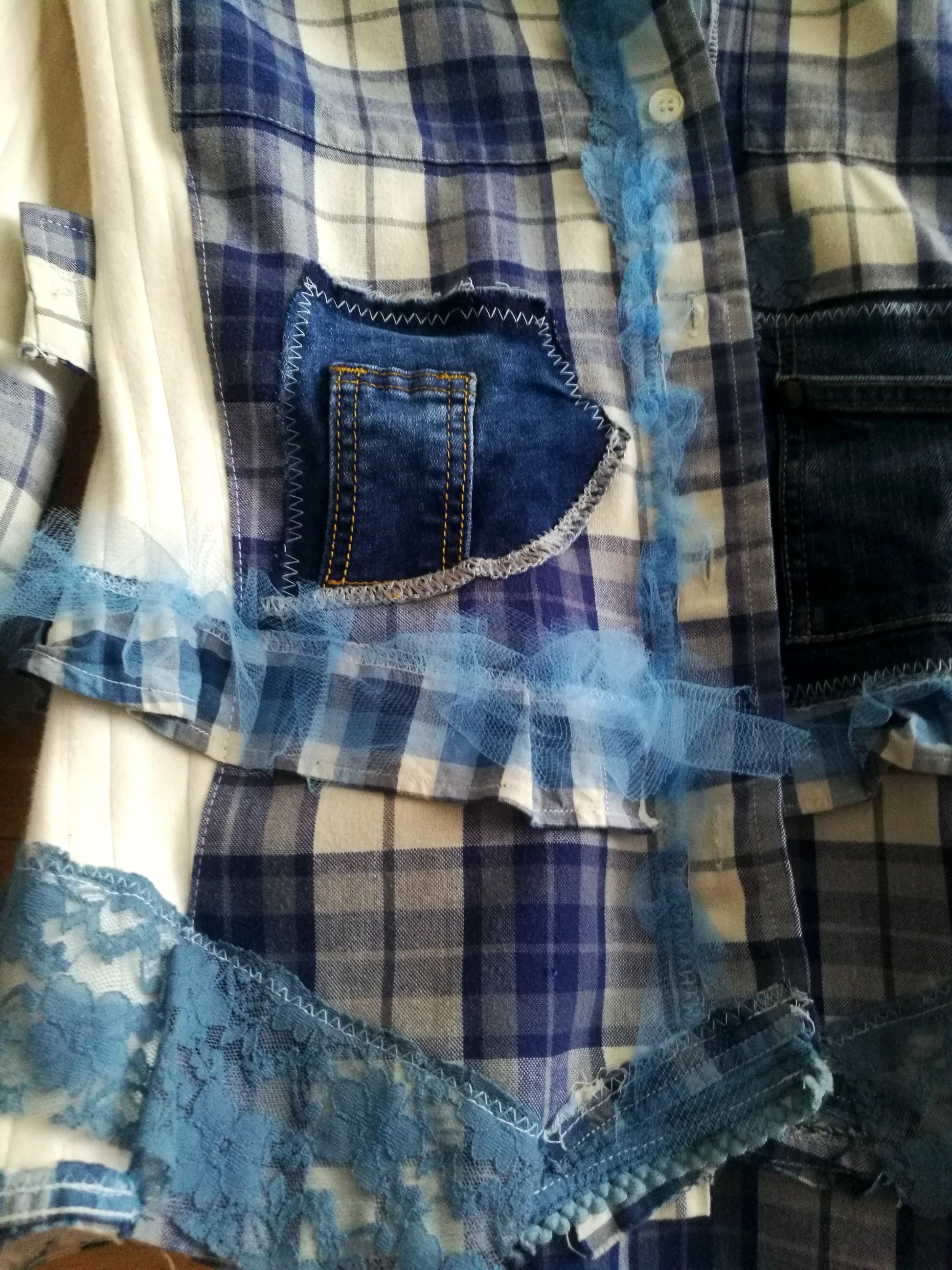 I used a very soft and fine off white stretchy cotton,blue/white plaid cotton,denim patches,lace, tulle.This boho tunic top is very soft, lightweight and A LITTLE STRETCHY !!!!