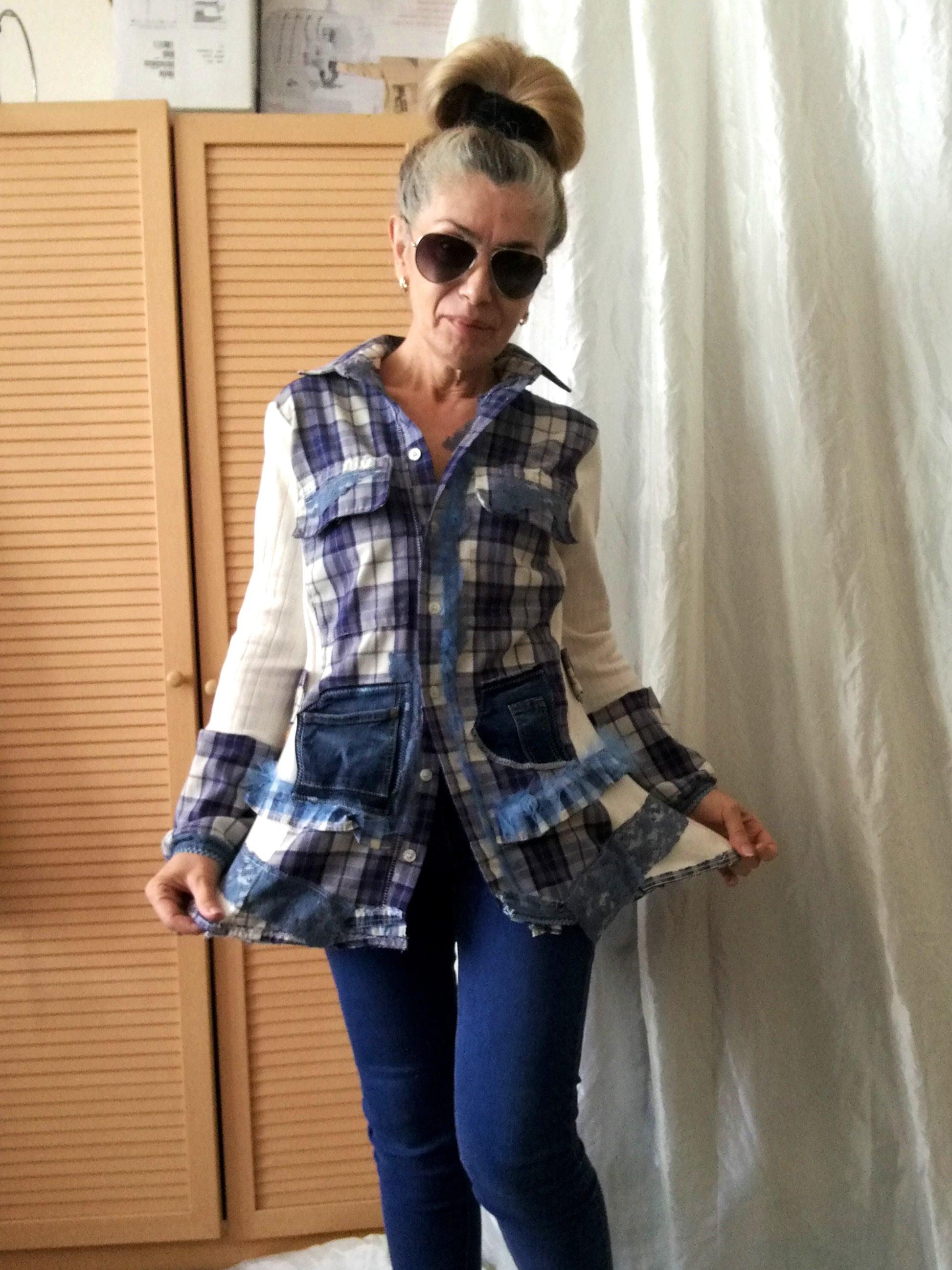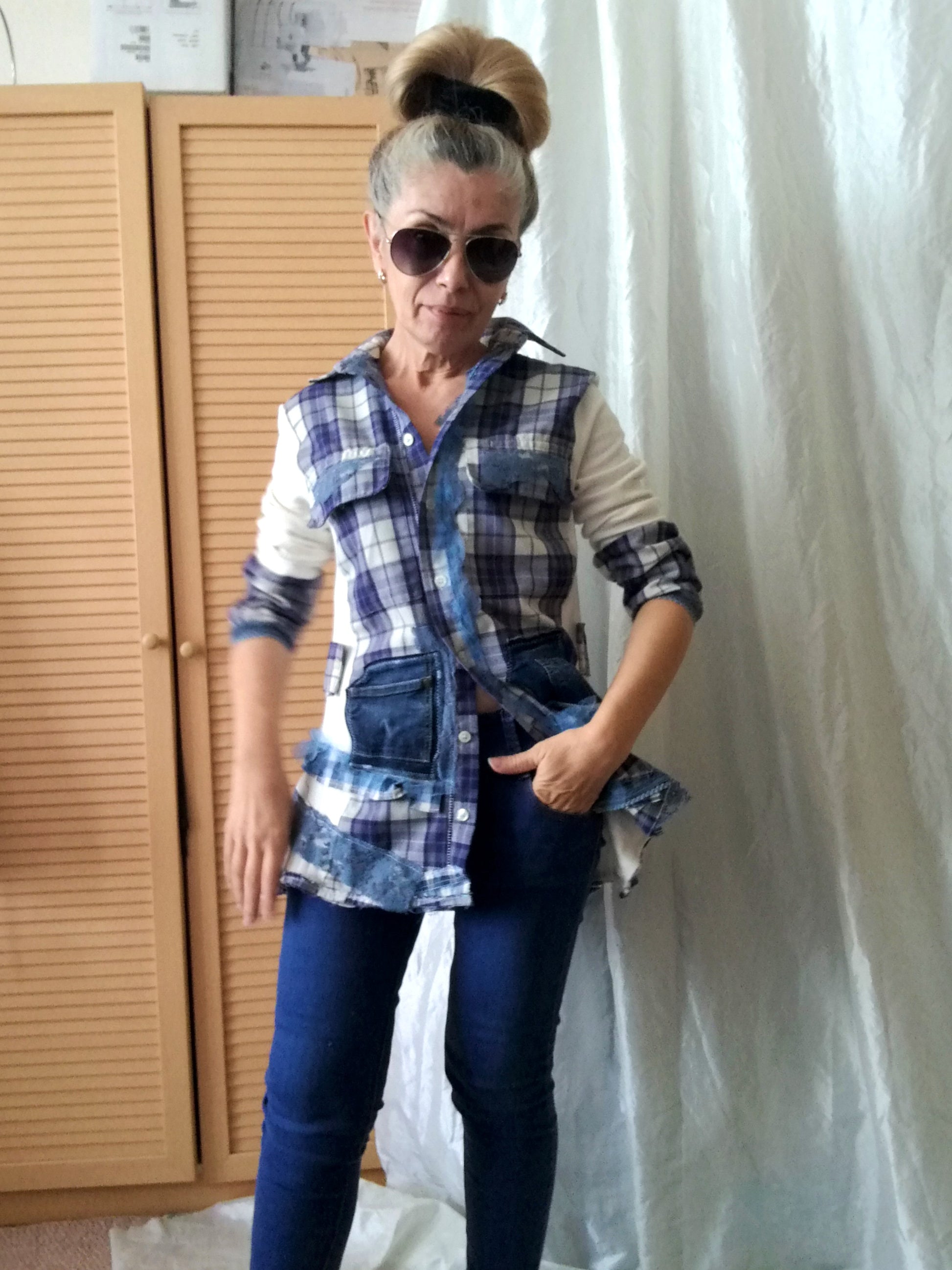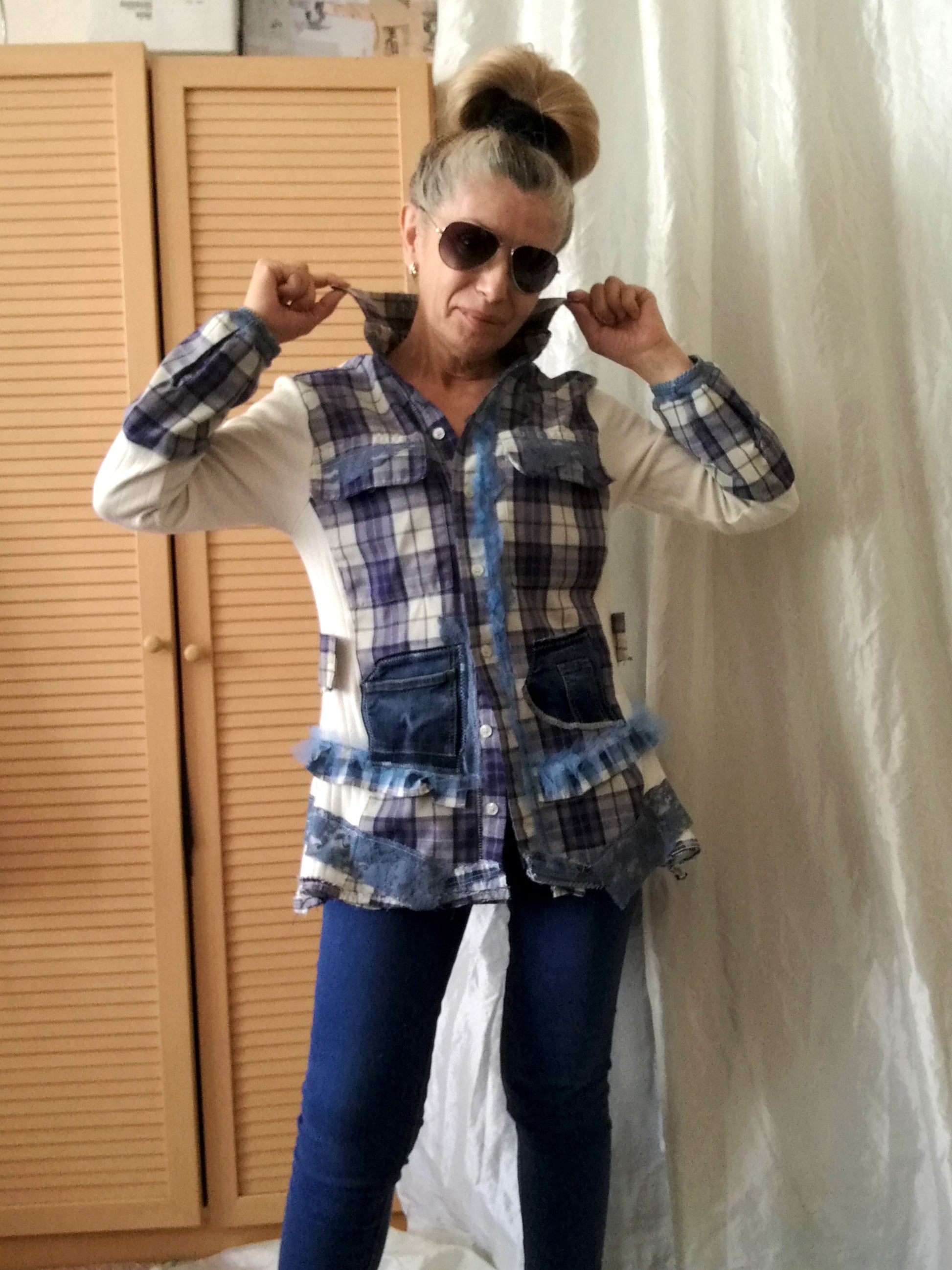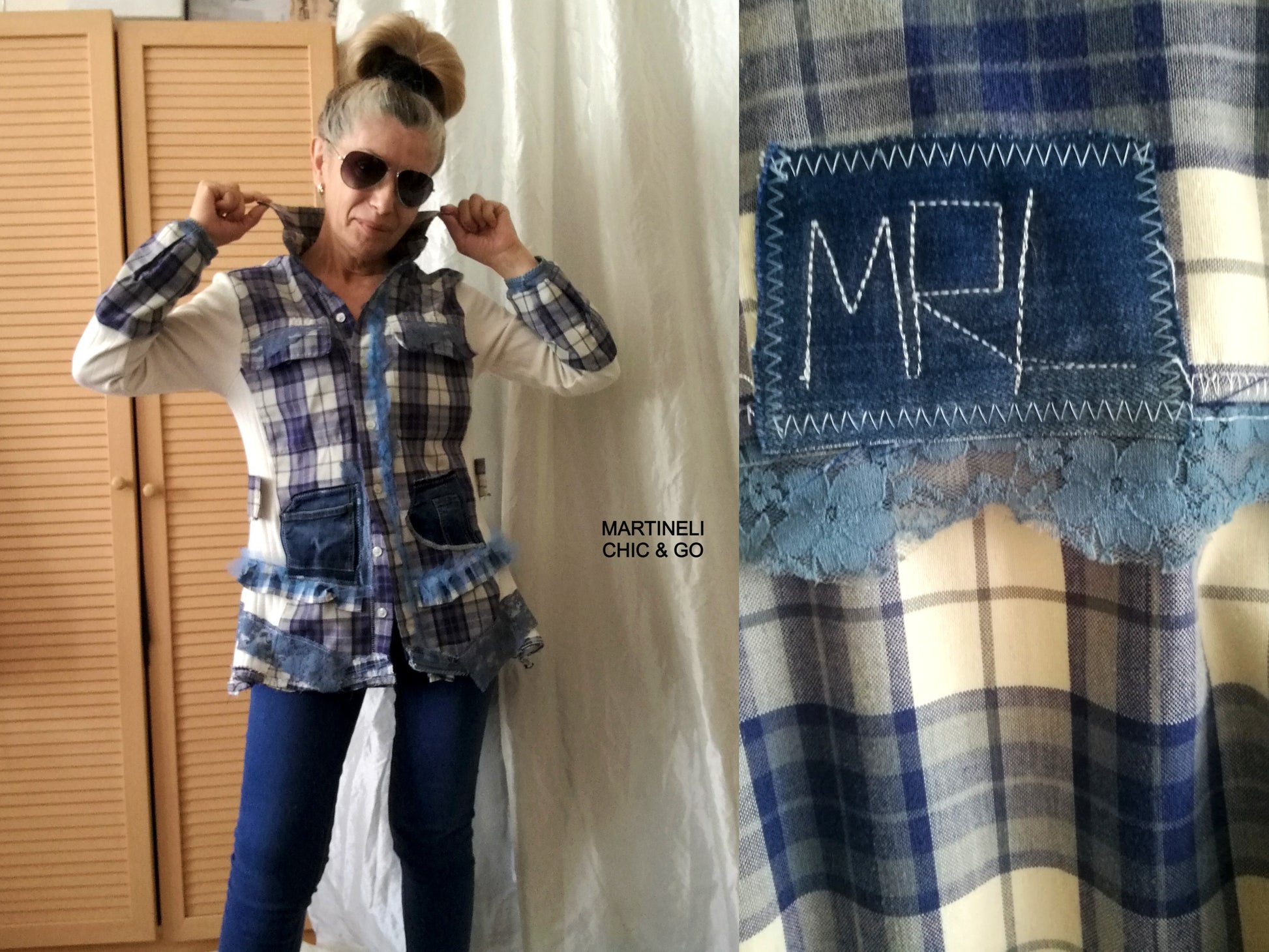 I used a very soft and fine off white stretchy cotton,blue/white plaid cotton,denim patches,lace, tulle.This boho tunic top is very soft, lightweight and A LITTLE STRETCHY !!!!