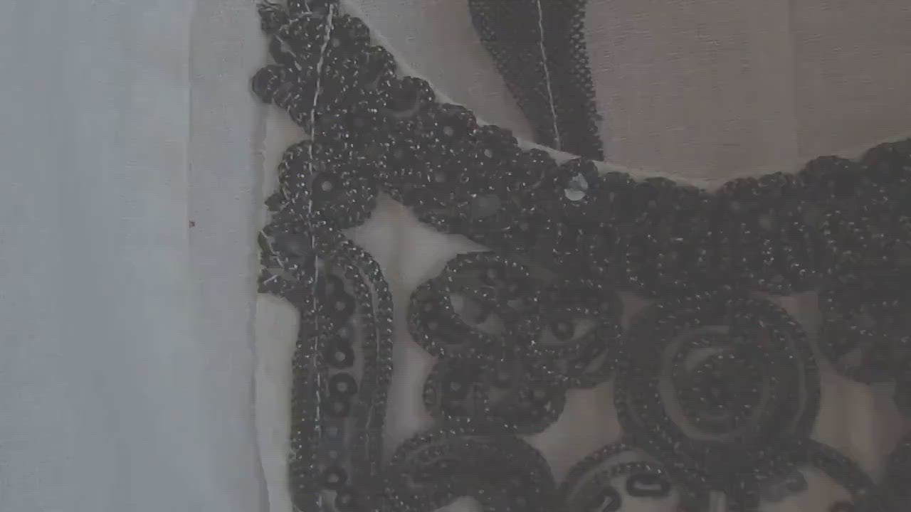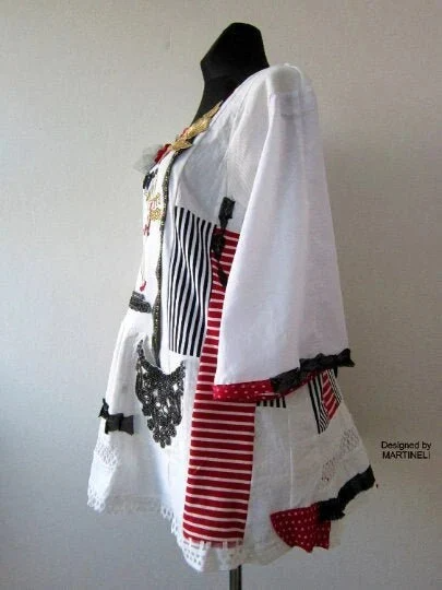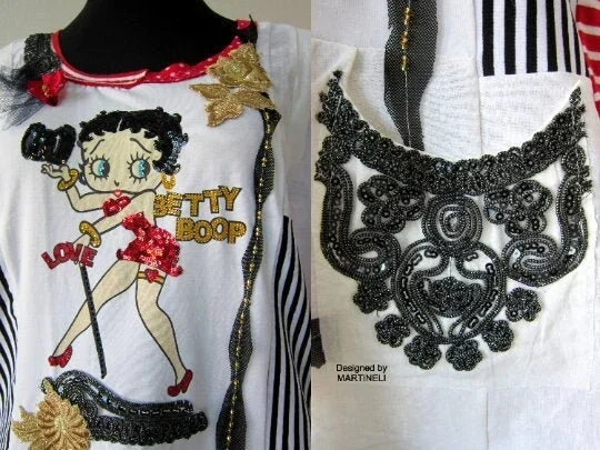I used soft white linen,stretch striped cotton, laces,white cotton fabric.The front part has a Betty Boop patch,vintage black sequins embroidered patches and gold lace flowers. The dress has a rich bead embroidery,made of Preciosa glass beads.