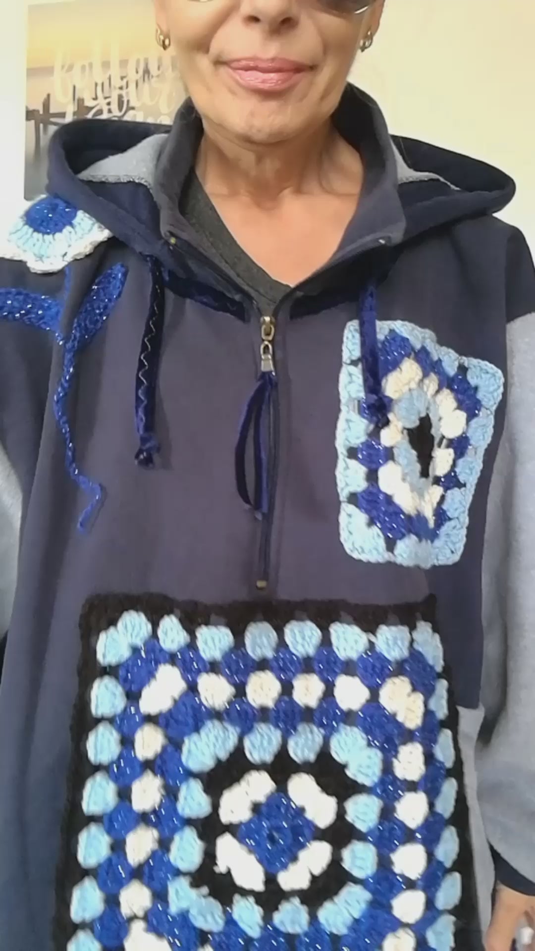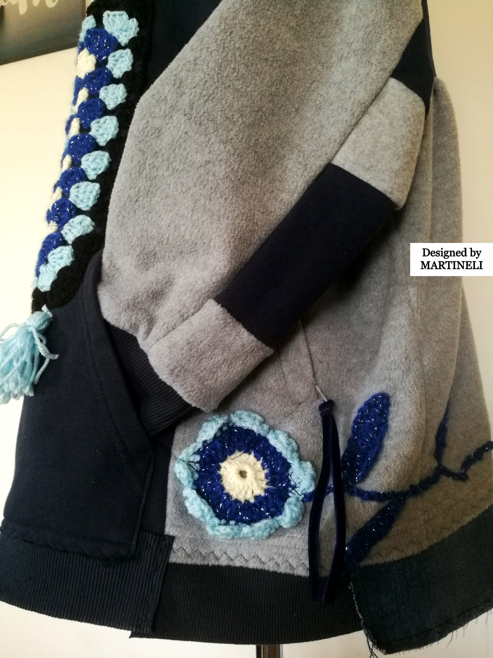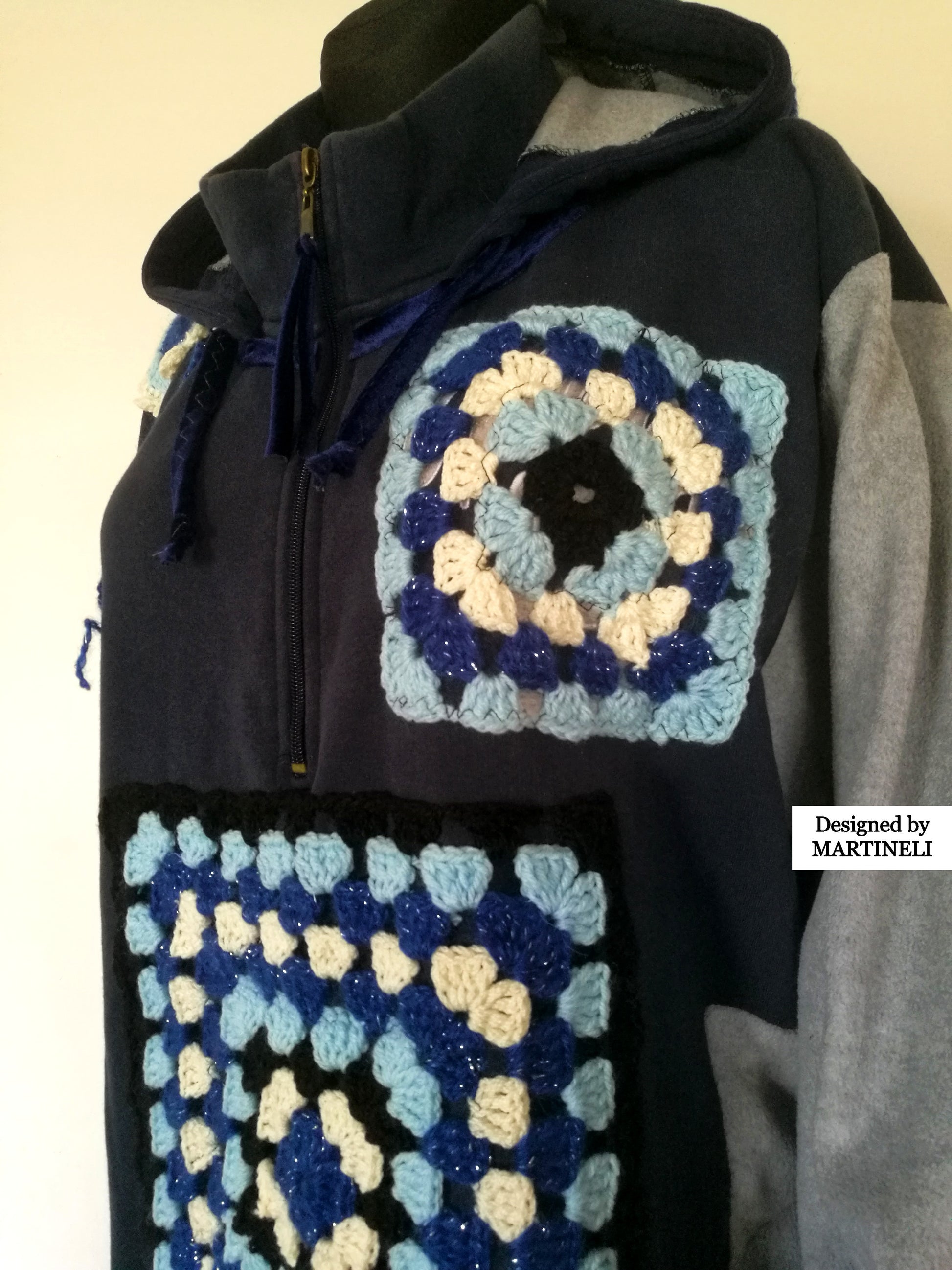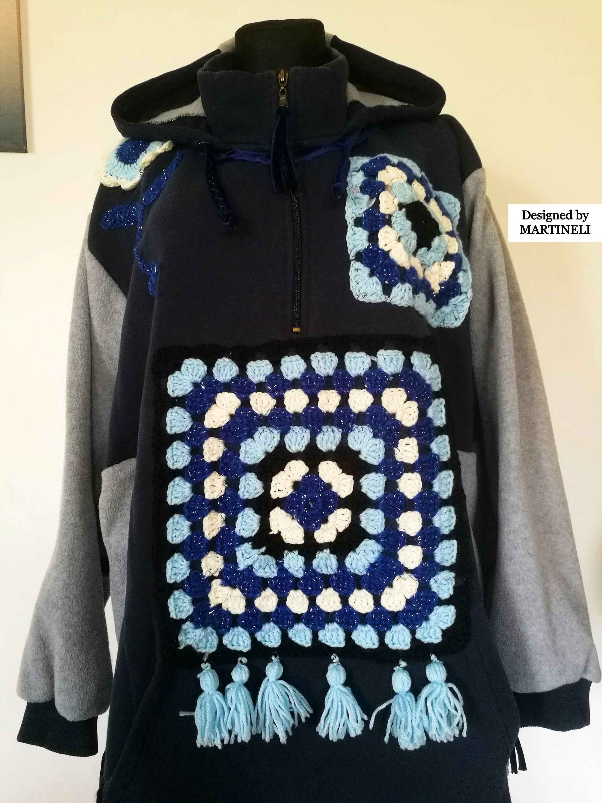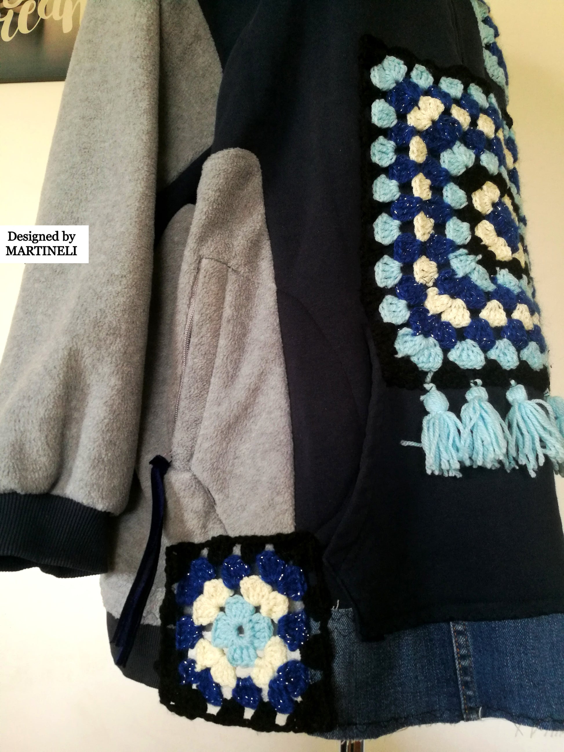 I used soft dark blue fleece cotton, light gray fleece, blue denim, granny squares crochet embellishments.