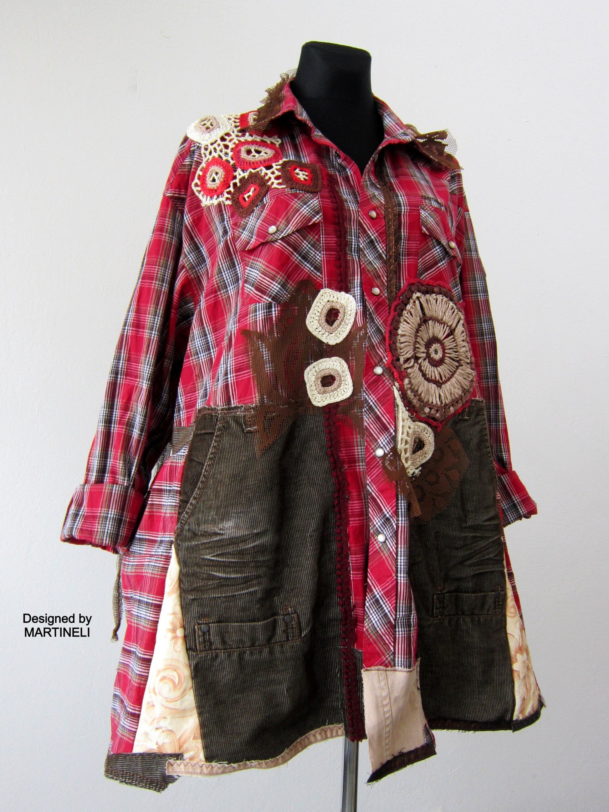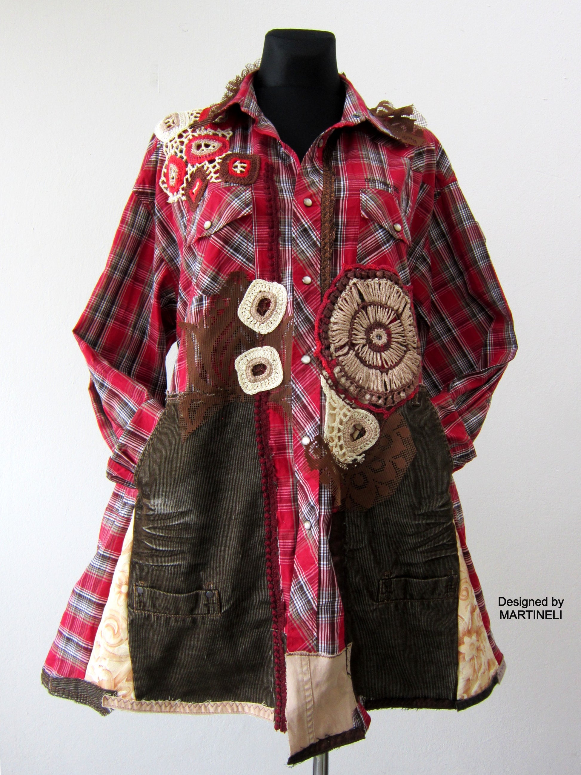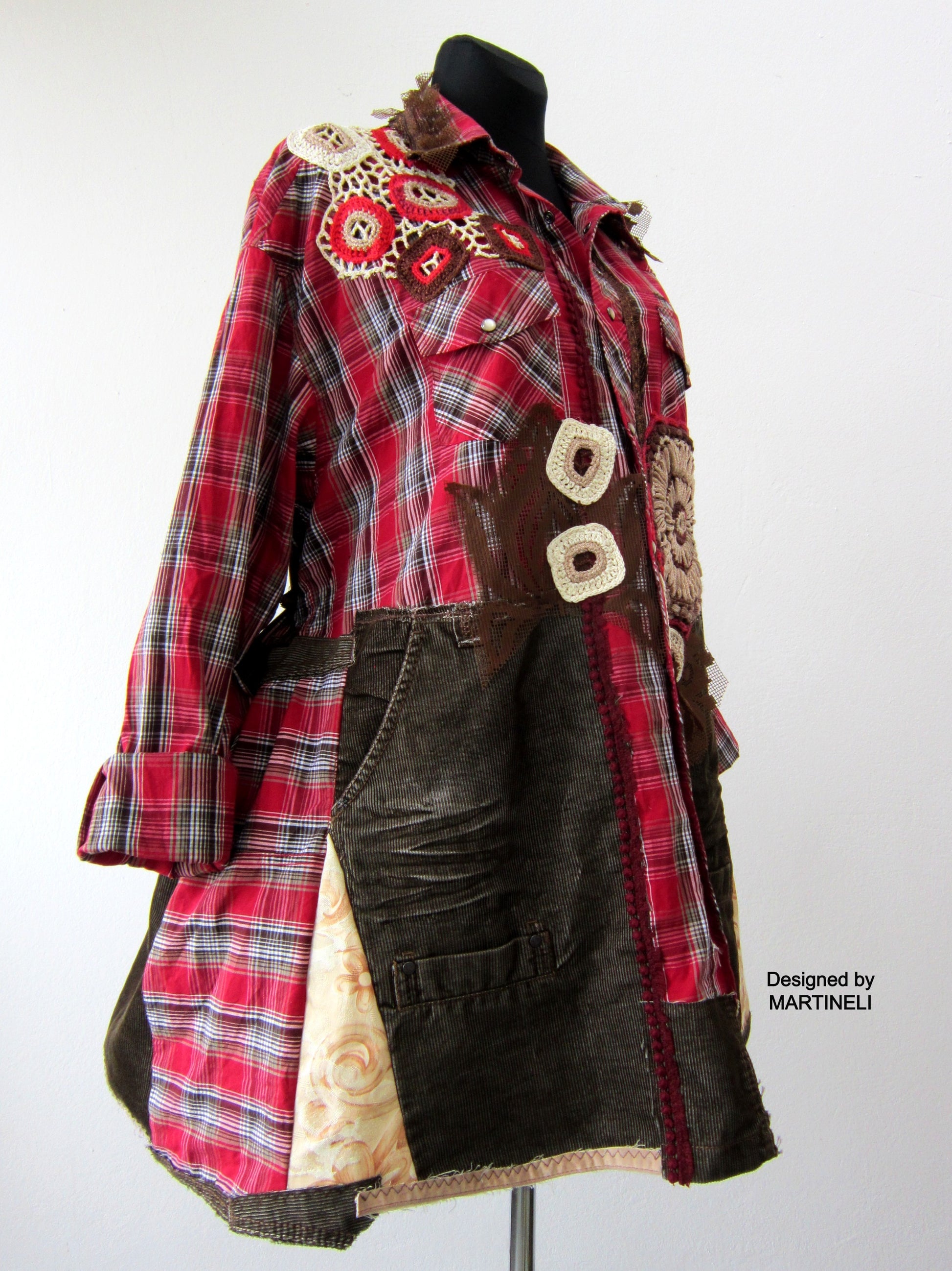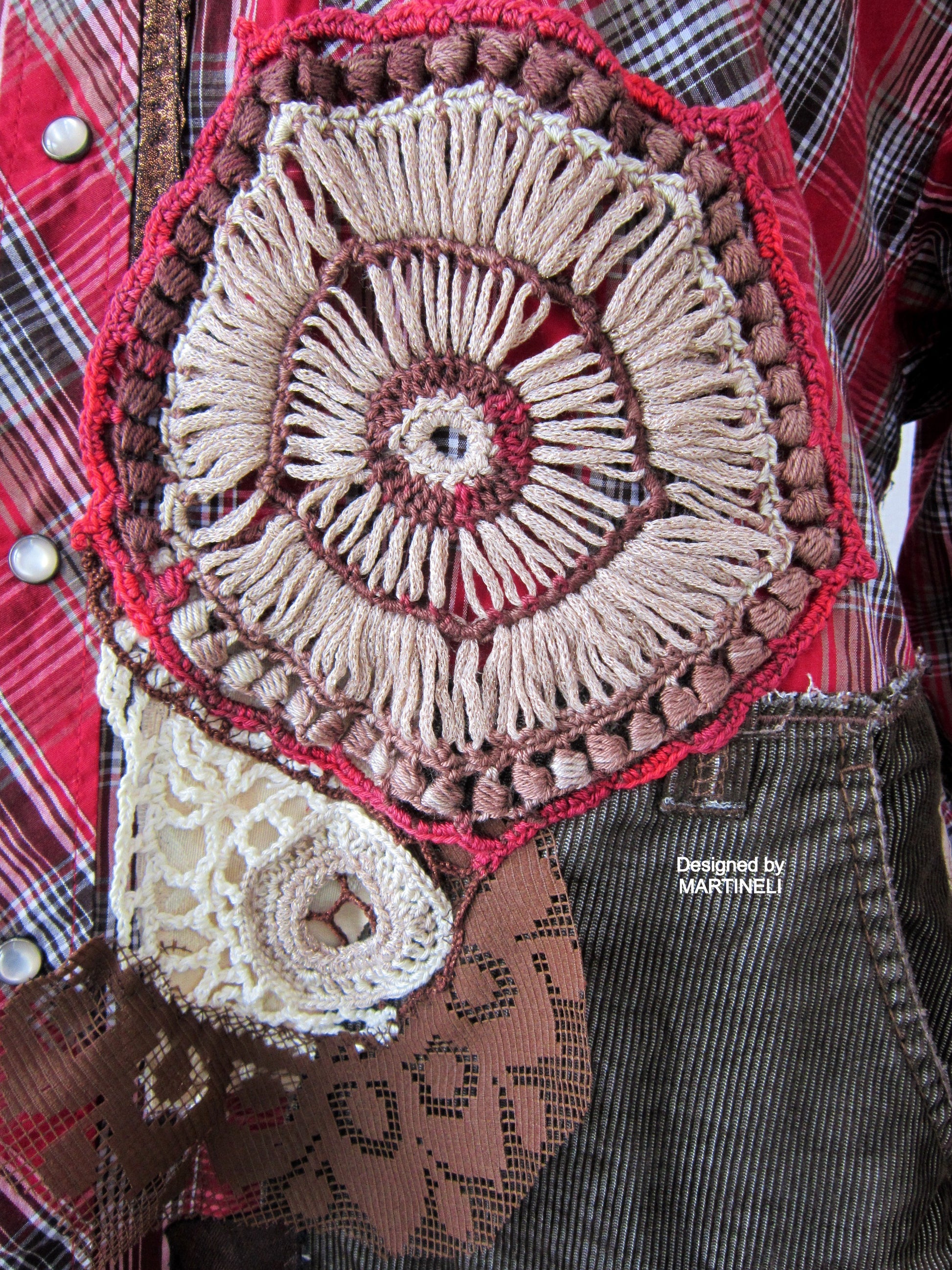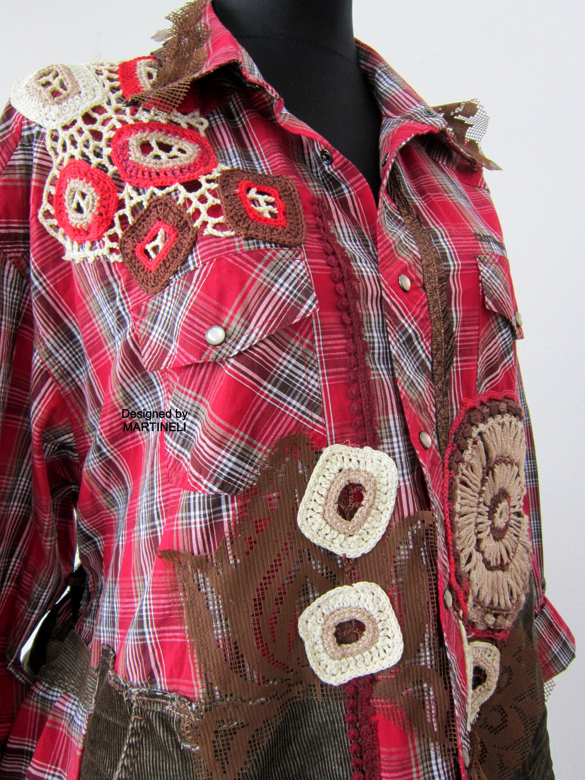I used very soft plaid cotton shirt in red/brown/beige, brown corduroy, lace . The front part is embellished with hand crochet pieces .