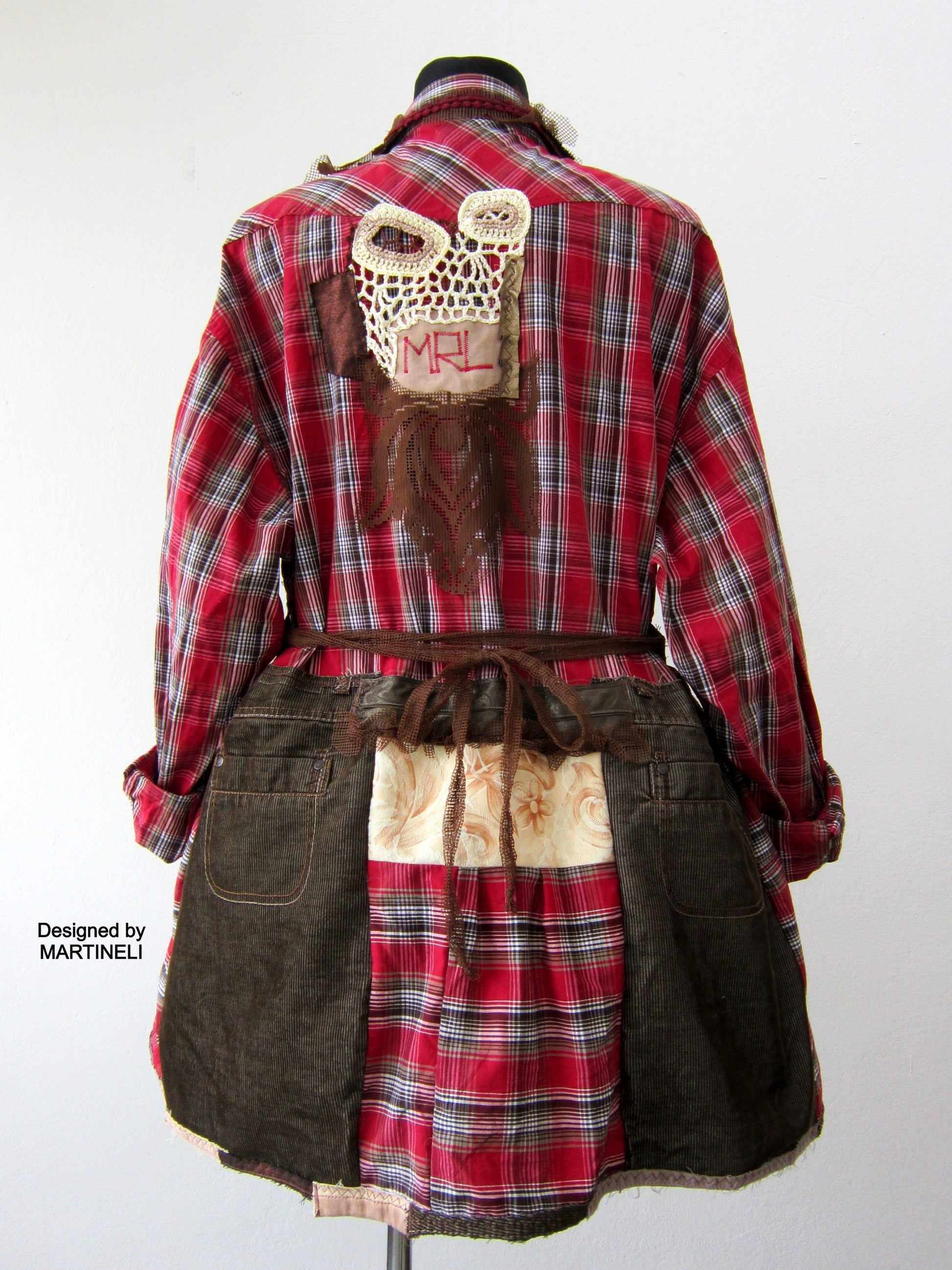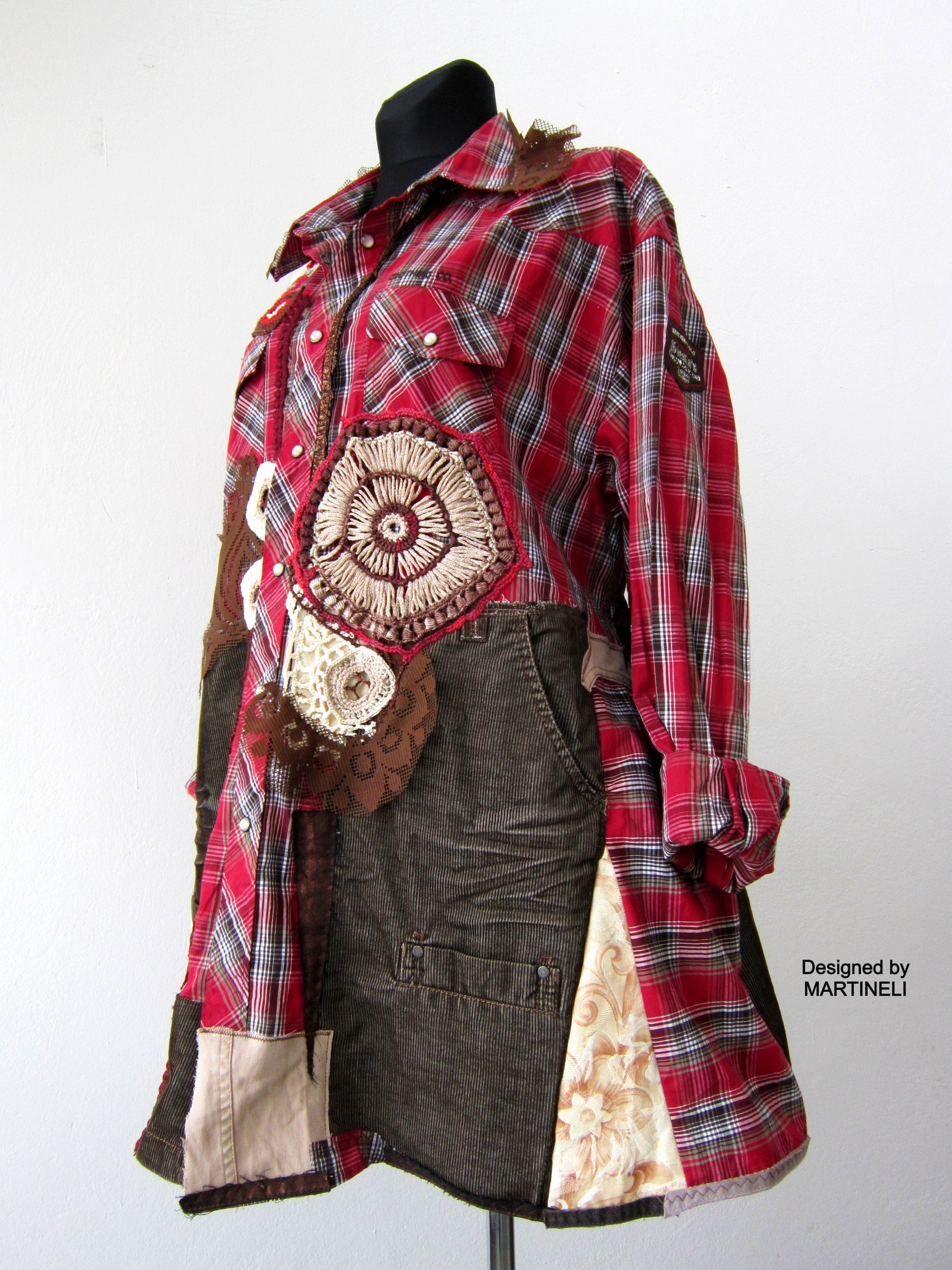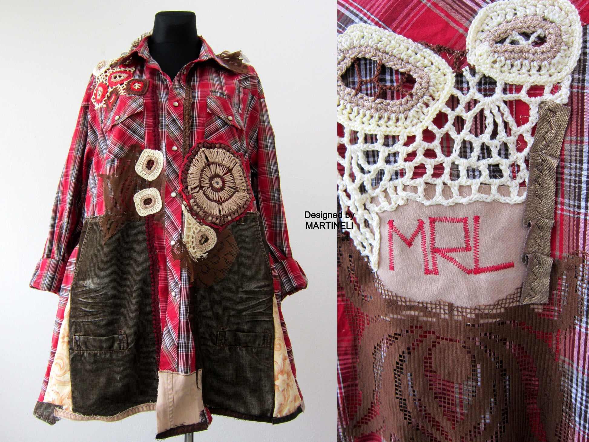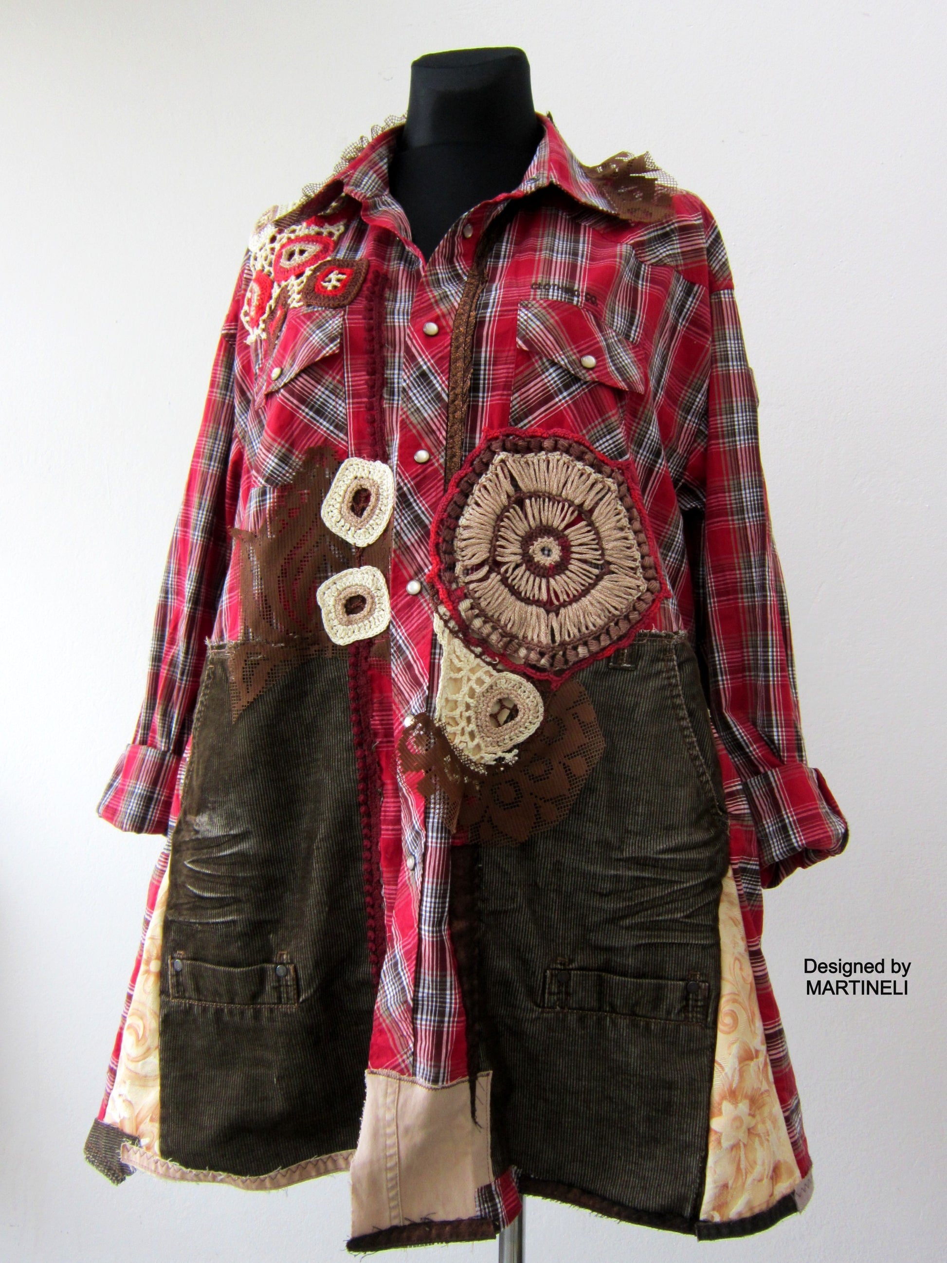I used very soft plaid cotton shirt in red/brown/beige, brown corduroy, lace . The front part is embellished with hand crochet pieces .