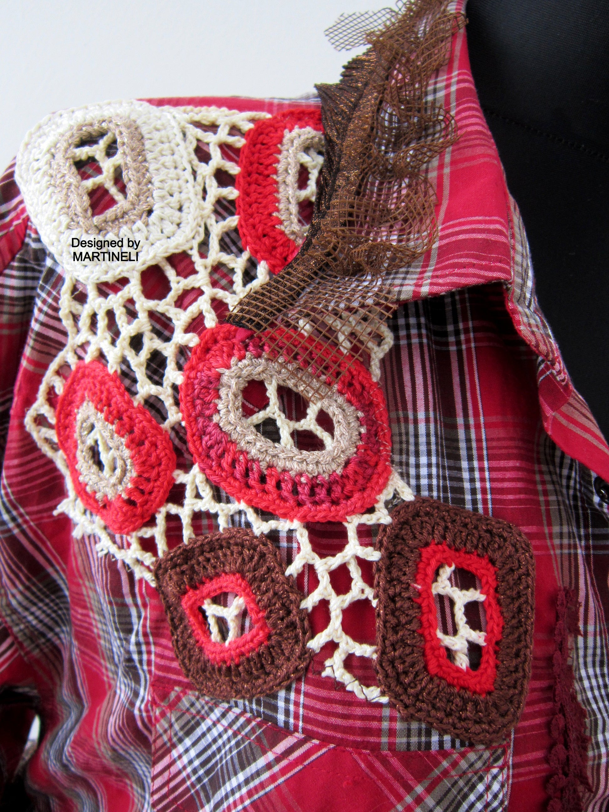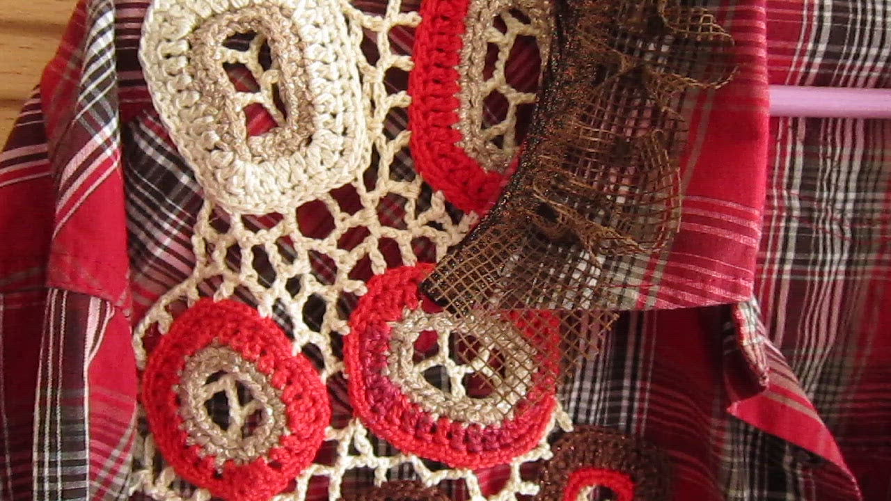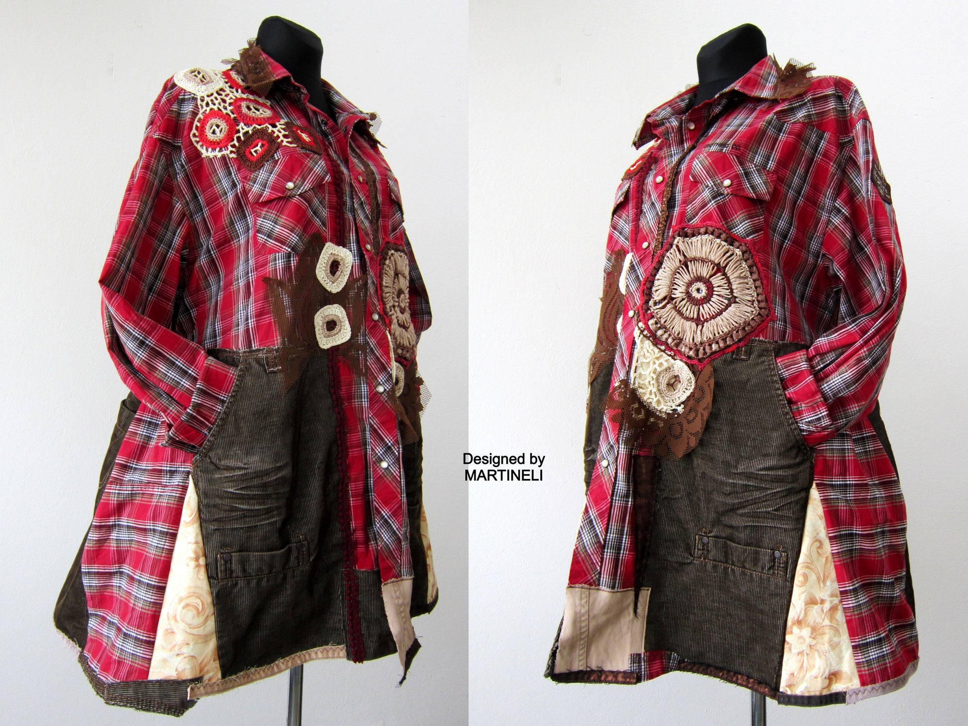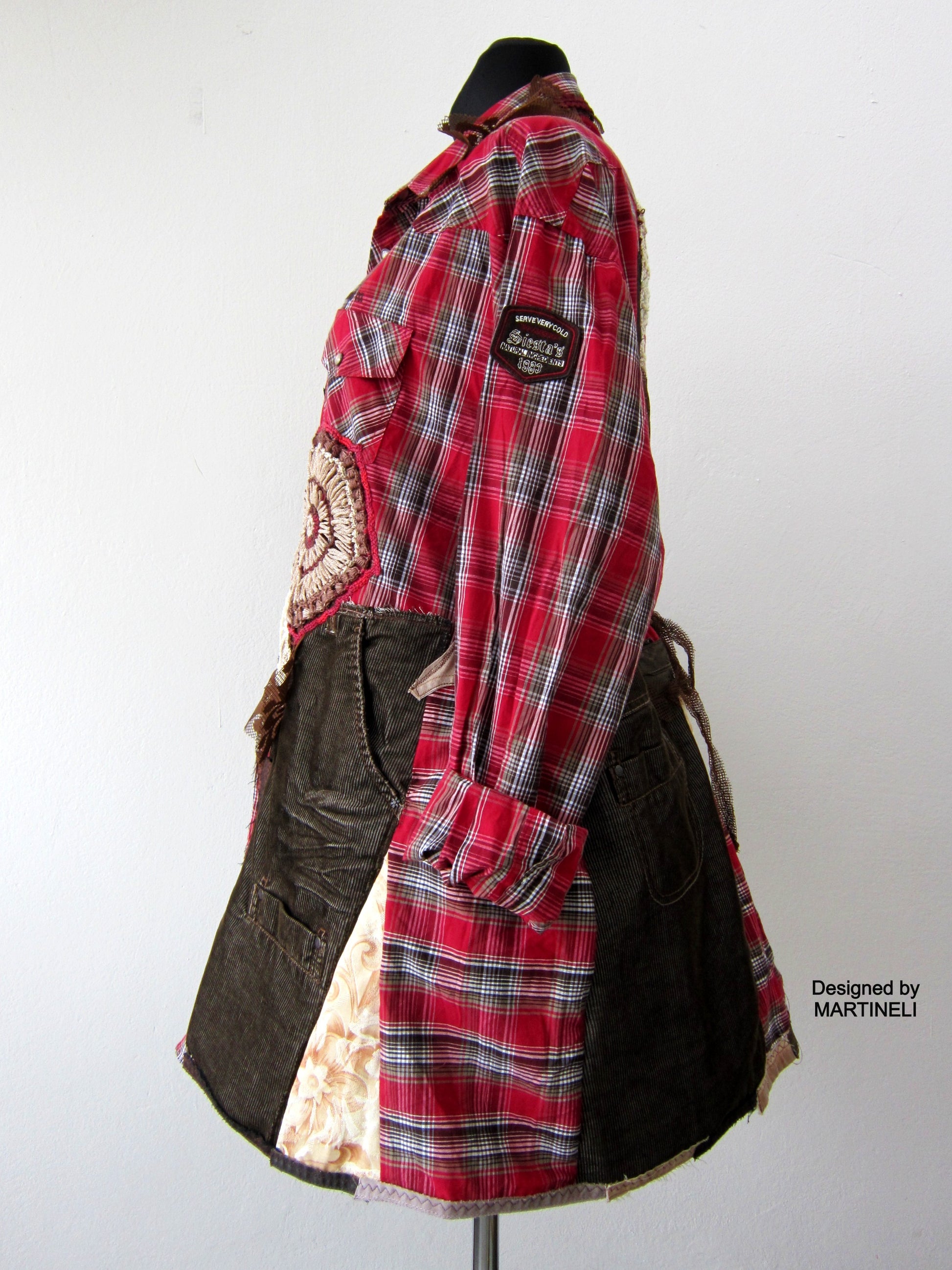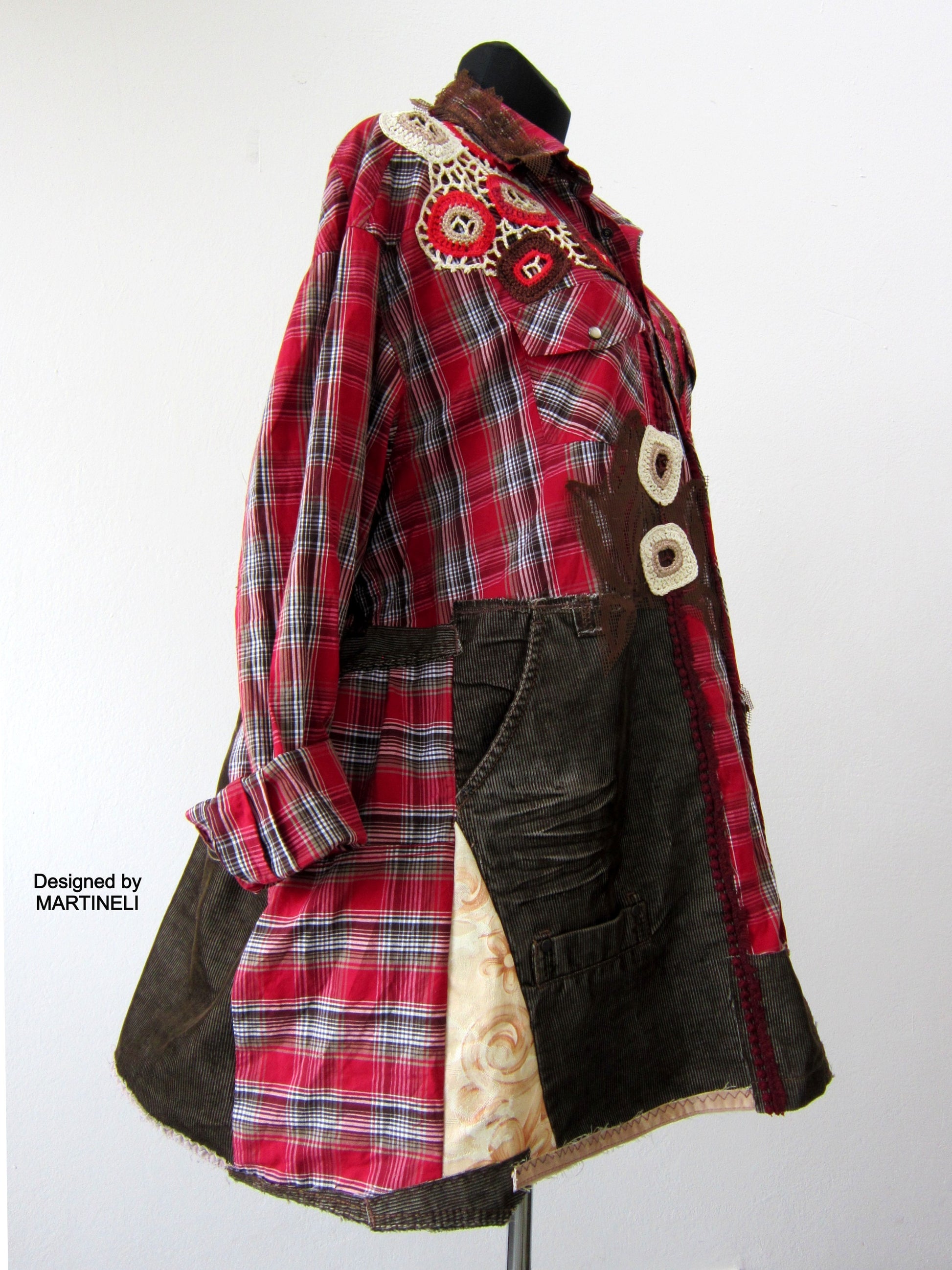 I used very soft plaid cotton shirt in red/brown/beige, brown corduroy, lace . The front part is embellished with hand crochet pieces .