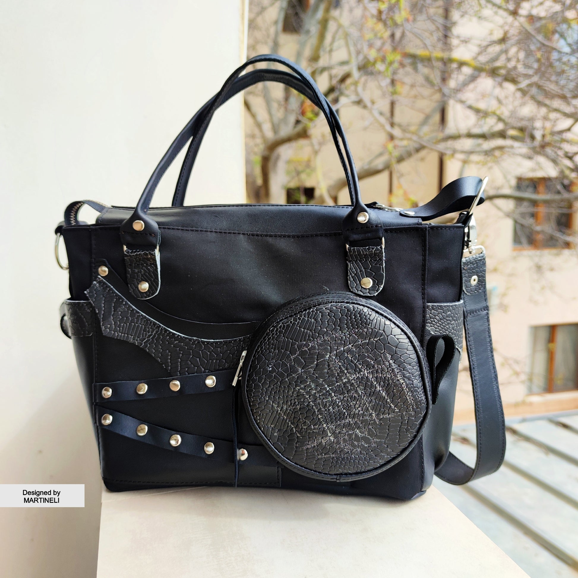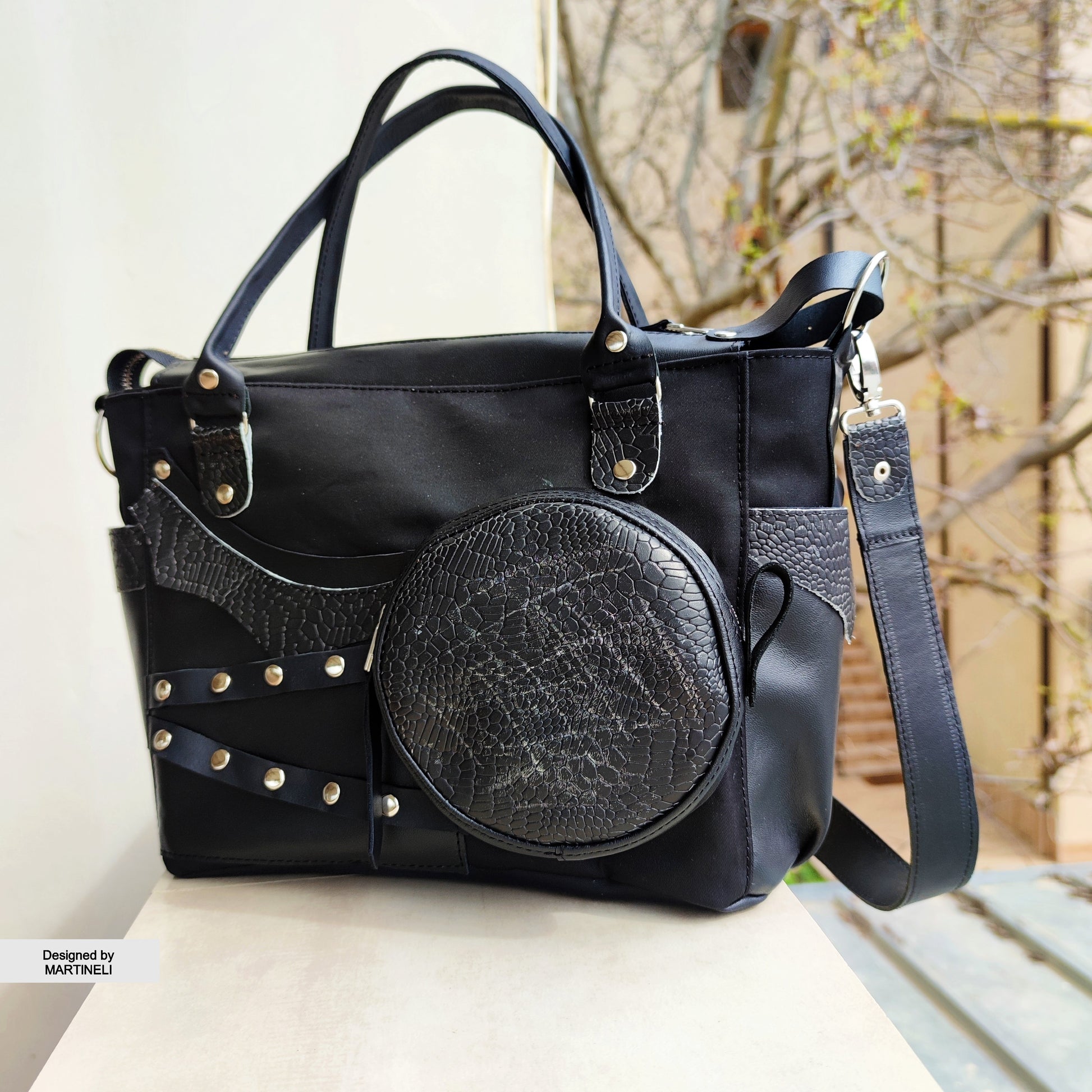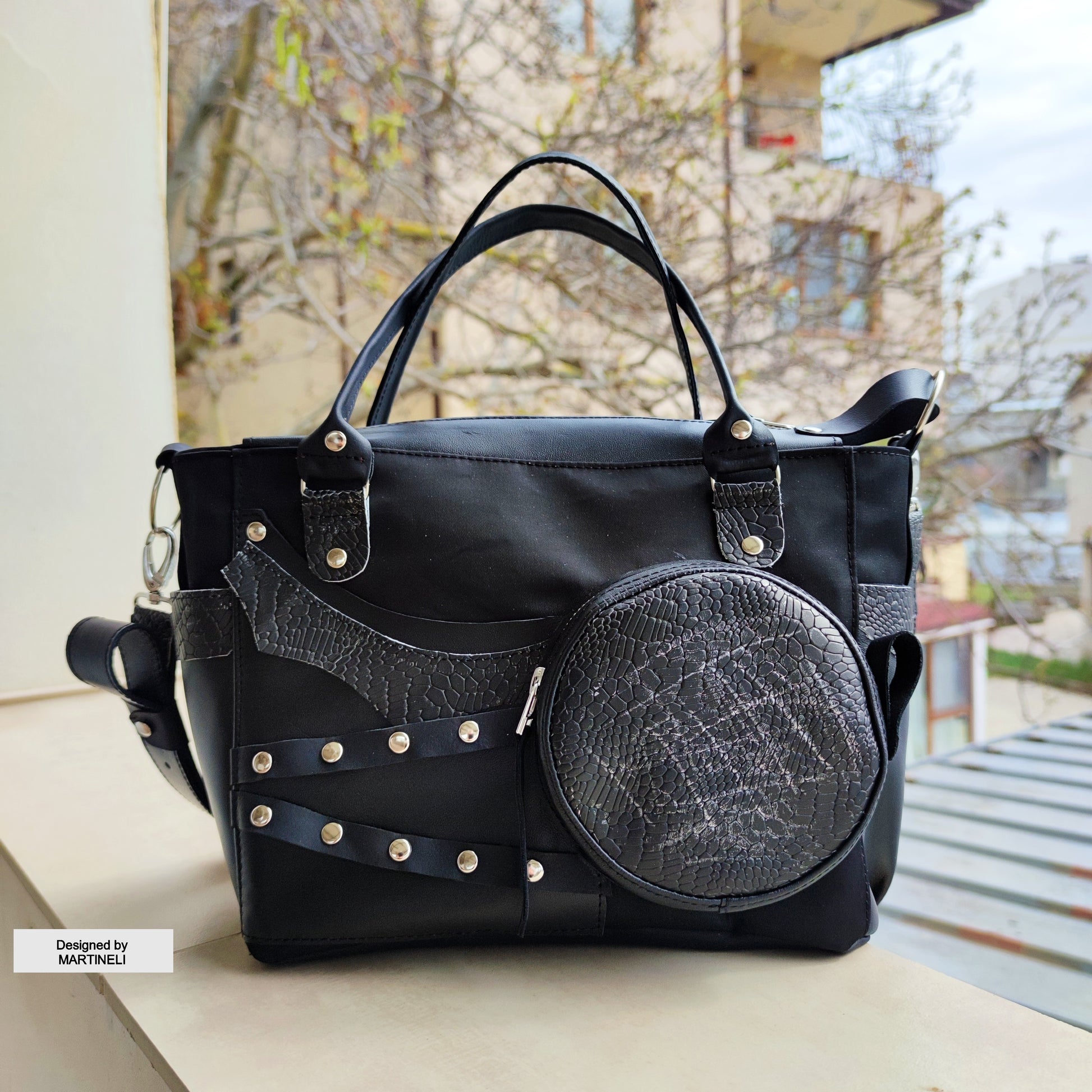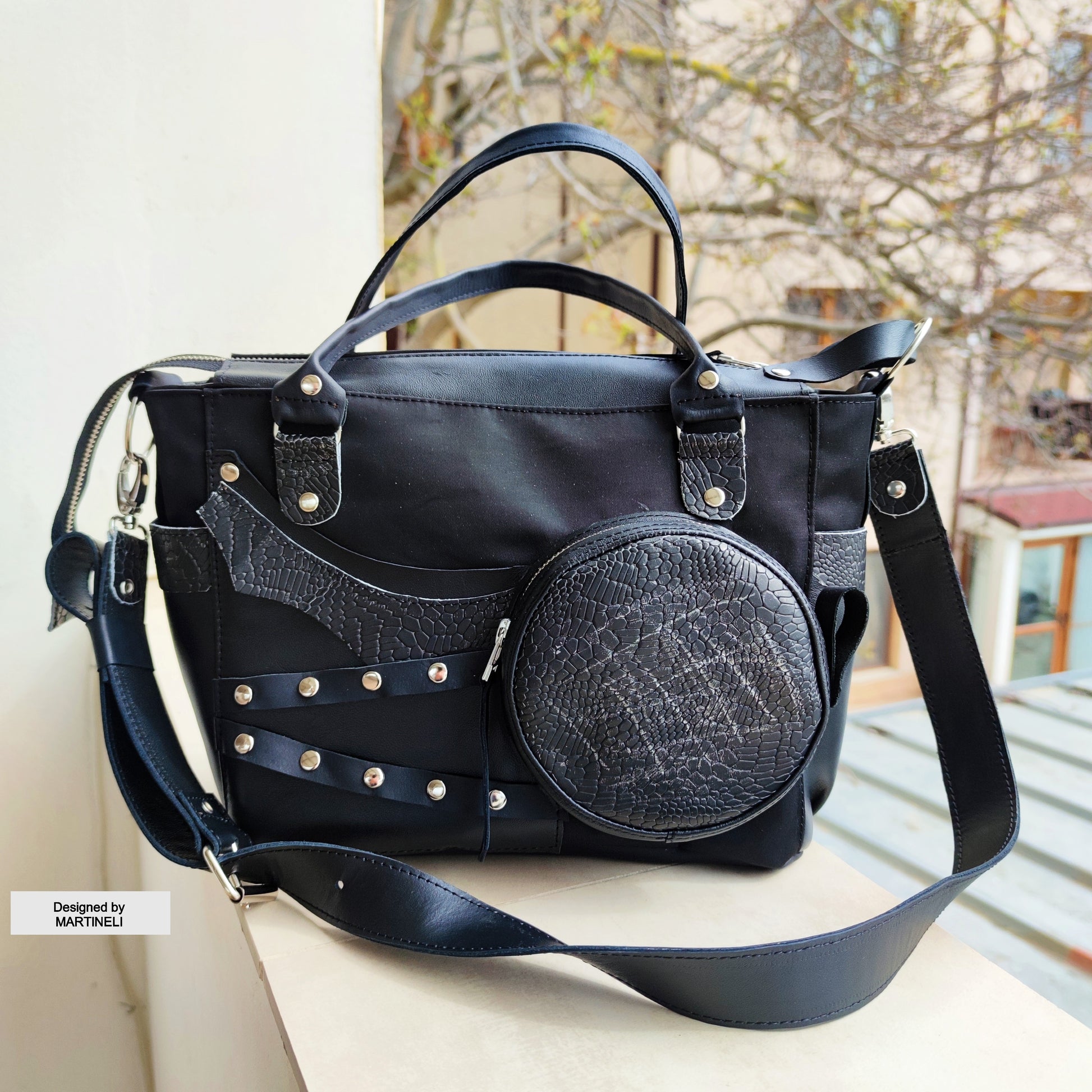 Black Leather Shoulder Bag Luxury Canvas Bag Gothic Style Grunge Bag