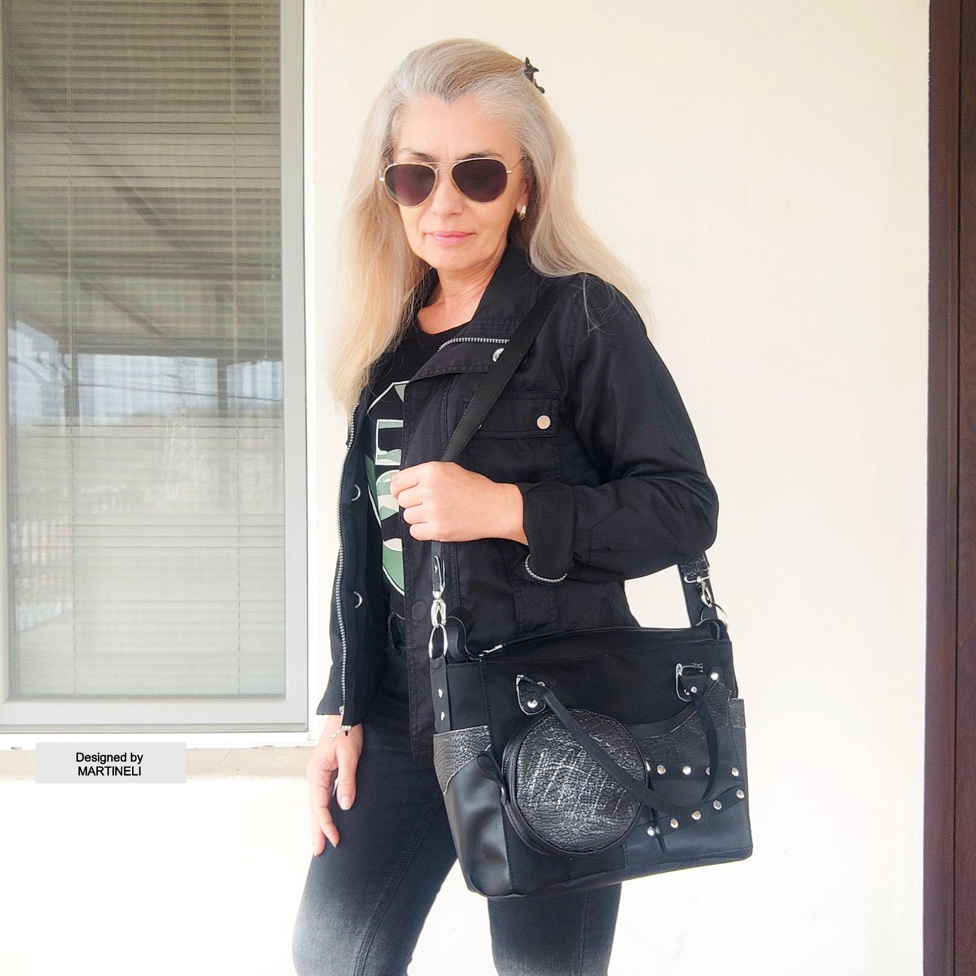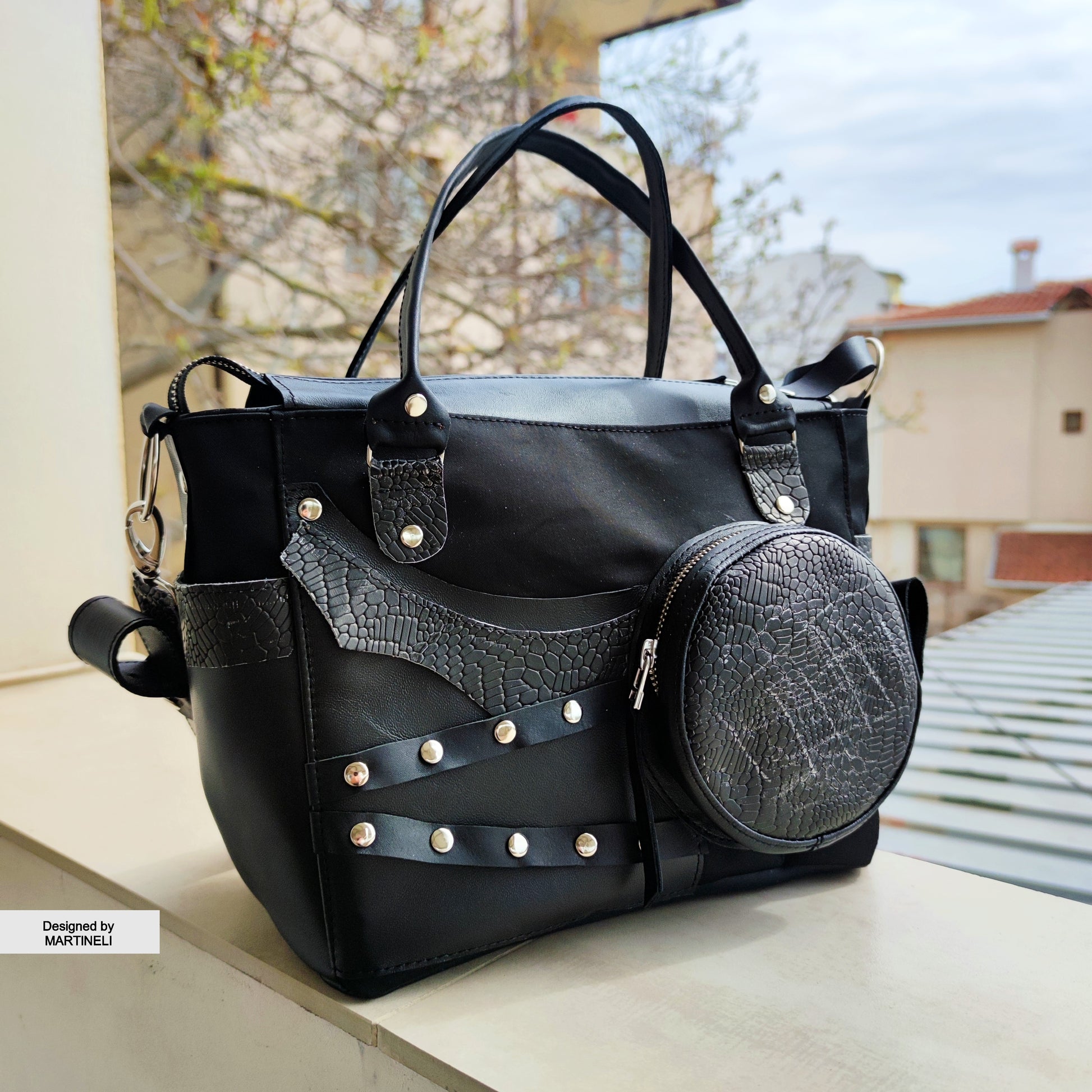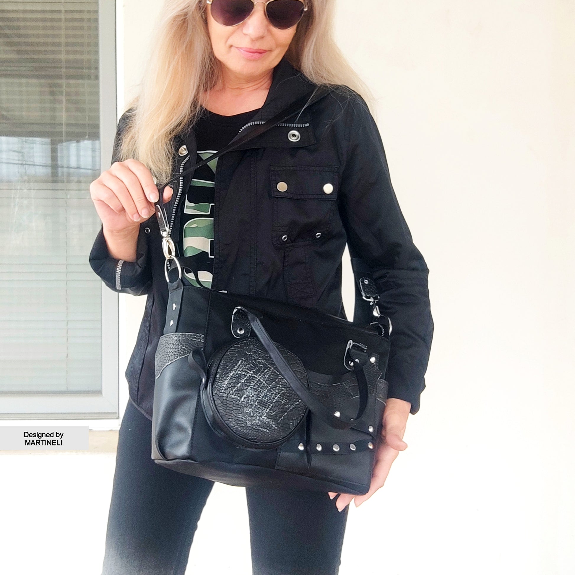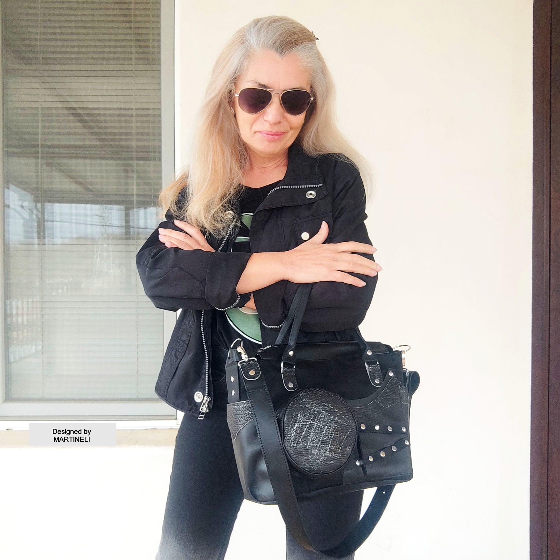 Black Leather Shoulder Bag Luxury Canvas Bag Gothic Style Grunge Bag
