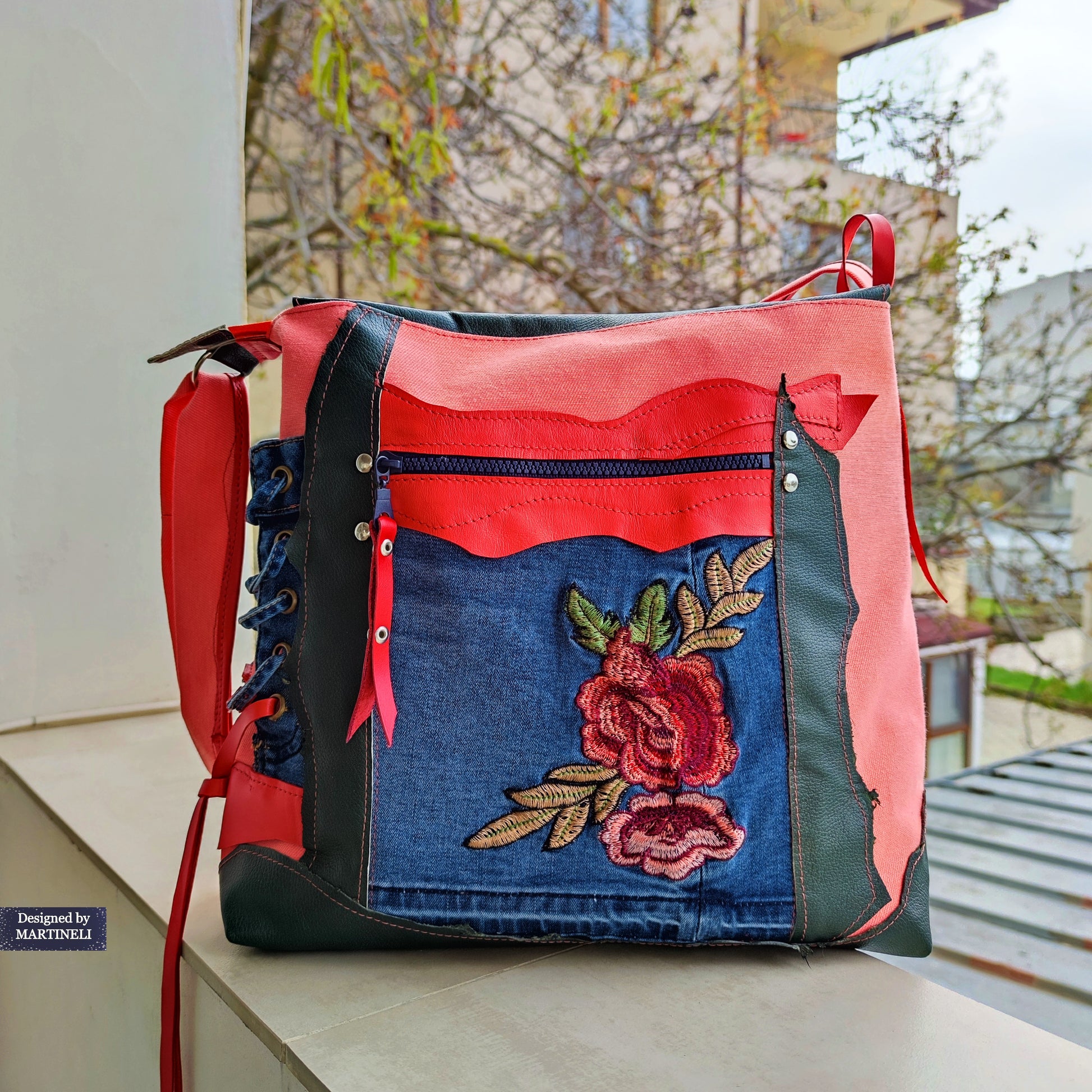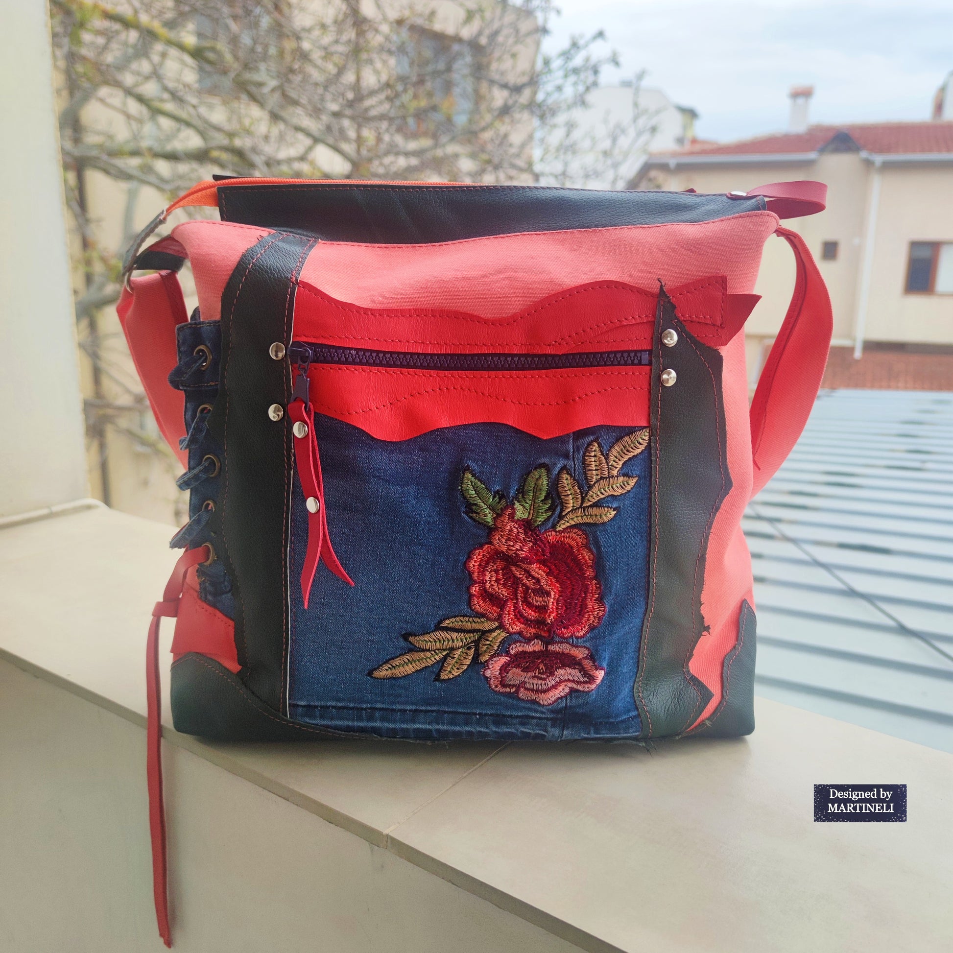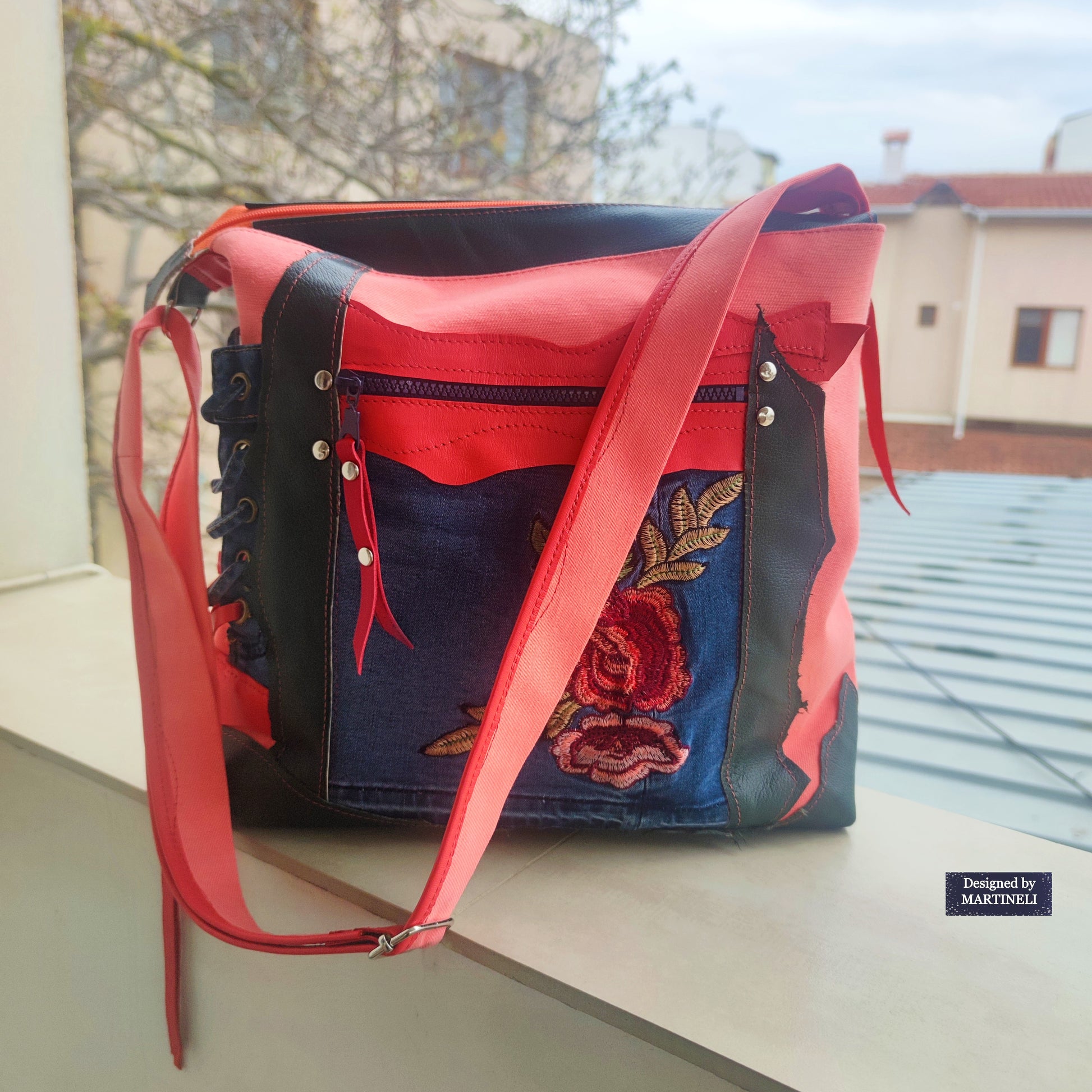I designed this Large Colorful Leather & Canvas Shoulder Bag.