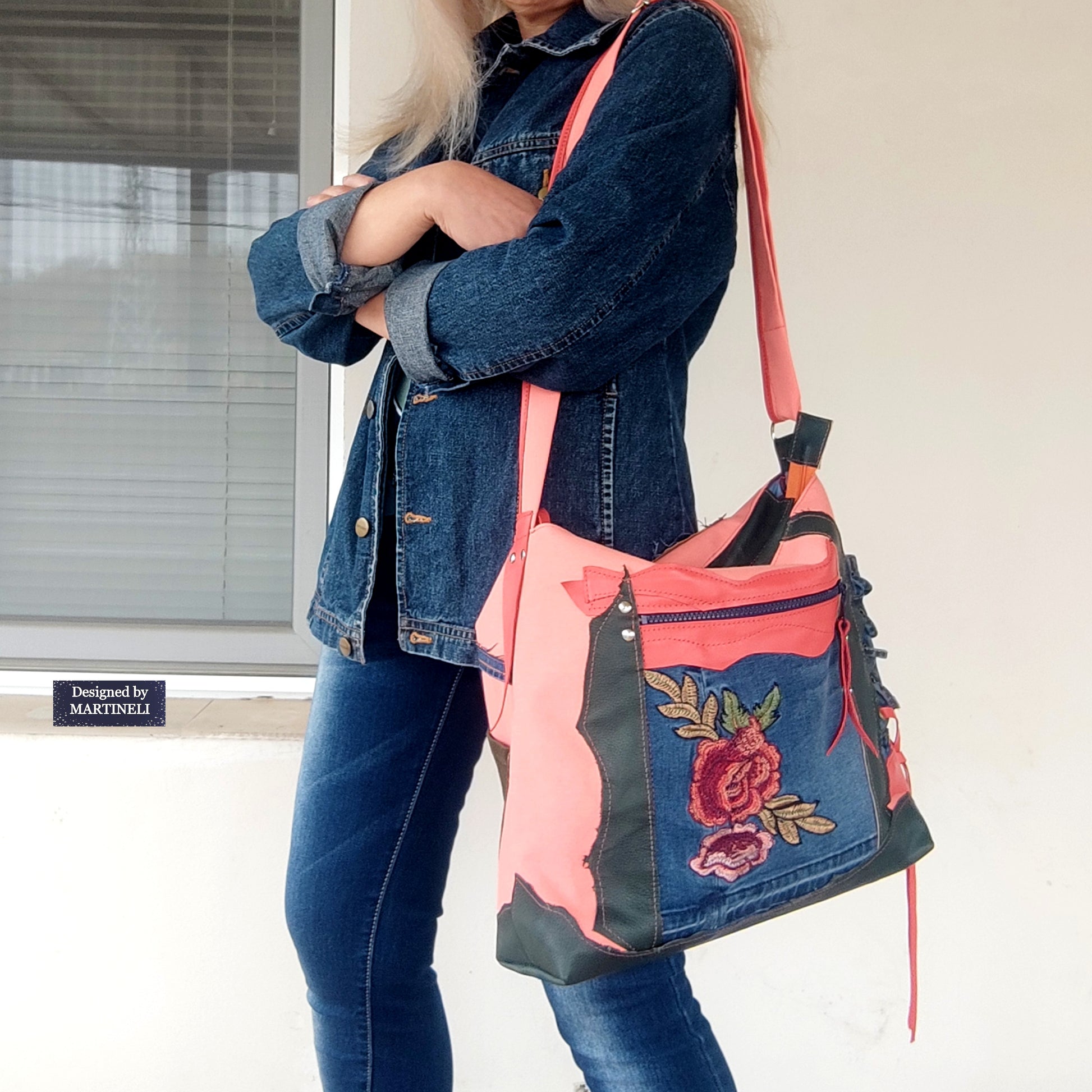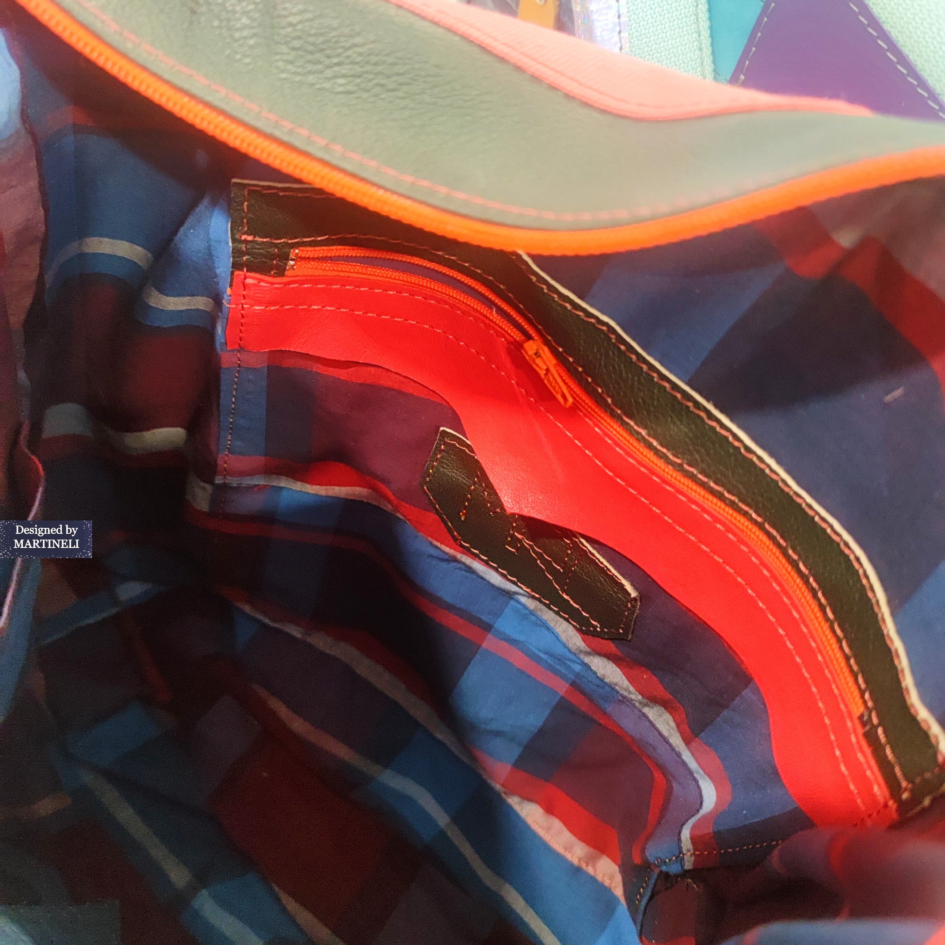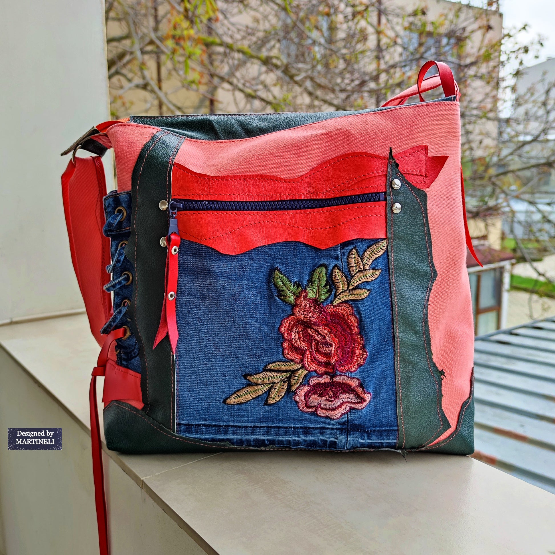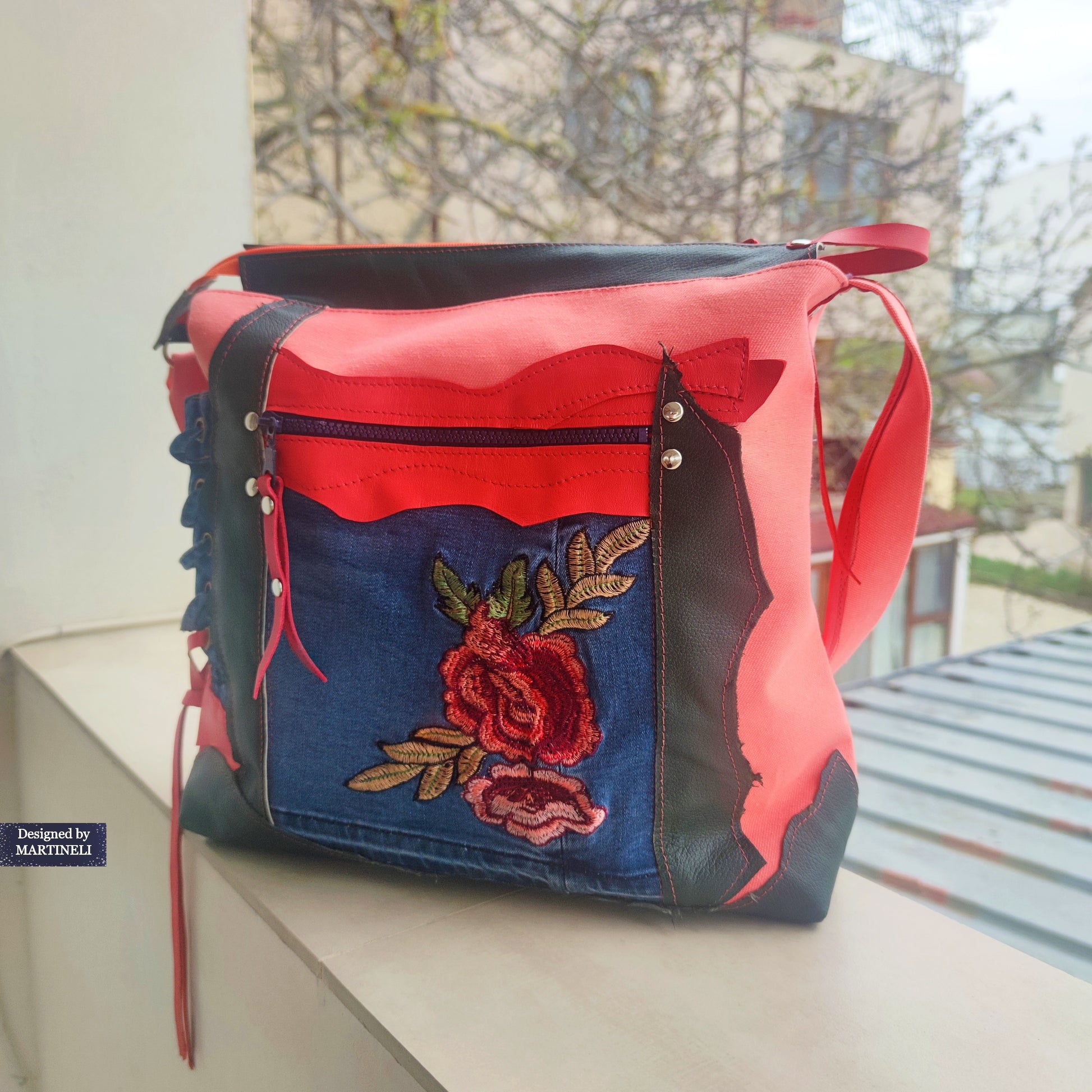 I designed this Large Colorful Leather & Canvas Shoulder Bag.