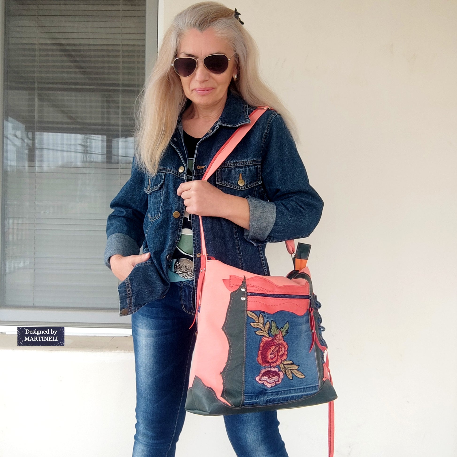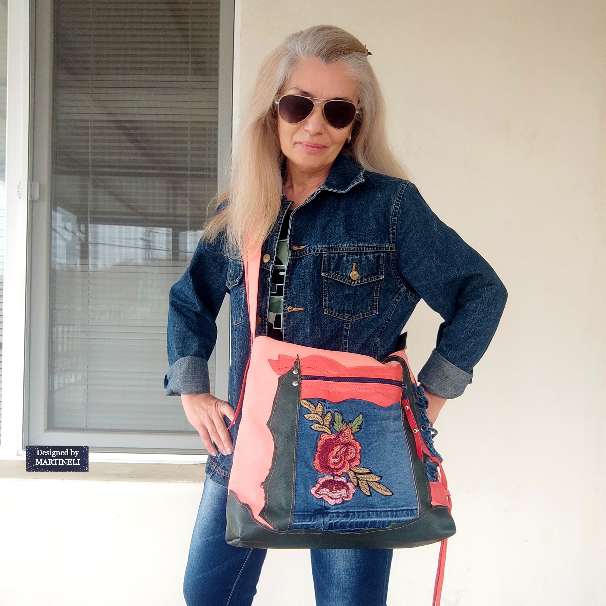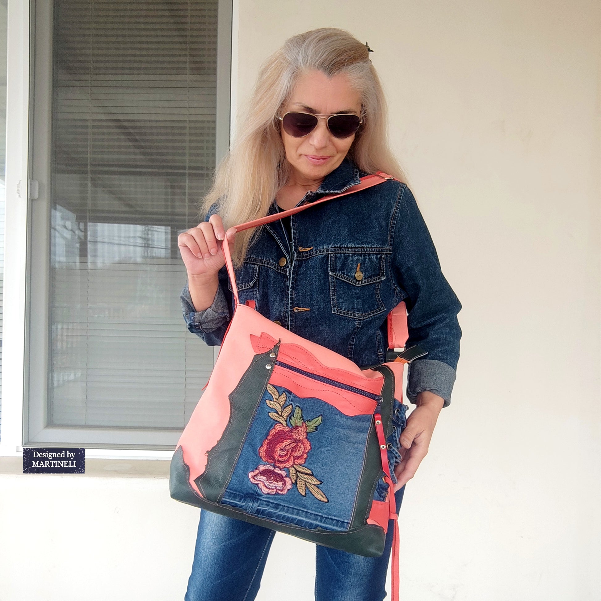 I used new genuine ITALIAN leather in CORAL PINK AND MOSS GREEN, CORAL PINK CANVAS, blue denim, plaid cotton for the lining.