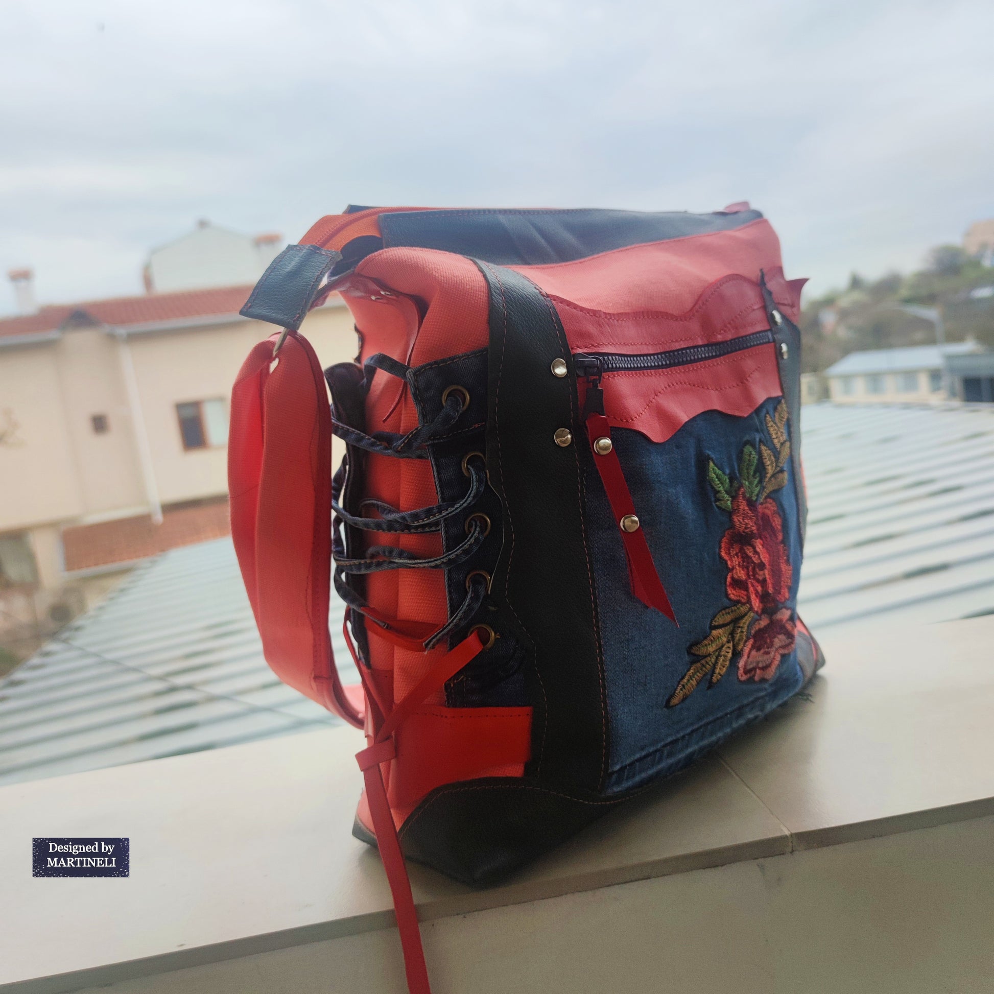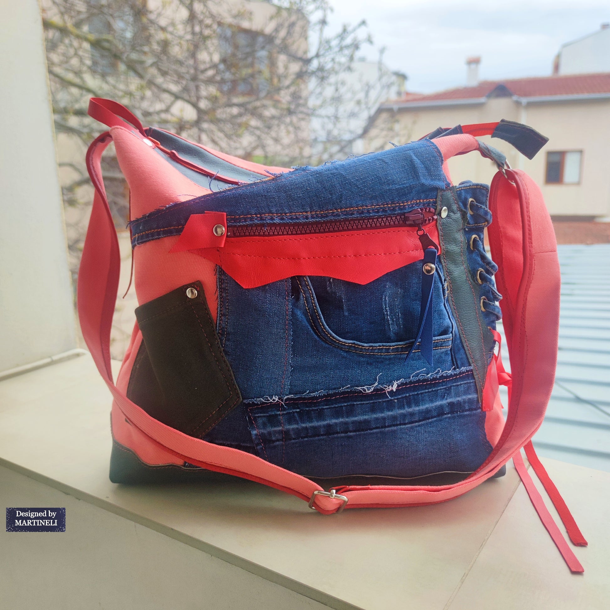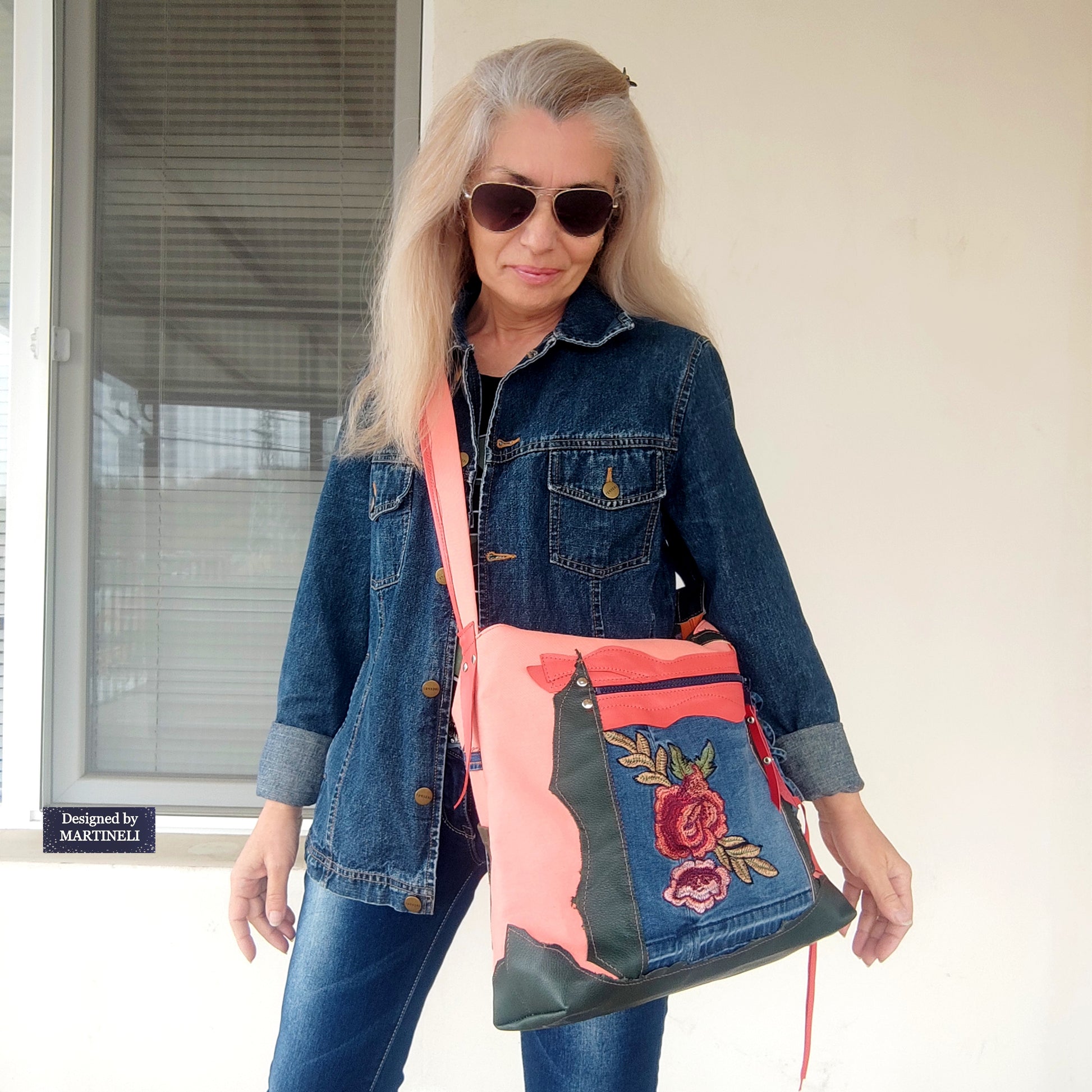 I used new genuine ITALIAN leather in CORAL PINK AND MOSS GREEN, CORAL PINK CANVAS, blue denim, plaid cotton for the lining.