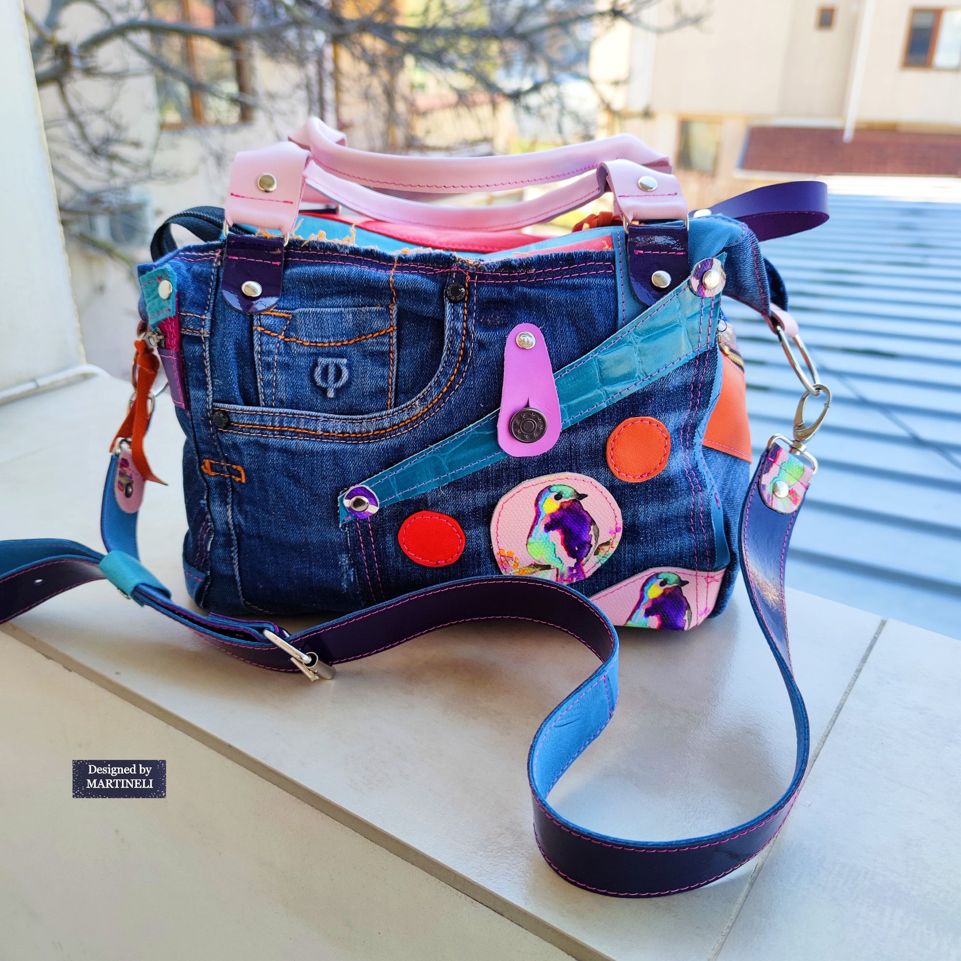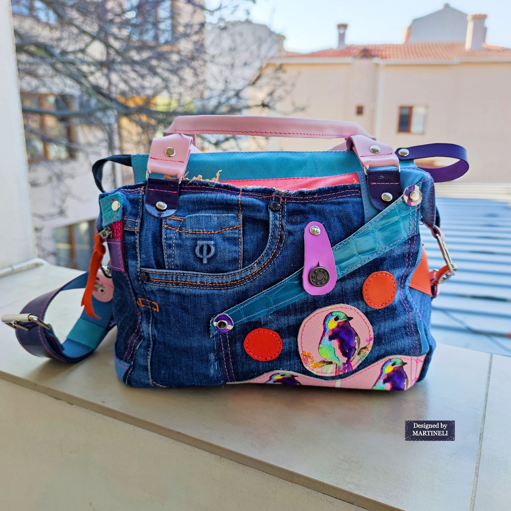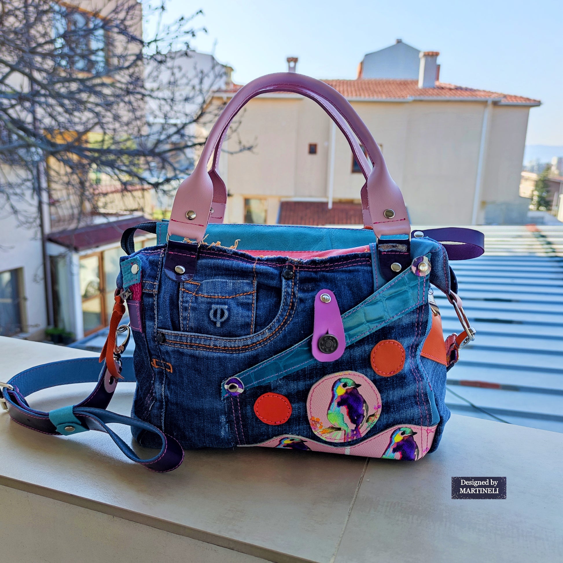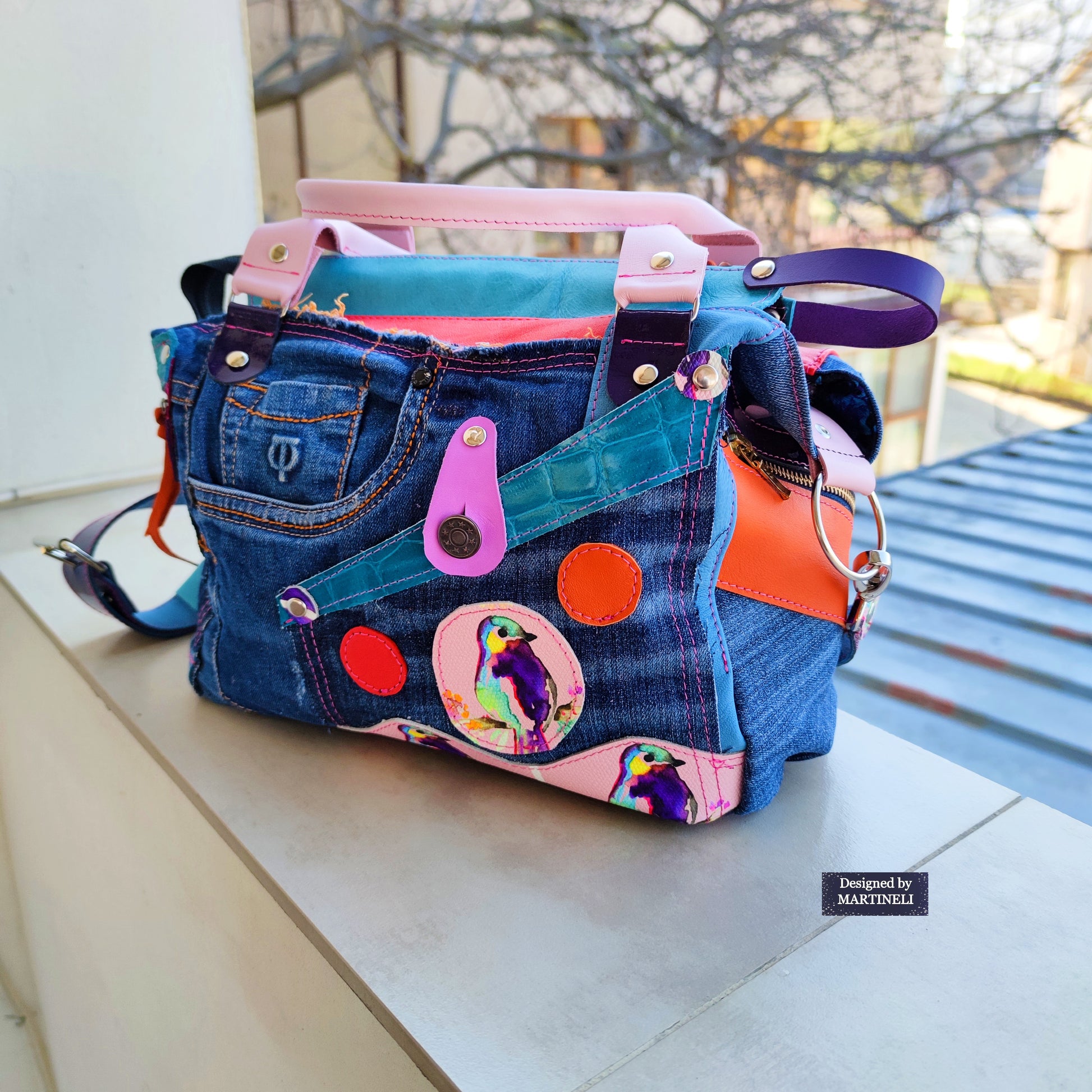 I used blue denim, Genuine Italian Leather in pink,blue,turquoise,purple,orange,cute birds patches,abstract print cotton for the lining.