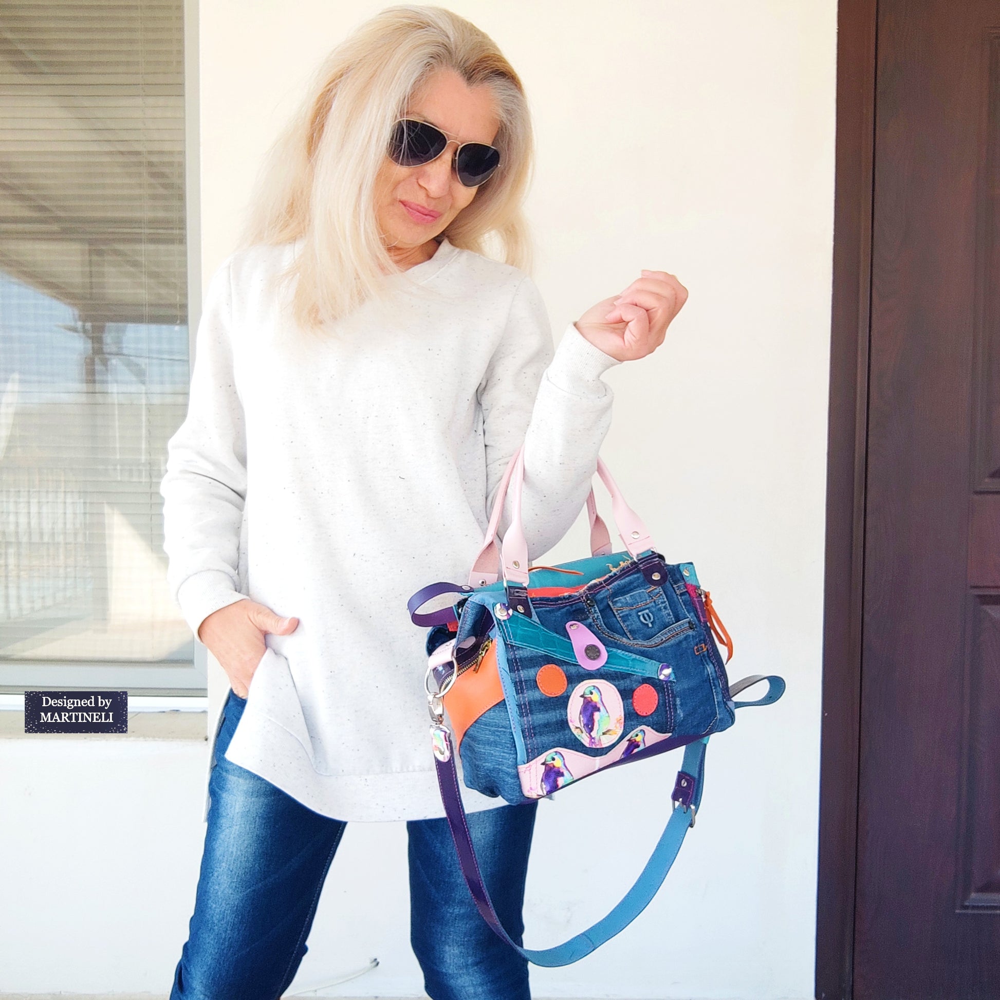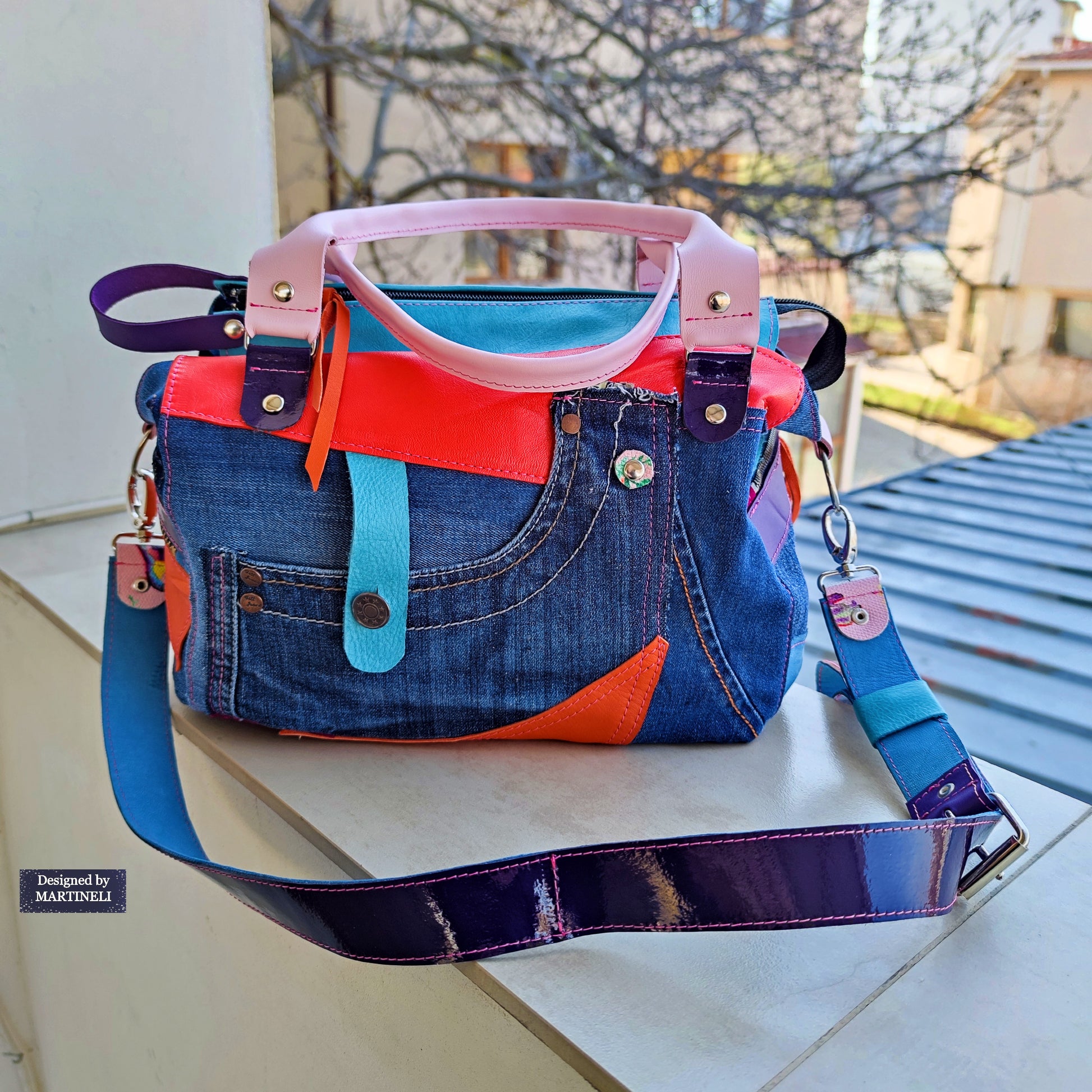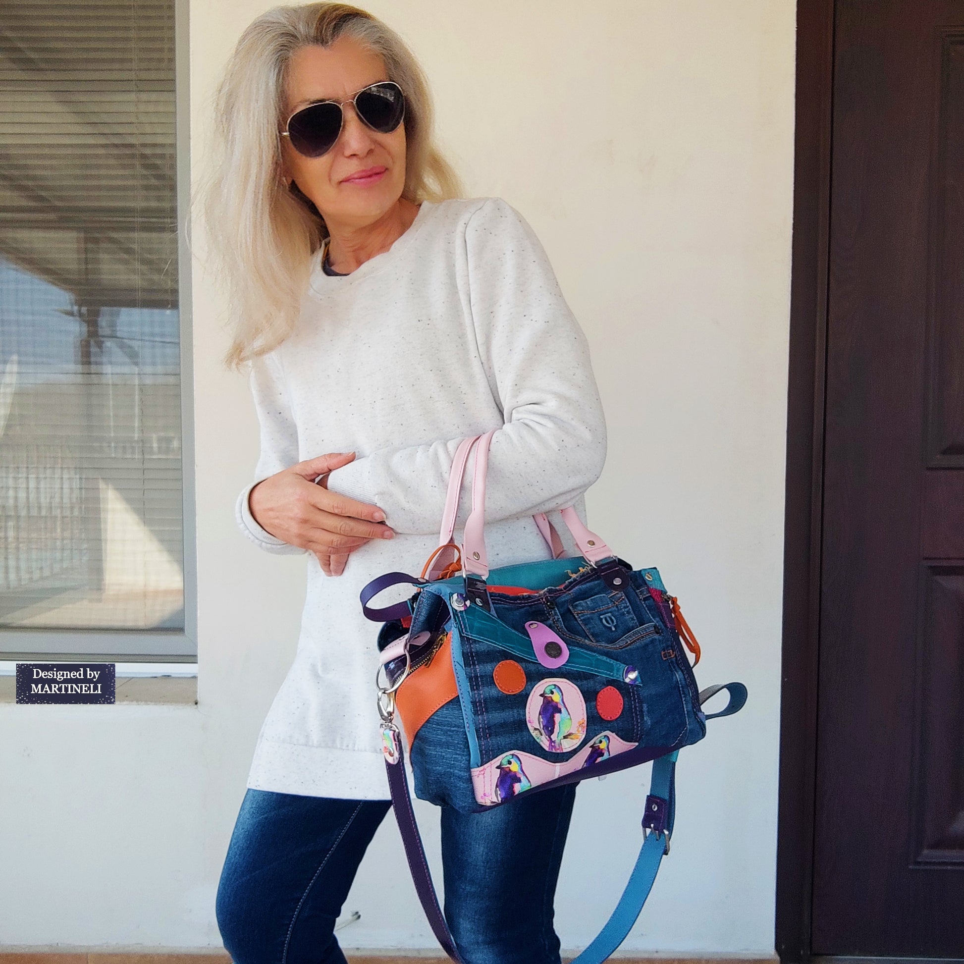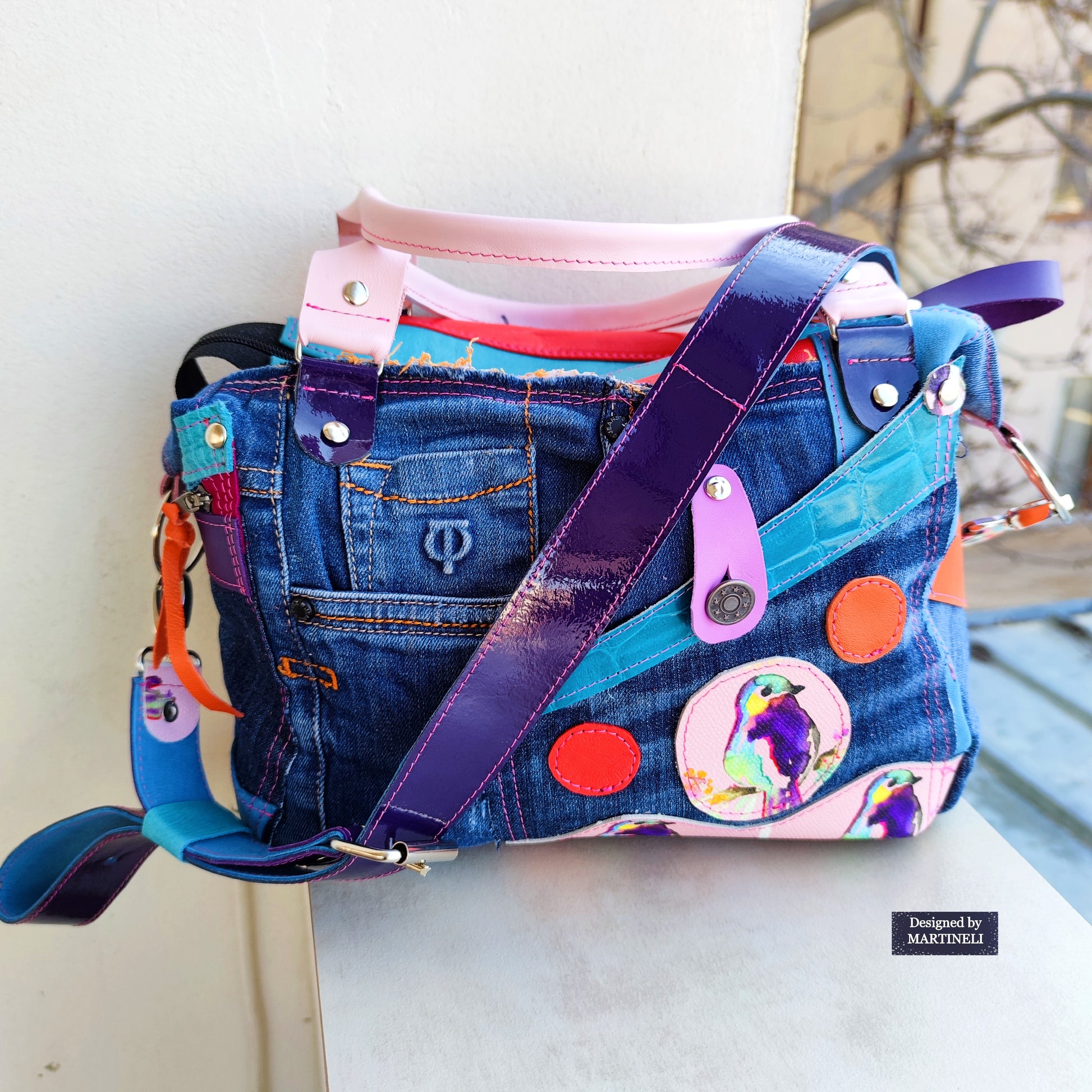 I used blue denim, Genuine Italian Leather in pink,blue,turquoise,purple,orange,cute birds patches,abstract print cotton for the lining.
