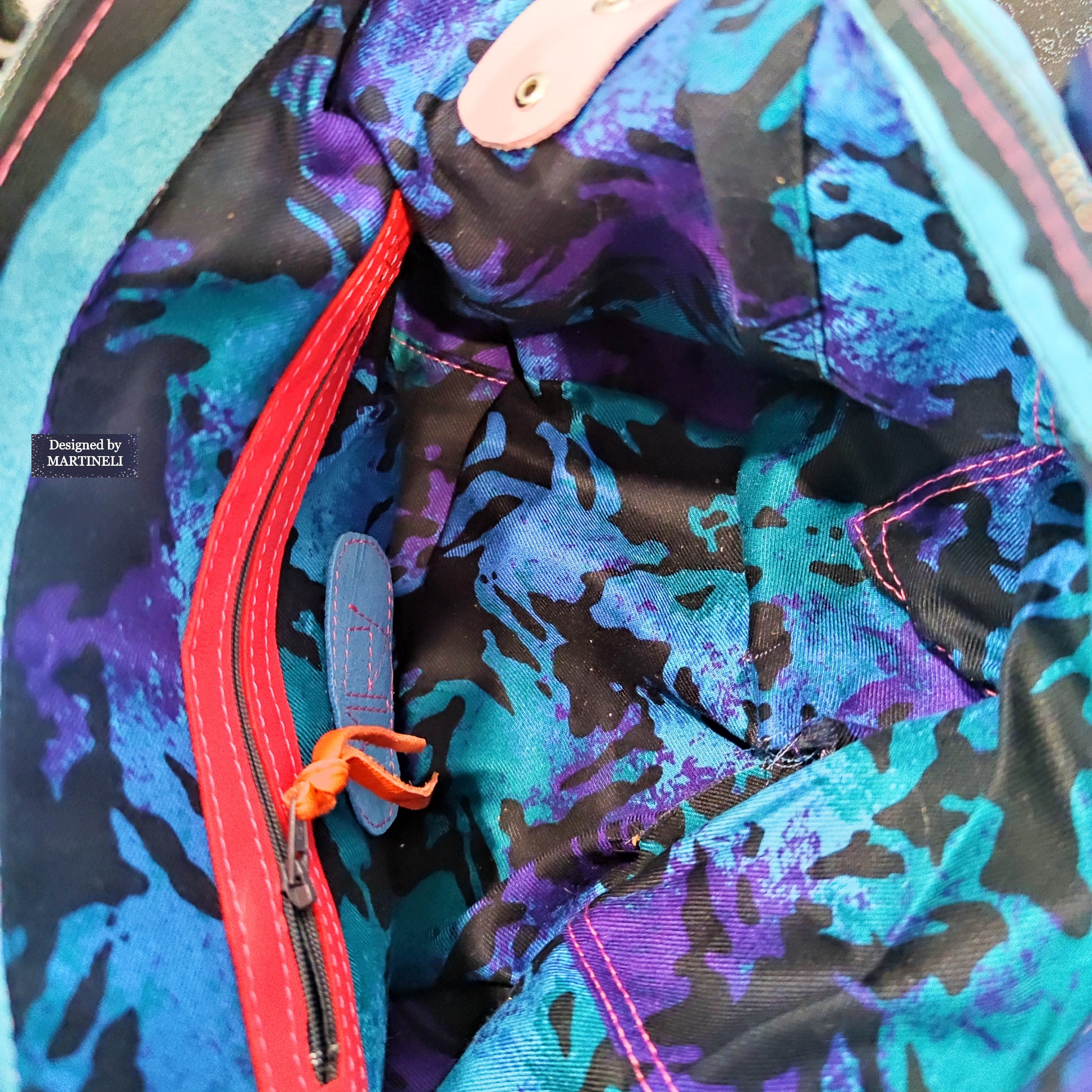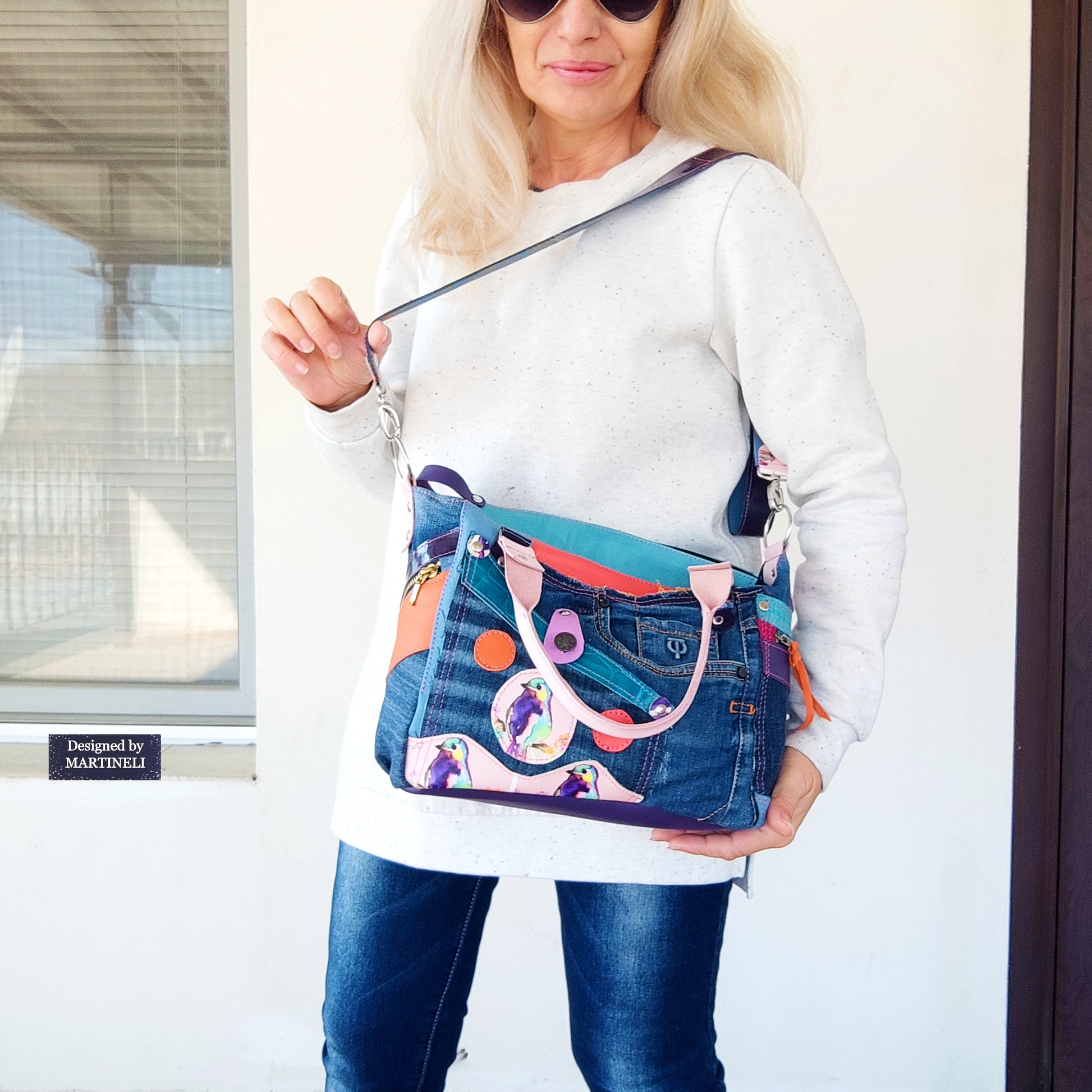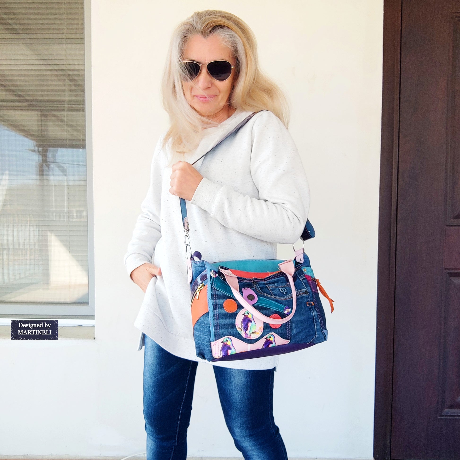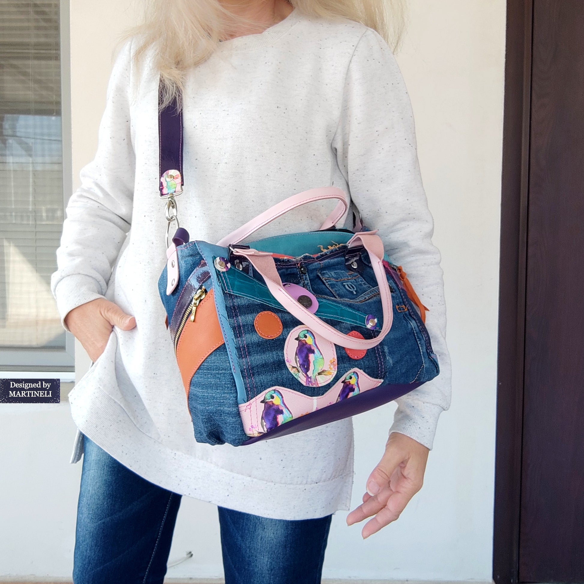 I used blue denim, Genuine Italian Leather in pink,blue,turquoise,purple,orange,cute birds patches,abstract print cotton for the lining.