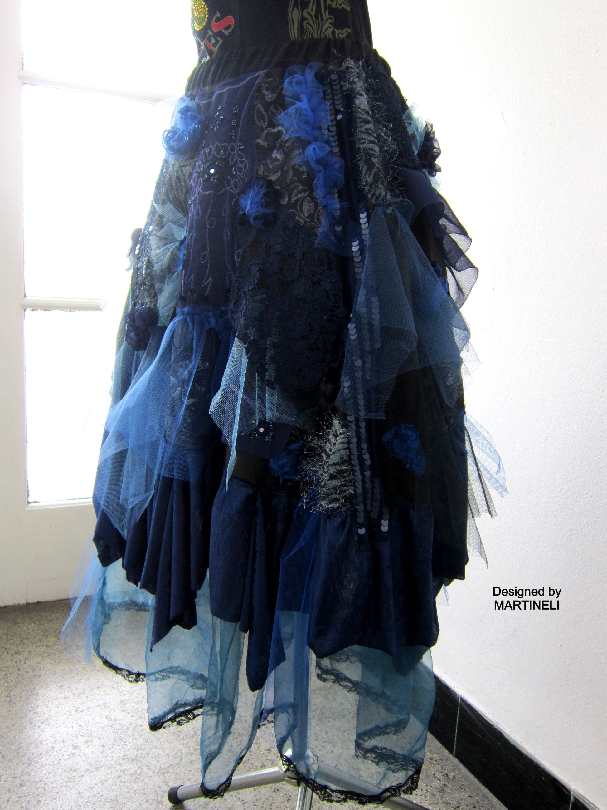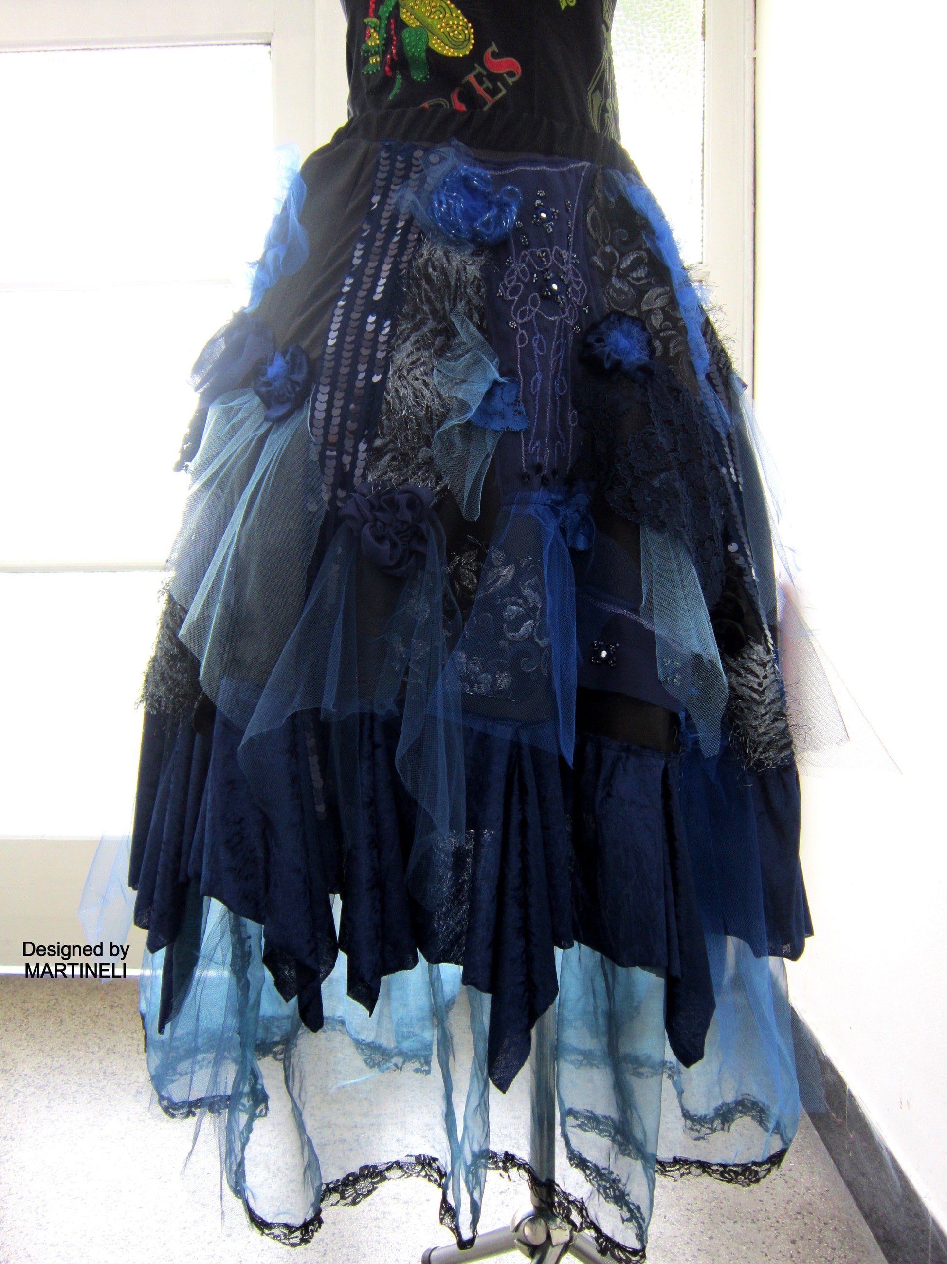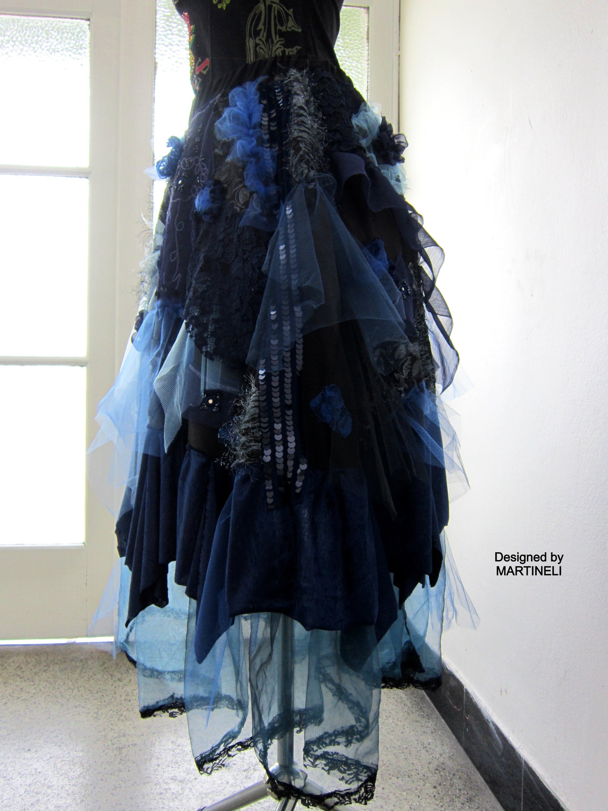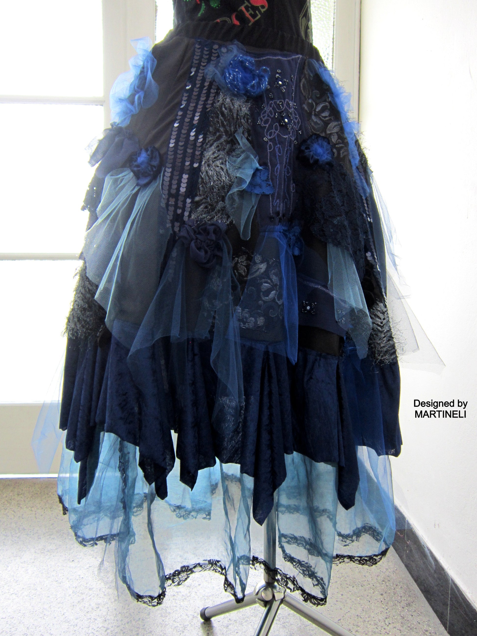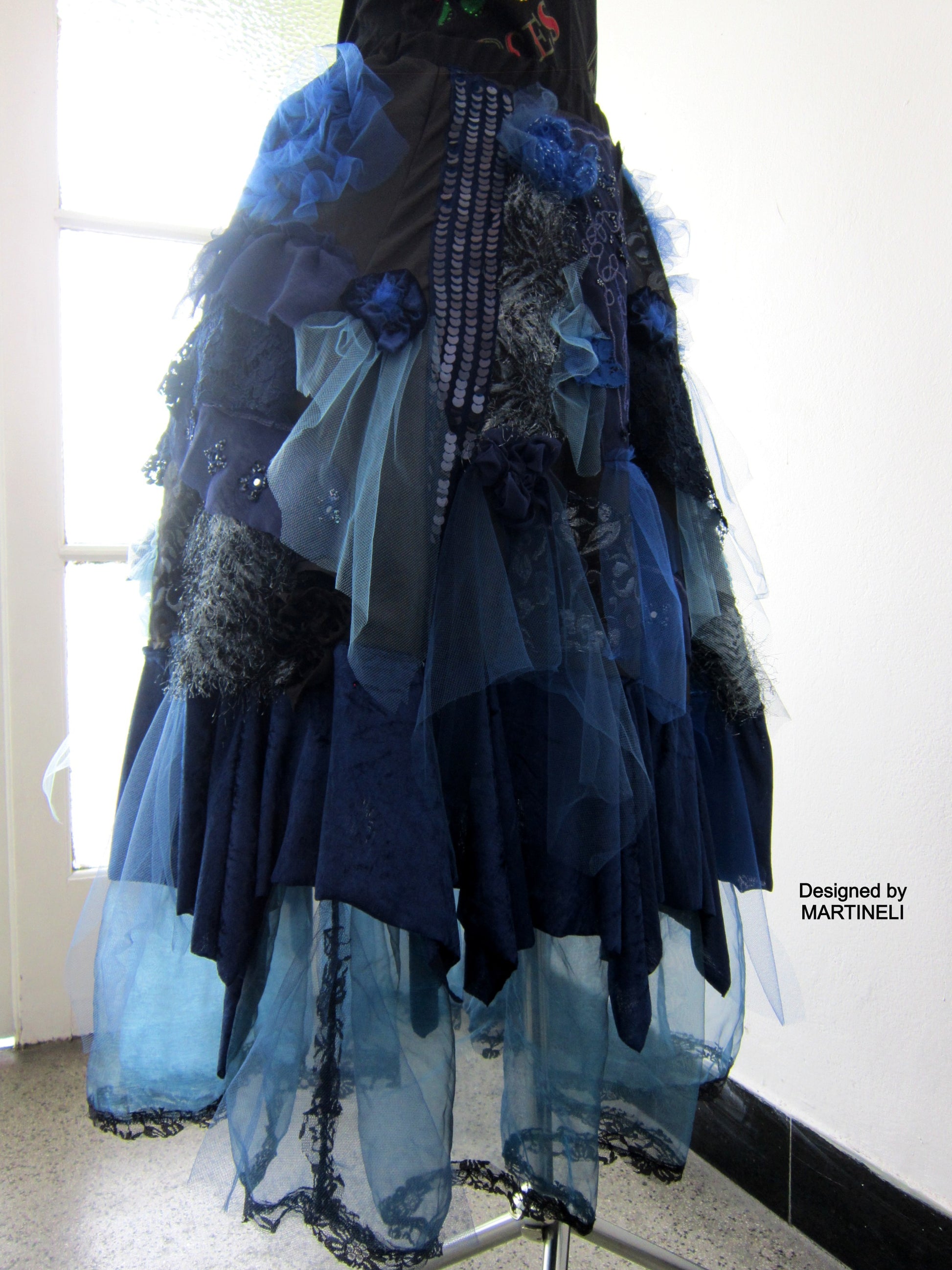 I used black taffeta silk , dark blue velvet,tulle,lace,tapestry,dark blue sequins fabric and handmade flower embellishments. There is a bead embroidery, made of Preciosa glass beads.