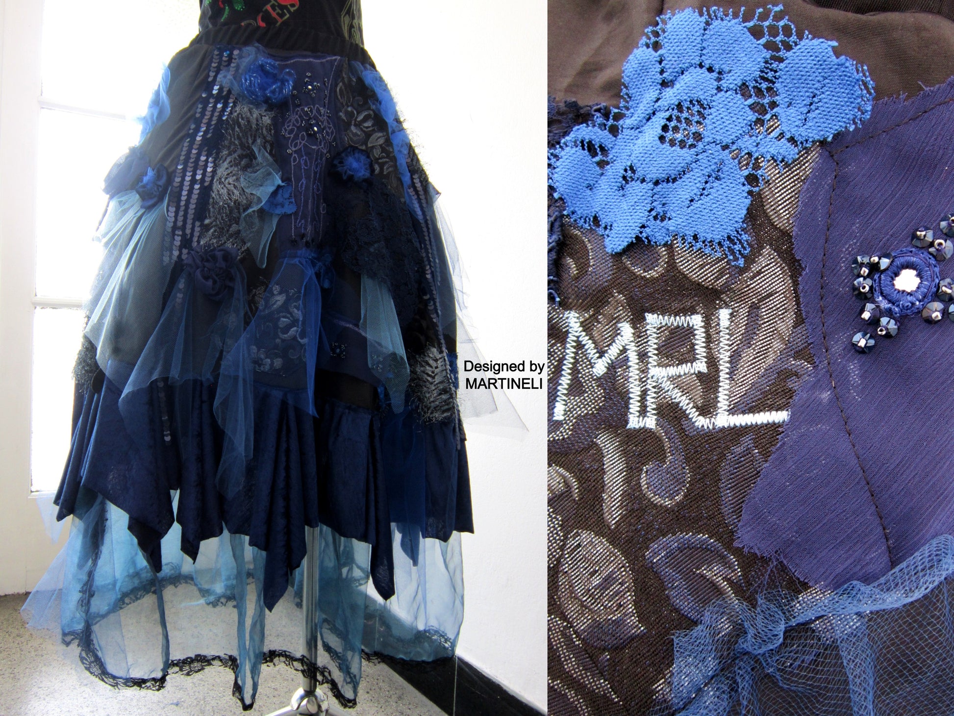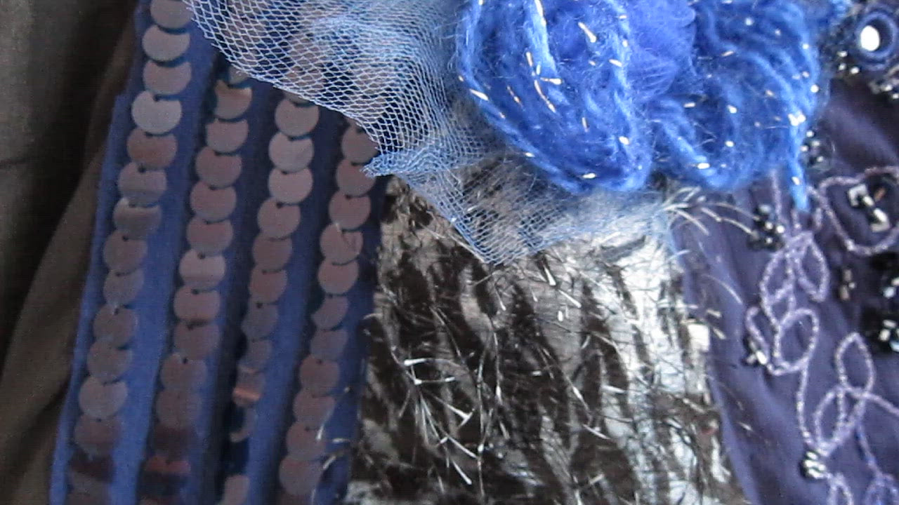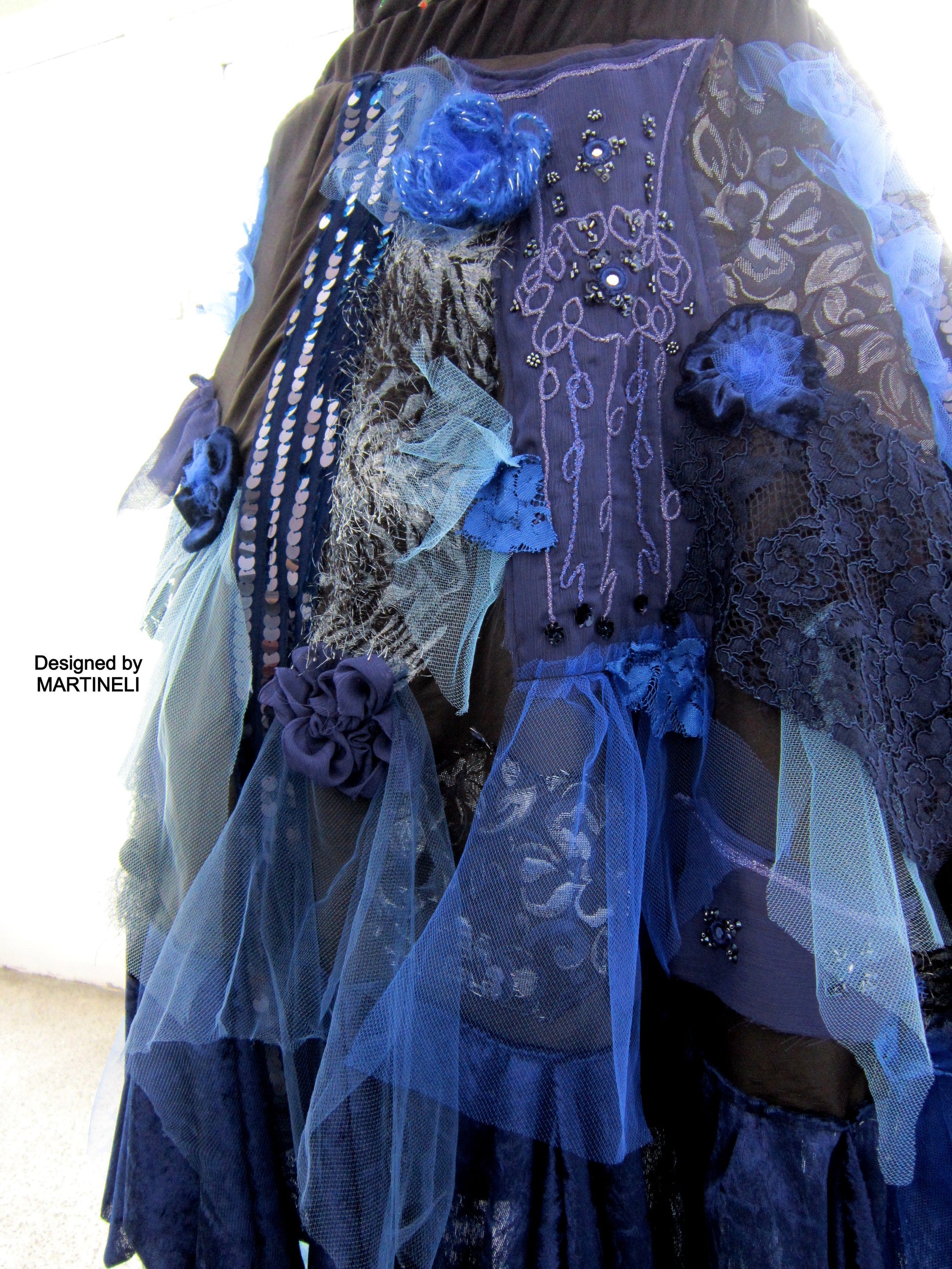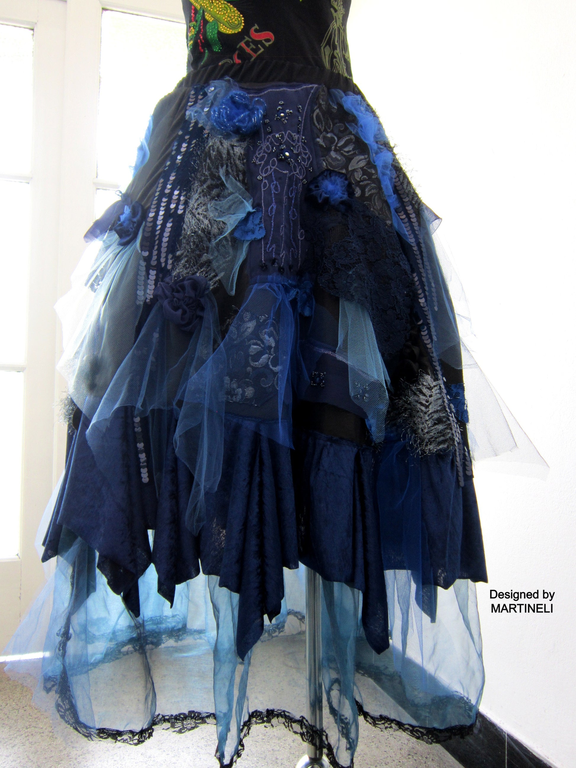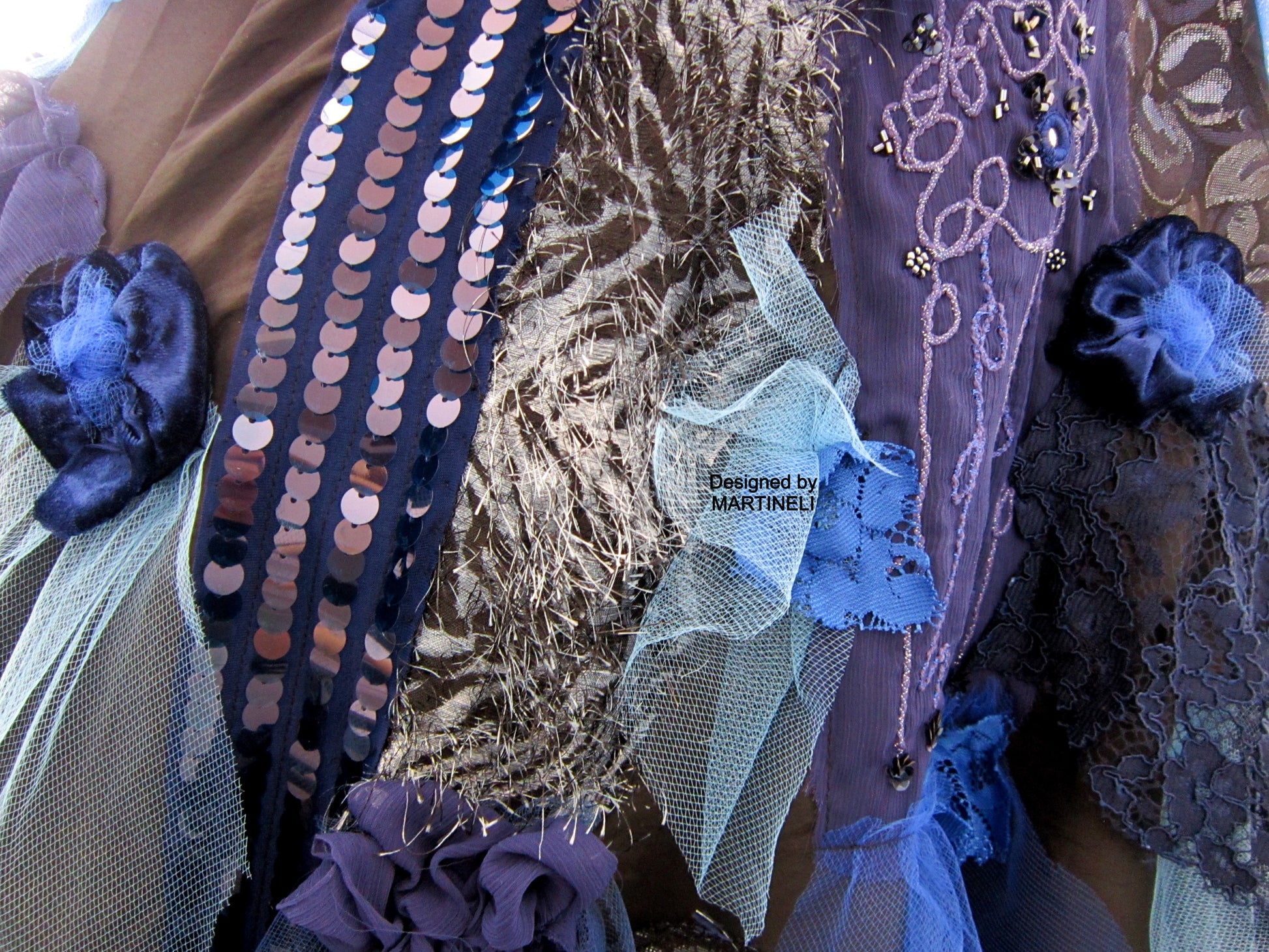 I used black taffeta silk , dark blue velvet,tulle,lace,tapestry,dark blue sequins fabric and handmade flower embellishments. There is a bead embroidery, made of Preciosa glass beads.