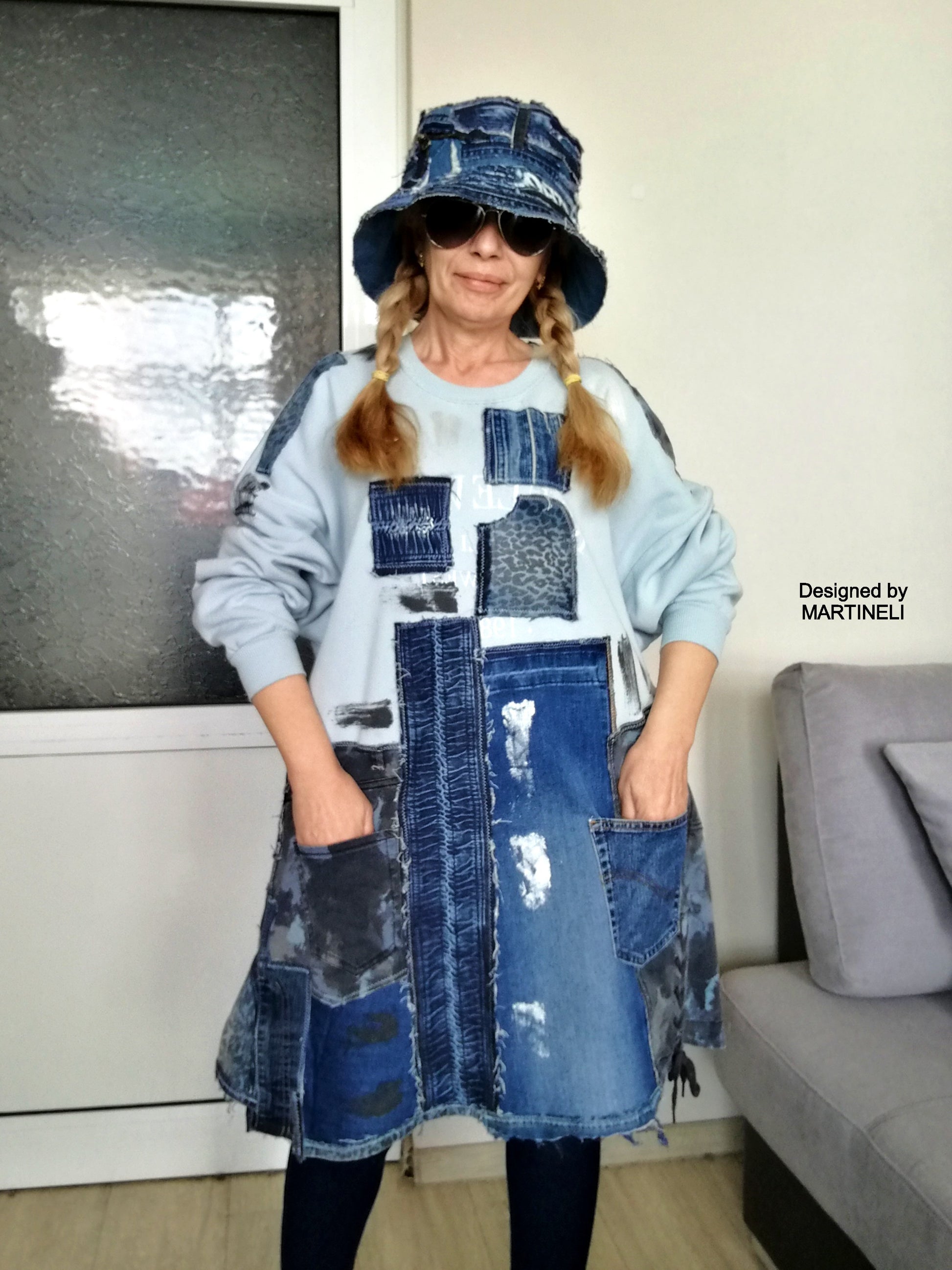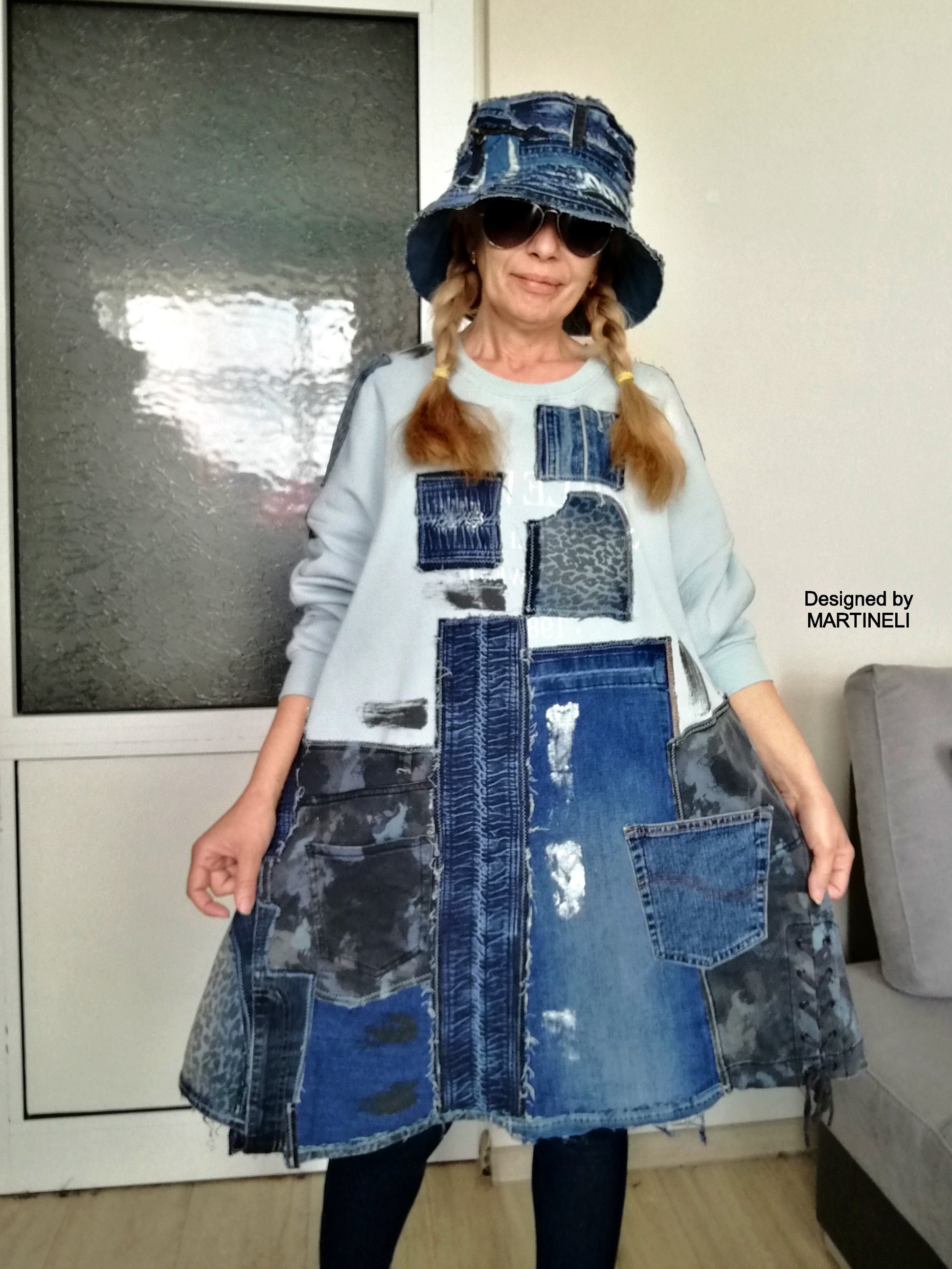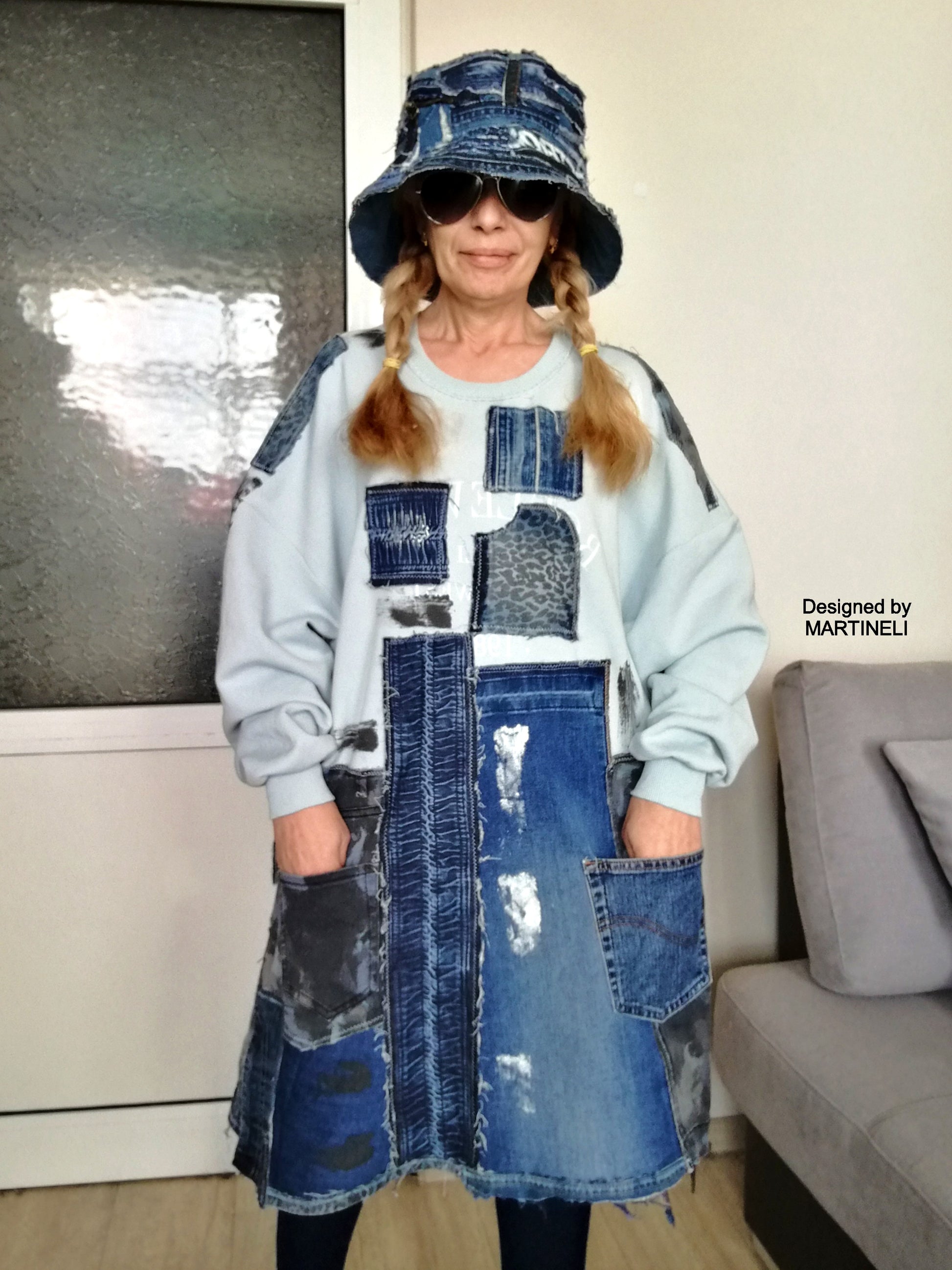 I designed and made this 2XL patchwork blue sweatshirt dress.