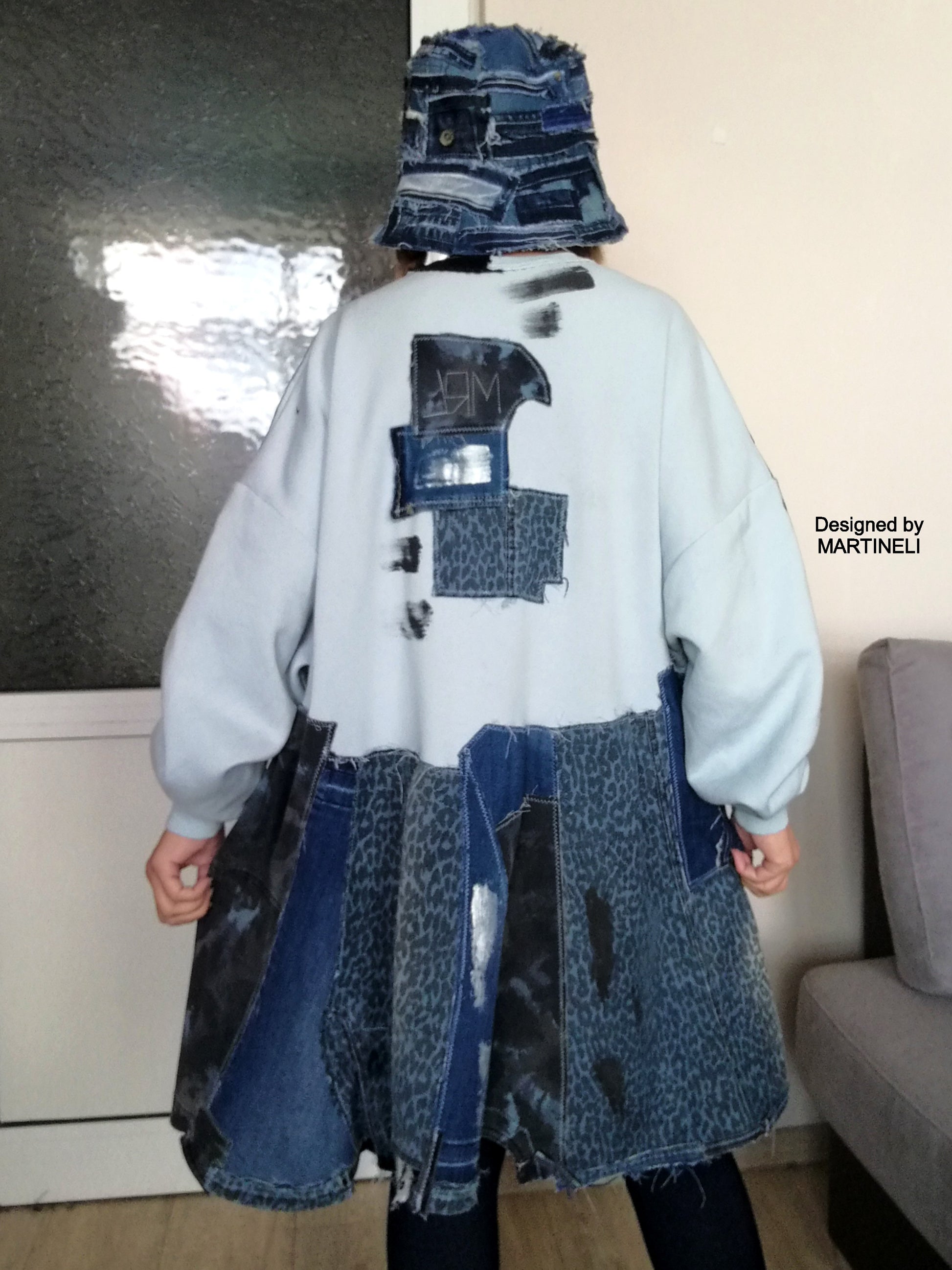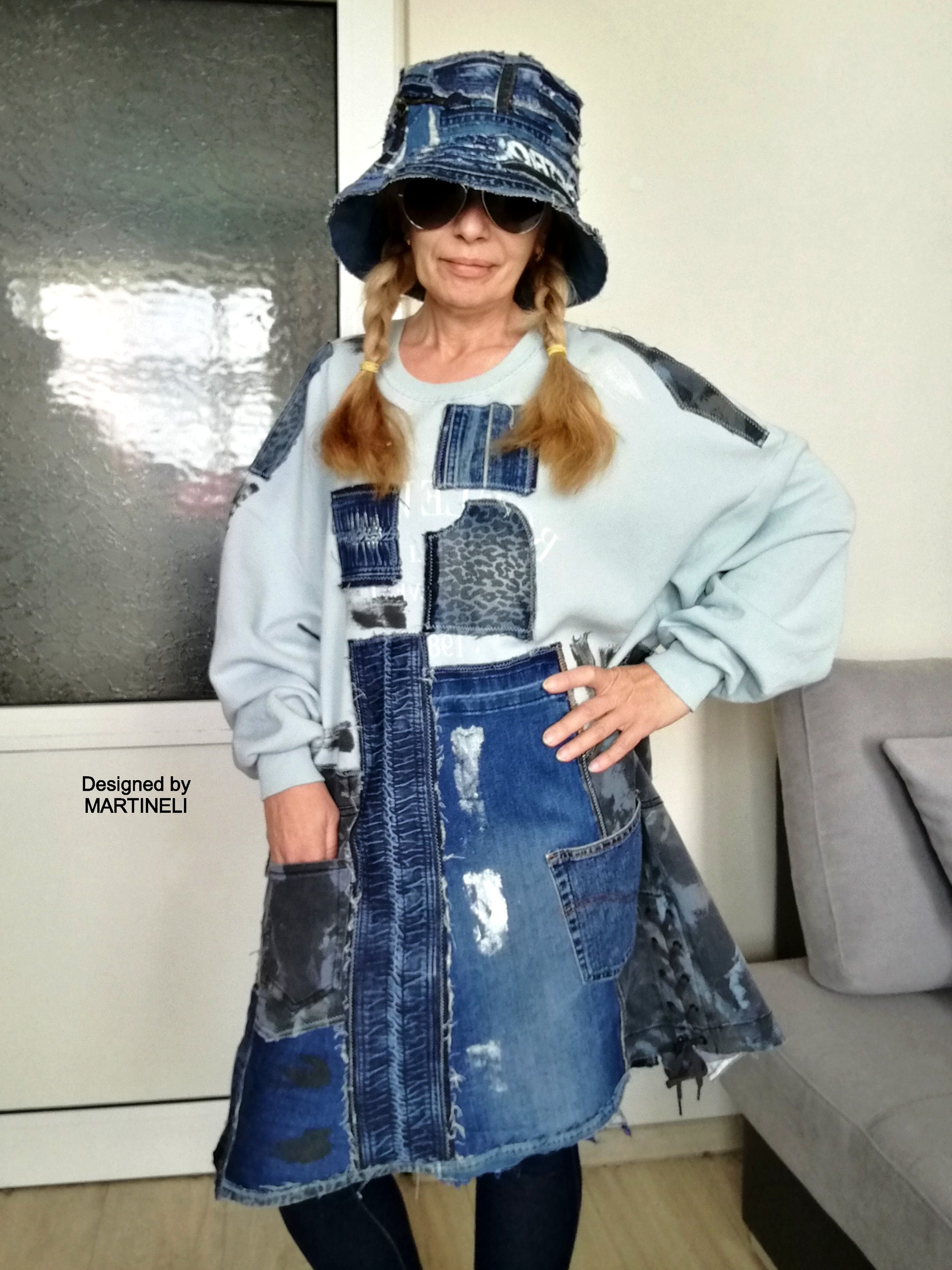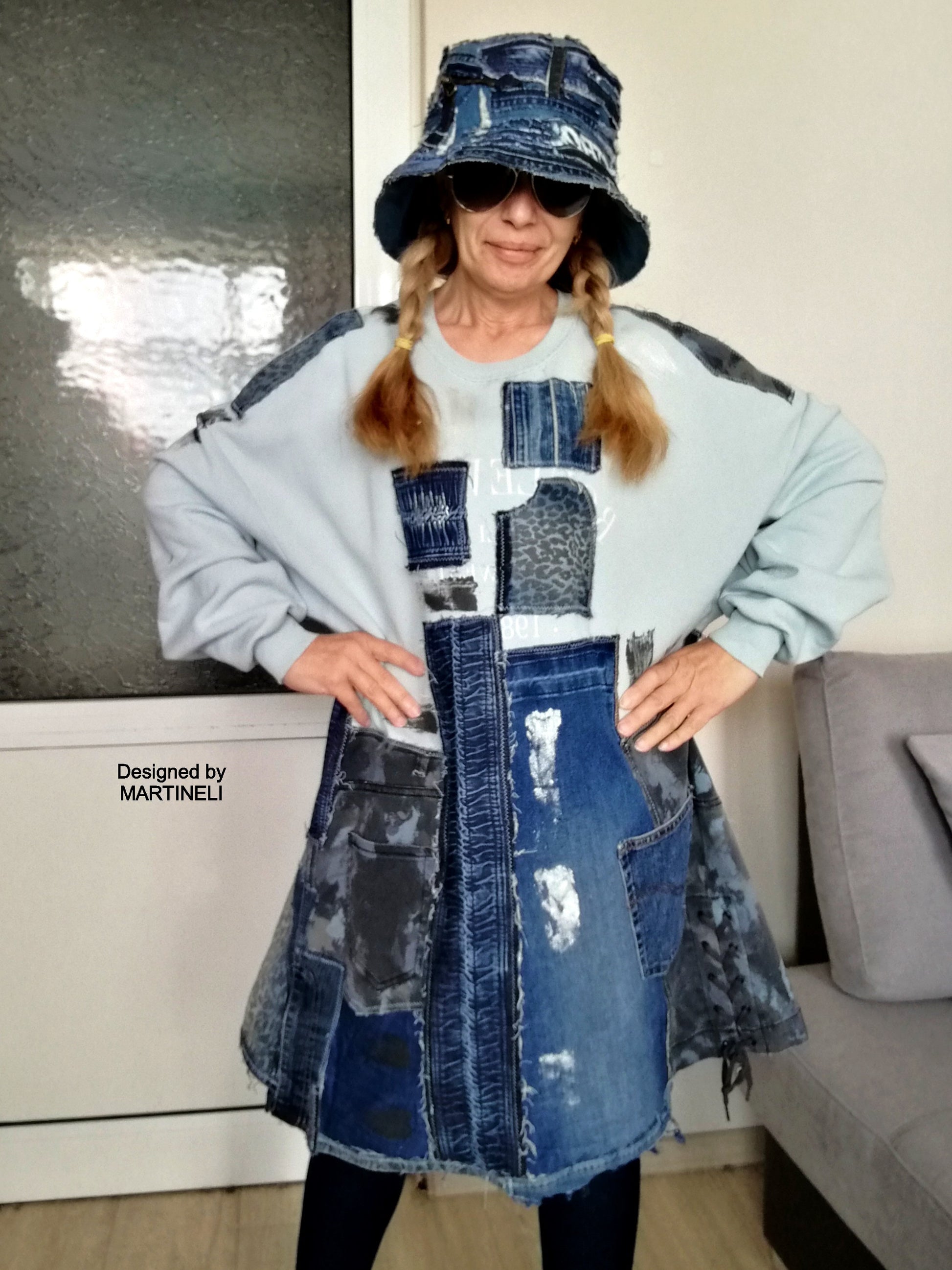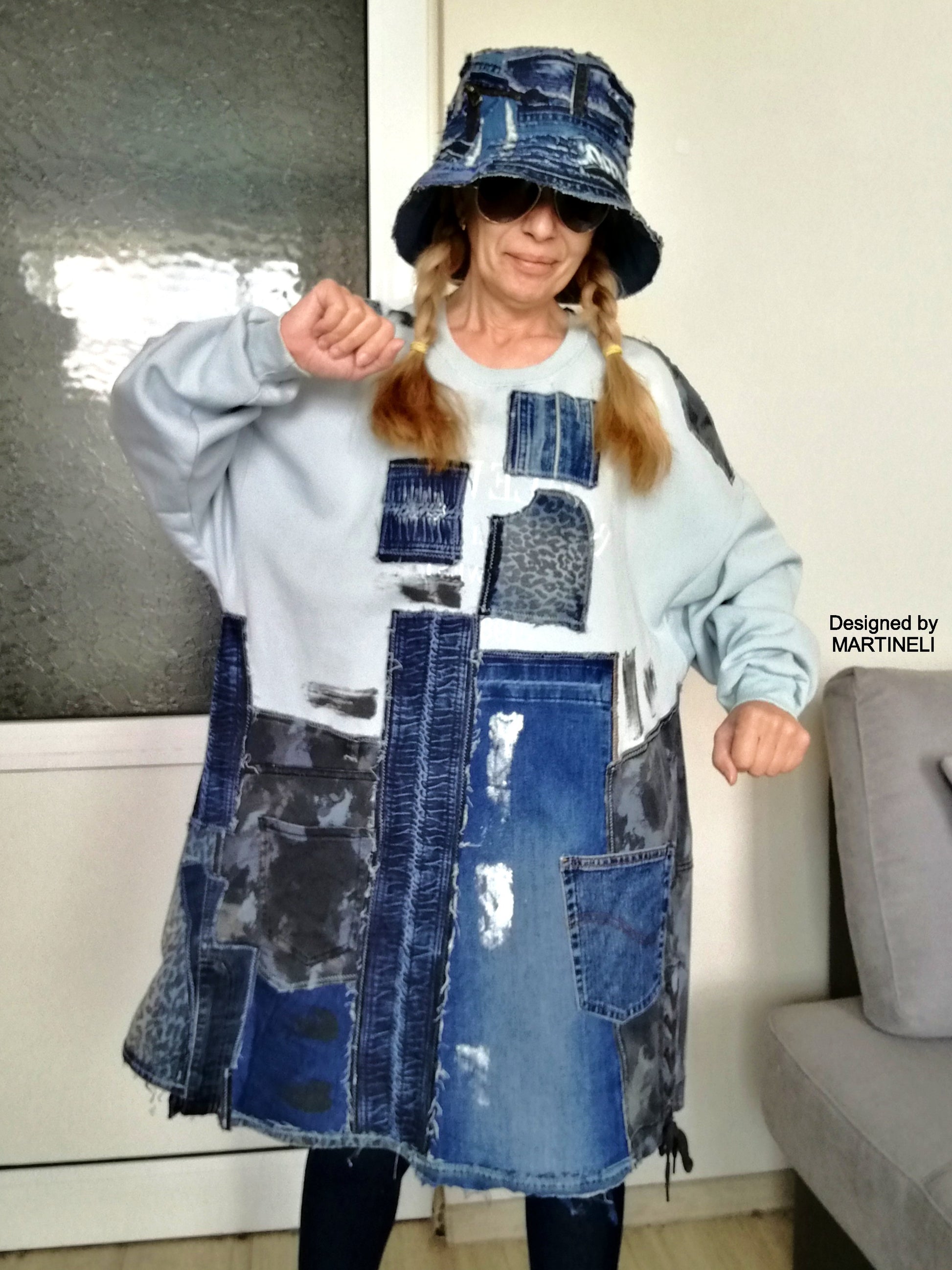 I designed and made this 2XL patchwork blue sweatshirt dress.