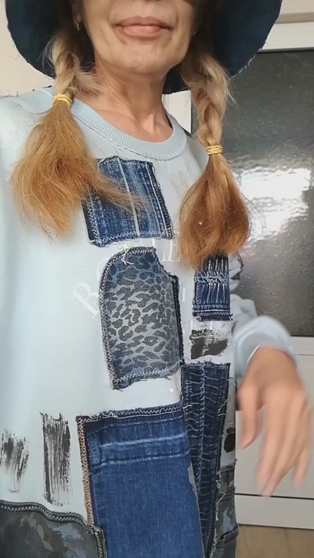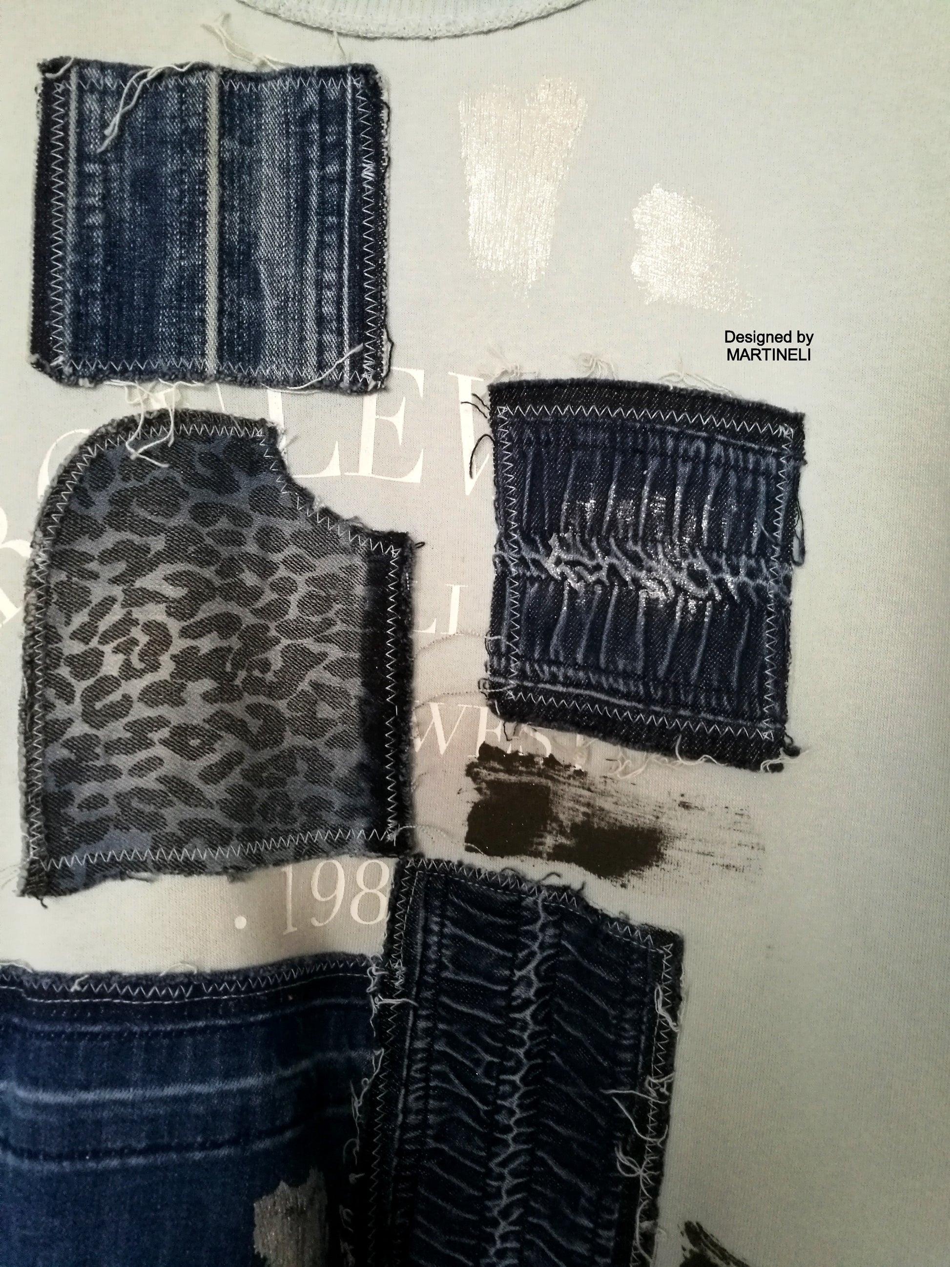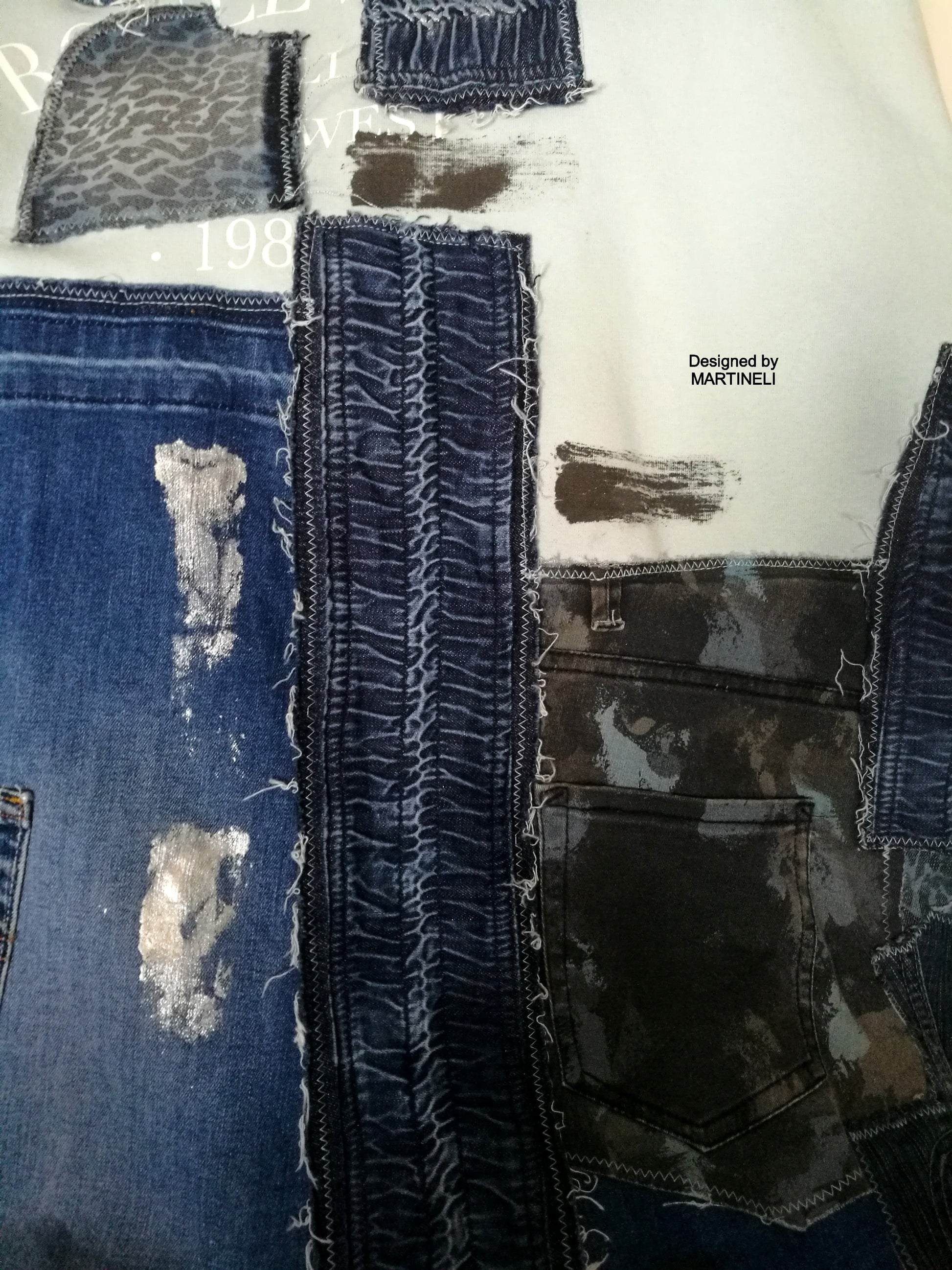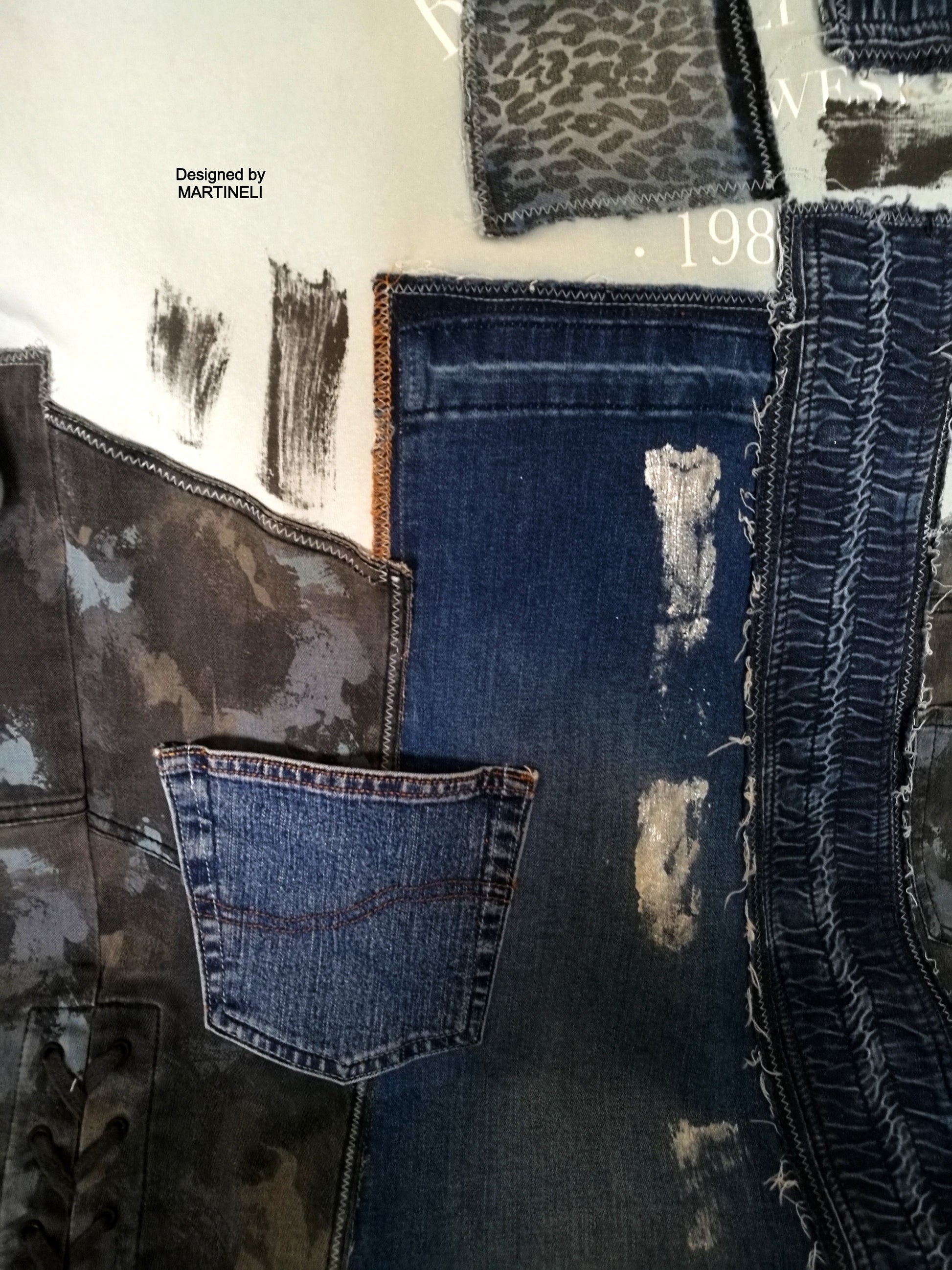 I used very soft light blue fleece cotton,different blue denim patches, animal print denim, BLACK and SILVER WHITE fabric paint.