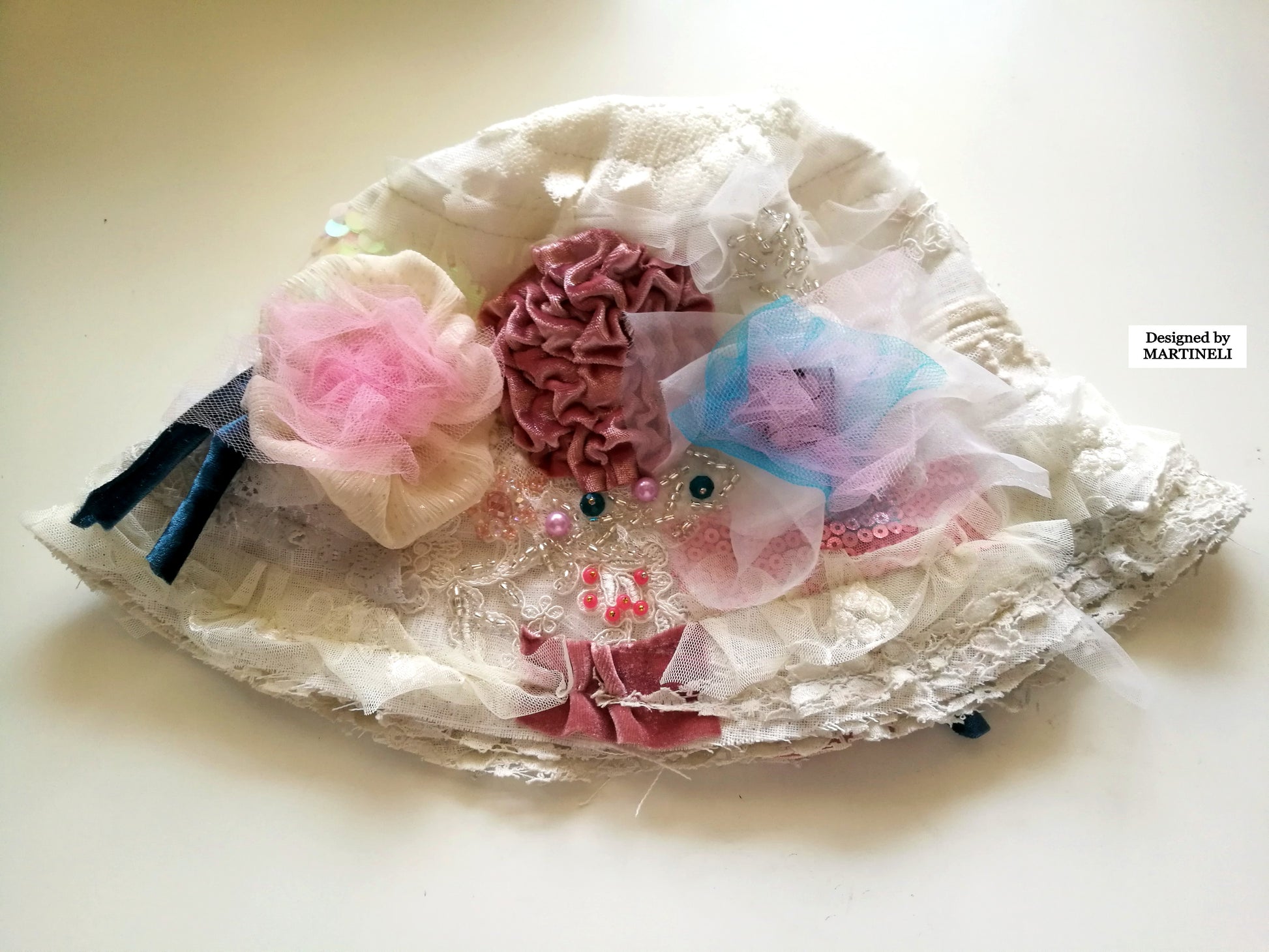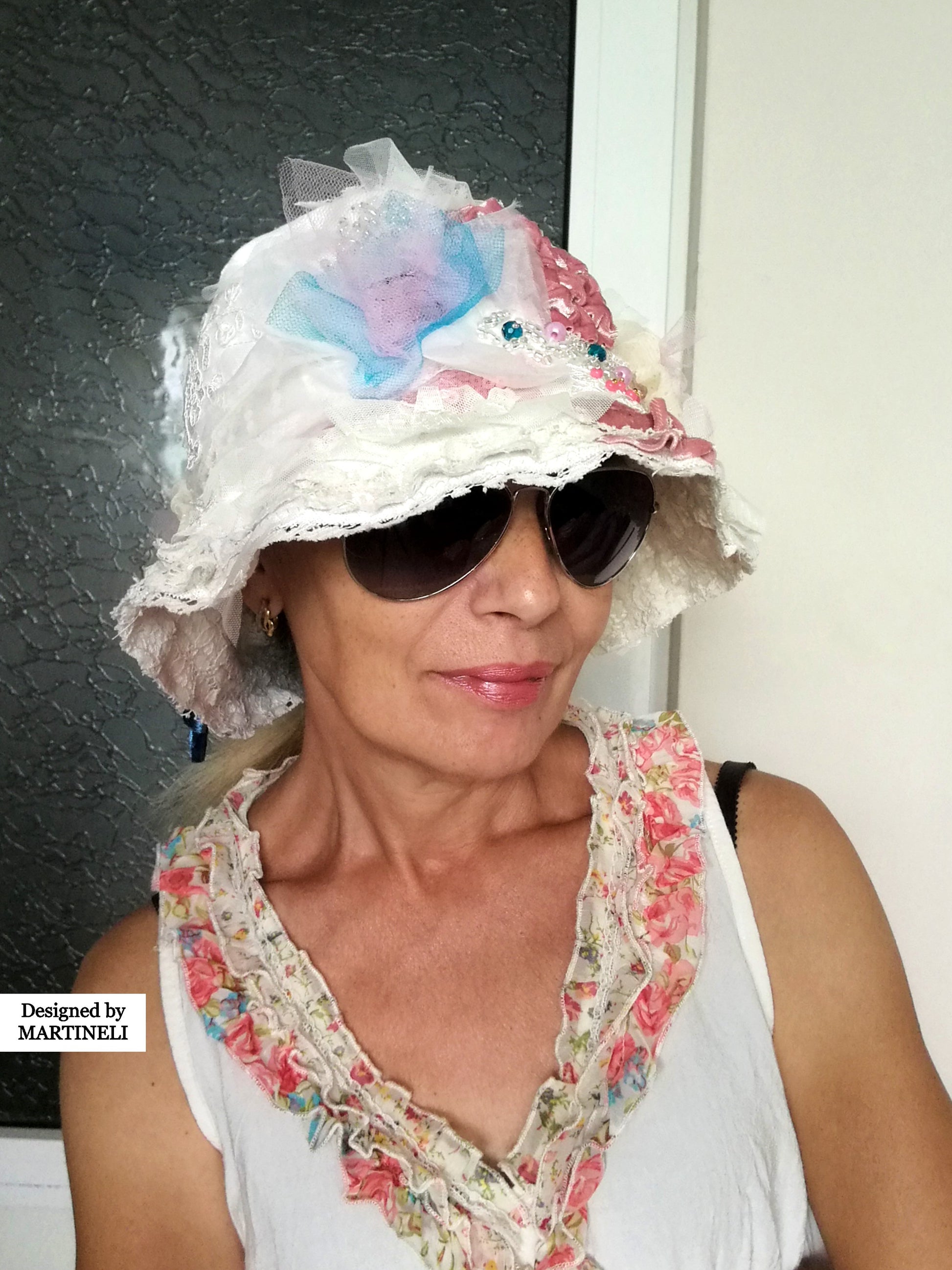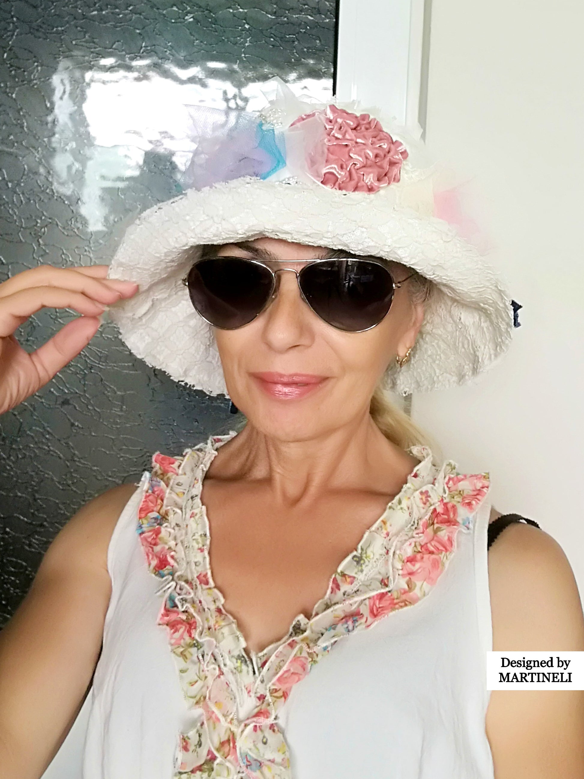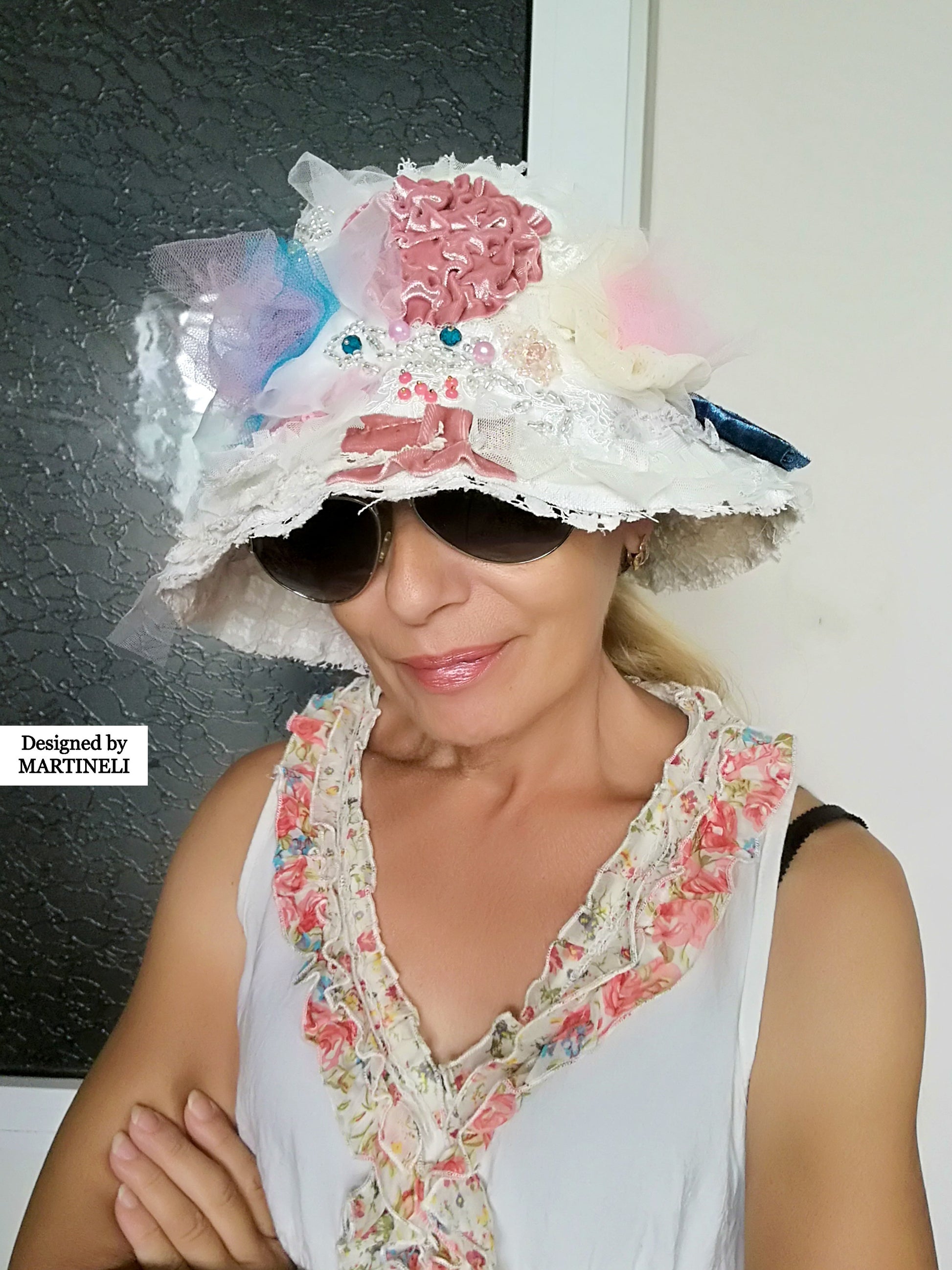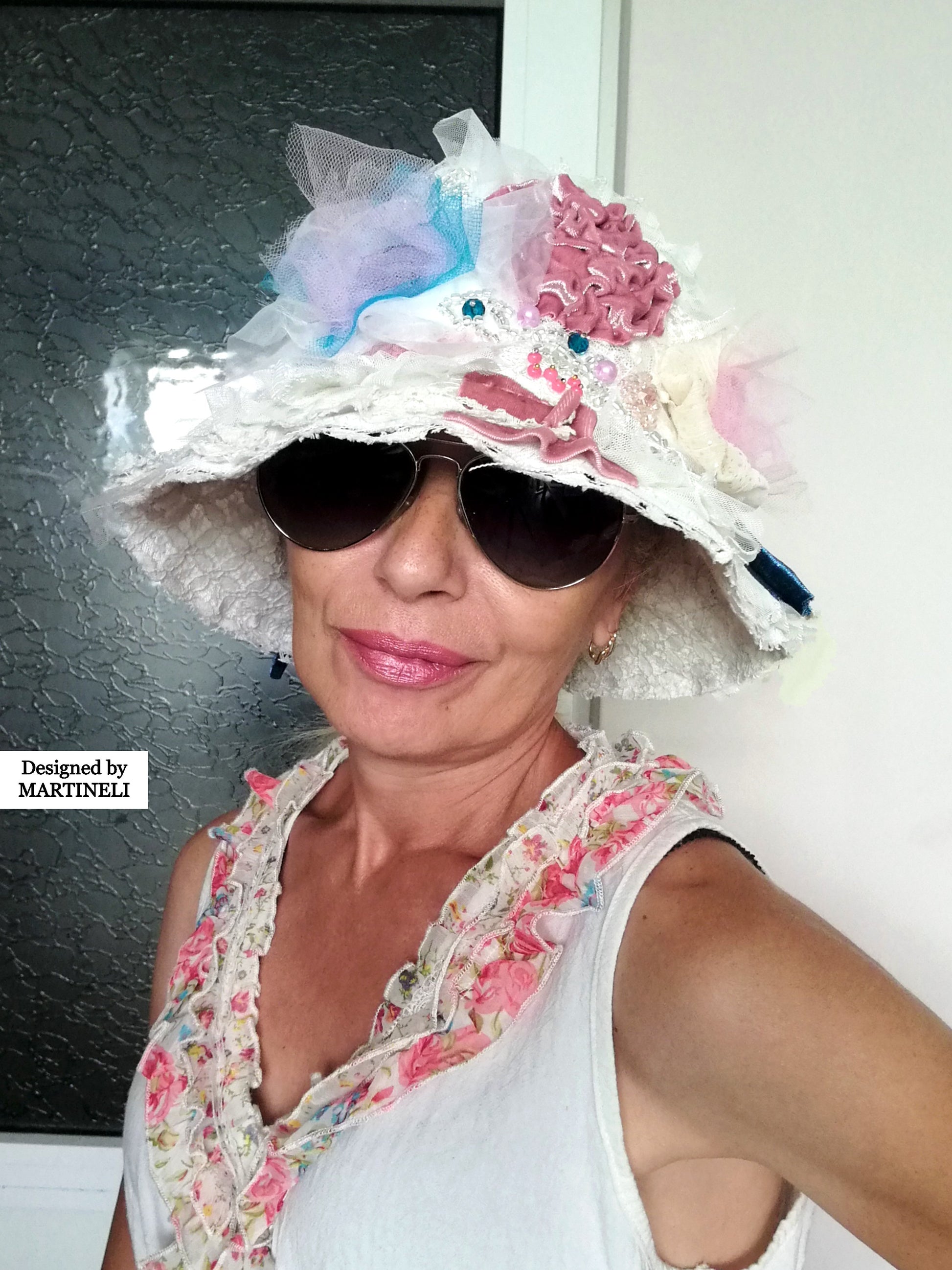This floral summer hat is very lightweight, soft comfortable. This shabby chic hat has a fine cotton lining.